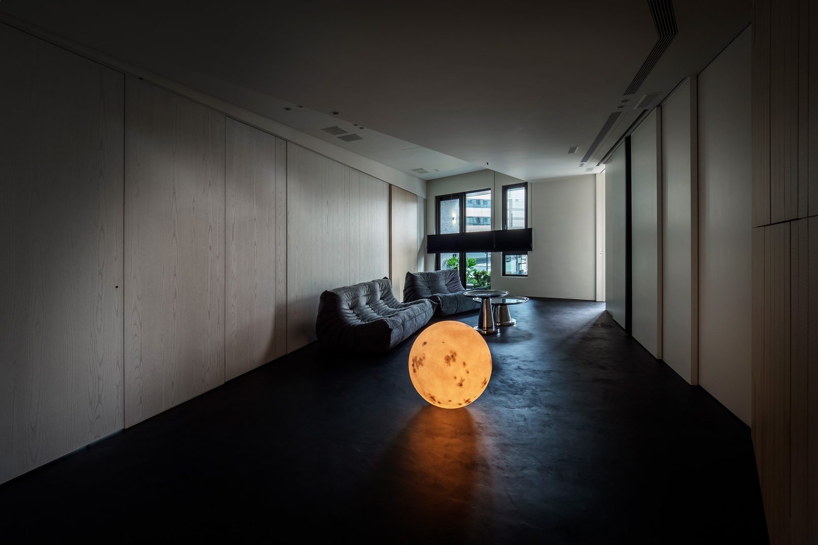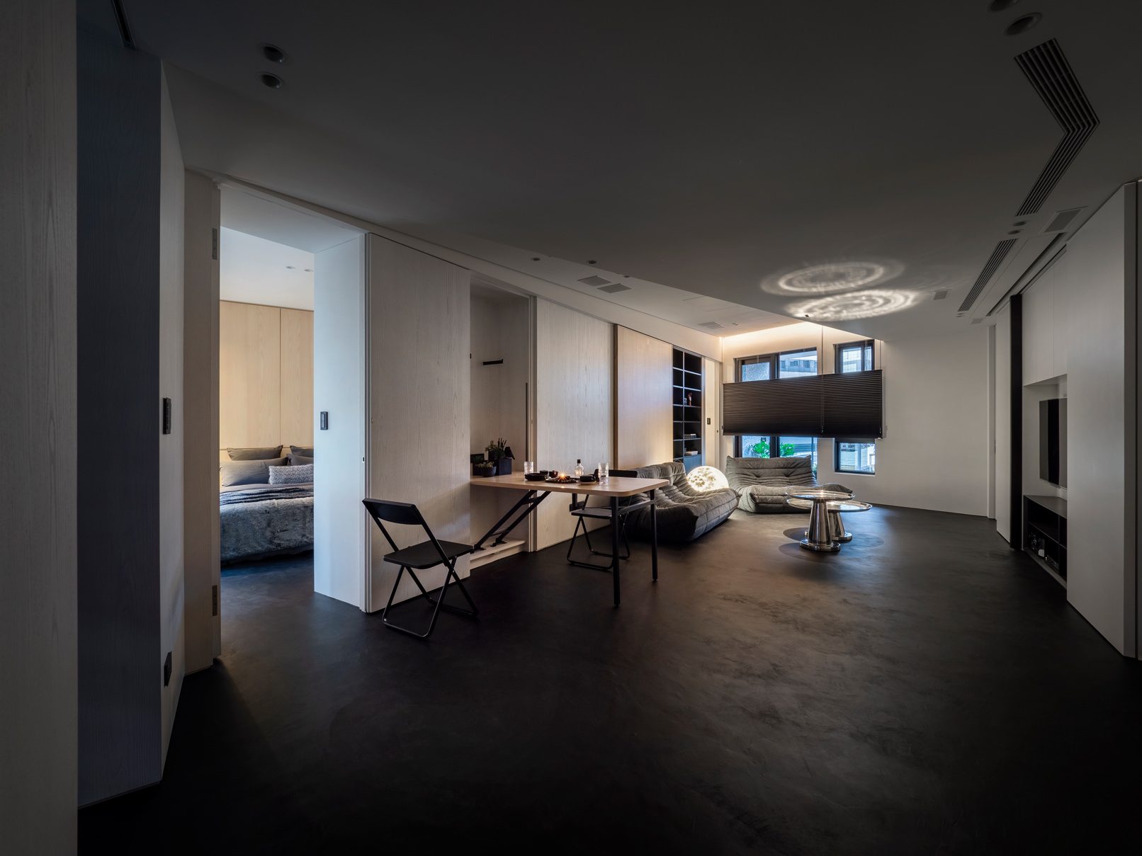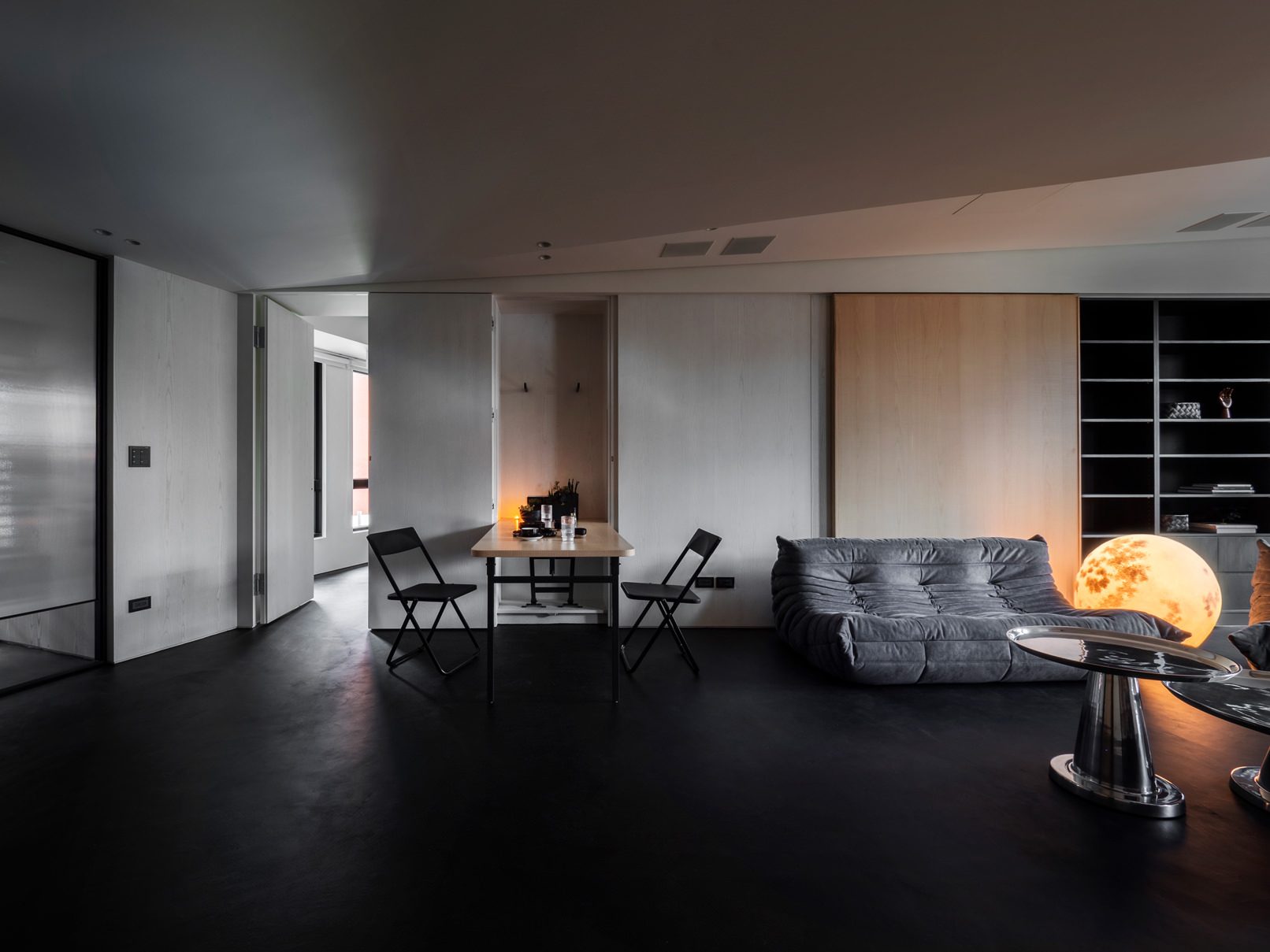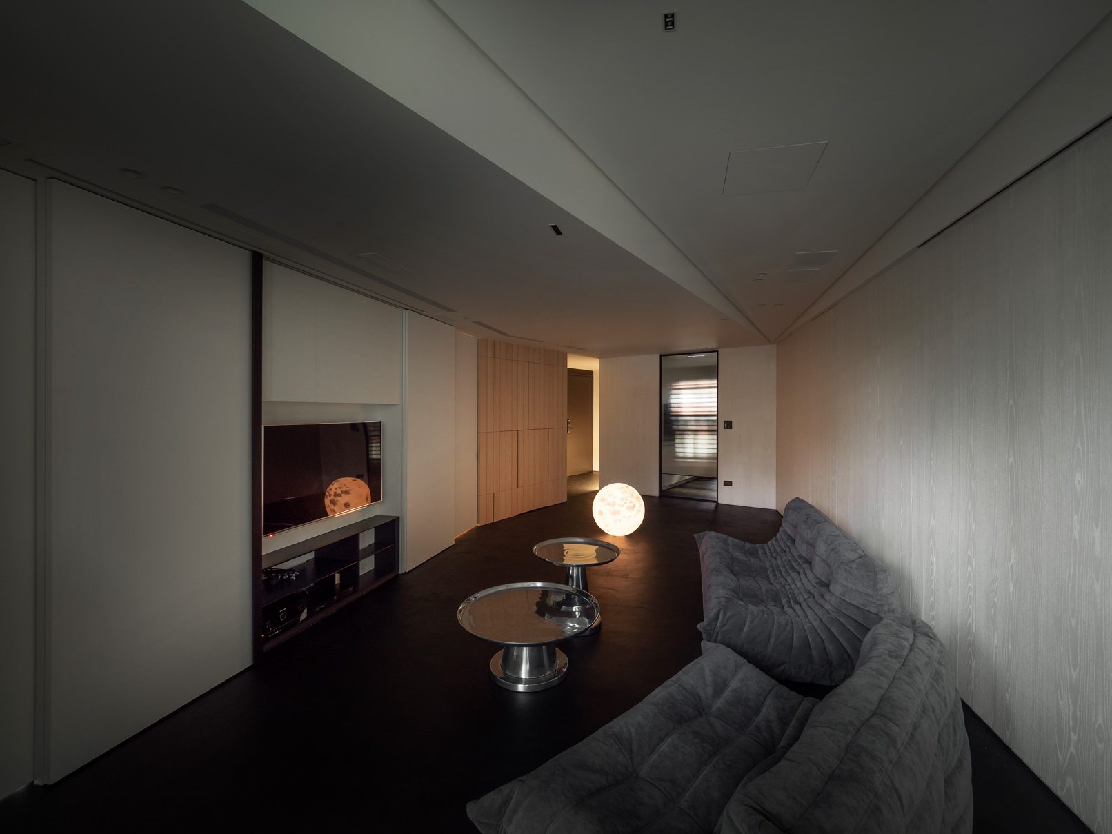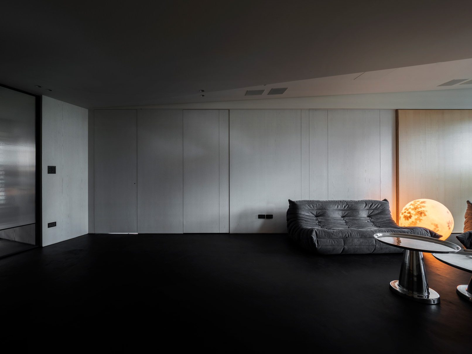 多華麗的工作會讓你需要一個什麼都看不見的家?身為一個長時間與3D特效為伍的影像創作者,屋主很明確地向設計團隊表達,他的家要簡單、乾淨,生活機能需要滿足,但不使用時,都要能夠藏起來。Here’s where the fun begins!整體設計從「太空」為概念出發,客餐廳等公領域集中在彷彿銀河系的中心,其餘空間則在星球運行的軌跡上環繞排列。這種平面配置方式,讓每一個空間都達到了最大化的利用。材質與色彩計畫相對單純,但在不複雜的配置中,仍試圖創造出視覺層次。擁有自然肌理的鋸紋白栓木皮、MORTEX礦物塗料,則為冷調的空間帶進適量的人性溫度。