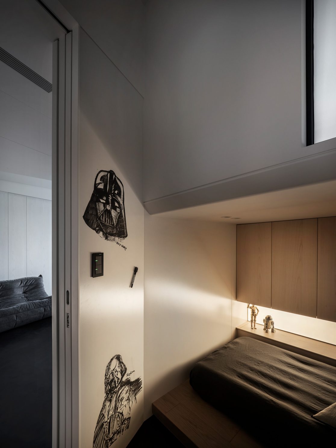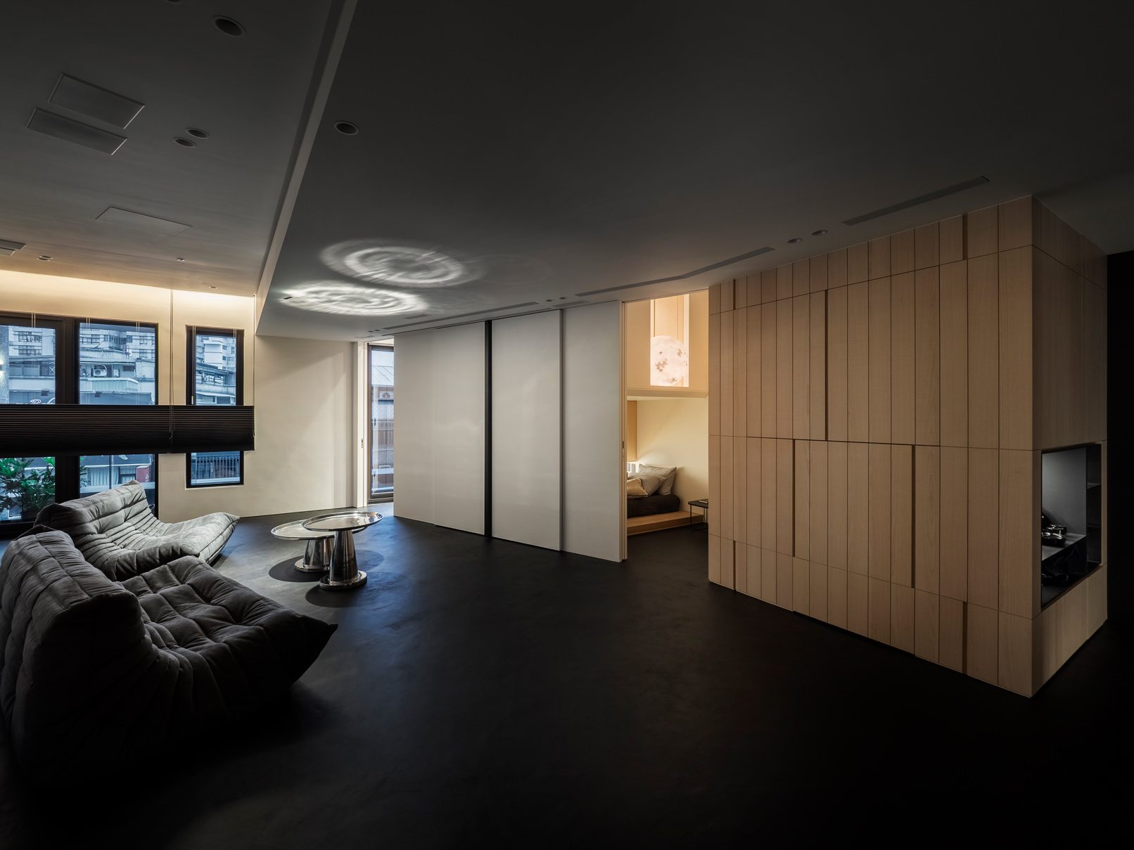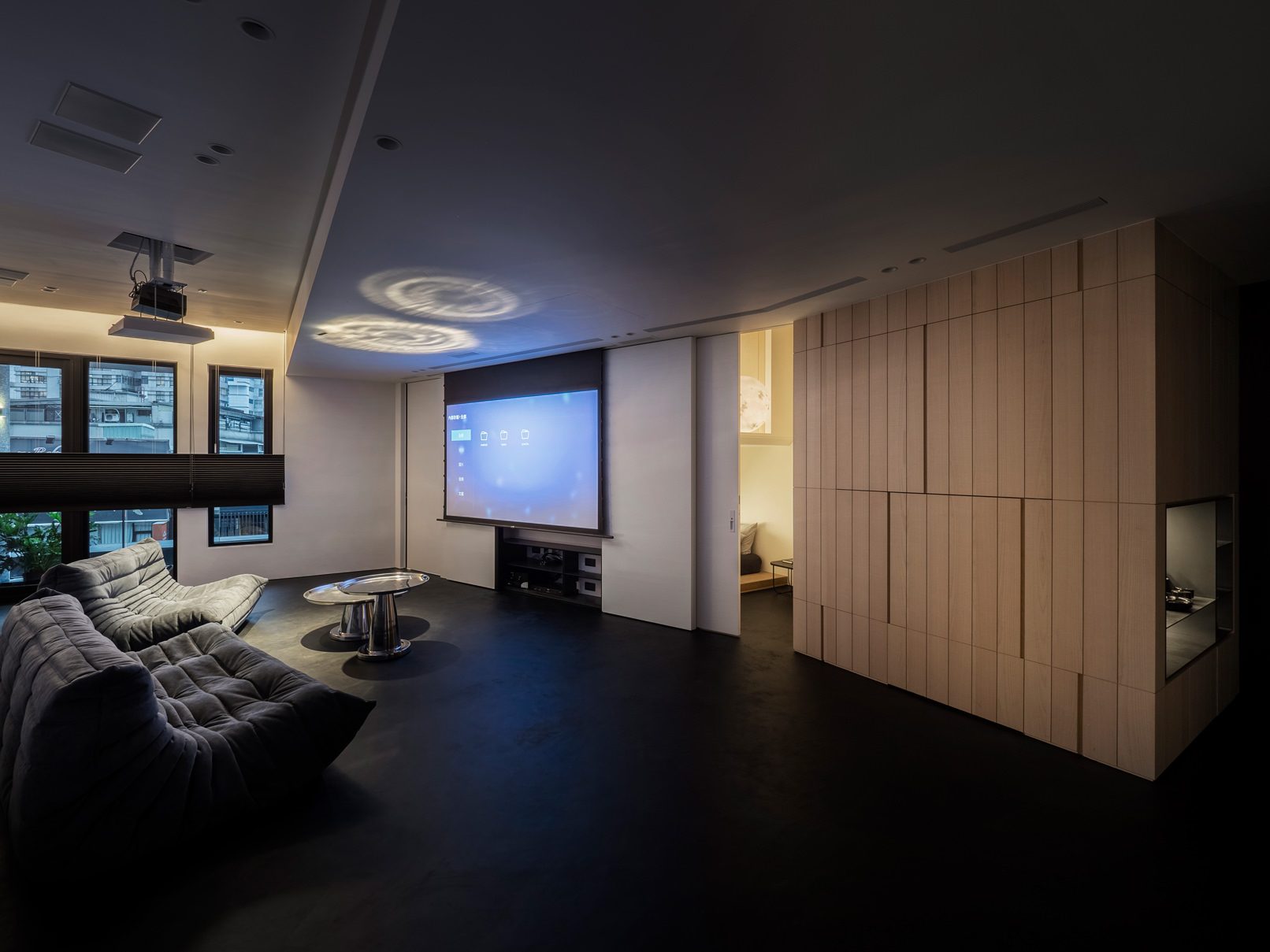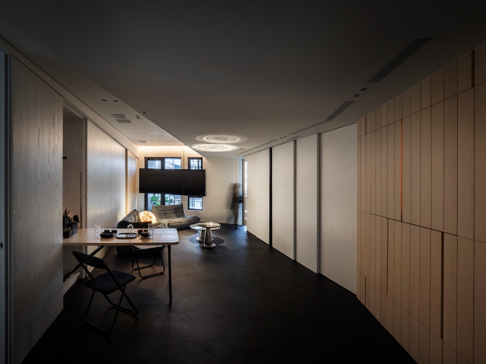 多華麗的工作會讓你需要一個什麼都看不見的家?身為一個長時間與3D特效為伍的影像創作者,屋主很明確地向設計團隊表達,他的家要簡單、乾淨,生活機能需要滿足,但不使用時,都要能夠藏起來。Here’s where the fun begins!整體設計從「太空」為概念出發,客餐廳等公領域集中在彷彿銀河系的中心,其餘空間則在星球運行的軌跡上環繞排列。這種平面配置方式,讓每一個空間都達到了最大化的利用。材質與色彩計畫相對單純,但在不複雜的配置中,仍試圖創造出視覺層次。擁有自然肌理的鋸紋白栓木皮、MORTEX礦物塗料,則為冷調的空間帶進適量的人性溫度。