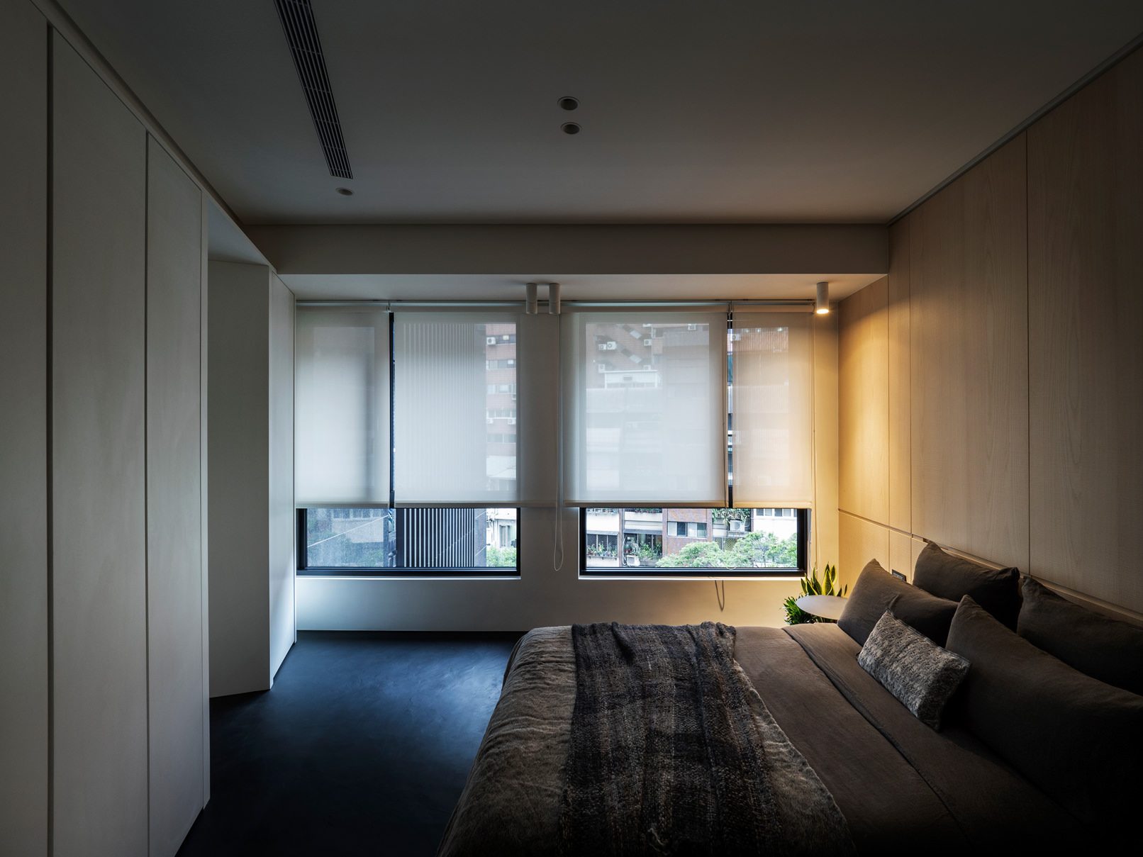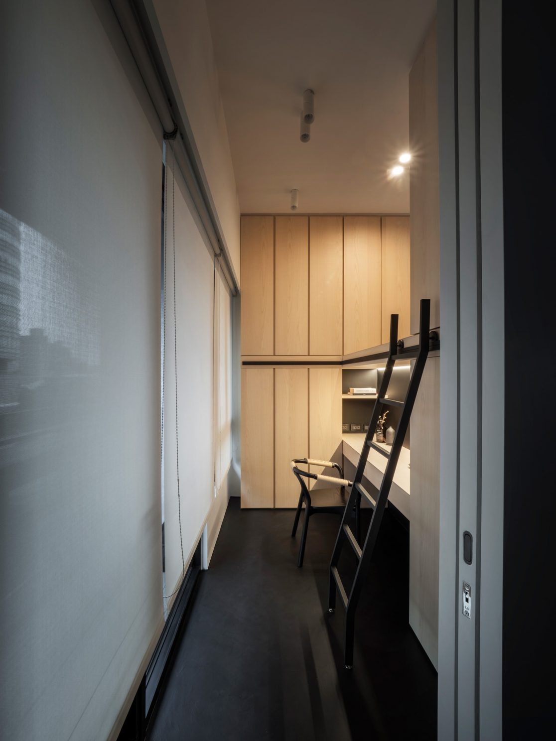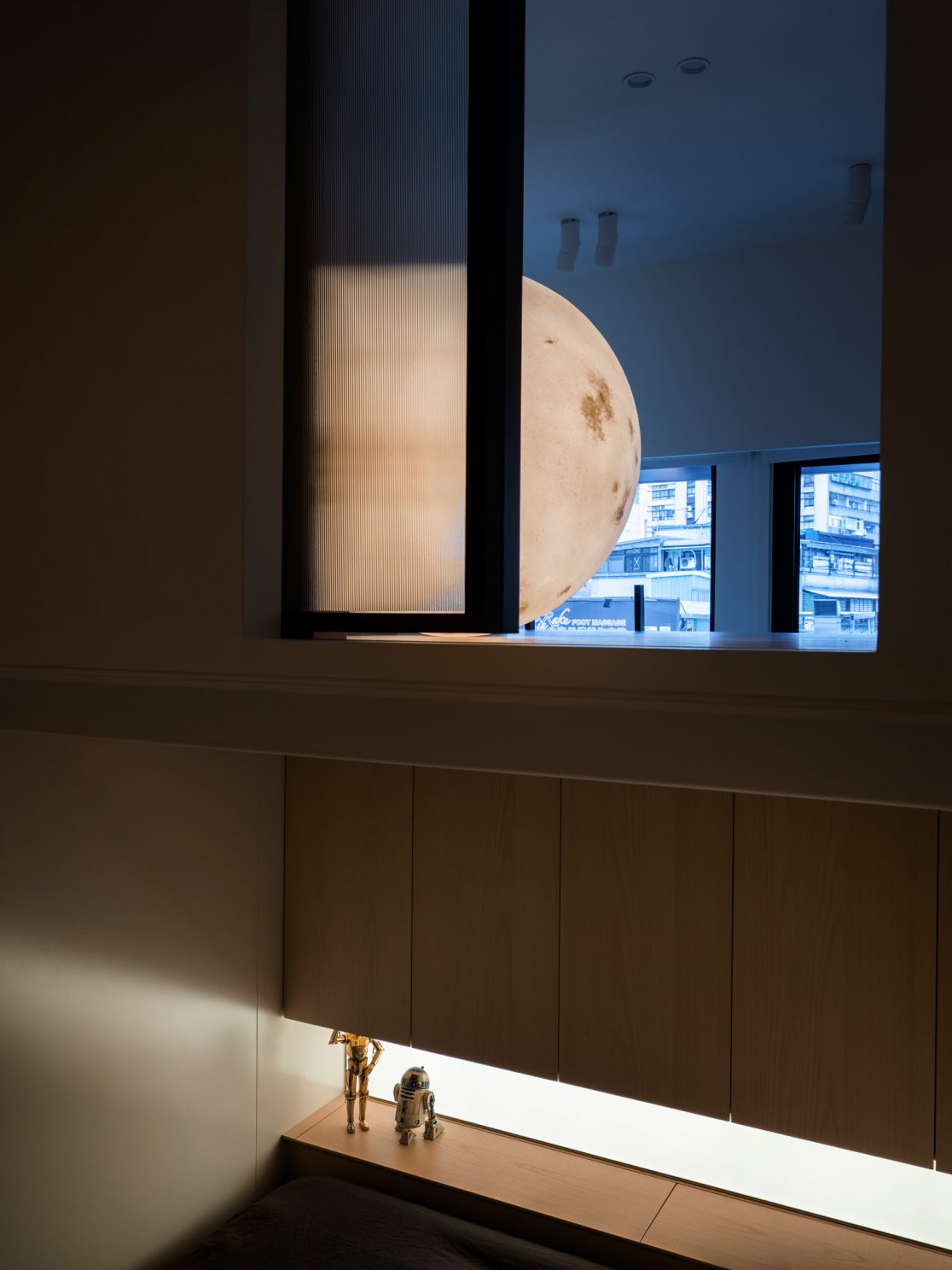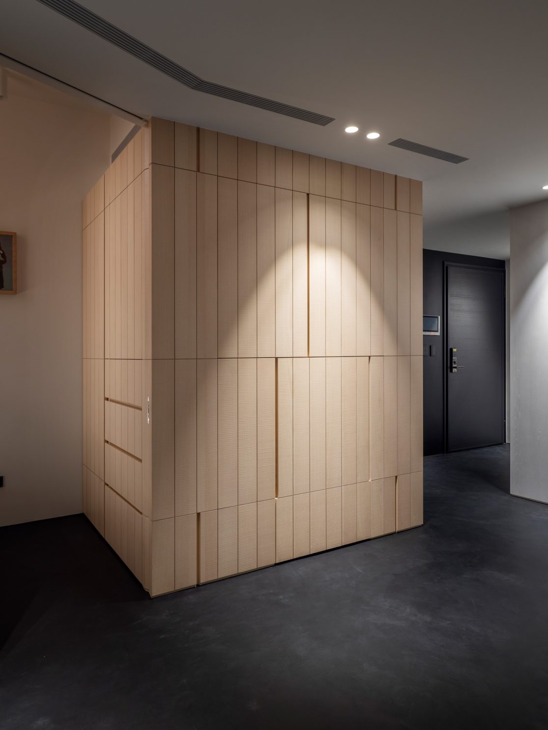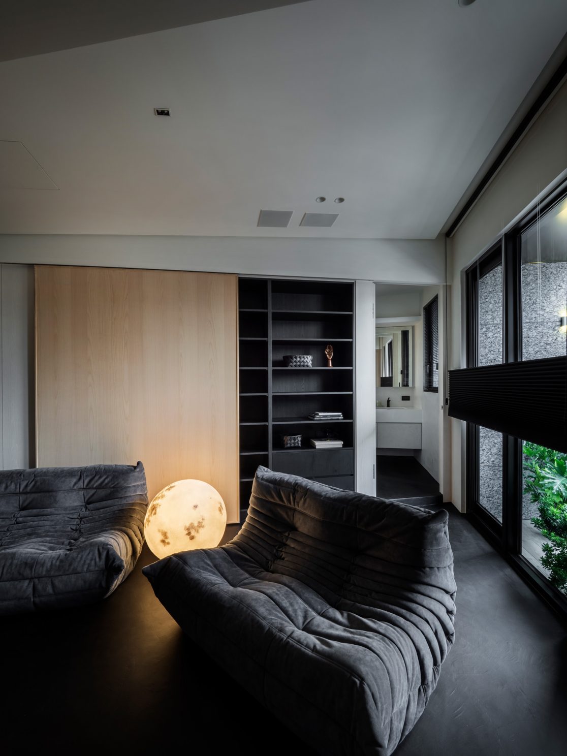 多華麗的工作會讓你需要一個什麼都看不見的家?身為一個長時間與3D特效為伍的影像創作者,屋主很明確地向設計團隊表達,他的家要簡單、乾淨,生活機能需要滿足,但不使用時,都要能夠藏起來。Here’s where the fun begins!整體設計從「太空」為概念出發,客餐廳等公領域集中在彷彿銀河系的中心,其餘空間則在星球運行的軌跡上環繞排列。這種平面配置方式,讓每一個空間都達到了最大化的利用。材質與色彩計畫相對單純,但在不複雜的配置中,仍試圖創造出視覺層次。擁有自然肌理的鋸紋白栓木皮、MORTEX礦物塗料,則為冷調的空間帶進適量的人性溫度。