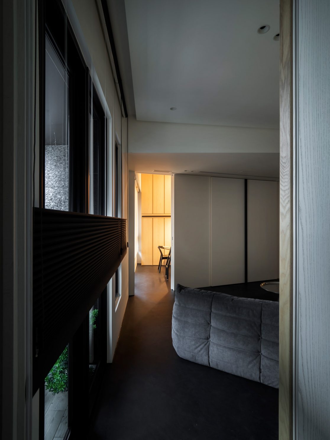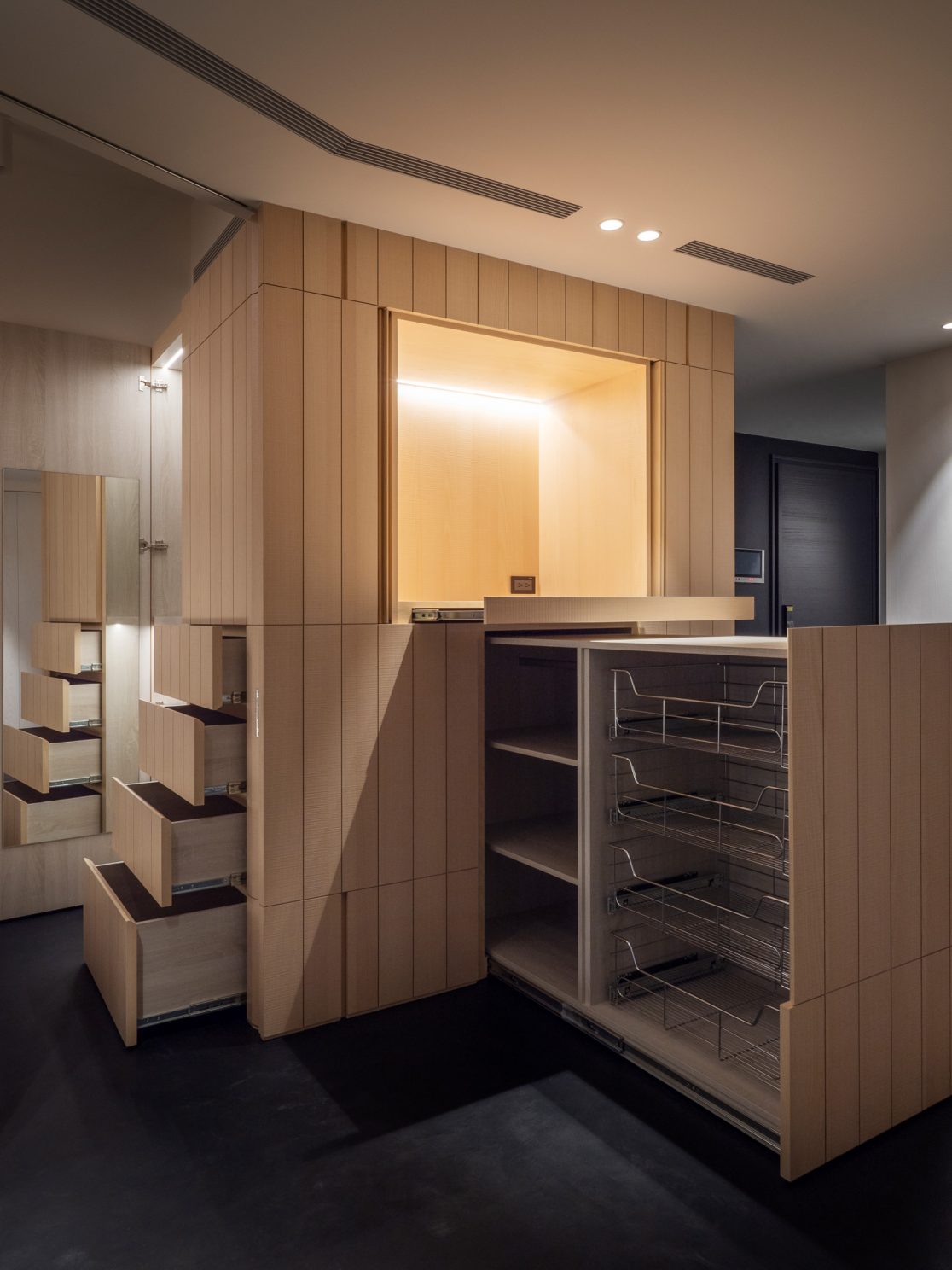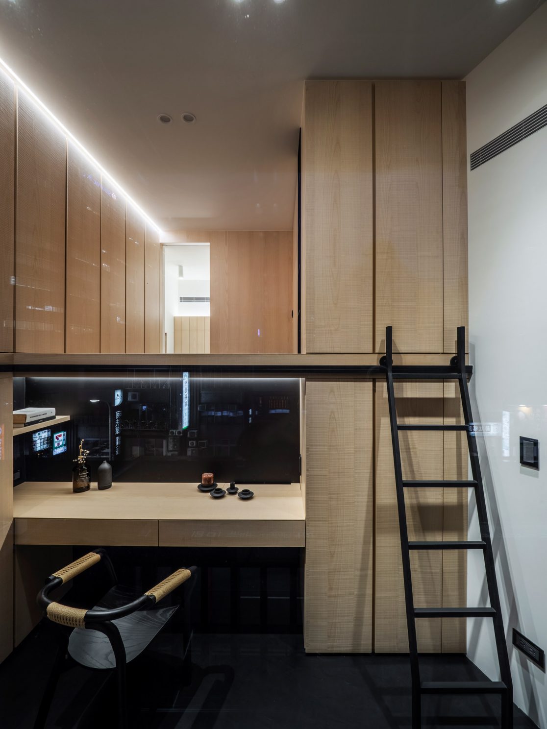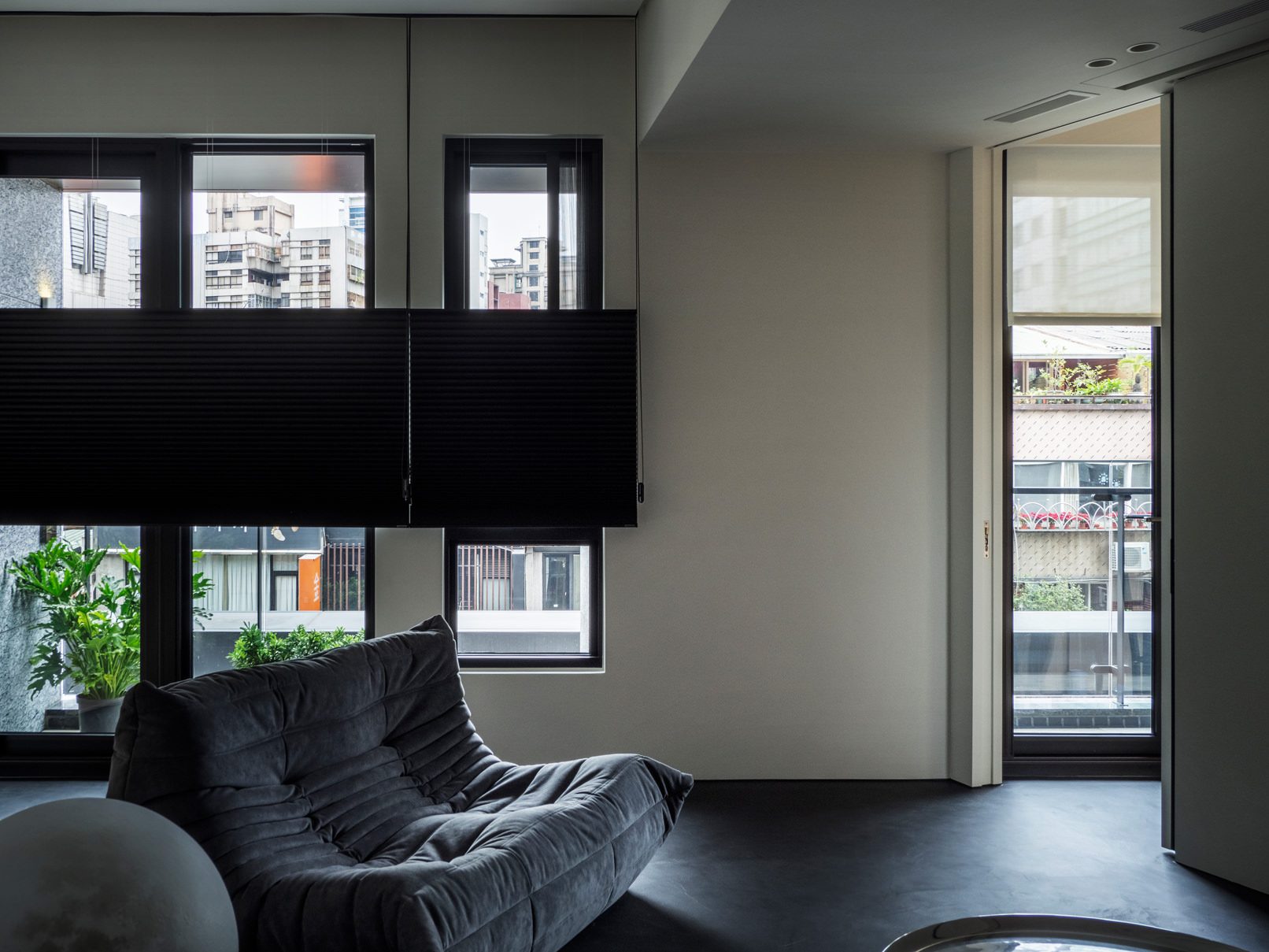 多華麗的工作會讓你需要一個什麼都看不見的家?身為一個長時間與3D特效為伍的影像創作者,屋主很明確地向設計團隊表達,他的家要簡單、乾淨,生活機能需要滿足,但不使用時,都要能夠藏起來。Here’s where the fun begins!整體設計從「太空」為概念出發,客餐廳等公領域集中在彷彿銀河系的中心,其餘空間則在星球運行的軌跡上環繞排列。這種平面配置方式,讓每一個空間都達到了最大化的利用。材質與色彩計畫相對單純,但在不複雜的配置中,仍試圖創造出視覺層次。擁有自然肌理的鋸紋白栓木皮、MORTEX礦物塗料,則為冷調的空間帶進適量的人性溫度。