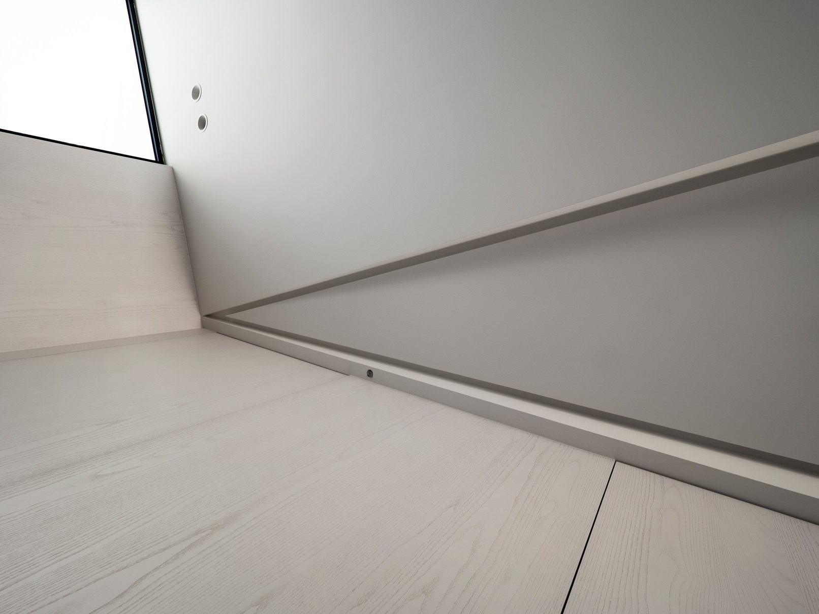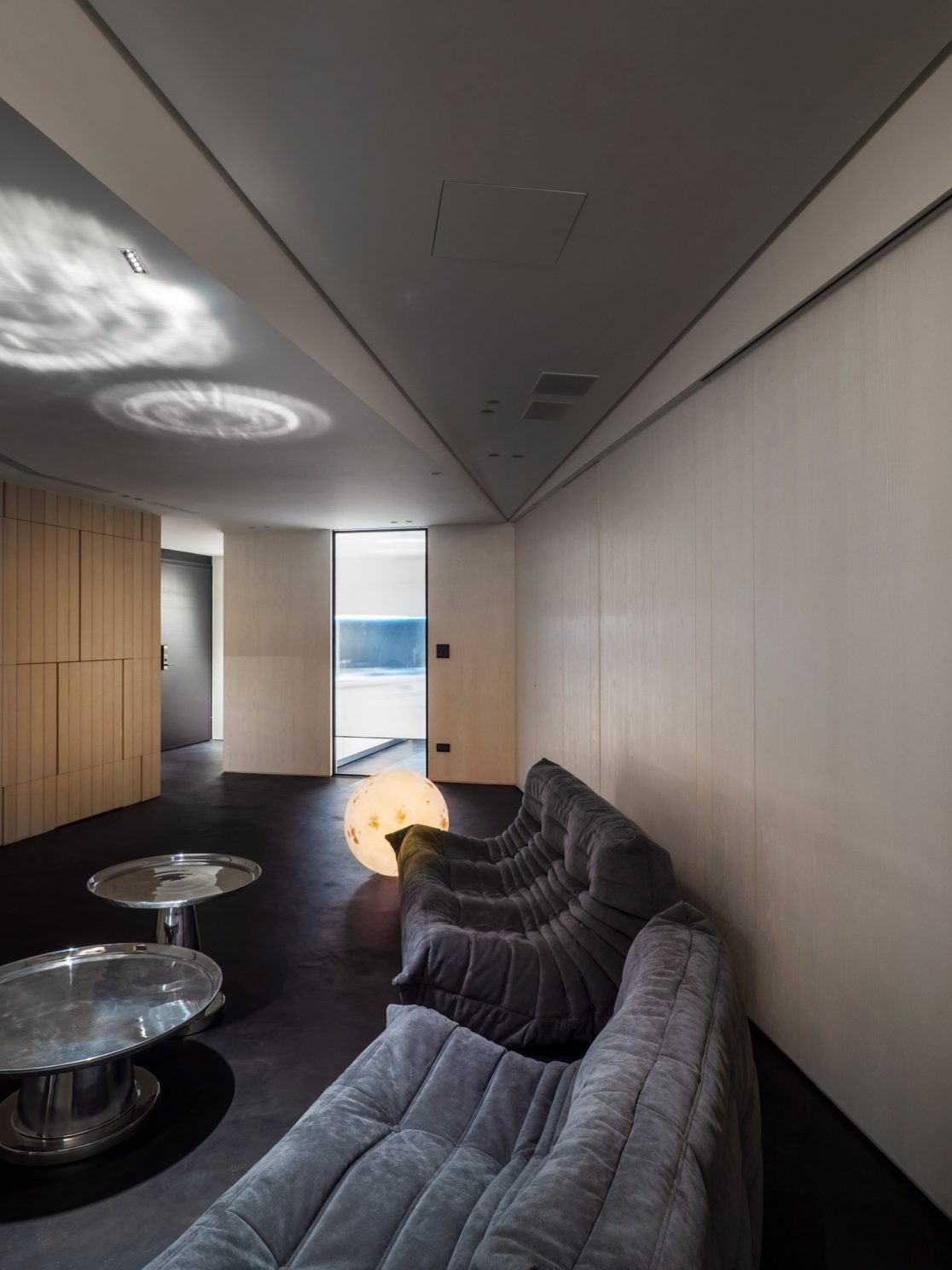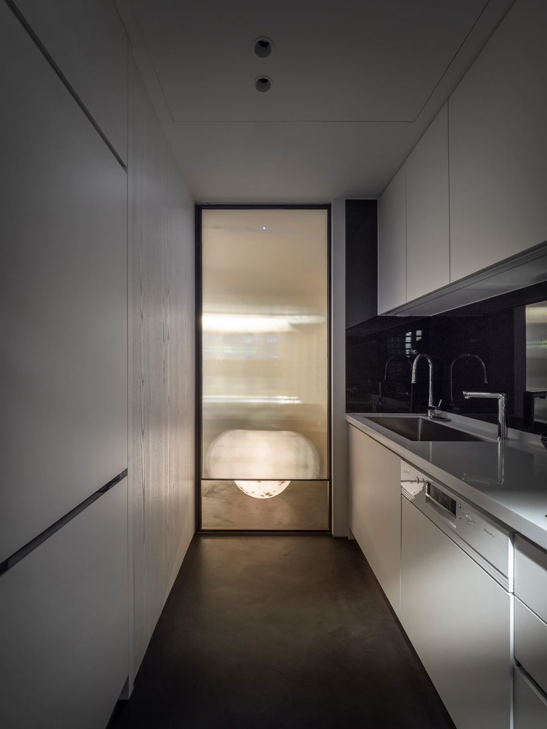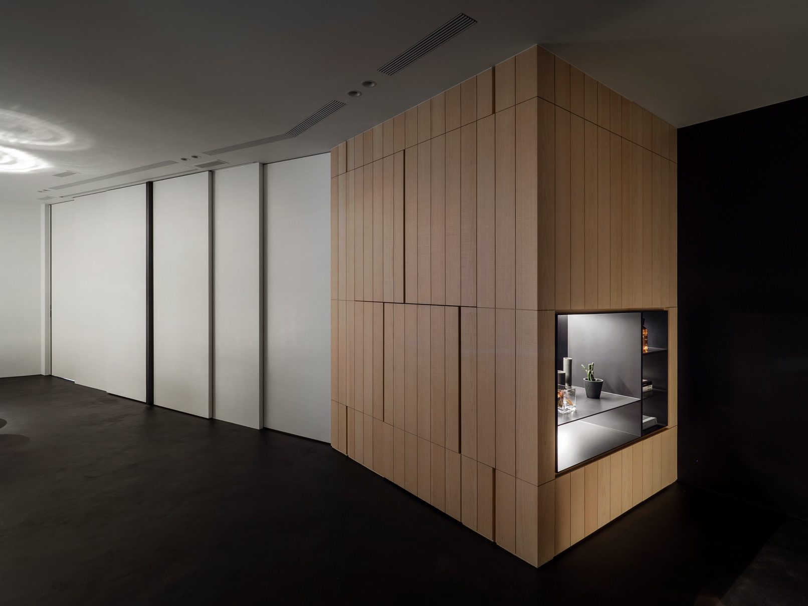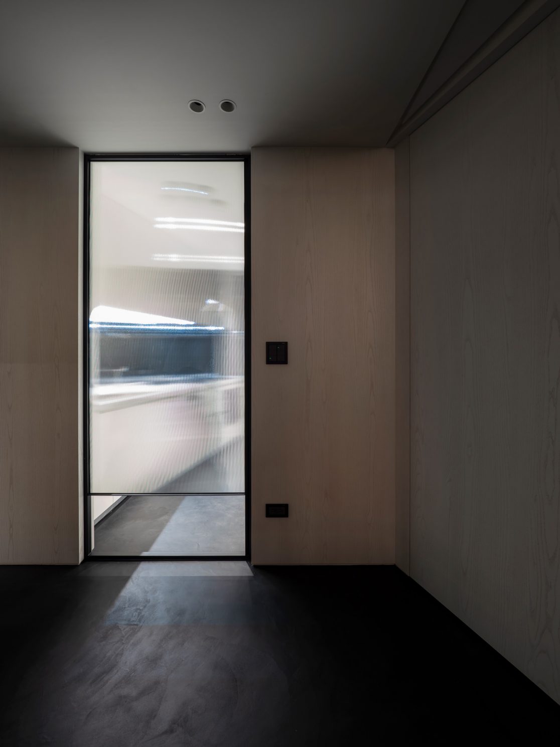 多華麗的工作會讓你需要一個什麼都看不見的家?身為一個長時間與3D特效為伍的影像創作者,屋主很明確地向設計團隊表達,他的家要簡單、乾淨,生活機能需要滿足,但不使用時,都要能夠藏起來。Here’s where the fun begins!整體設計從「太空」為概念出發,客餐廳等公領域集中在彷彿銀河系的中心,其餘空間則在星球運行的軌跡上環繞排列。這種平面配置方式,讓每一個空間都達到了最大化的利用。材質與色彩計畫相對單純,但在不複雜的配置中,仍試圖創造出視覺層次。擁有自然肌理的鋸紋白栓木皮、MORTEX礦物塗料,則為冷調的空間帶進適量的人性溫度。