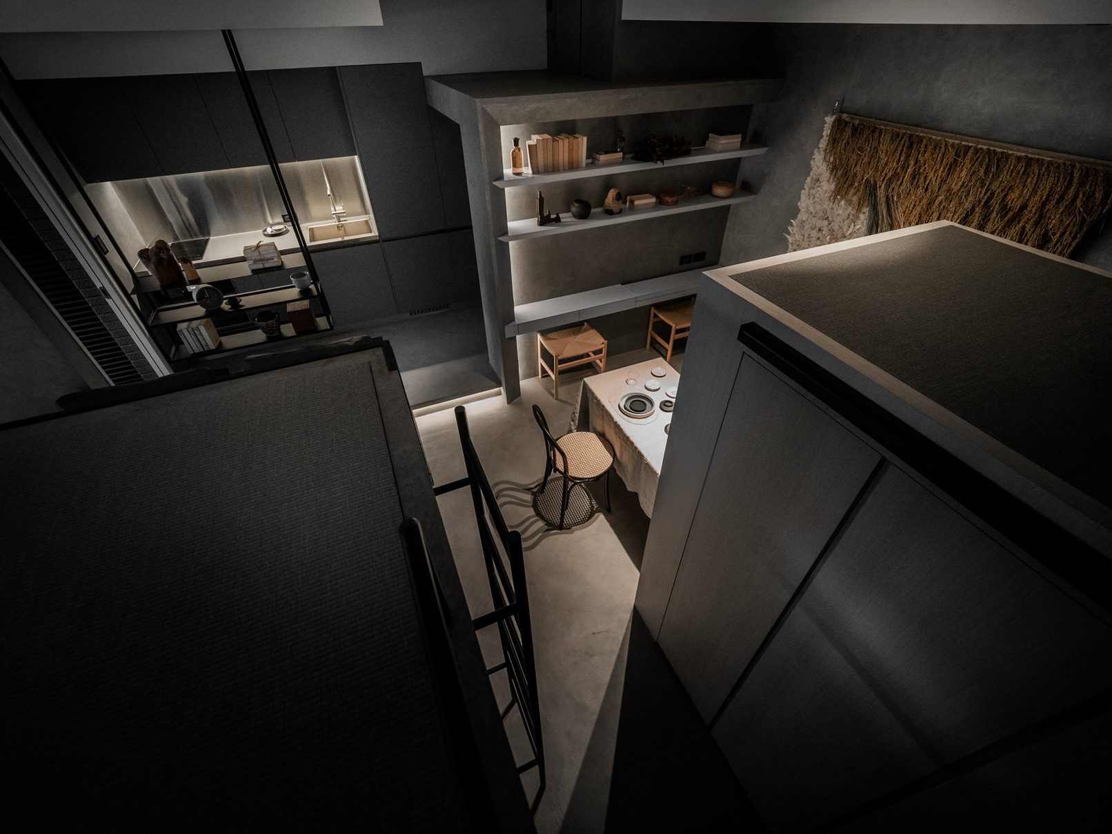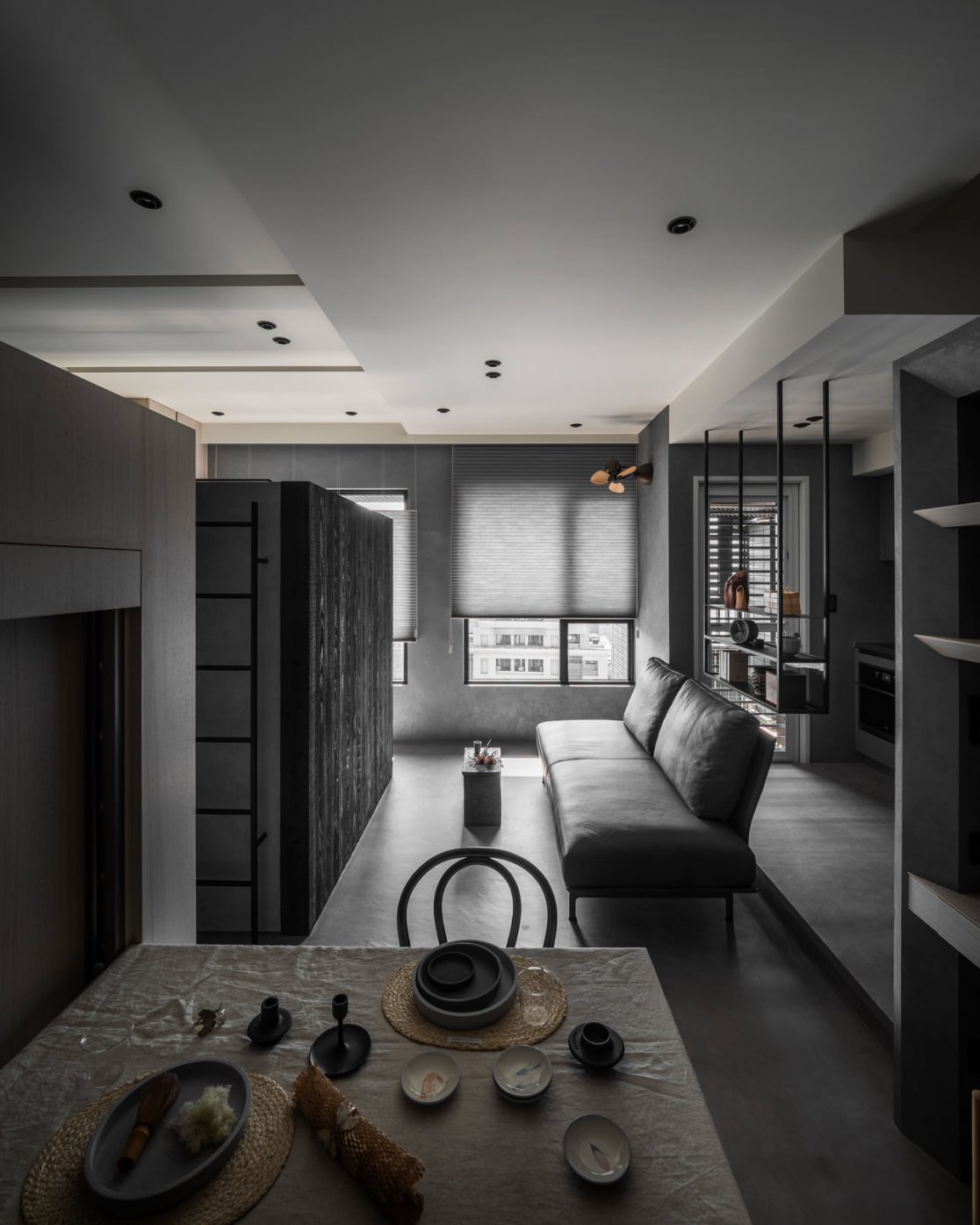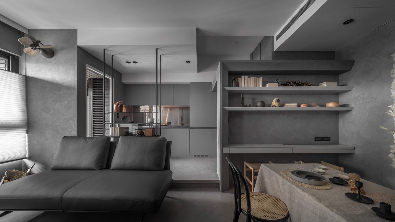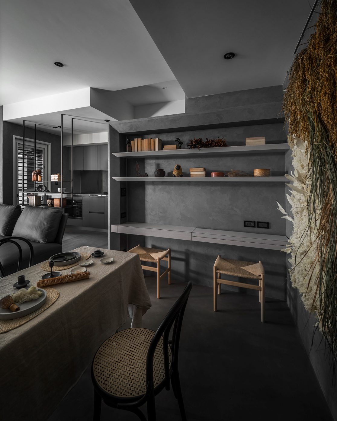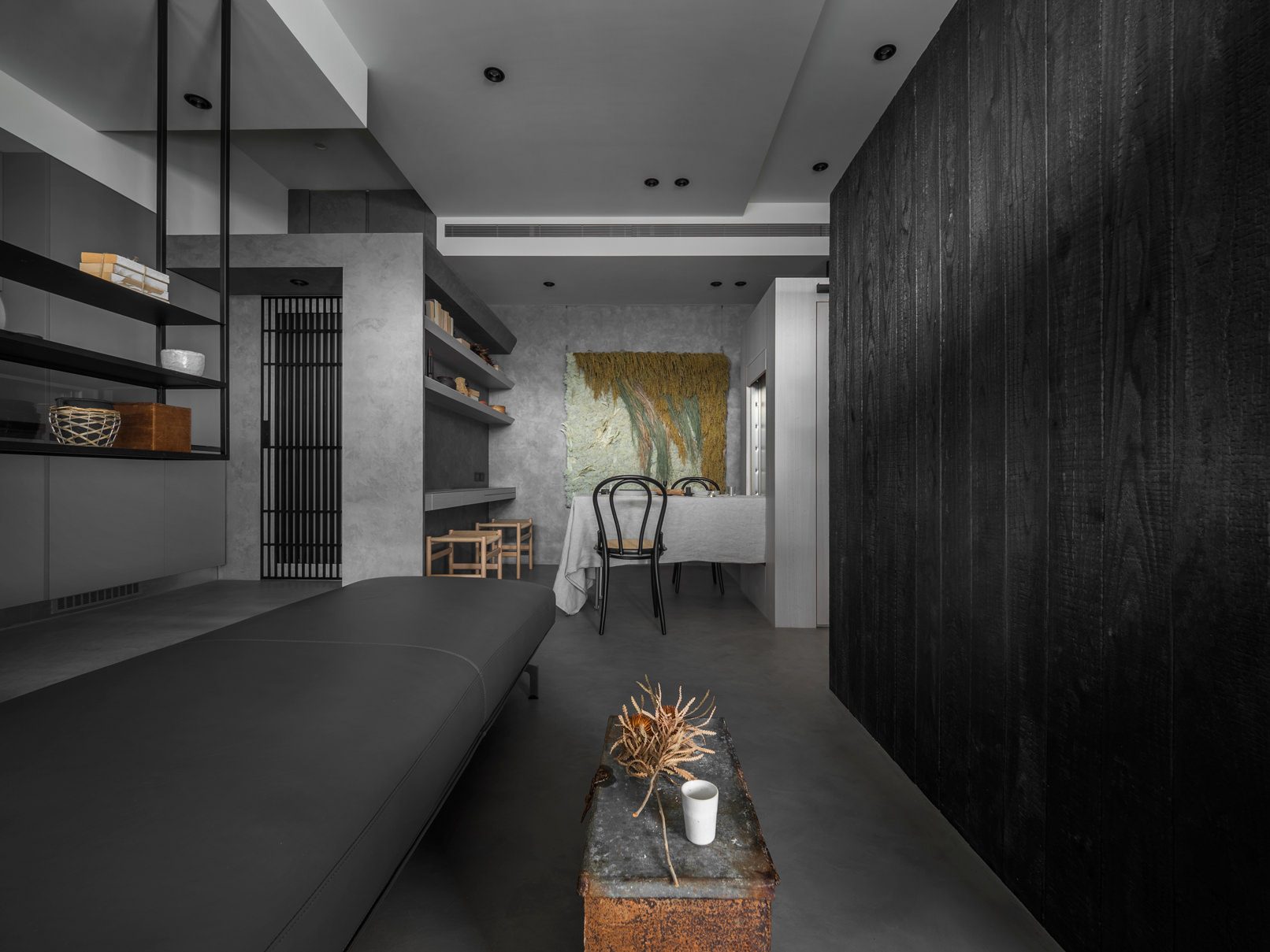 燒杉、稻穗、榻榻米的氣味,把人帶回泛黃相片裡的從前;灰調的磨石子與礦物塗料,則將屋主住過的日式老房子裡熟悉的觸感,迎著海風從北海岸一路吹了進來。這三米高的11坪微型空間,是屬於一對準備退休的夫婦所有。從夫婦兩人分享的過往生活畫面,衍伸出以台灣早期的黑瓦古厝群為意象的平面方案。三座量體設計不僅提供兩人的所有生活所需,同時還保留了兩個兒子偶爾來訪時可以過夜休憩的位置。而量體間的動線與關係,則比擬從前的社區巷弄,鄰居之間那種充滿人情味,容易互動卻又保有各自隱私的那種美好距離。延伸平面構想的畫面,將積累的時間與回憶,以材質本身最自然的樣貌,但不同方式的運用表現,帶進立面設計與軟裝陳設。牆上的裝置藝術更是特別為這個空間,在現場直接進行創作,手工製作出的成品。與其他具時間感的塗料、燒杉、手作陶器、老件等搭配,都能感知到不同的歲月起伏。屋主夫婦曾提出他們想要一個「沒有設計的設計」,但我們更想給他們的,是一種貼近人生下半場所追尋的歸真返樸,在這片熟悉的土地上能恣意感受,一個樸素、沈靜的未來。