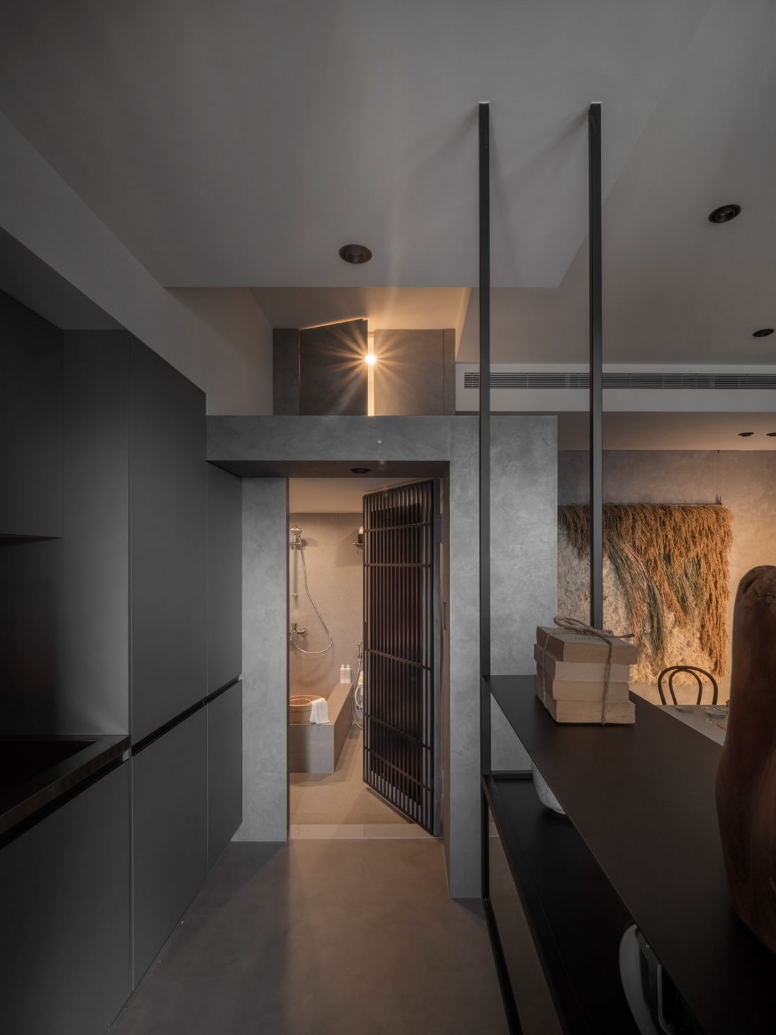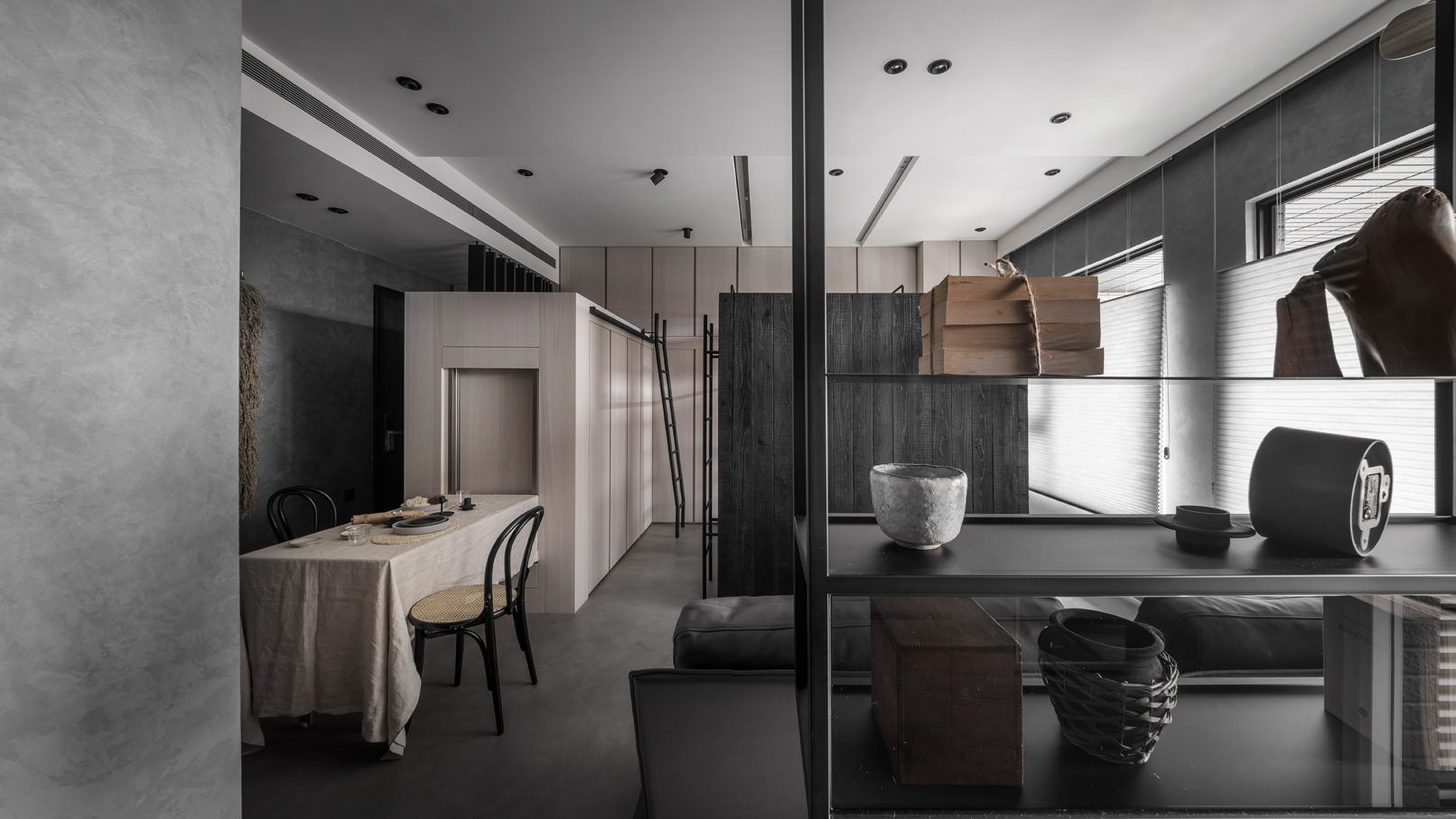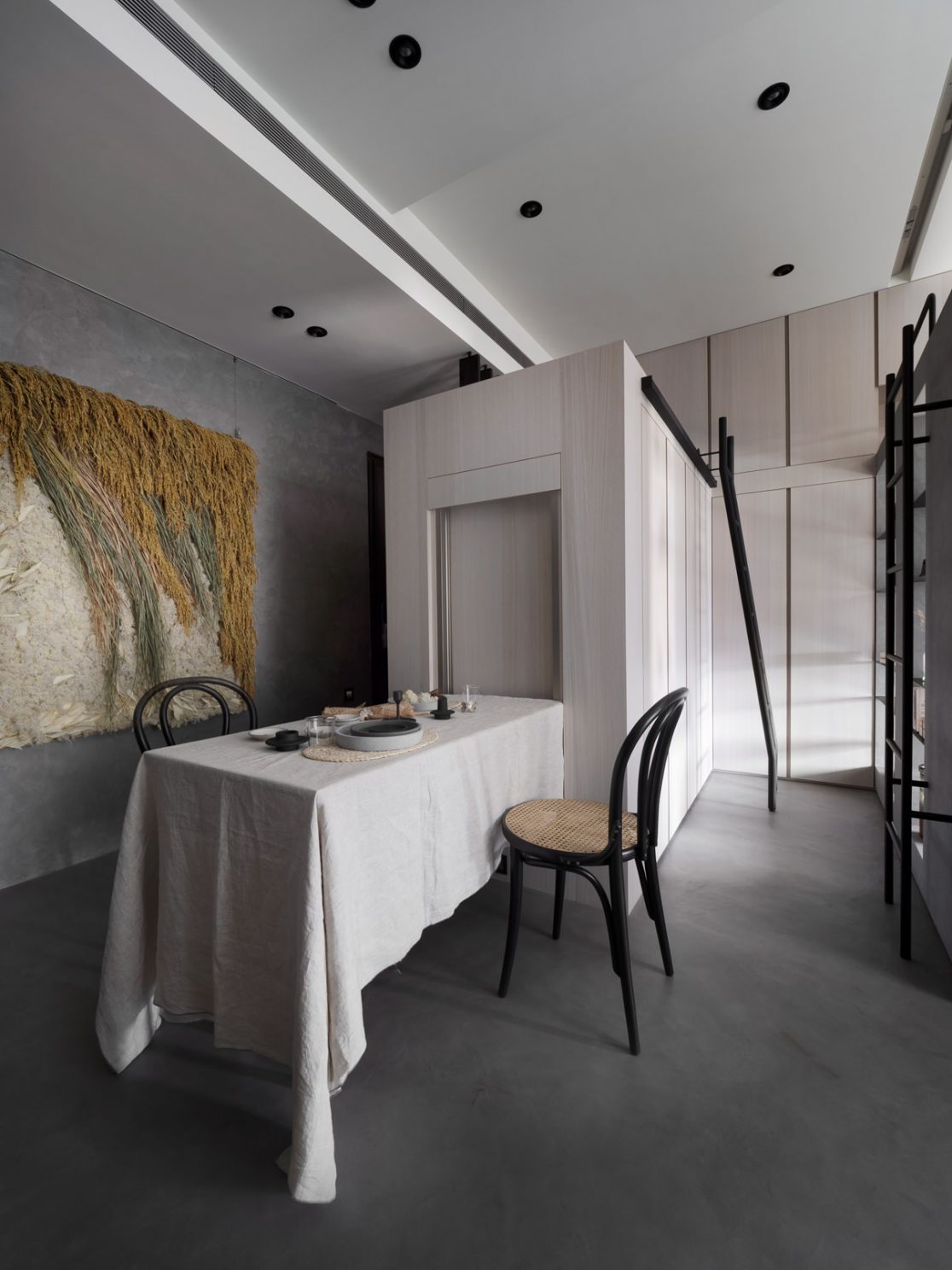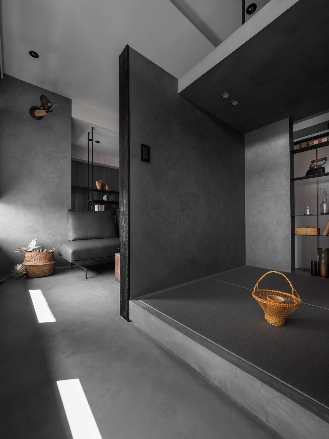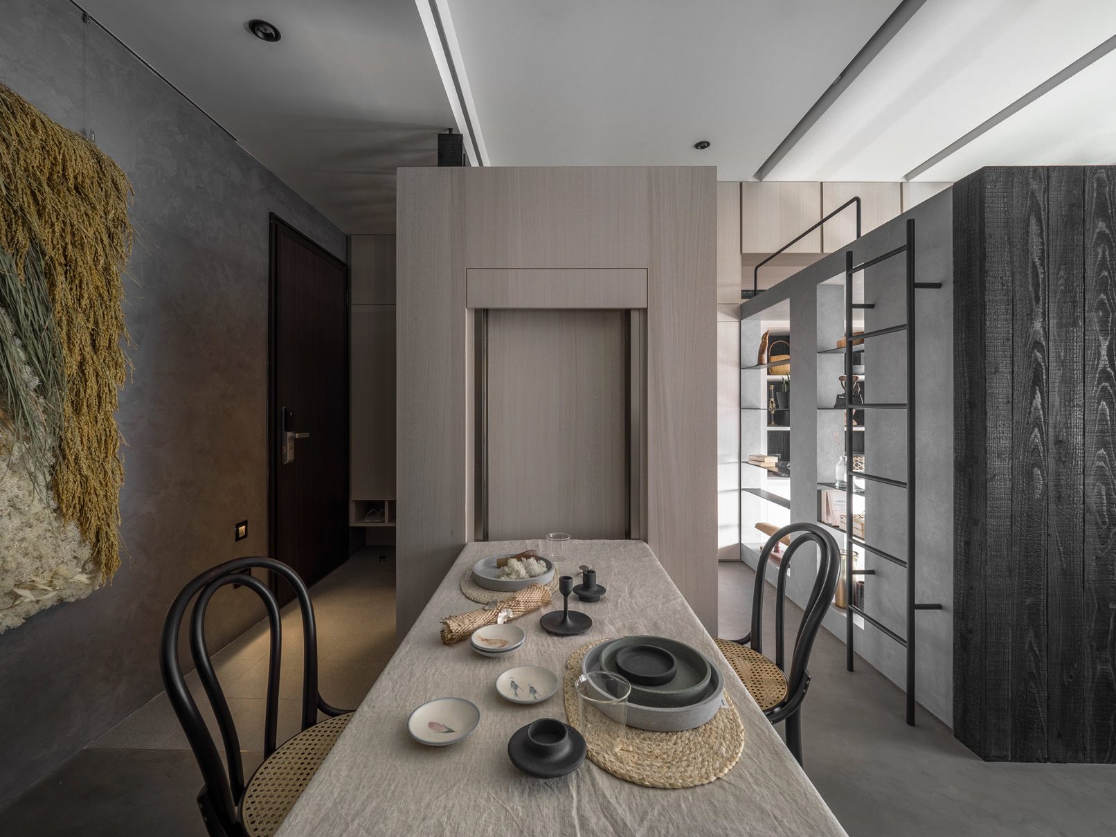 燒杉、稻穗、榻榻米的氣味,把人帶回泛黃相片裡的從前;灰調的磨石子與礦物塗料,則將屋主住過的日式老房子裡熟悉的觸感,迎著海風從北海岸一路吹了進來。這三米高的11坪微型空間,是屬於一對準備退休的夫婦所有。從夫婦兩人分享的過往生活畫面,衍伸出以台灣早期的黑瓦古厝群為意象的平面方案。三座量體設計不僅提供兩人的所有生活所需,同時還保留了兩個兒子偶爾來訪時可以過夜休憩的位置。而量體間的動線與關係,則比擬從前的社區巷弄,鄰居之間那種充滿人情味,容易互動卻又保有各自隱私的那種美好距離。延伸平面構想的畫面,將積累的時間與回憶,以材質本身最自然的樣貌,但不同方式的運用表現,帶進立面設計與軟裝陳設。牆上的裝置藝術更是特別為這個空間,在現場直接進行創作,手工製作出的成品。與其他具時間感的塗料、燒杉、手作陶器、老件等搭配,都能感知到不同的歲月起伏。屋主夫婦曾提出他們想要一個「沒有設計的設計」,但我們更想給他們的,是一種貼近人生下半場所追尋的歸真返樸,在這片熟悉的土地上能恣意感受,一個樸素、沈靜的未來。