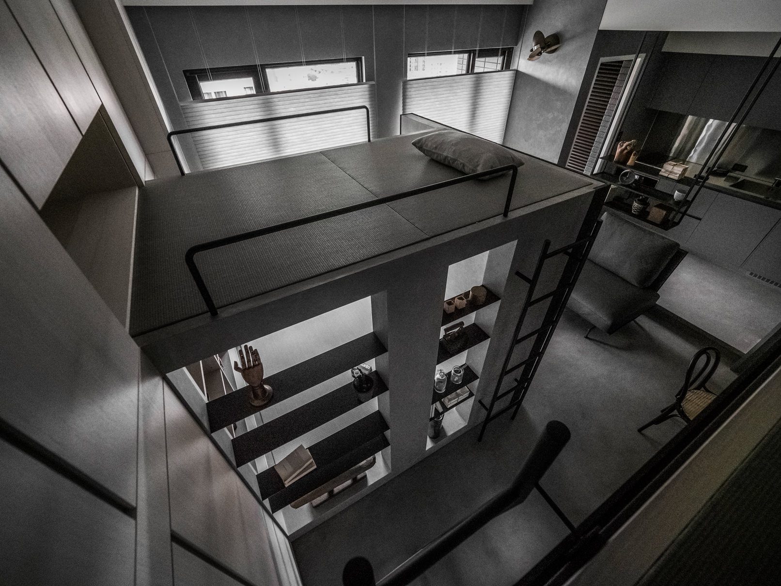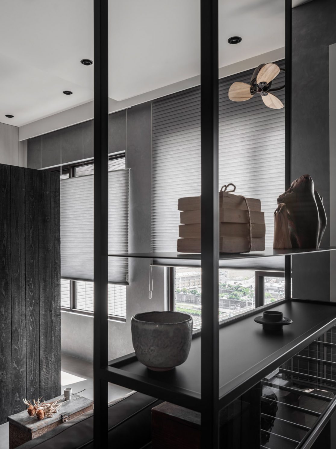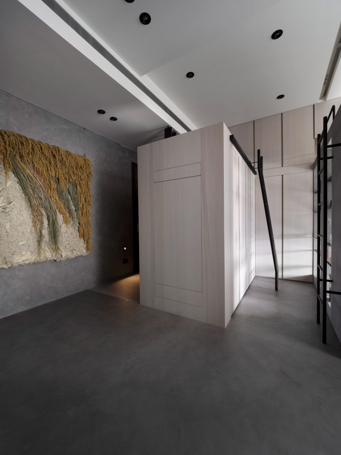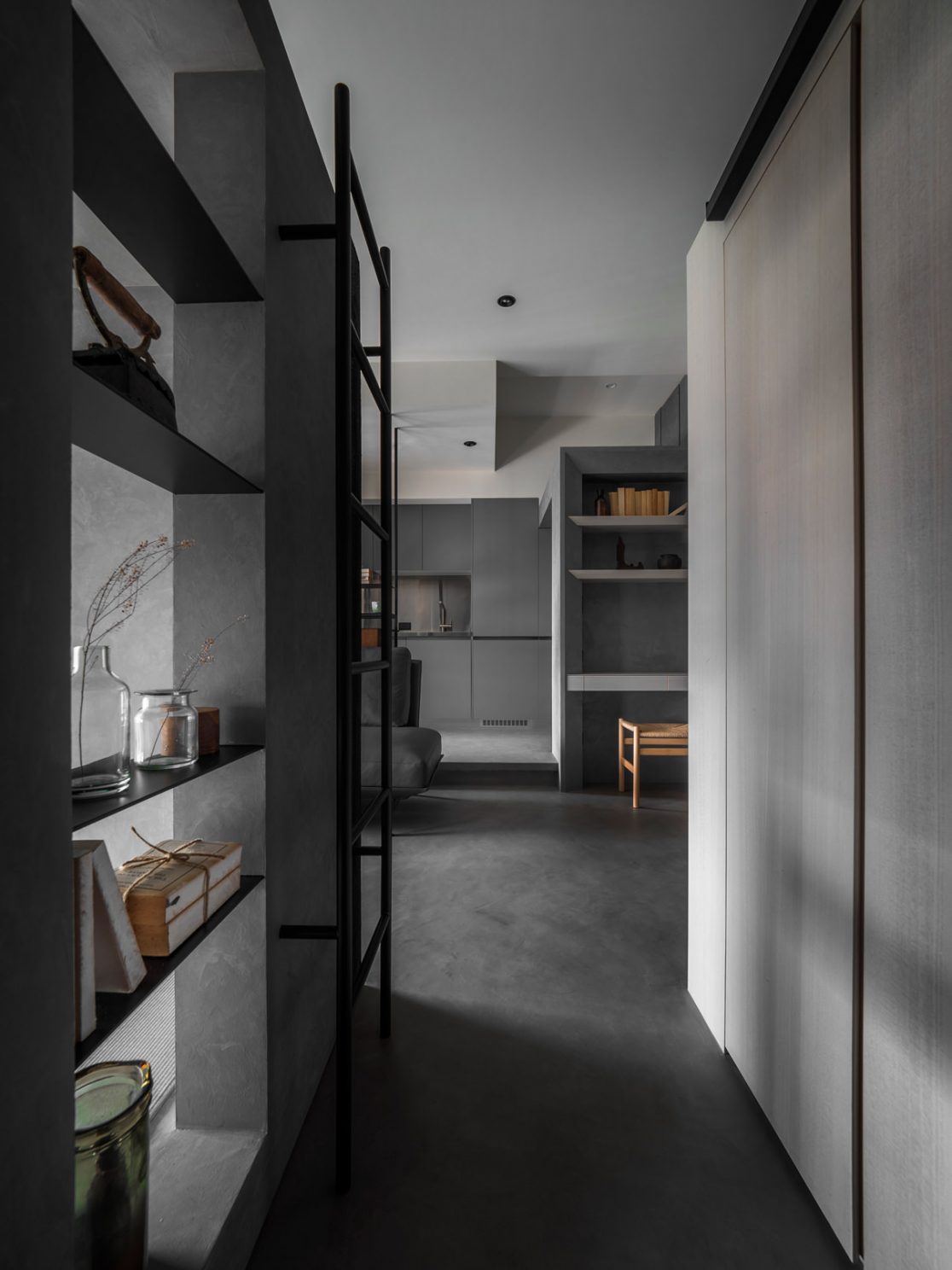 燒杉、稻穗、榻榻米的氣味,把人帶回泛黃相片裡的從前;灰調的磨石子與礦物塗料,則將屋主住過的日式老房子裡熟悉的觸感,迎著海風從北海岸一路吹了進來。這三米高的11坪微型空間,是屬於一對準備退休的夫婦所有。從夫婦兩人分享的過往生活畫面,衍伸出以台灣早期的黑瓦古厝群為意象的平面方案。三座量體設計不僅提供兩人的所有生活所需,同時還保留了兩個兒子偶爾來訪時可以過夜休憩的位置。而量體間的動線與關係,則比擬從前的社區巷弄,鄰居之間那種充滿人情味,容易互動卻又保有各自隱私的那種美好距離。延伸平面構想的畫面,將積累的時間與回憶,以材質本身最自然的樣貌,但不同方式的運用表現,帶進立面設計與軟裝陳設。牆上的裝置藝術更是特別為這個空間,在現場直接進行創作,手工製作出的成品。與其他具時間感的塗料、燒杉、手作陶器、老件等搭配,都能感知到不同的歲月起伏。屋主夫婦曾提出他們想要一個「沒有設計的設計」,但我們更想給他們的,是一種貼近人生下半場所追尋的歸真返樸,在這片熟悉的土地上能恣意感受,一個樸素、沈靜的未來。