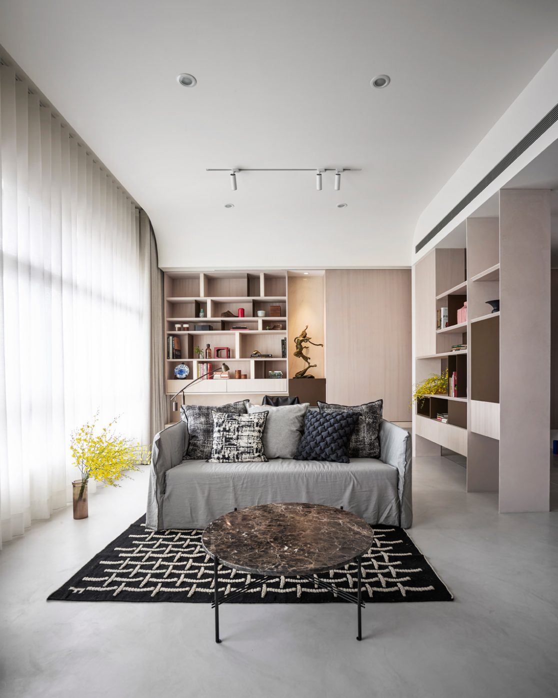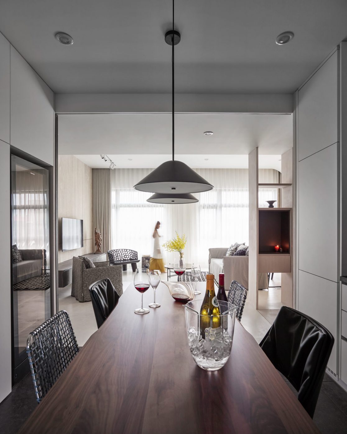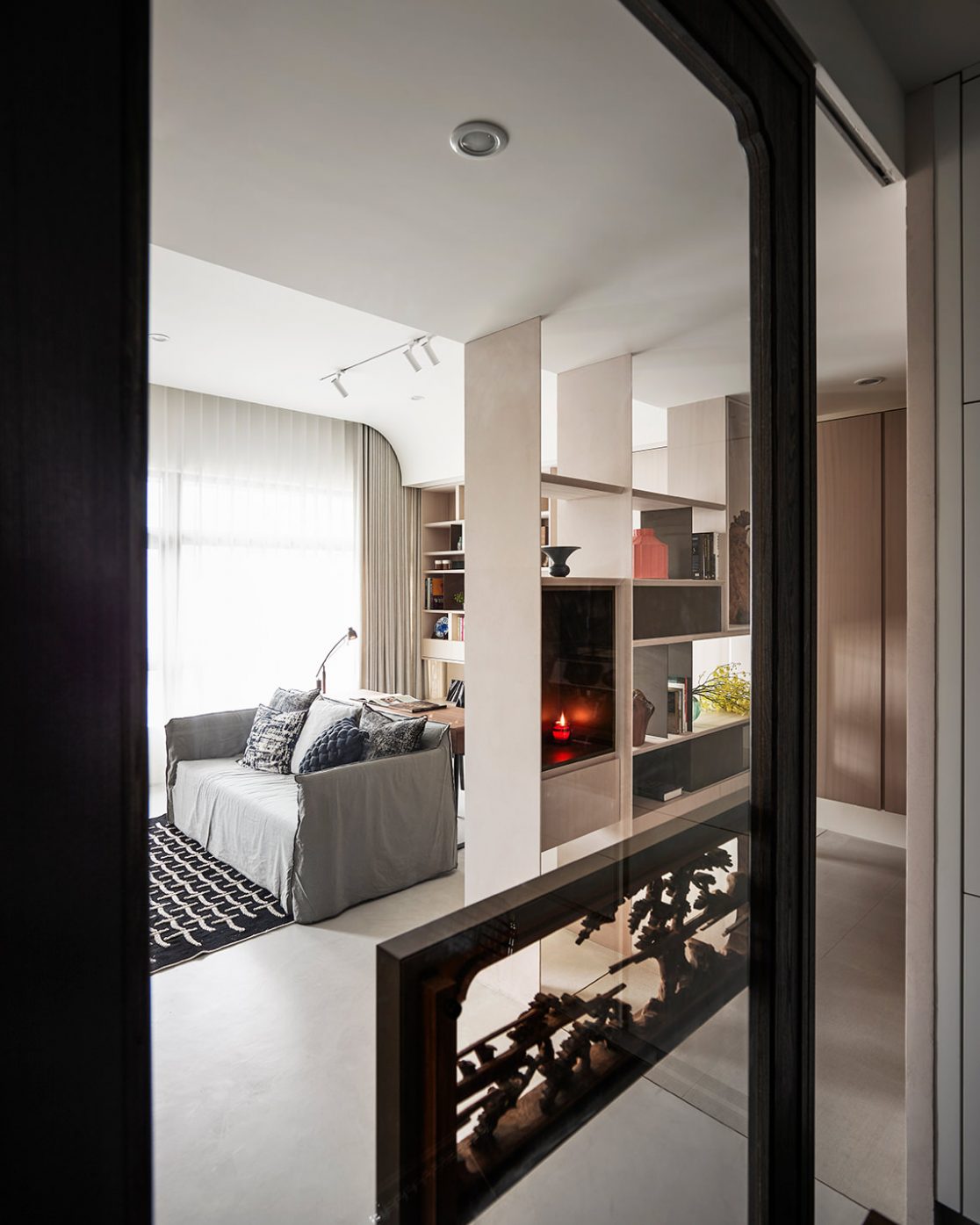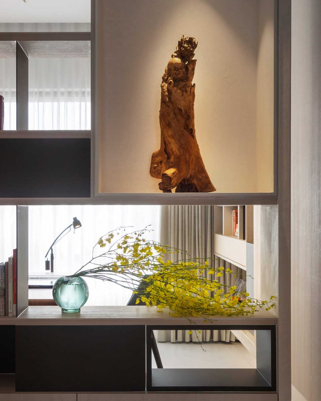 「形而上者謂之道,形而下者謂之器」,通過萬物體悟無形的自然本質,透過感官品嚐有形的日常一切。 整體設計從屋主夫婦的收藏與生活畫面中展開發想,空間之中不僅有著生活的動線與關聯,透過文學、古董、藝術、酒藏,涵養進思想、歷史、審美與品味。原本僅吊掛於前居宅樓梯間的雙面木雕,結合強化玻璃成為餐廚區的大拉門把手,衍伸而出中式造型的門框設計、天花弧線、以及整體配色與材質計畫。對應餐桌也是品酒聚會區域,雲海與珍貴的絕版酒標海報,堆砌更具人文特色的美感。四大美人的銅雕收藏,帶入了青銅材質的使用。礦物塗料、木化石、櫃體導角細節的洗鍊表現,則讓整體視覺上更加舒適沒有負擔。 雅緻的生活,除了博覽群書、積累高尚涵養,豐富的精神活動也是帶來心靈滿足的來源。在這個空間裡,我們透過軟硬裝設計,試圖堆疊出當代風雅,形而上的模樣。