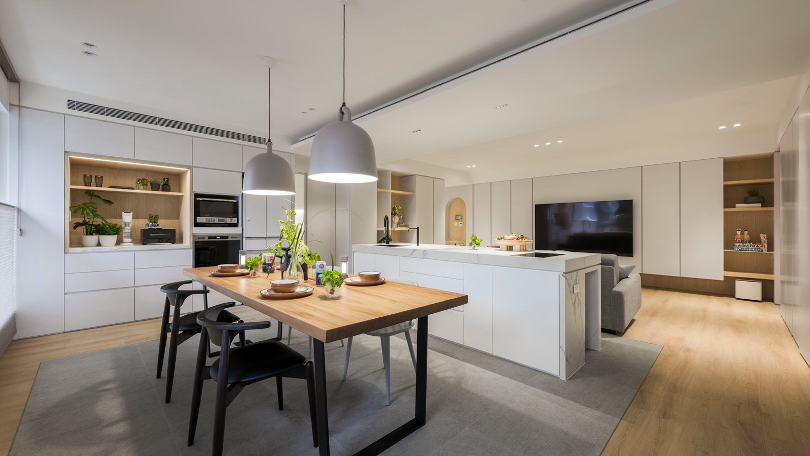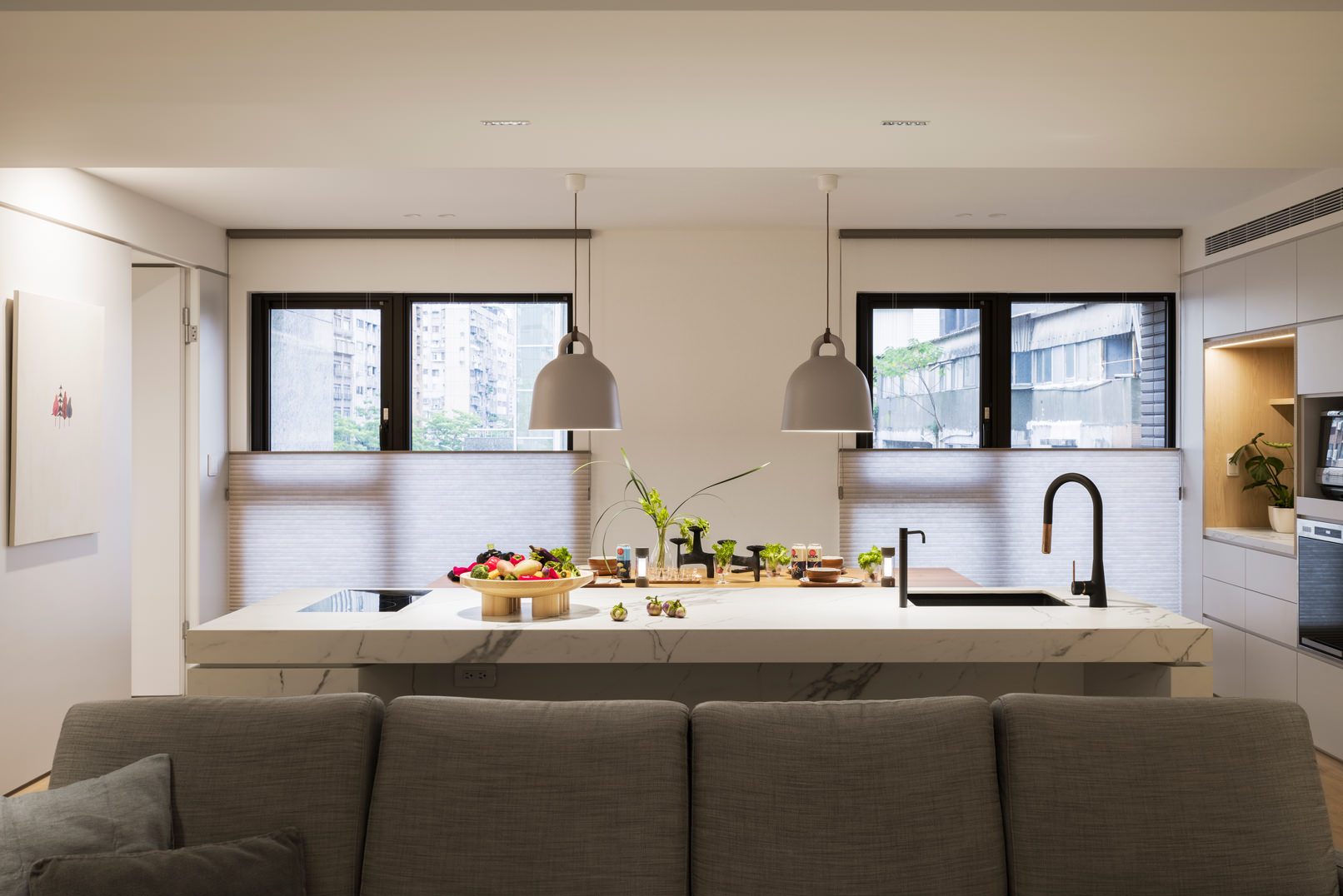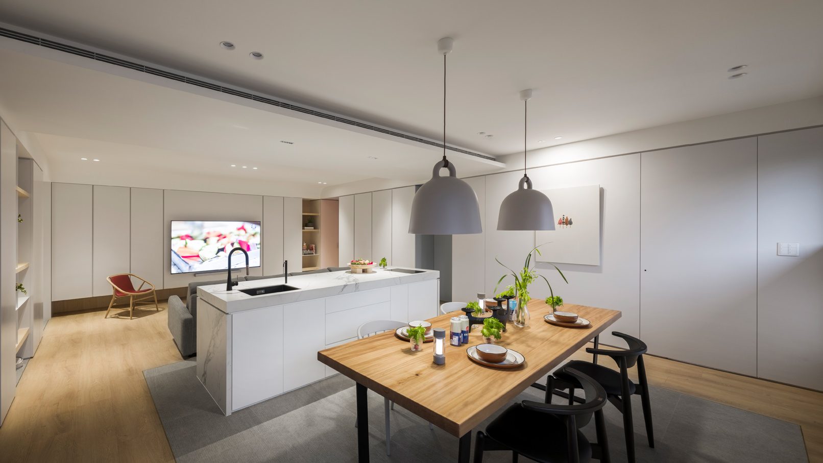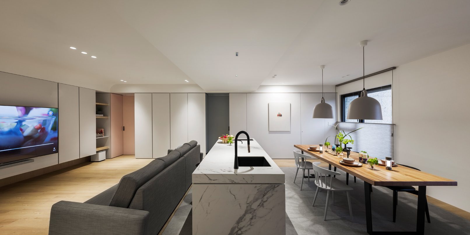 疫情改變了全世界的腳步,也深深影響住宅設計的思考與討論。當全家人長時間共處時,心的距離如何才能剛剛好?在尊重每一位成員的想法與需求下進行平面規劃,將原始為毛胚狀態的新成屋,形成各自可以時而獨享、時而共享的生活空間,如:爸爸的練功房、女孩們的全對稱臥房、媽媽的廚房與大中島⋯。改動原始公共區域在窗邊、房間於內部的配置,讓每個臥室都擁有對外視野的通透與光線,公共空間雖整合集中至內,但透過平行配置的餐桌、中島與沙發,整區更顯完整且串起彼此對話。材質及色調從屋主一家平日喜愛的大自然感受出發,以木質、白、灰調為主進行搭配,簡單清新。石紋磚拼出彷彿地毯模樣的地坪,尤其別具特色。有隱私、有交會,又近又遠的,正是家人間最適當的安全距離。疫情下的生活,能不感覺到受困,心,自然更加靠近。