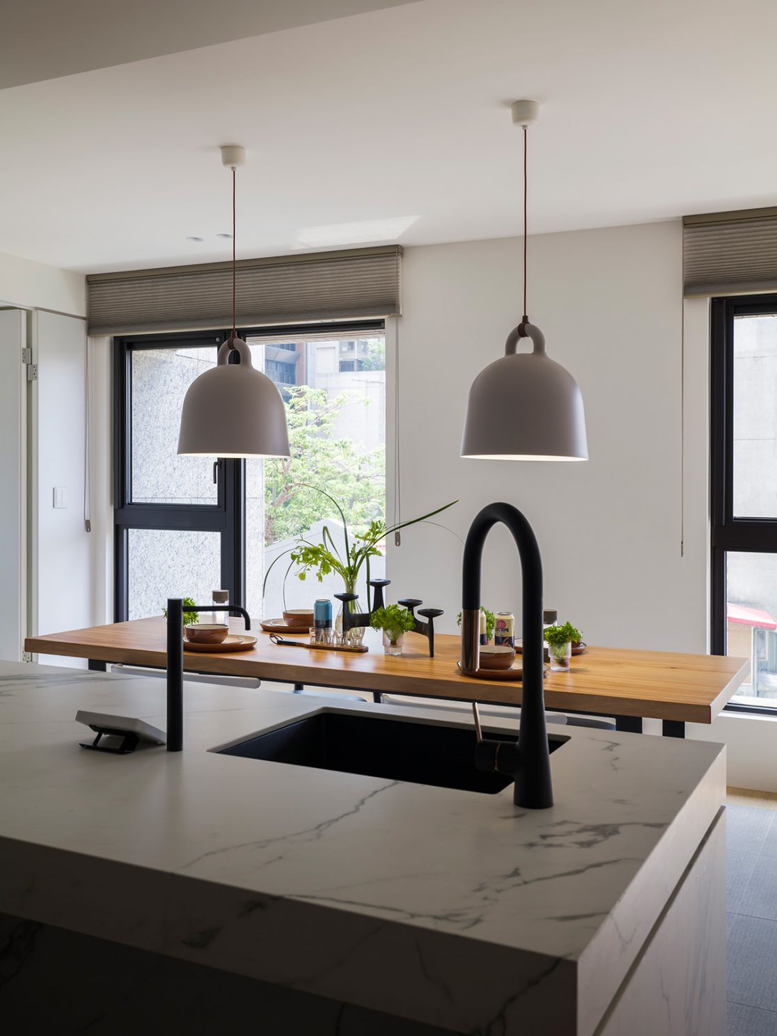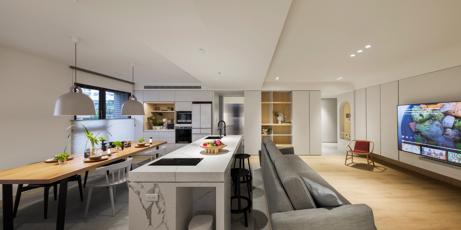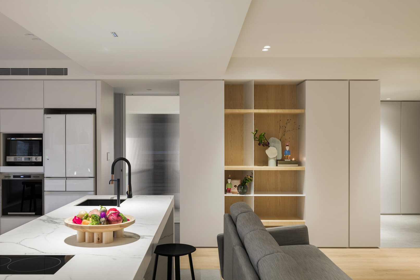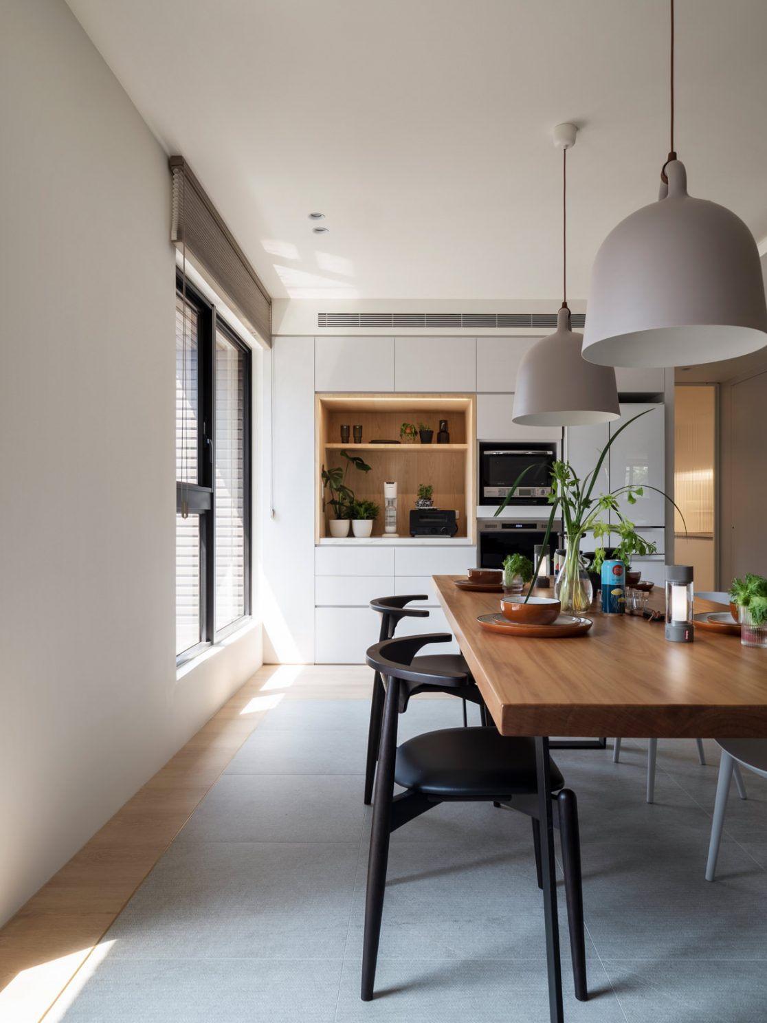 疫情改變了全世界的腳步,也深深影響住宅設計的思考與討論。當全家人長時間共處時,心的距離如何才能剛剛好?在尊重每一位成員的想法與需求下進行平面規劃,將原始為毛胚狀態的新成屋,形成各自可以時而獨享、時而共享的生活空間,如:爸爸的練功房、女孩們的全對稱臥房、媽媽的廚房與大中島⋯。改動原始公共區域在窗邊、房間於內部的配置,讓每個臥室都擁有對外視野的通透與光線,公共空間雖整合集中至內,但透過平行配置的餐桌、中島與沙發,整區更顯完整且串起彼此對話。材質及色調從屋主一家平日喜愛的大自然感受出發,以木質、白、灰調為主進行搭配,簡單清新。石紋磚拼出彷彿地毯模樣的地坪,尤其別具特色。有隱私、有交會,又近又遠的,正是家人間最適當的安全距離。疫情下的生活,能不感覺到受困,心,自然更加靠近。