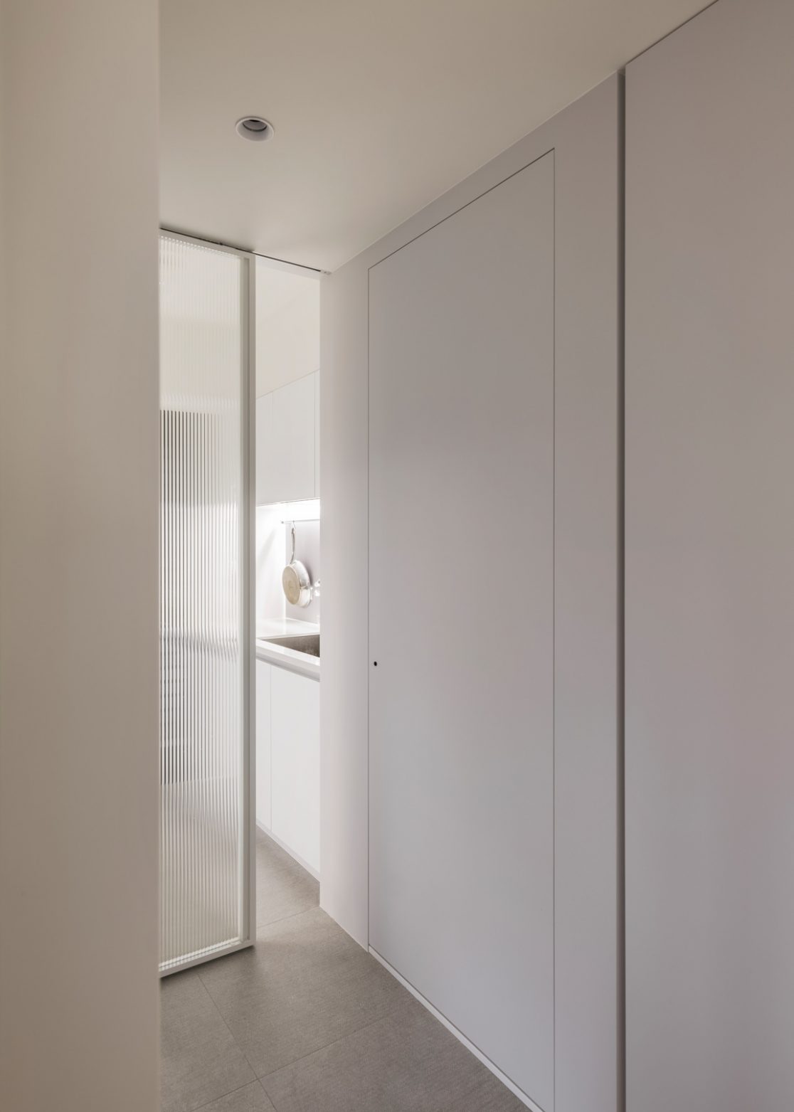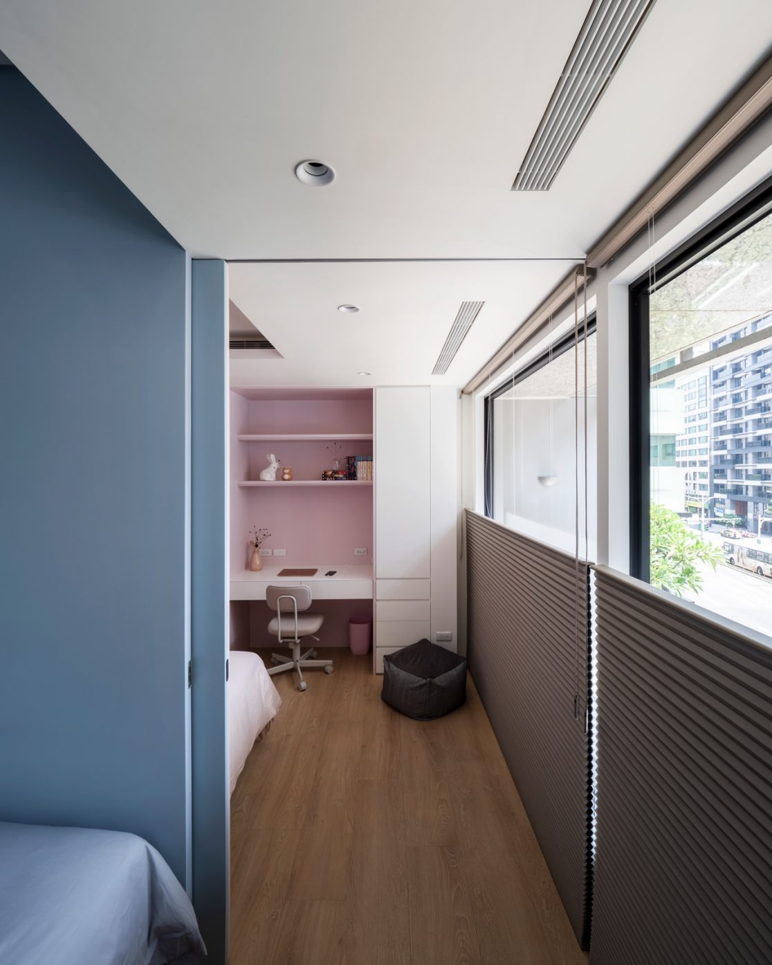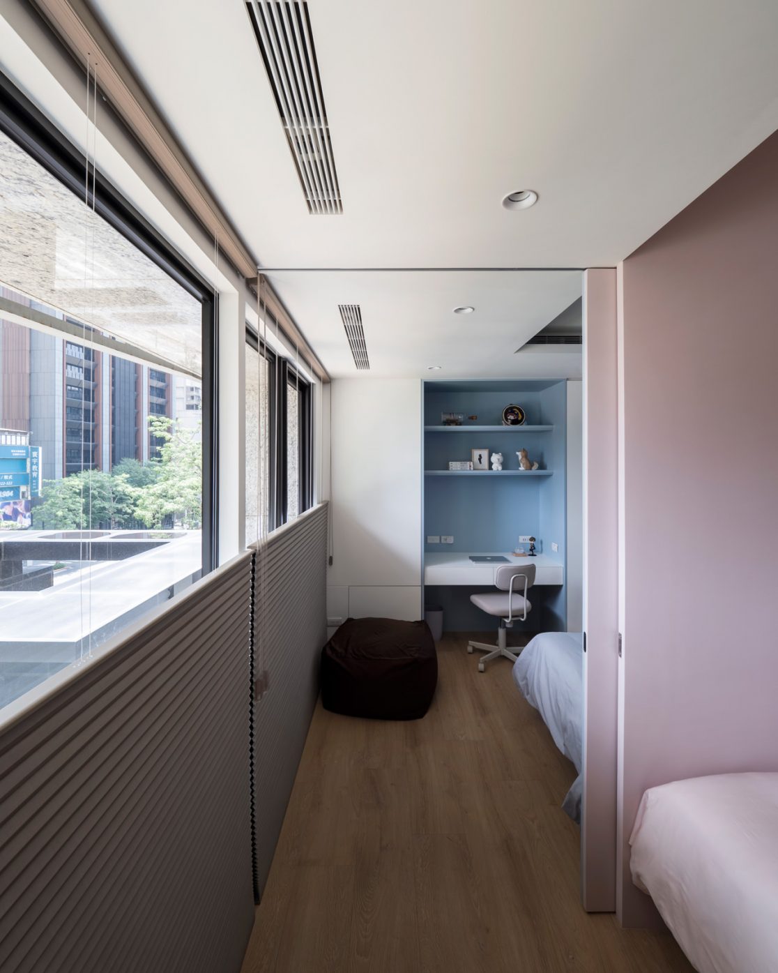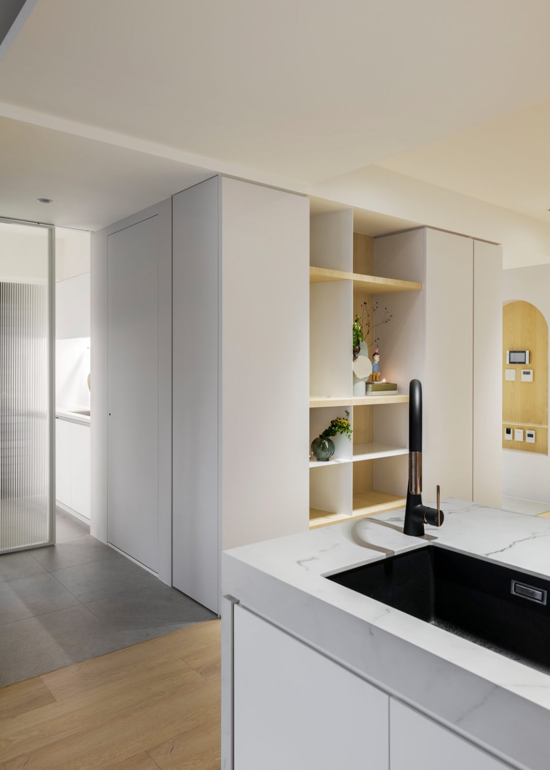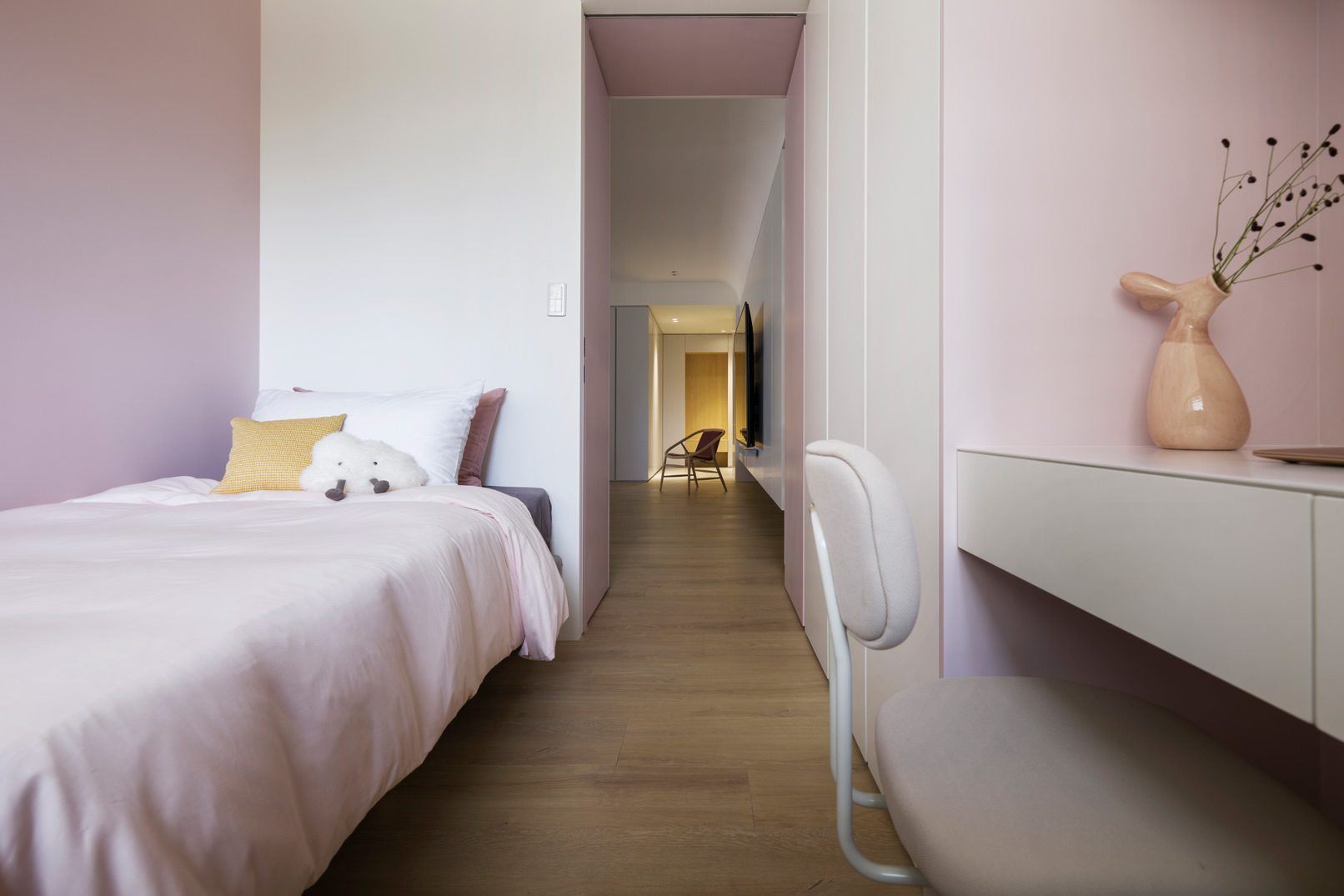 疫情改變了全世界的腳步,也深深影響住宅設計的思考與討論。當全家人長時間共處時,心的距離如何才能剛剛好?在尊重每一位成員的想法與需求下進行平面規劃,將原始為毛胚狀態的新成屋,形成各自可以時而獨享、時而共享的生活空間,如:爸爸的練功房、女孩們的全對稱臥房、媽媽的廚房與大中島⋯。改動原始公共區域在窗邊、房間於內部的配置,讓每個臥室都擁有對外視野的通透與光線,公共空間雖整合集中至內,但透過平行配置的餐桌、中島與沙發,整區更顯完整且串起彼此對話。材質及色調從屋主一家平日喜愛的大自然感受出發,以木質、白、灰調為主進行搭配,簡單清新。石紋磚拼出彷彿地毯模樣的地坪,尤其別具特色。有隱私、有交會,又近又遠的,正是家人間最適當的安全距離。疫情下的生活,能不感覺到受困,心,自然更加靠近。