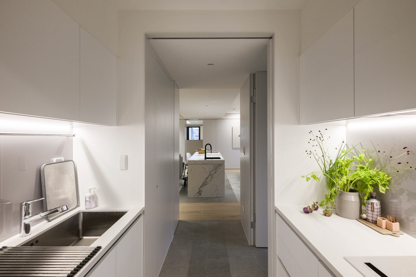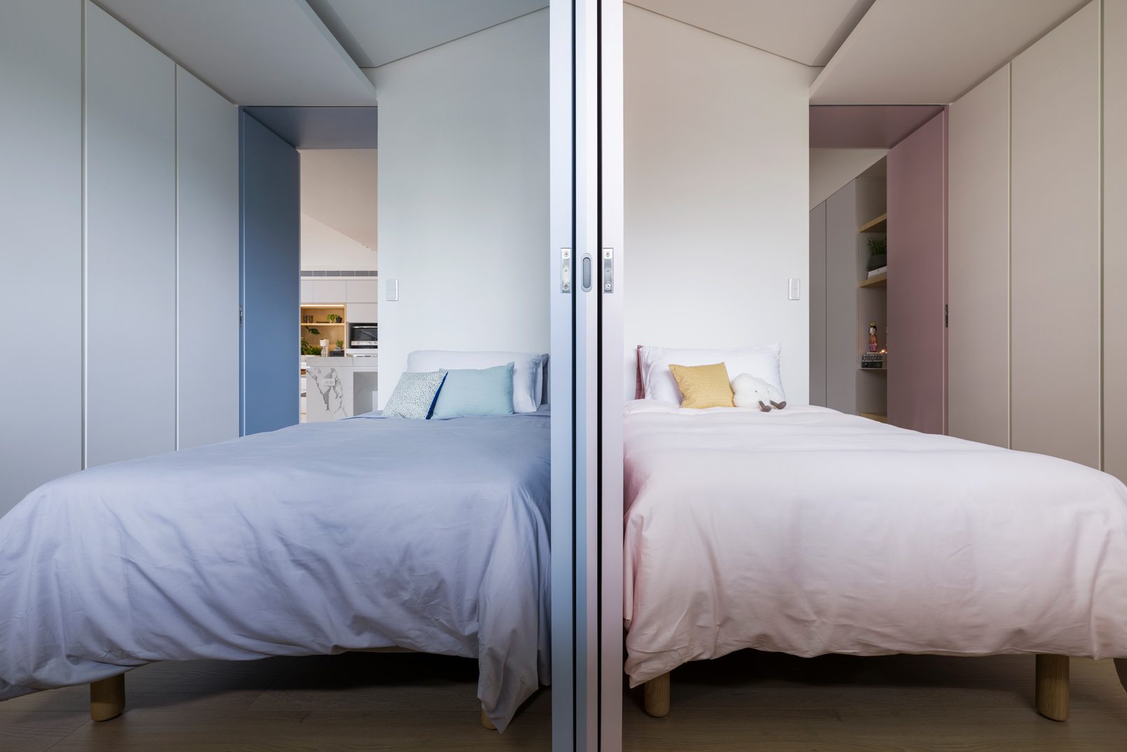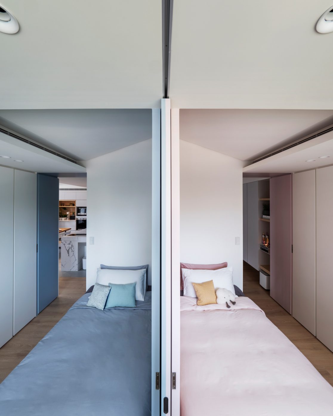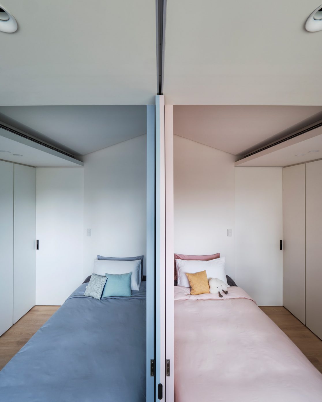 疫情改變了全世界的腳步,也深深影響住宅設計的思考與討論。當全家人長時間共處時,心的距離如何才能剛剛好?在尊重每一位成員的想法與需求下進行平面規劃,將原始為毛胚狀態的新成屋,形成各自可以時而獨享、時而共享的生活空間,如:爸爸的練功房、女孩們的全對稱臥房、媽媽的廚房與大中島⋯。改動原始公共區域在窗邊、房間於內部的配置,讓每個臥室都擁有對外視野的通透與光線,公共空間雖整合集中至內,但透過平行配置的餐桌、中島與沙發,整區更顯完整且串起彼此對話。材質及色調從屋主一家平日喜愛的大自然感受出發,以木質、白、灰調為主進行搭配,簡單清新。石紋磚拼出彷彿地毯模樣的地坪,尤其別具特色。有隱私、有交會,又近又遠的,正是家人間最適當的安全距離。疫情下的生活,能不感覺到受困,心,自然更加靠近。
