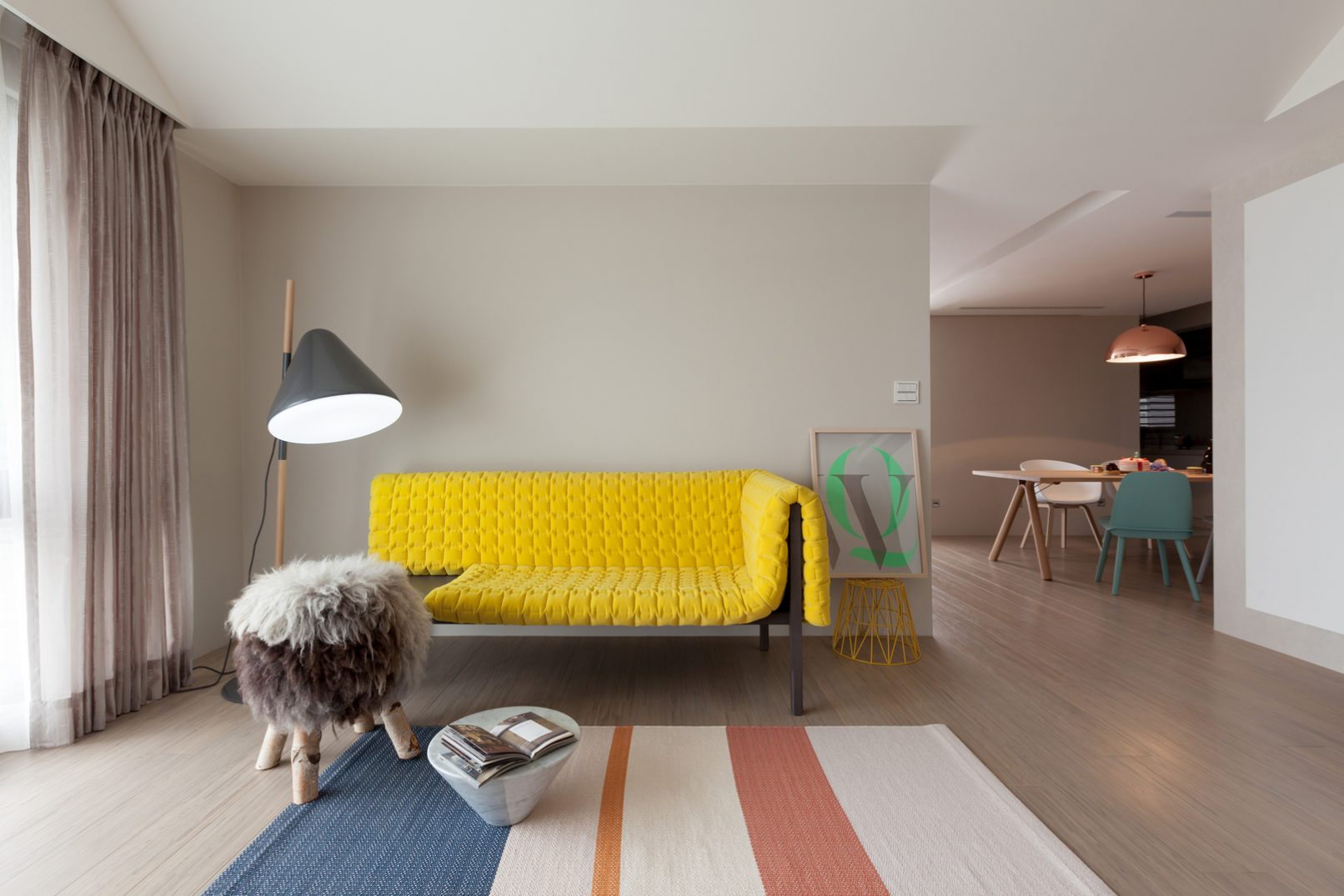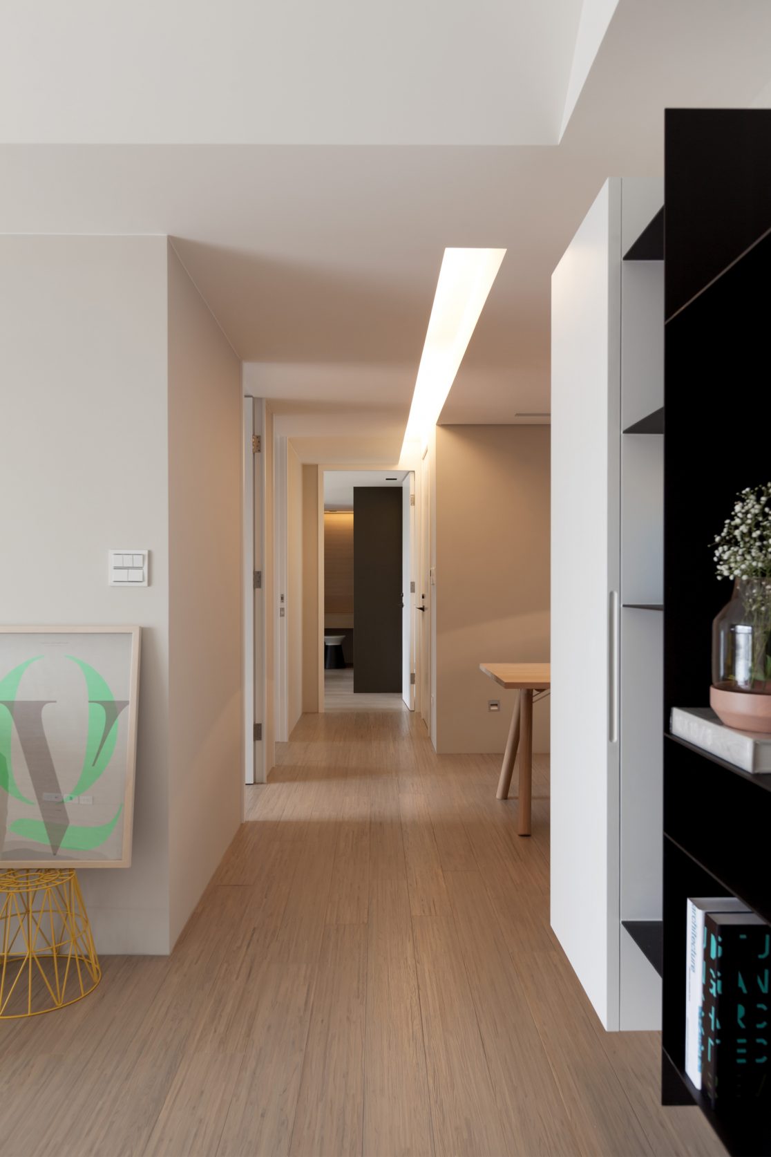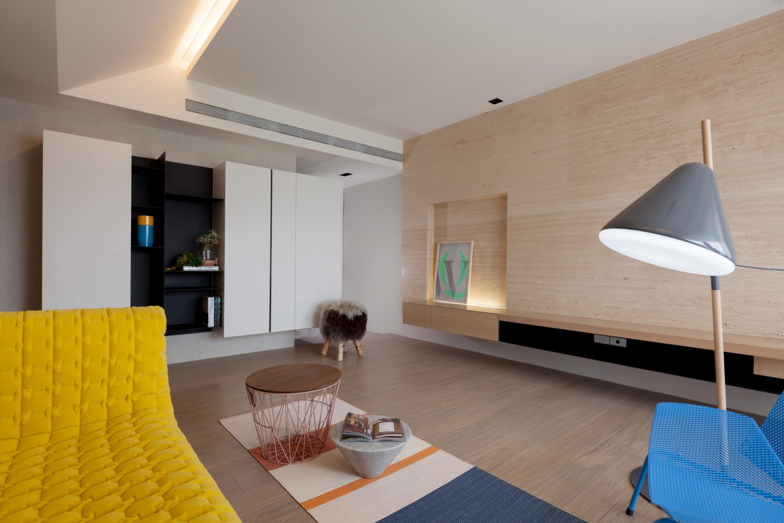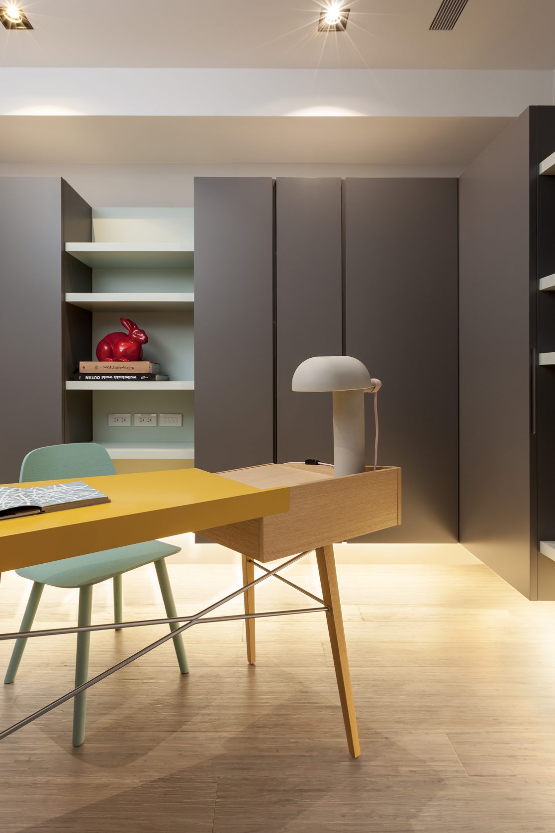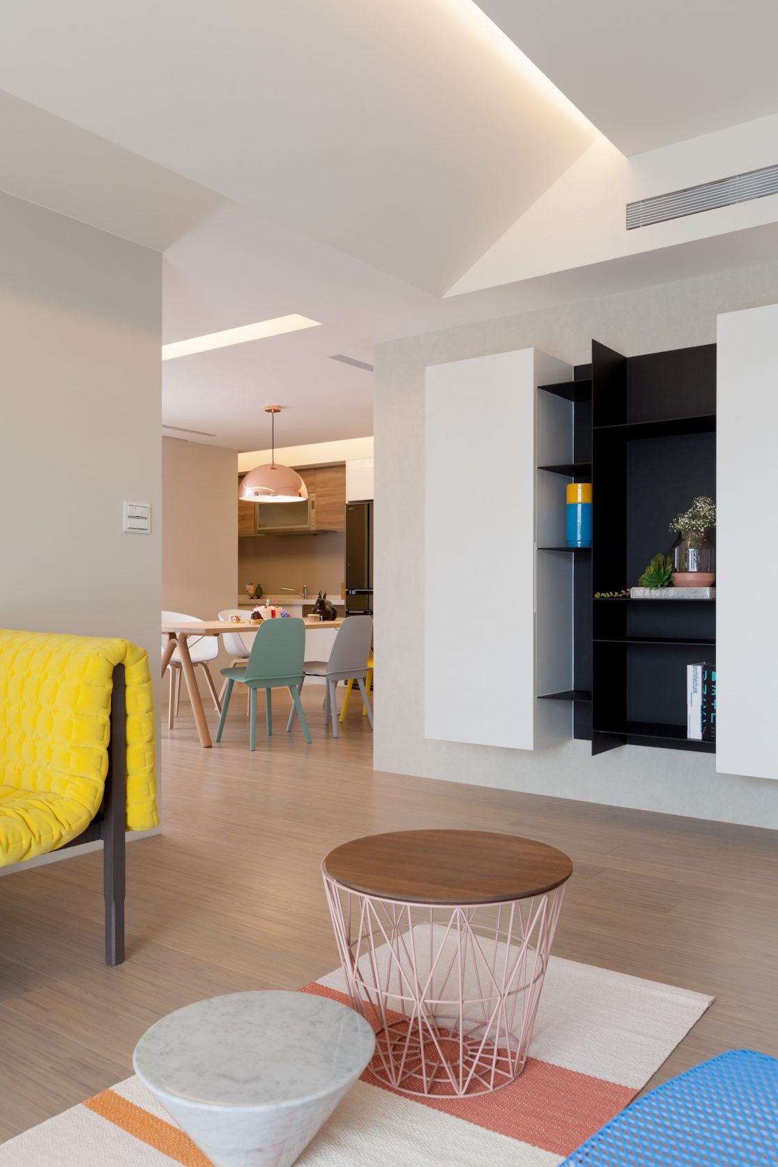 一個疼愛孩子的家庭,自然充滿的活力與歡笑。一個以孩子為中心的家,自然也帶著色彩、活潑與創意。想像為一個愛家的男人設計的房子:燈光是溫暖的,色彩是繽紛的,空間是流暢的,動線是清晰的。客廳有大片溫潤木材質牆與斜斜的天花,添上暖色家具頓時豐富了空間的氣氛;延續至餐廚的暖色調,也為家人相聚的重心添上溫馨歡樂。而在各自的小空間裡,大人工作時可輕易觀察小孩,小孩玩耍時可隨時看見爸媽,安心自在地生活與互動,這就是家該有的真實樣貌。