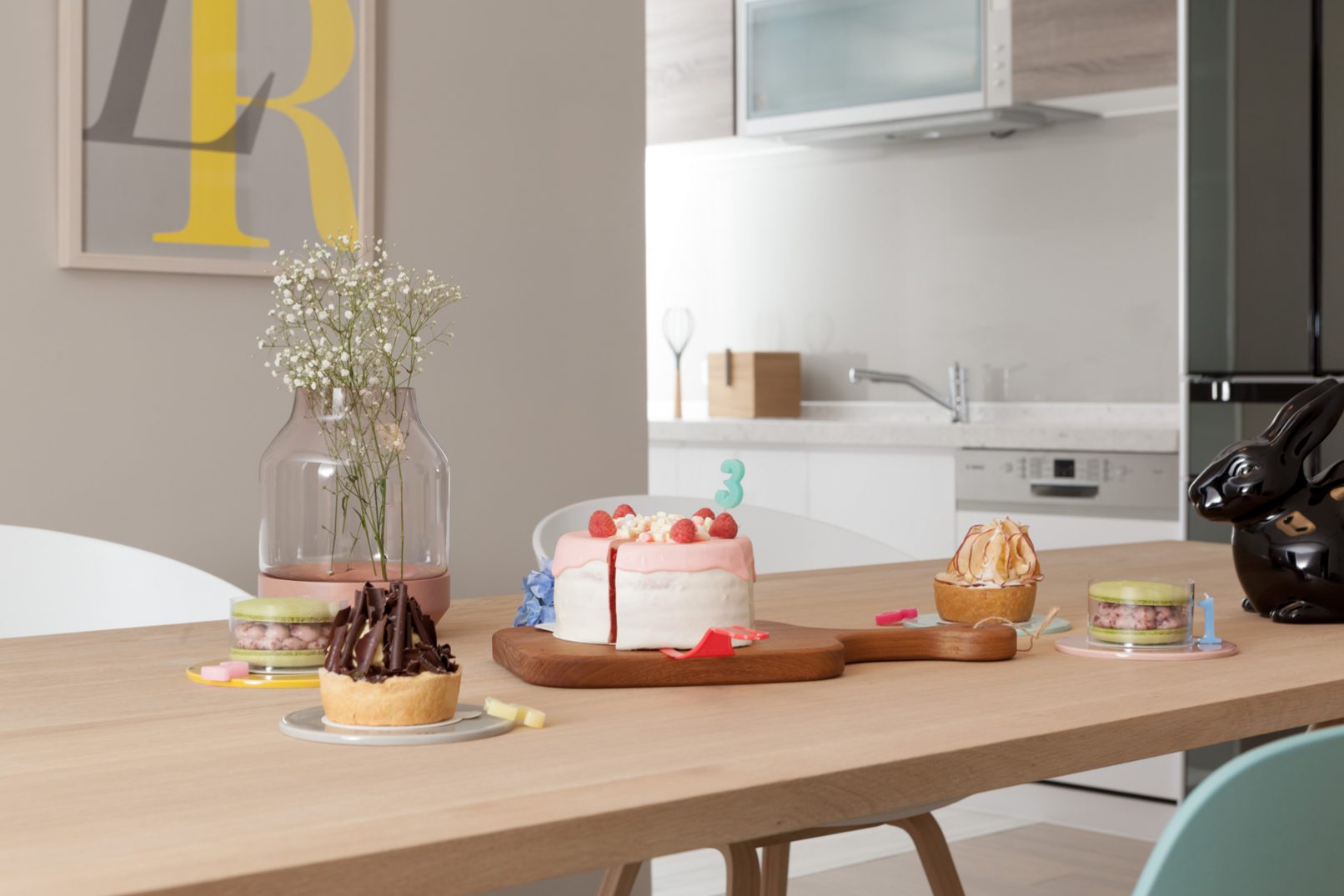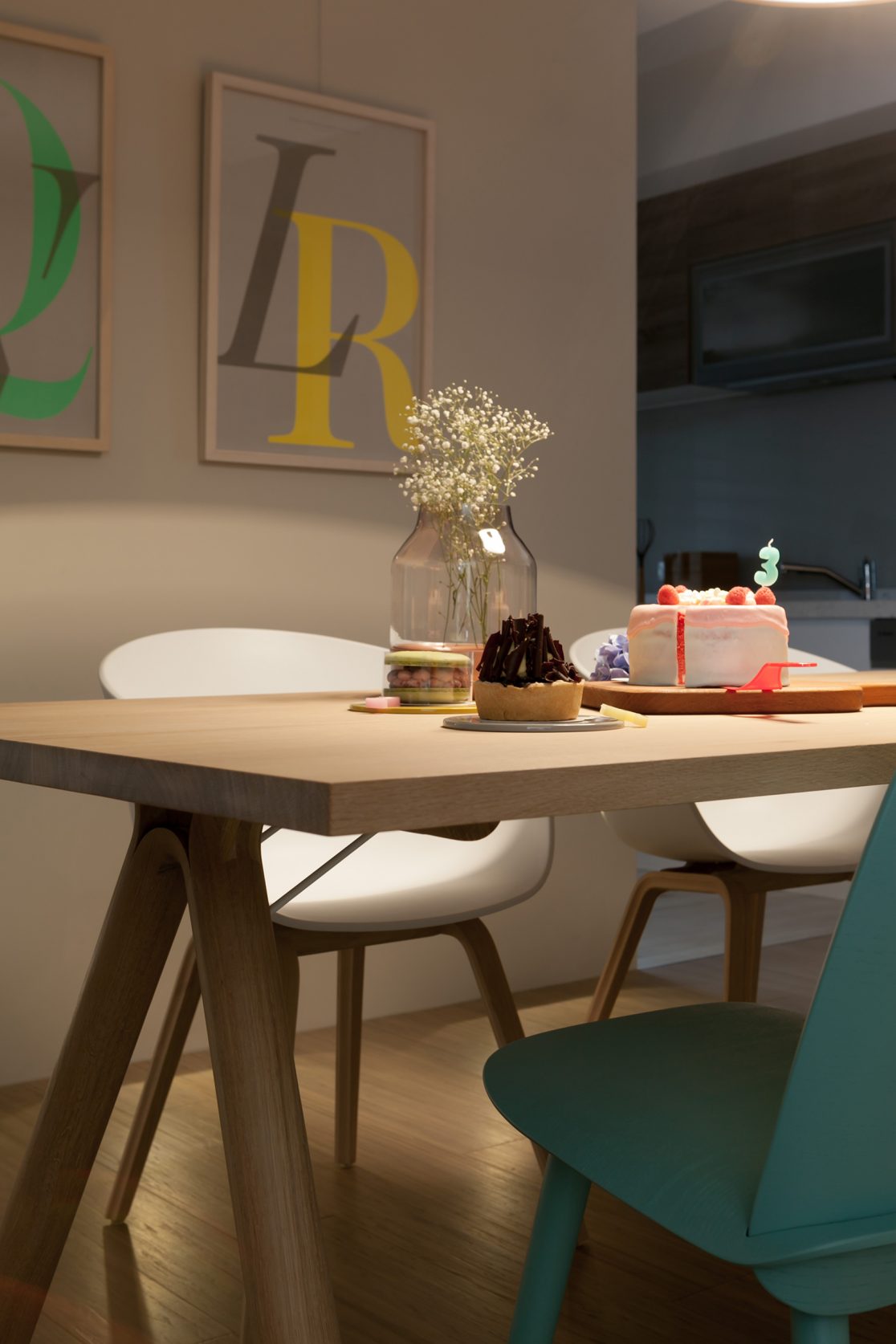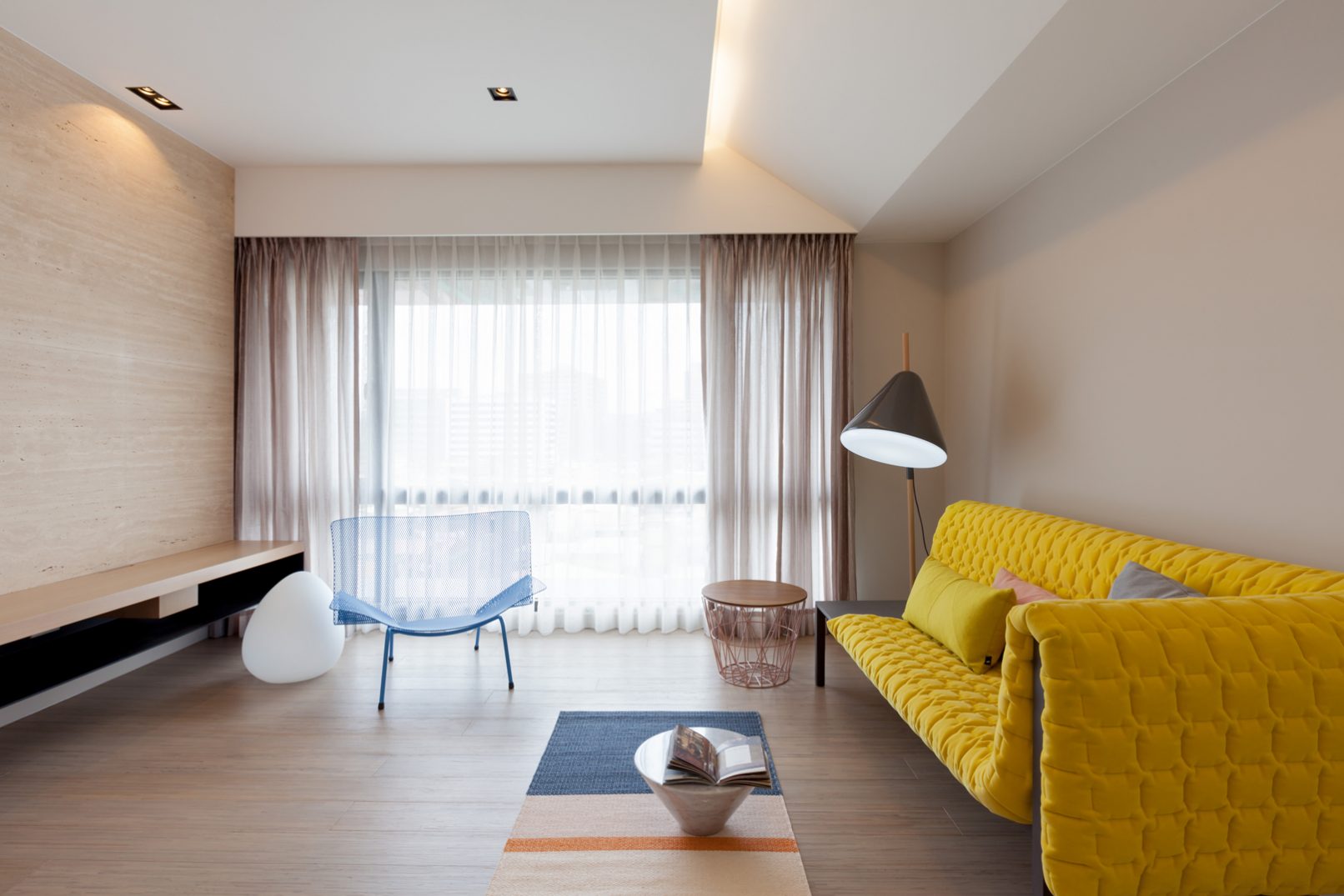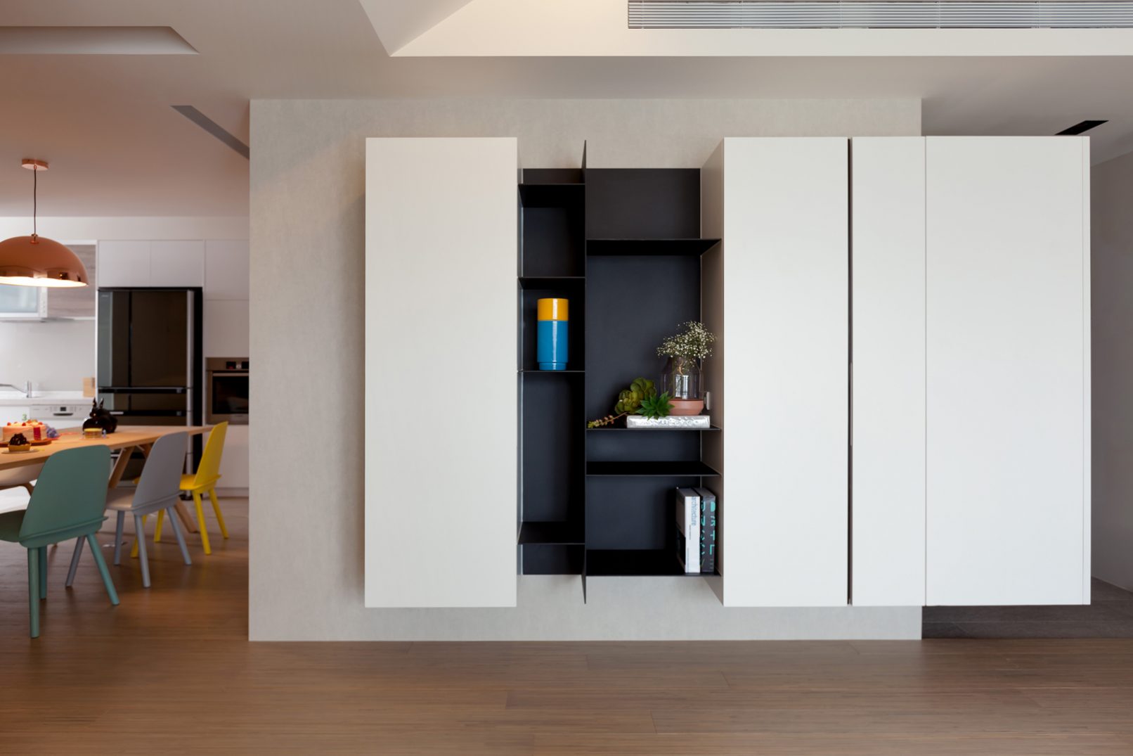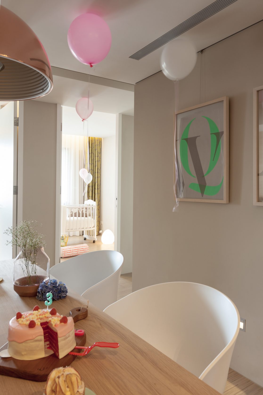 一個疼愛孩子的家庭,自然充滿的活力與歡笑。一個以孩子為中心的家,自然也帶著色彩、活潑與創意。想像為一個愛家的男人設計的房子:燈光是溫暖的,色彩是繽紛的,空間是流暢的,動線是清晰的。客廳有大片溫潤木材質牆與斜斜的天花,添上暖色家具頓時豐富了空間的氣氛;延續至餐廚的暖色調,也為家人相聚的重心添上溫馨歡樂。而在各自的小空間裡,大人工作時可輕易觀察小孩,小孩玩耍時可隨時看見爸媽,安心自在地生活與互動,這就是家該有的真實樣貌。