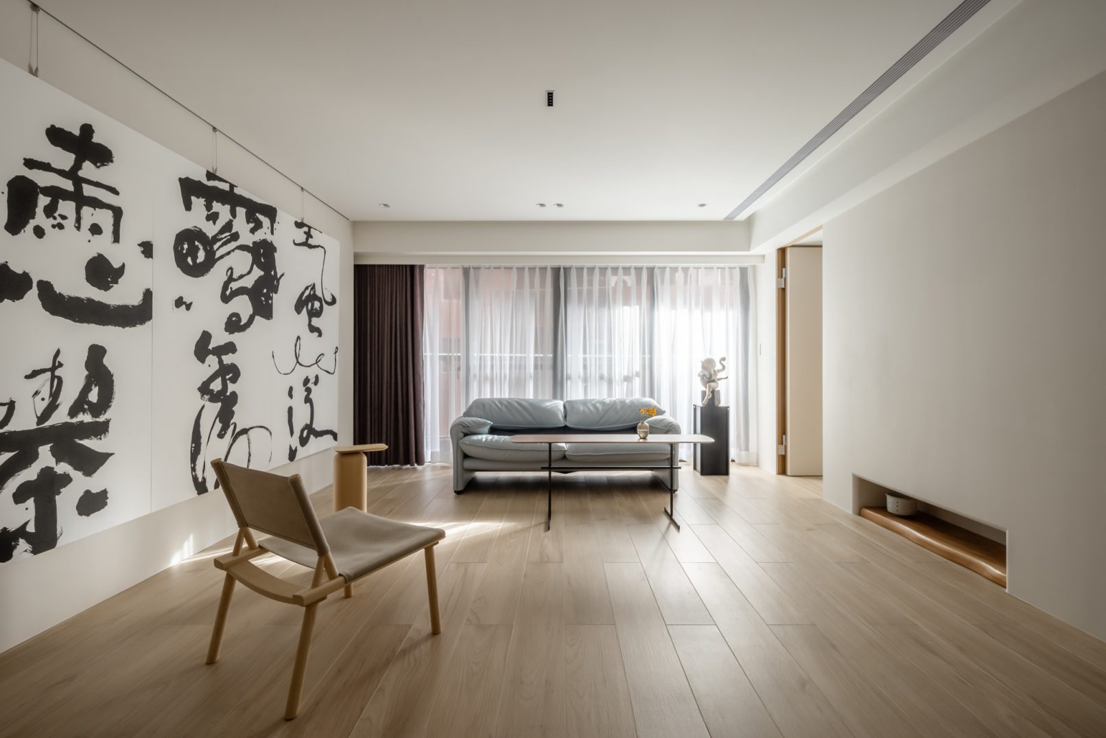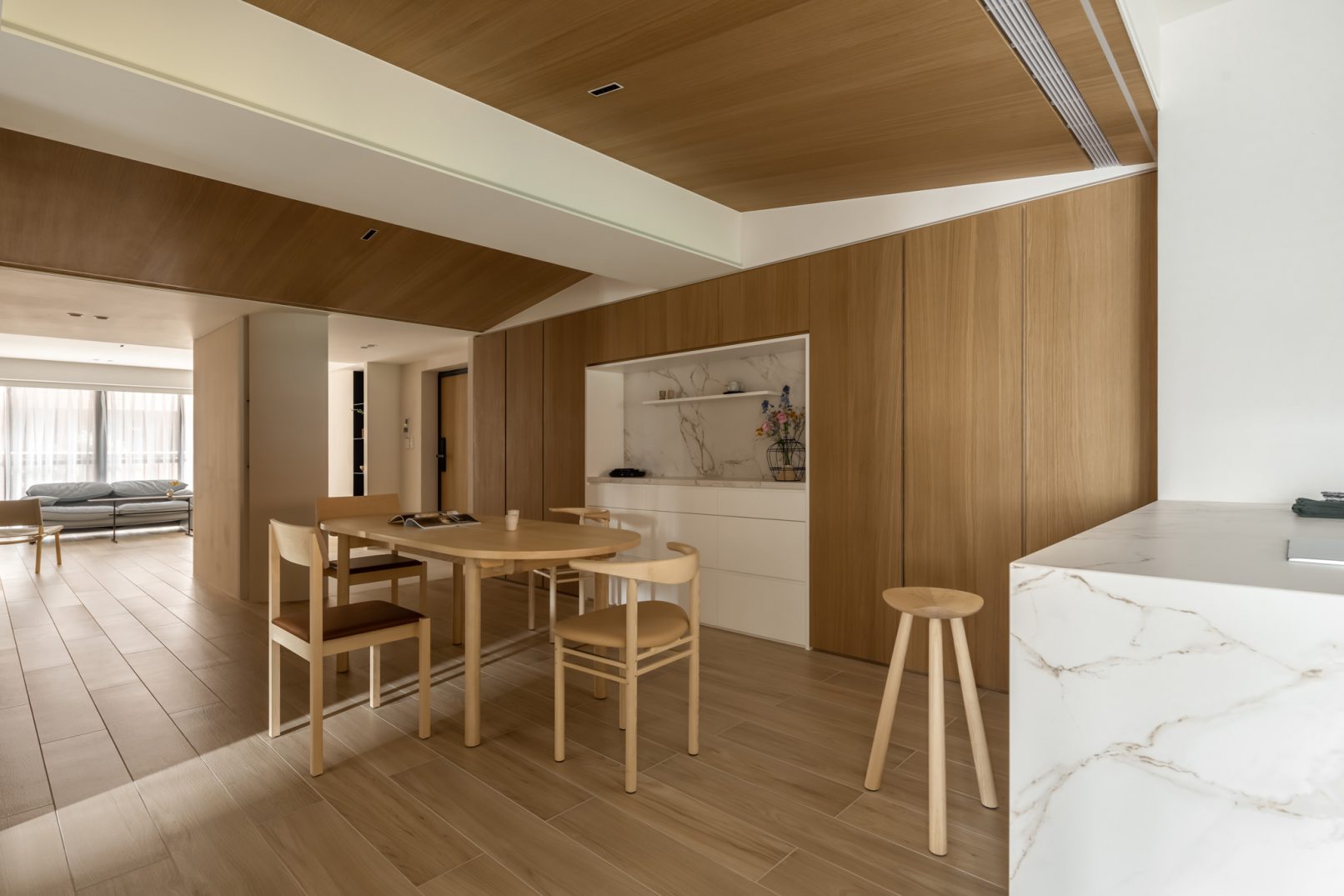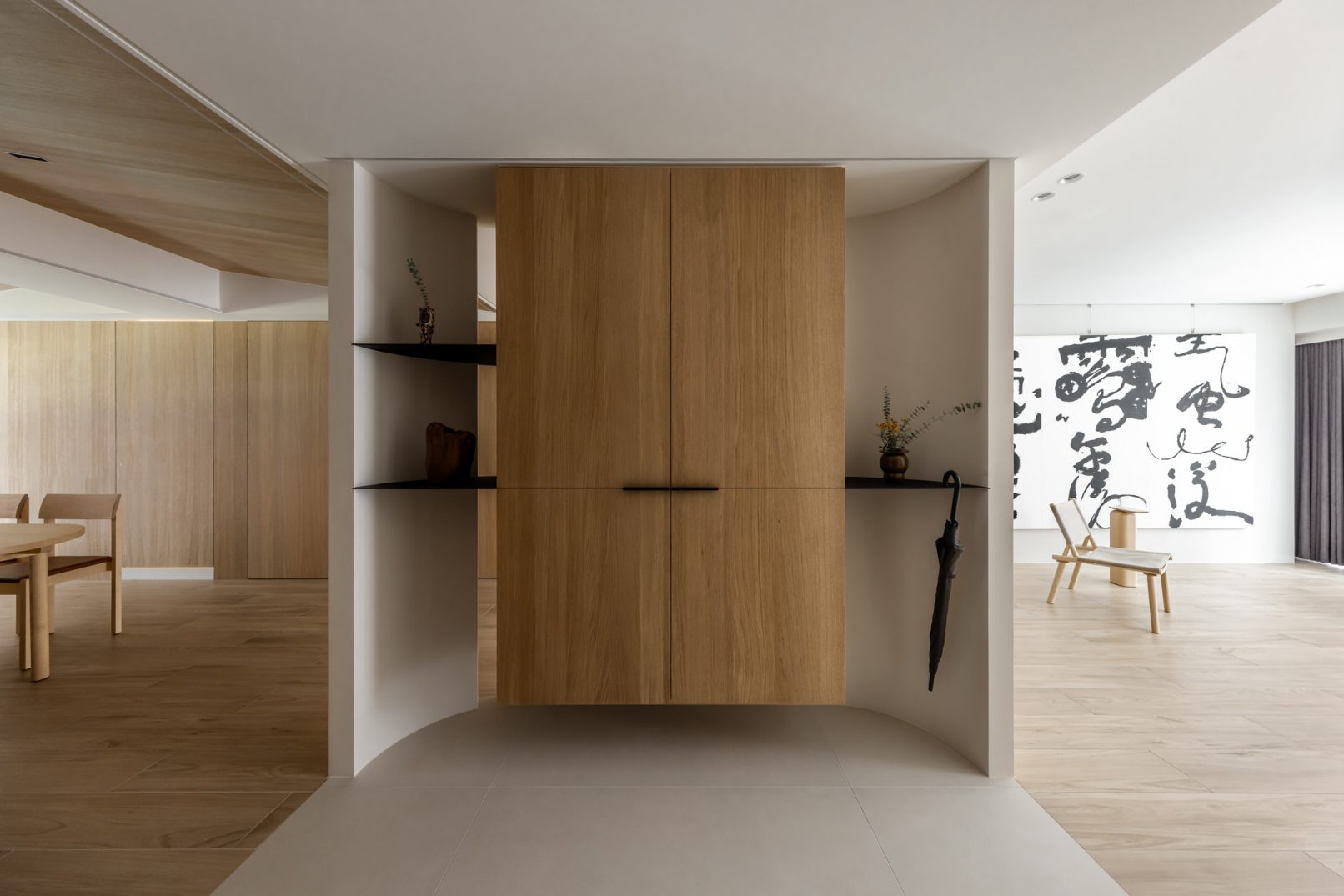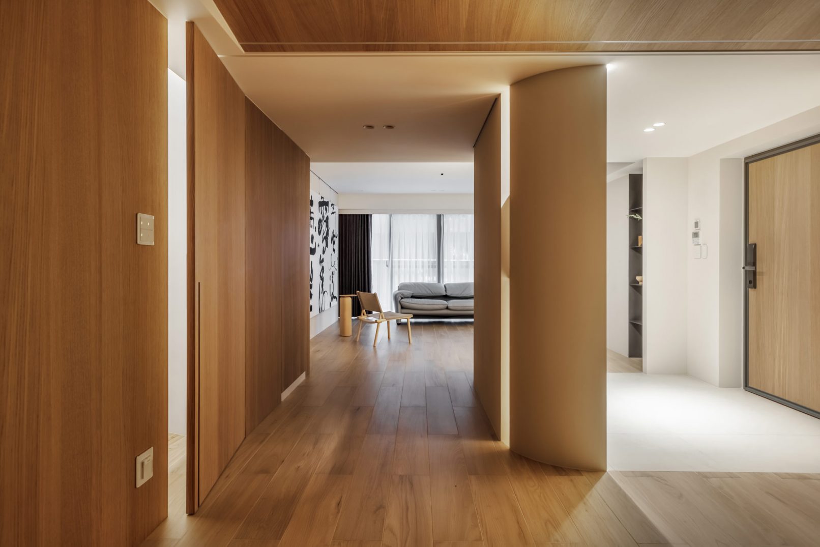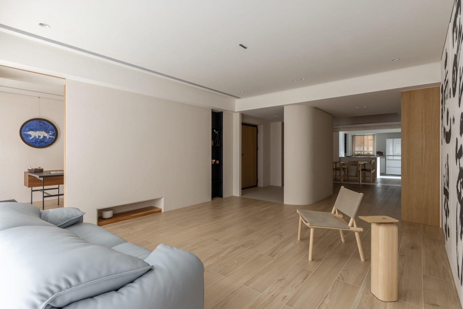 自美返台的屋主夫婦,生活簡單樸實,外籍先生為熱愛東方文化的哲學學者,收藏字畫、書法,同時也閱讀東方哲學家如莊子孟子的著作。設計團隊以有所為的設計,解決原始屋況及條件皆不盡理想的空間問題,包含以入口弧形玄關設計,留有光與視覺穿透空間,兩側提供端景展示、傘架等生活機能,化解原始入門見廁室的問題;在長型略窄的有限空間中,巧妙地劃分出串聯流通的場域關係,立面及天花的視覺比例設計則帶進舒適性,同時降低原始屋高不足給人的壓迫感。「樸素而天下莫能與之爭美」則是材質主軸,選擇清淨無為的木質,點綴清雅石材與藝術收藏,鋪塑空間淡雅樣貌。整體改造設計融合西式和東方涵養,營造讓人心安定的自然之家。