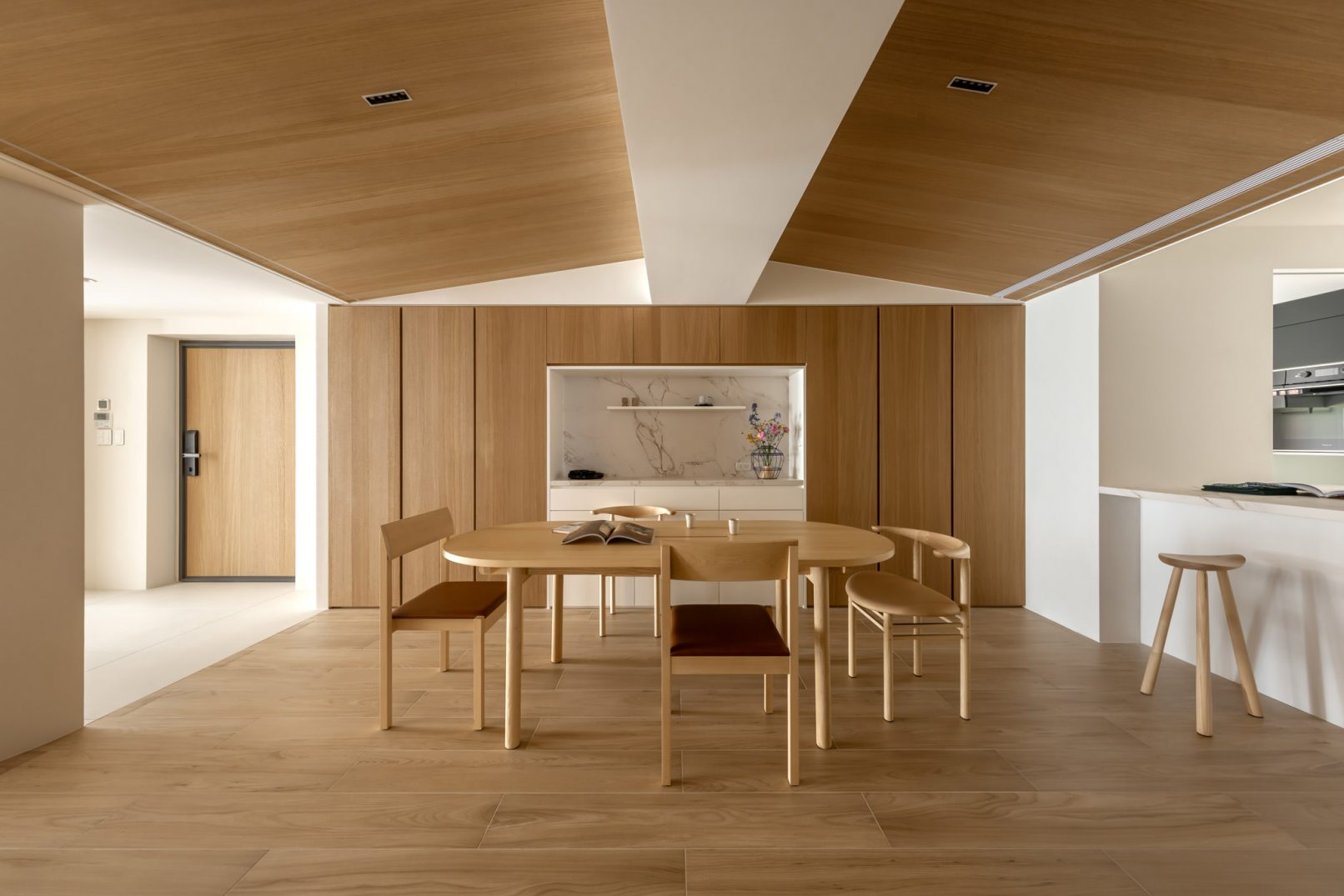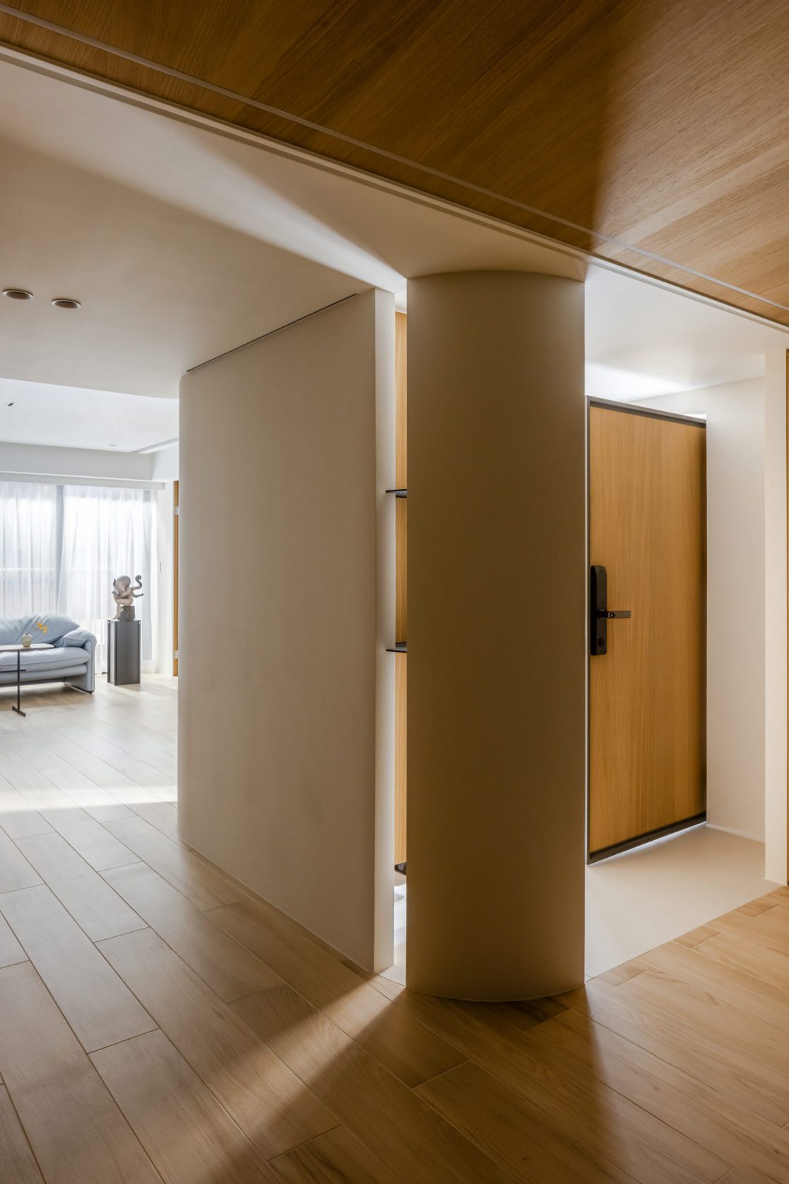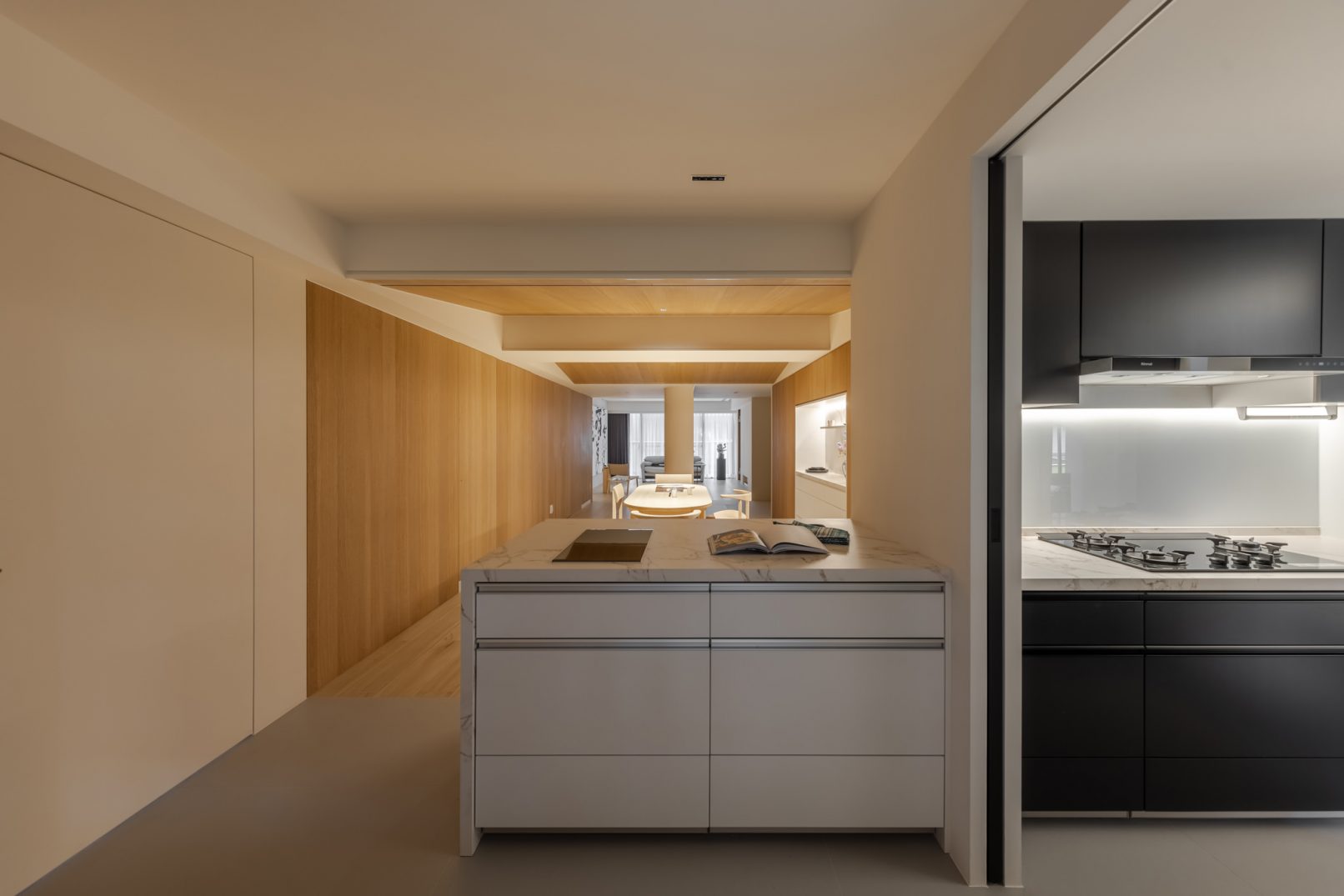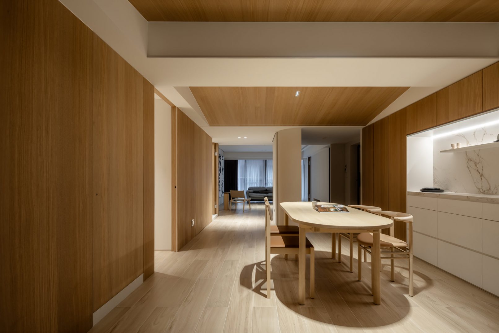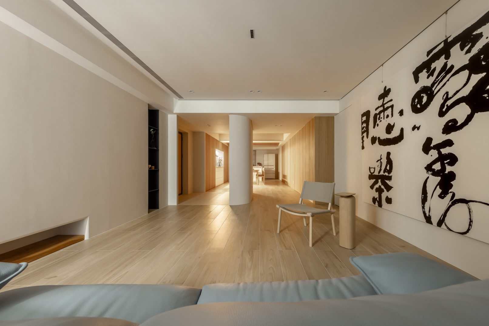 自美返台的屋主夫婦,生活簡單樸實,外籍先生為熱愛東方文化的哲學學者,收藏字畫、書法,同時也閱讀東方哲學家如莊子孟子的著作。設計團隊以有所為的設計,解決原始屋況及條件皆不盡理想的空間問題,包含以入口弧形玄關設計,留有光與視覺穿透空間,兩側提供端景展示、傘架等生活機能,化解原始入門見廁室的問題;在長型略窄的有限空間中,巧妙地劃分出串聯流通的場域關係,立面及天花的視覺比例設計則帶進舒適性,同時降低原始屋高不足給人的壓迫感。「樸素而天下莫能與之爭美」則是材質主軸,選擇清淨無為的木質,點綴清雅石材與藝術收藏,鋪塑空間淡雅樣貌。整體改造設計融合西式和東方涵養,營造讓人心安定的自然之家。