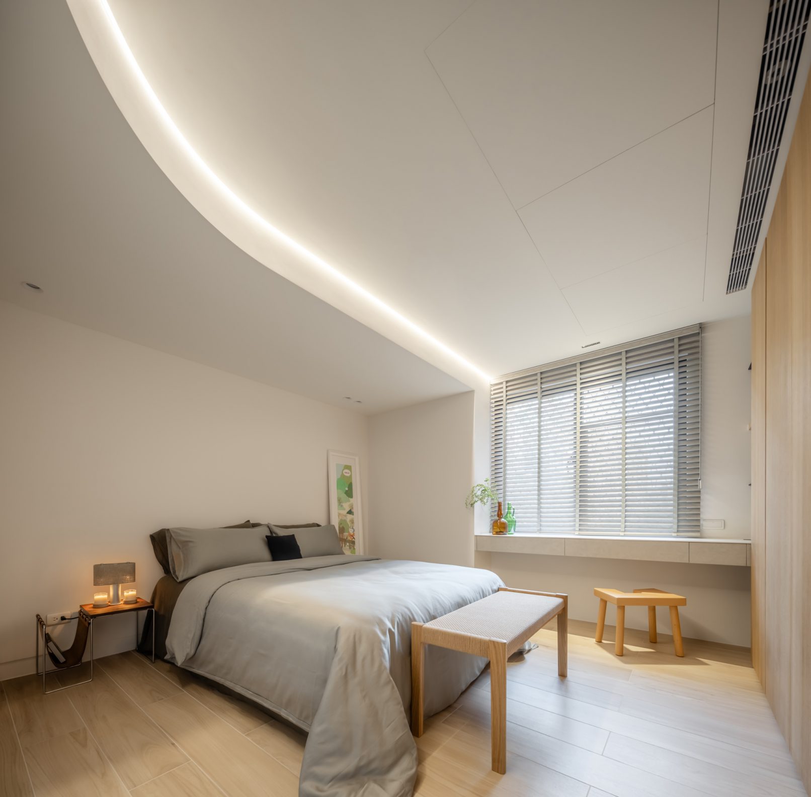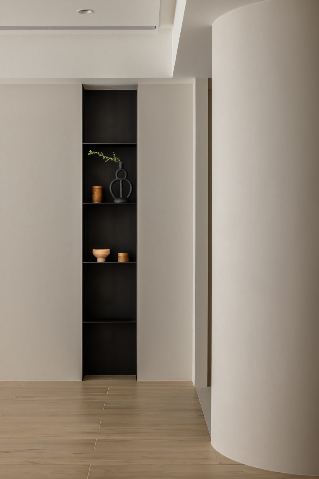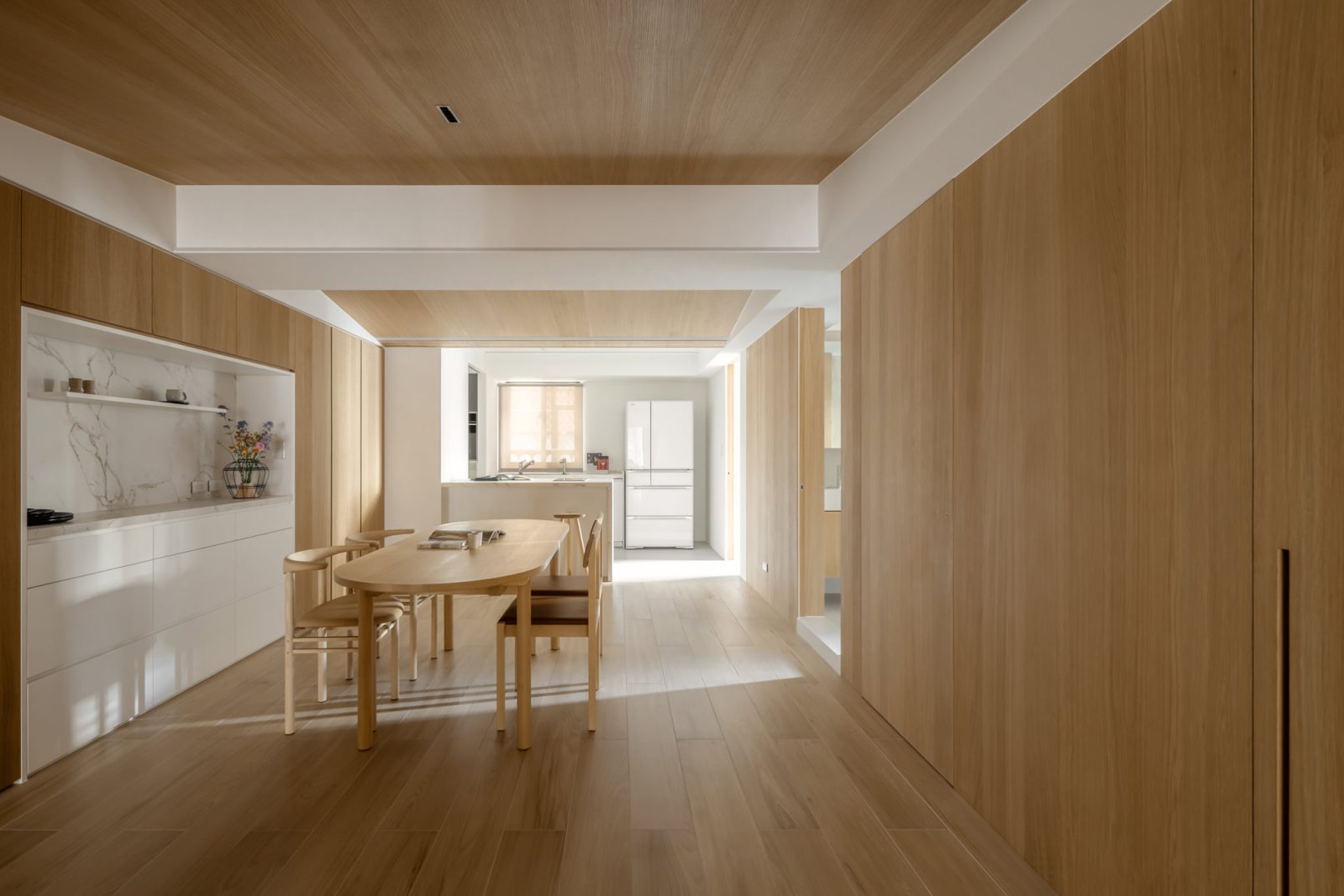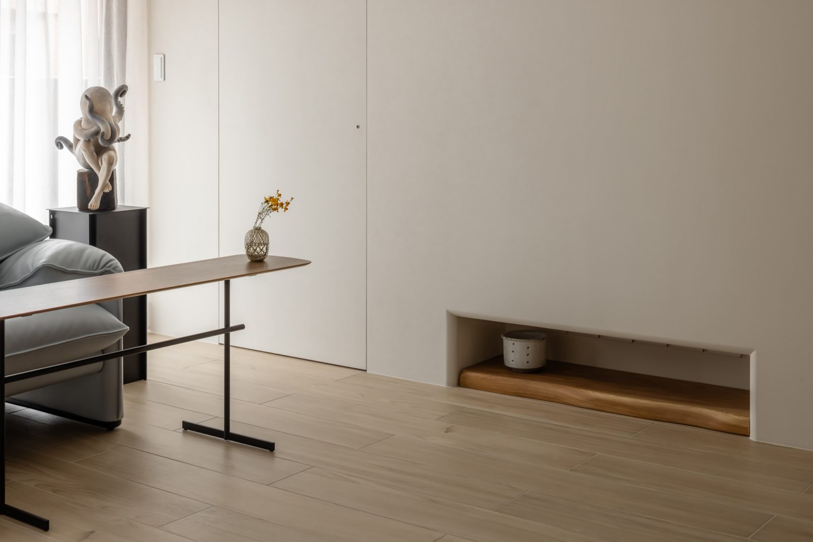 自美返台的屋主夫婦,生活簡單樸實,外籍先生為熱愛東方文化的哲學學者,收藏字畫、書法,同時也閱讀東方哲學家如莊子孟子的著作。設計團隊以有所為的設計,解決原始屋況及條件皆不盡理想的空間問題,包含以入口弧形玄關設計,留有光與視覺穿透空間,兩側提供端景展示、傘架等生活機能,化解原始入門見廁室的問題;在長型略窄的有限空間中,巧妙地劃分出串聯流通的場域關係,立面及天花的視覺比例設計則帶進舒適性,同時降低原始屋高不足給人的壓迫感。「樸素而天下莫能與之爭美」則是材質主軸,選擇清淨無為的木質,點綴清雅石材與藝術收藏,鋪塑空間淡雅樣貌。整體改造設計融合西式和東方涵養,營造讓人心安定的自然之家。