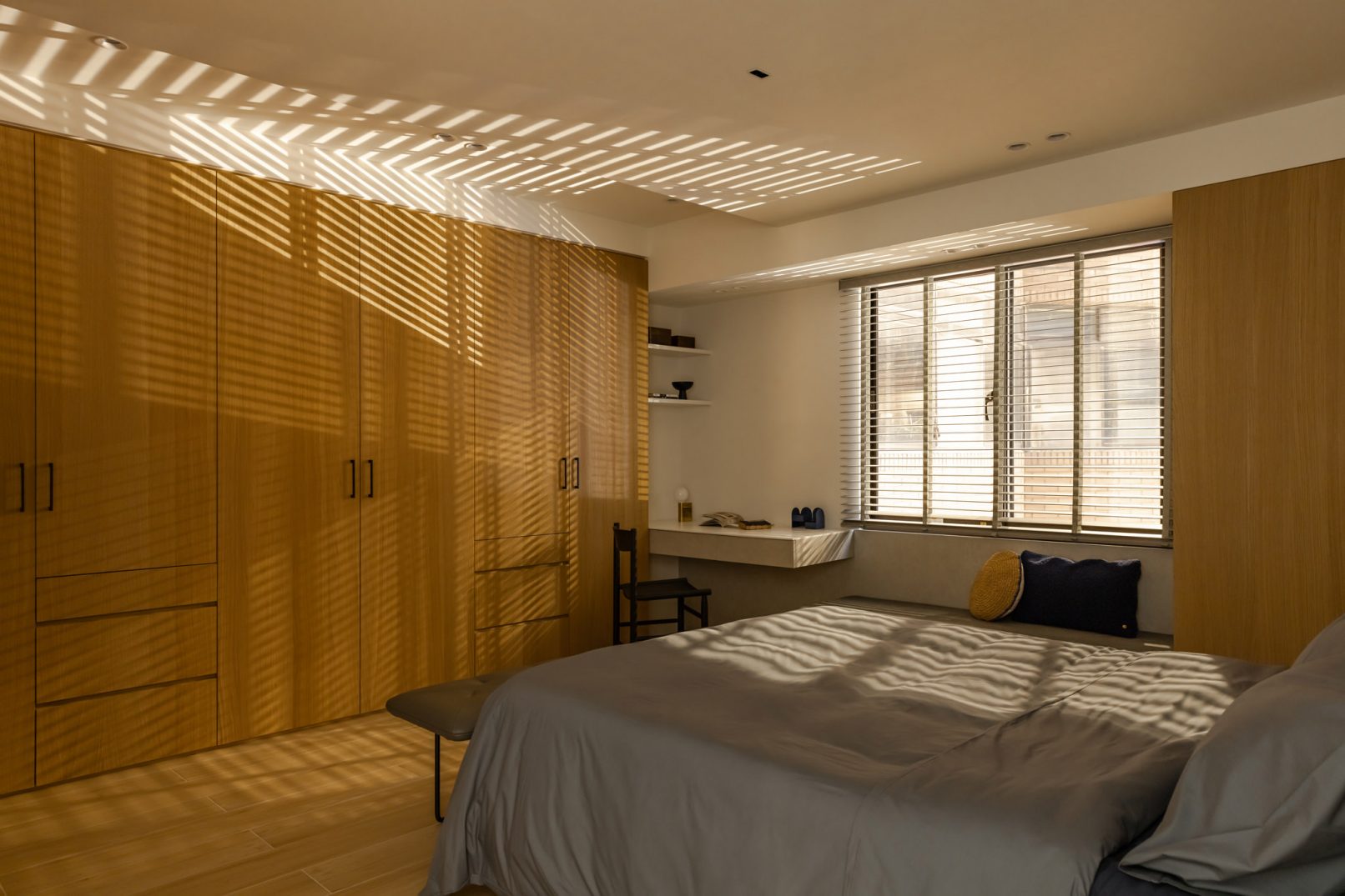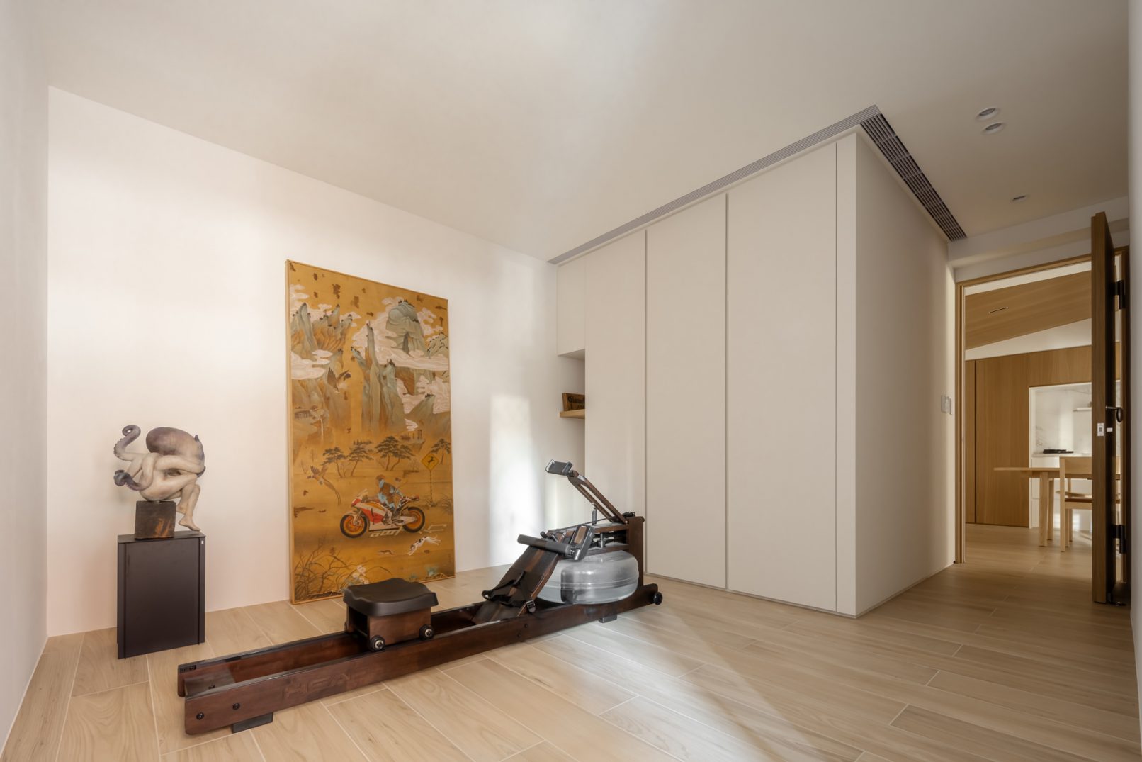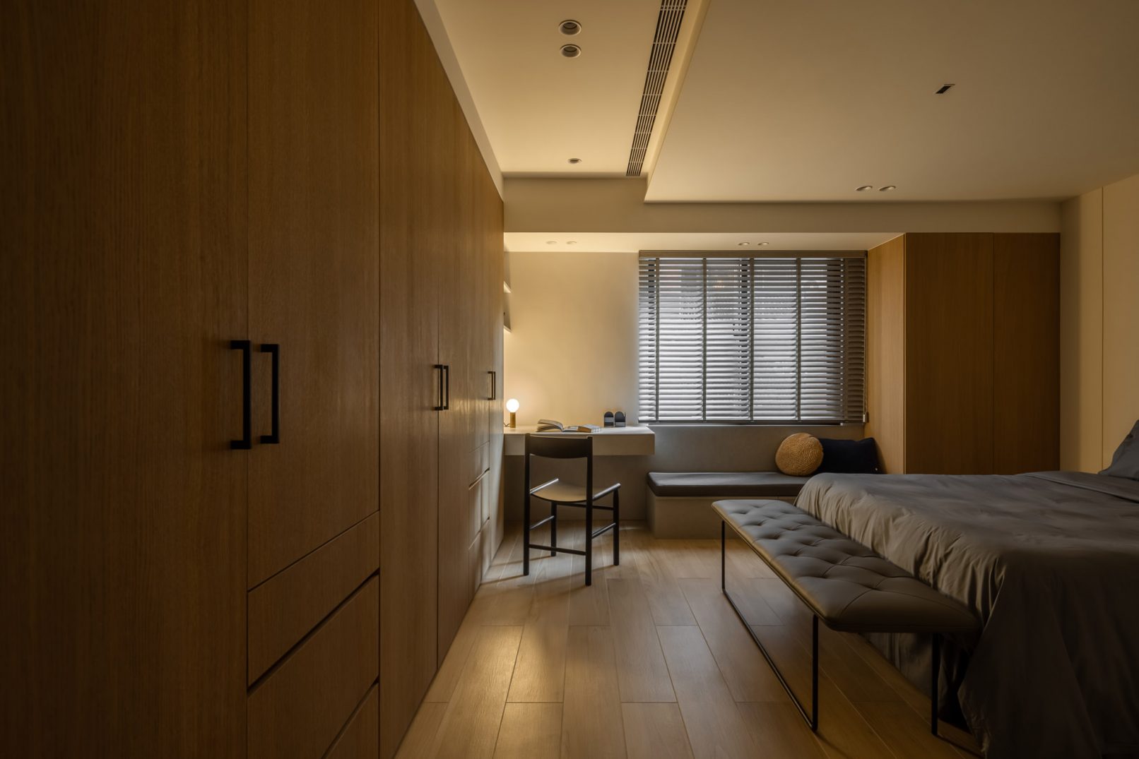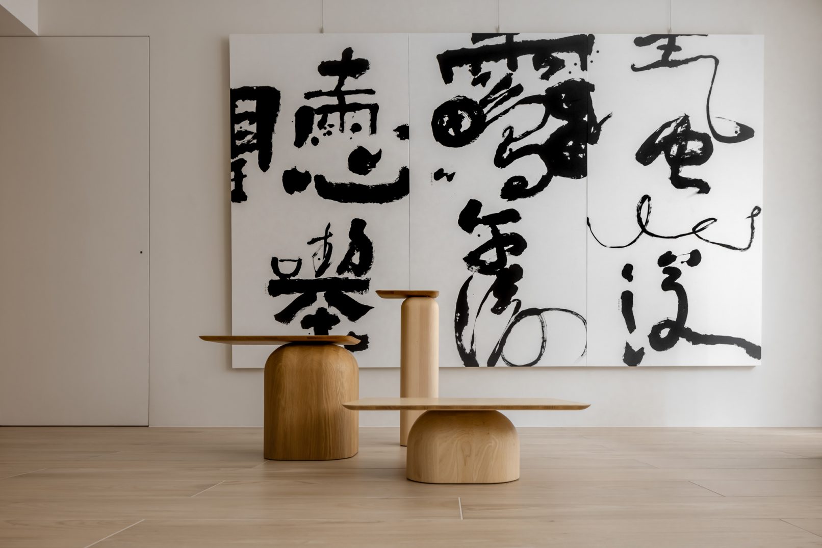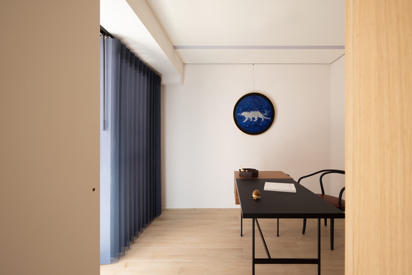 自美返台的屋主夫婦,生活簡單樸實,外籍先生為熱愛東方文化的哲學學者,收藏字畫、書法,同時也閱讀東方哲學家如莊子孟子的著作。設計團隊以有所為的設計,解決原始屋況及條件皆不盡理想的空間問題,包含以入口弧形玄關設計,留有光與視覺穿透空間,兩側提供端景展示、傘架等生活機能,化解原始入門見廁室的問題;在長型略窄的有限空間中,巧妙地劃分出串聯流通的場域關係,立面及天花的視覺比例設計則帶進舒適性,同時降低原始屋高不足給人的壓迫感。「樸素而天下莫能與之爭美」則是材質主軸,選擇清淨無為的木質,點綴清雅石材與藝術收藏,鋪塑空間淡雅樣貌。整體改造設計融合西式和東方涵養,營造讓人心安定的自然之家。