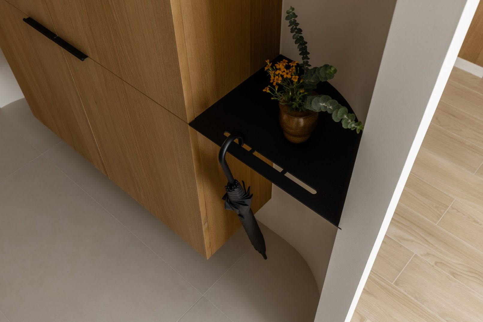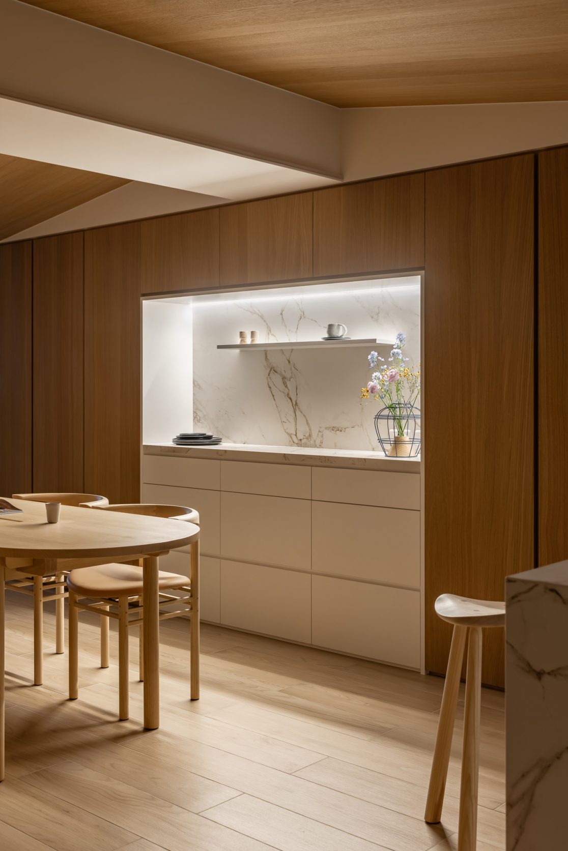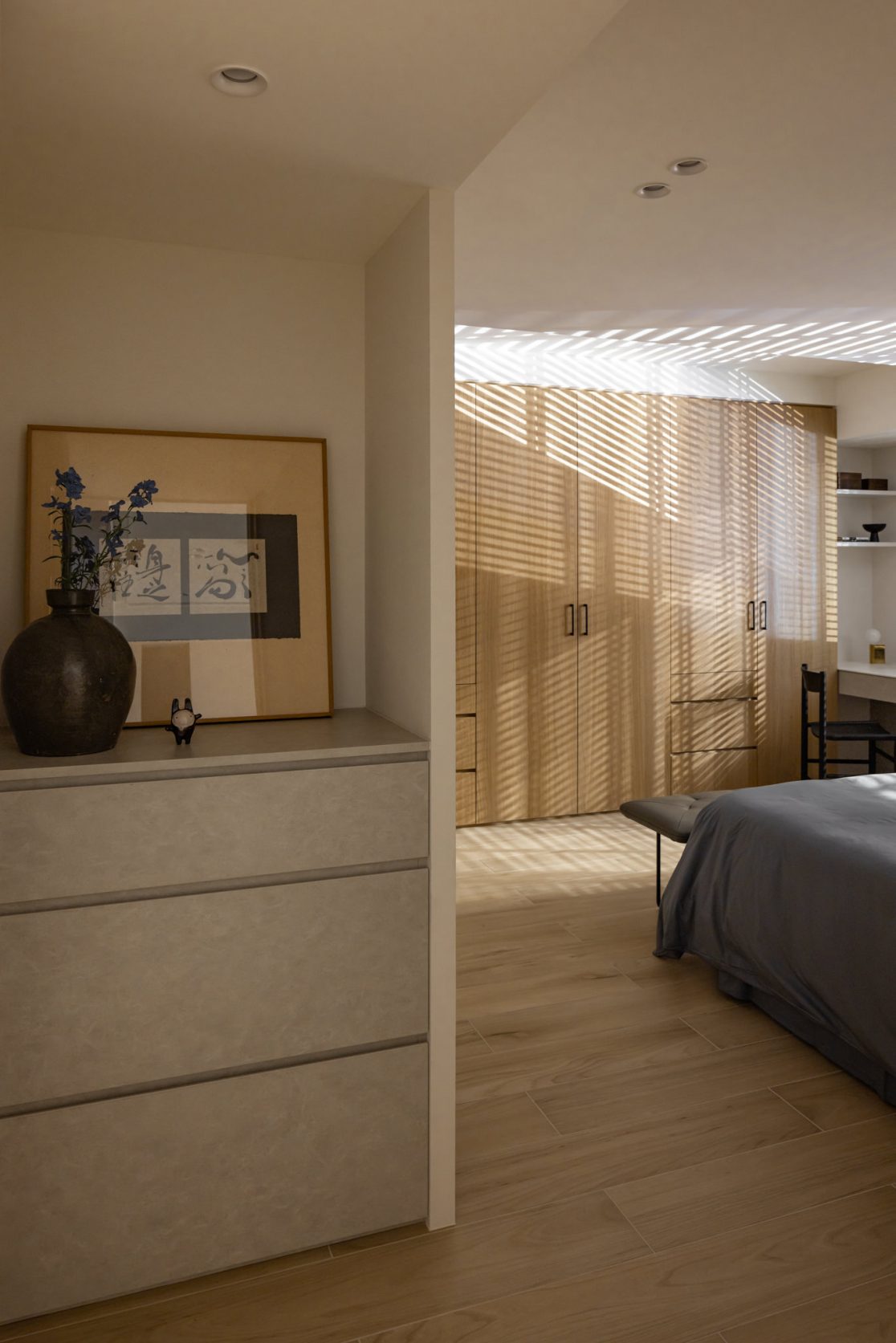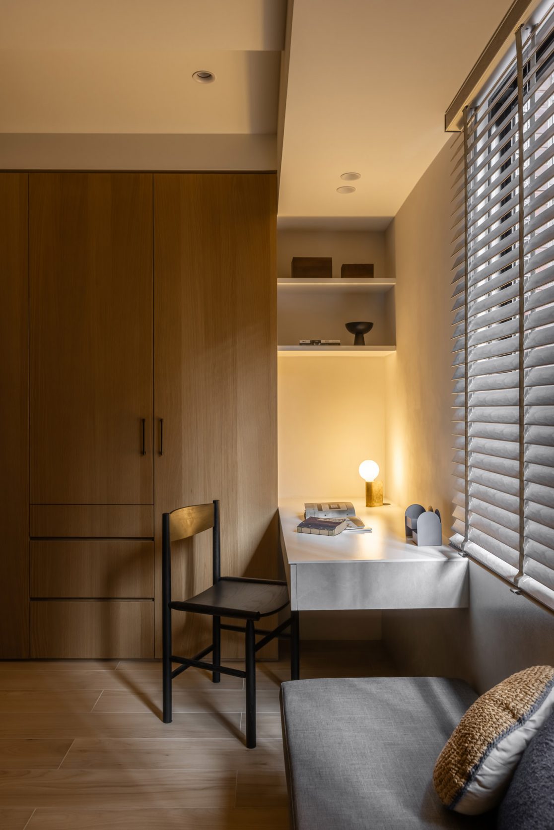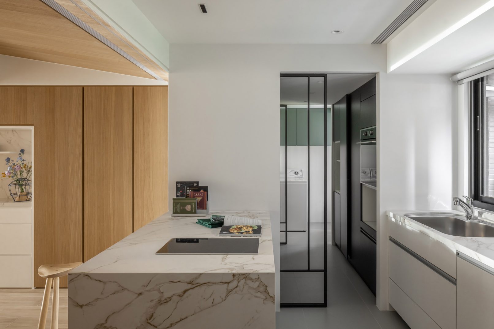自美返台的屋主夫婦,生活簡單樸實,外籍先生為熱愛東方文化的哲學學者,收藏字畫、書法,同時也閱讀東方哲學家如莊子孟子的著作。設計團隊以有所為的設計,解決原始屋況及條件皆不盡理想的空間問題,包含以入口弧形玄關設計,留有光與視覺穿透空間,兩側提供端景展示、傘架等生活機能,化解原始入門見廁室的問題;在長型略窄的有限空間中,巧妙地劃分出串聯流通的場域關係,立面及天花的視覺比例設計則帶進舒適性,同時降低原始屋高不足給人的壓迫感。「樸素而天下莫能與之爭美」則是材質主軸,選擇清淨無為的木質,點綴清雅石材與藝術收藏,鋪塑空間淡雅樣貌。整體改造設計融合西式和東方涵養,營造讓人心安定的自然之家。