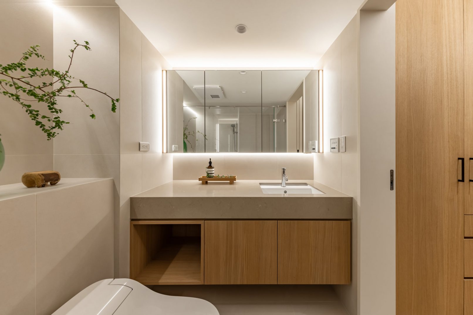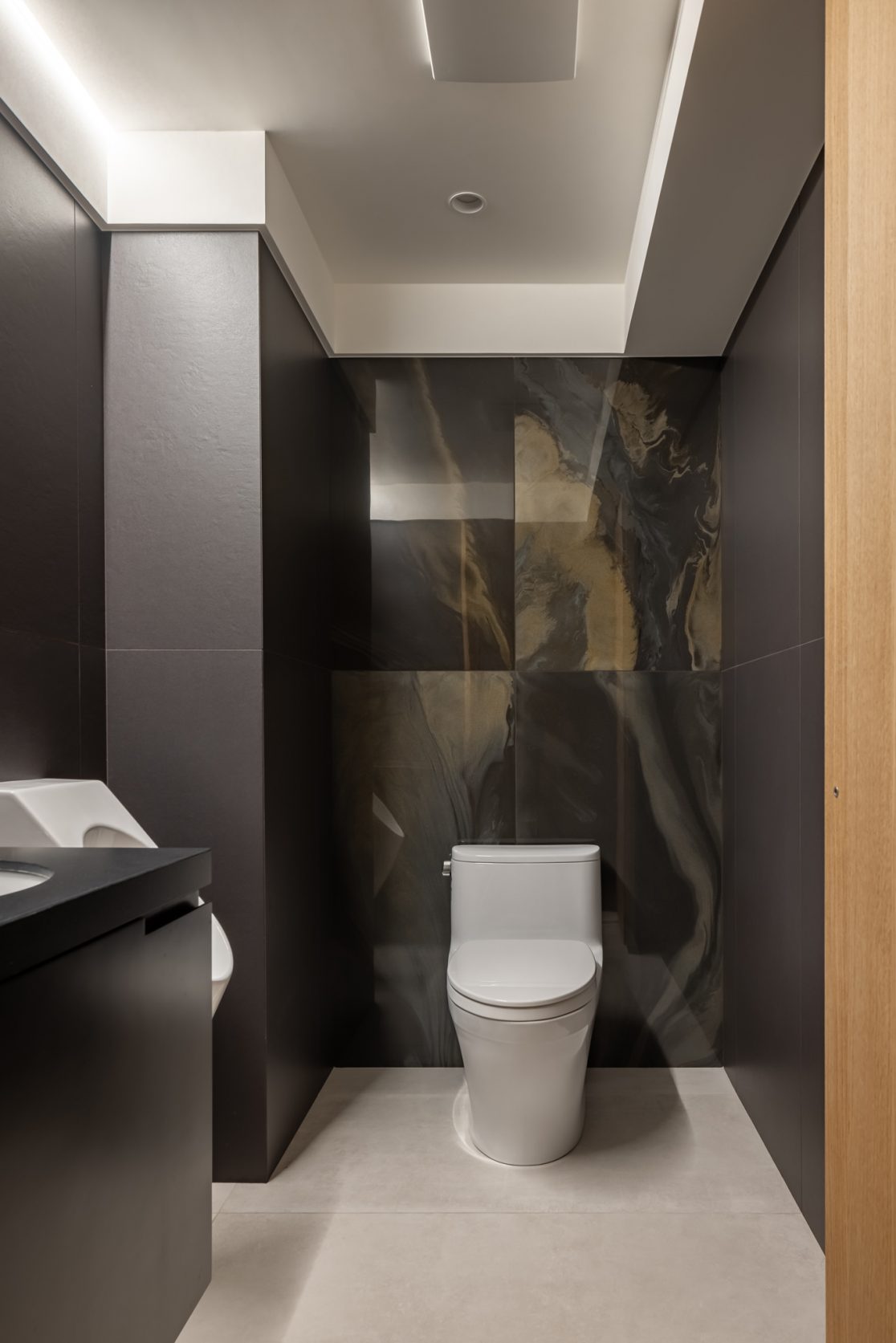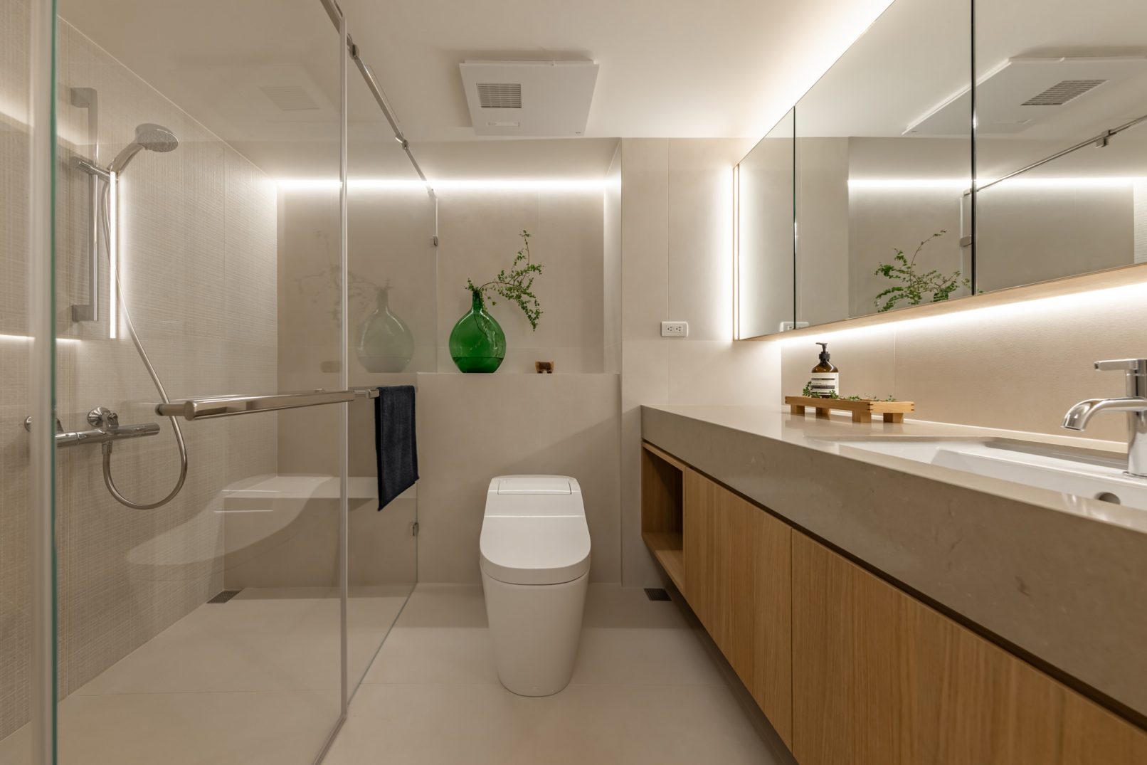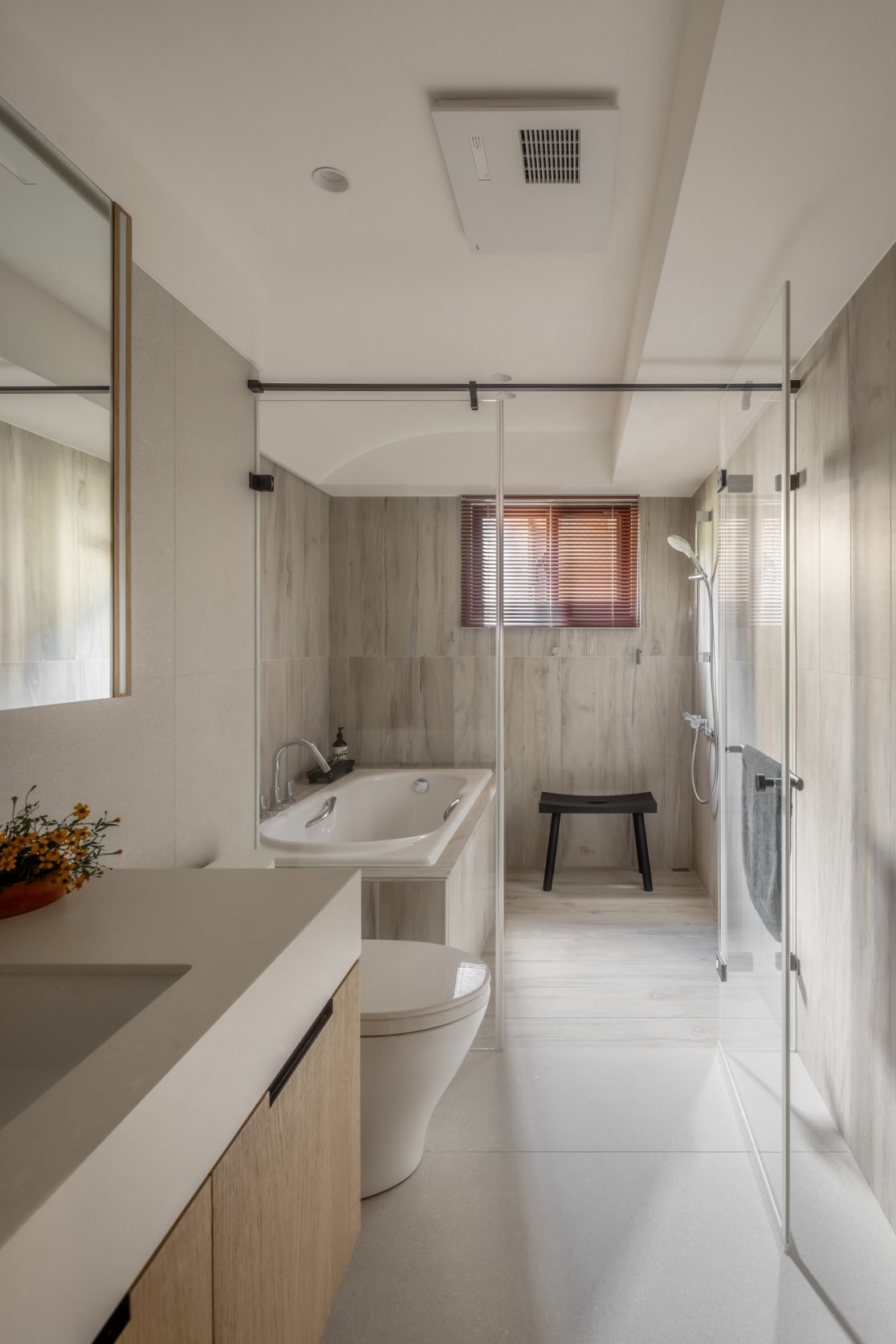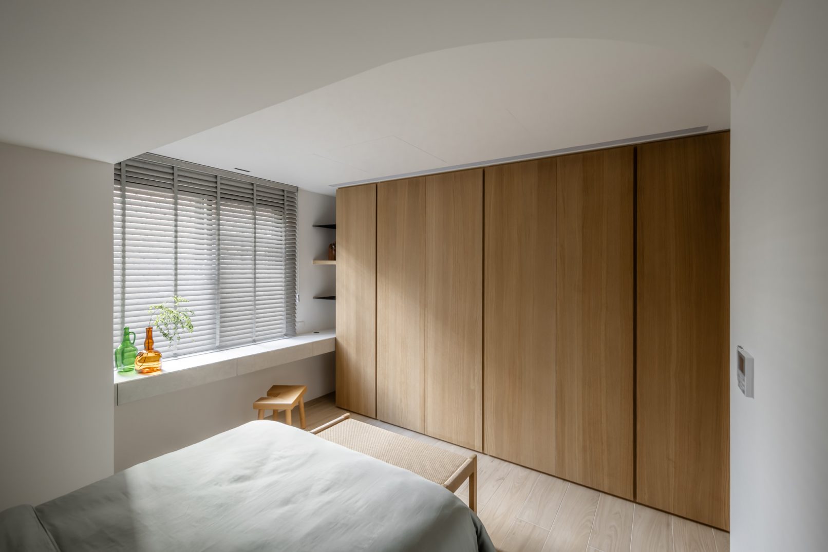 自美返台的屋主夫婦,生活簡單樸實,外籍先生為熱愛東方文化的哲學學者,收藏字畫、書法,同時也閱讀東方哲學家如莊子孟子的著作。設計團隊以有所為的設計,解決原始屋況及條件皆不盡理想的空間問題,包含以入口弧形玄關設計,留有光與視覺穿透空間,兩側提供端景展示、傘架等生活機能,化解原始入門見廁室的問題;在長型略窄的有限空間中,巧妙地劃分出串聯流通的場域關係,立面及天花的視覺比例設計則帶進舒適性,同時降低原始屋高不足給人的壓迫感。「樸素而天下莫能與之爭美」則是材質主軸,選擇清淨無為的木質,點綴清雅石材與藝術收藏,鋪塑空間淡雅樣貌。整體改造設計融合西式和東方涵養,營造讓人心安定的自然之家。