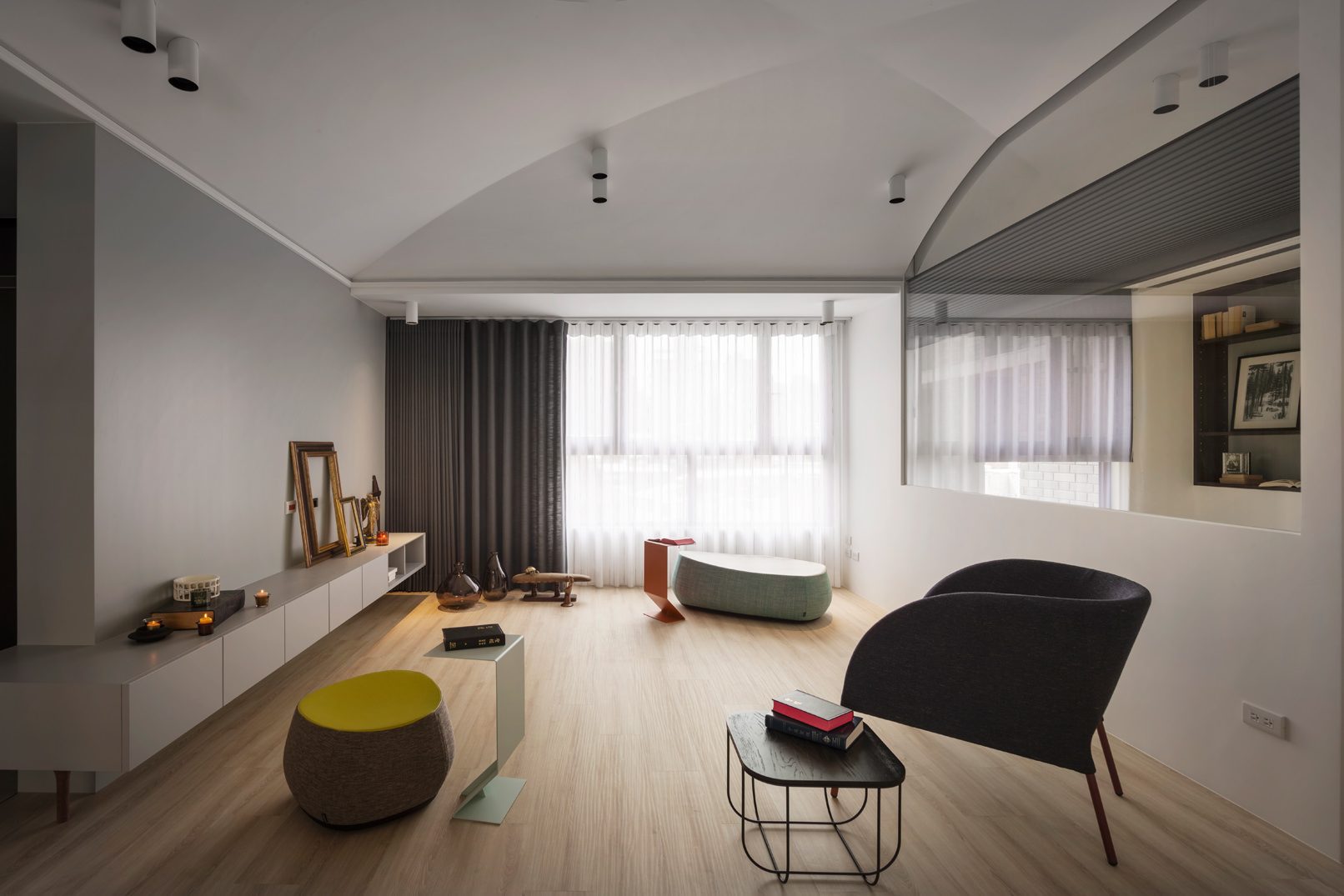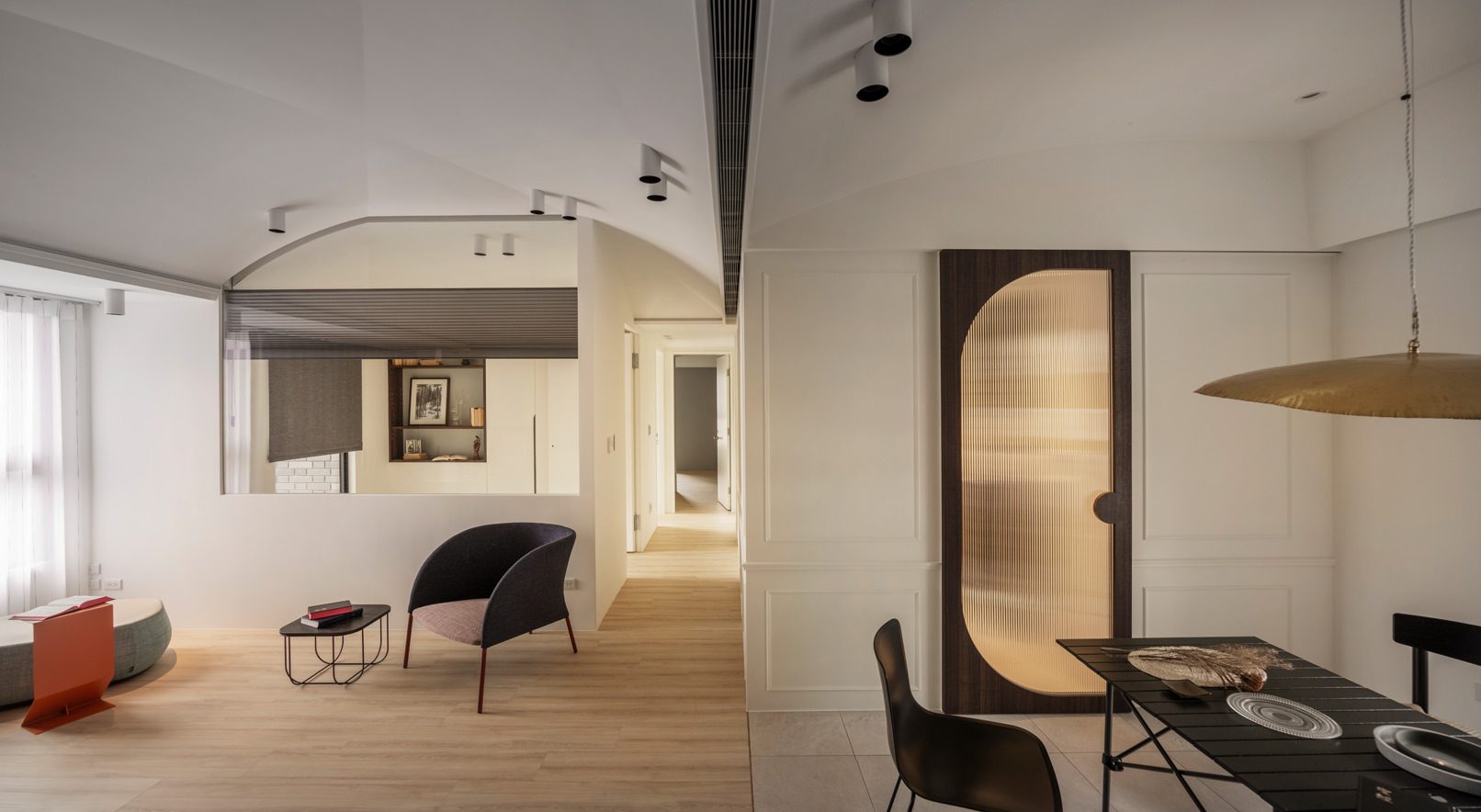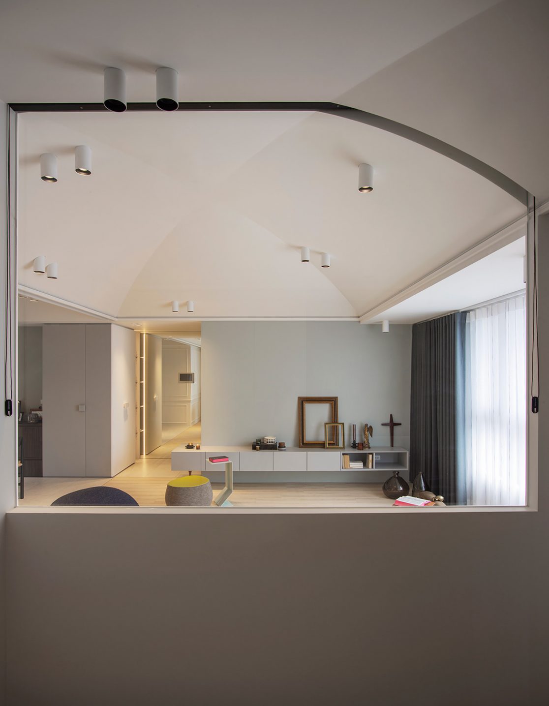 這是一個要提供給教會牧師居住的空間,整體設計概念來自教堂給人的寧靜,以及牧師給人的樸實。融合純潔精神生活的宗教教義,並重新解構哥德式建築特點,形成串起室內整體情緒的白色基底與拱頂天花設計。拱頂曲線從公領域一路延伸進到書房與臥室,如同信仰,像是一種溫柔又堅定的存在。客廳身為提供簡單聚會的場所,特意選擇稍具活潑彩度及俐落現代線條的傢俱,讓對話在自在中放鬆進行。業主樸實不虛矯的價值觀,則透過單純的材質體現呼應。信仰帶來心靈上的安定,空間給予身體實際的安穩。這裡有一個結合信仰的生活,與信仰相稱、單純富足的生活。
