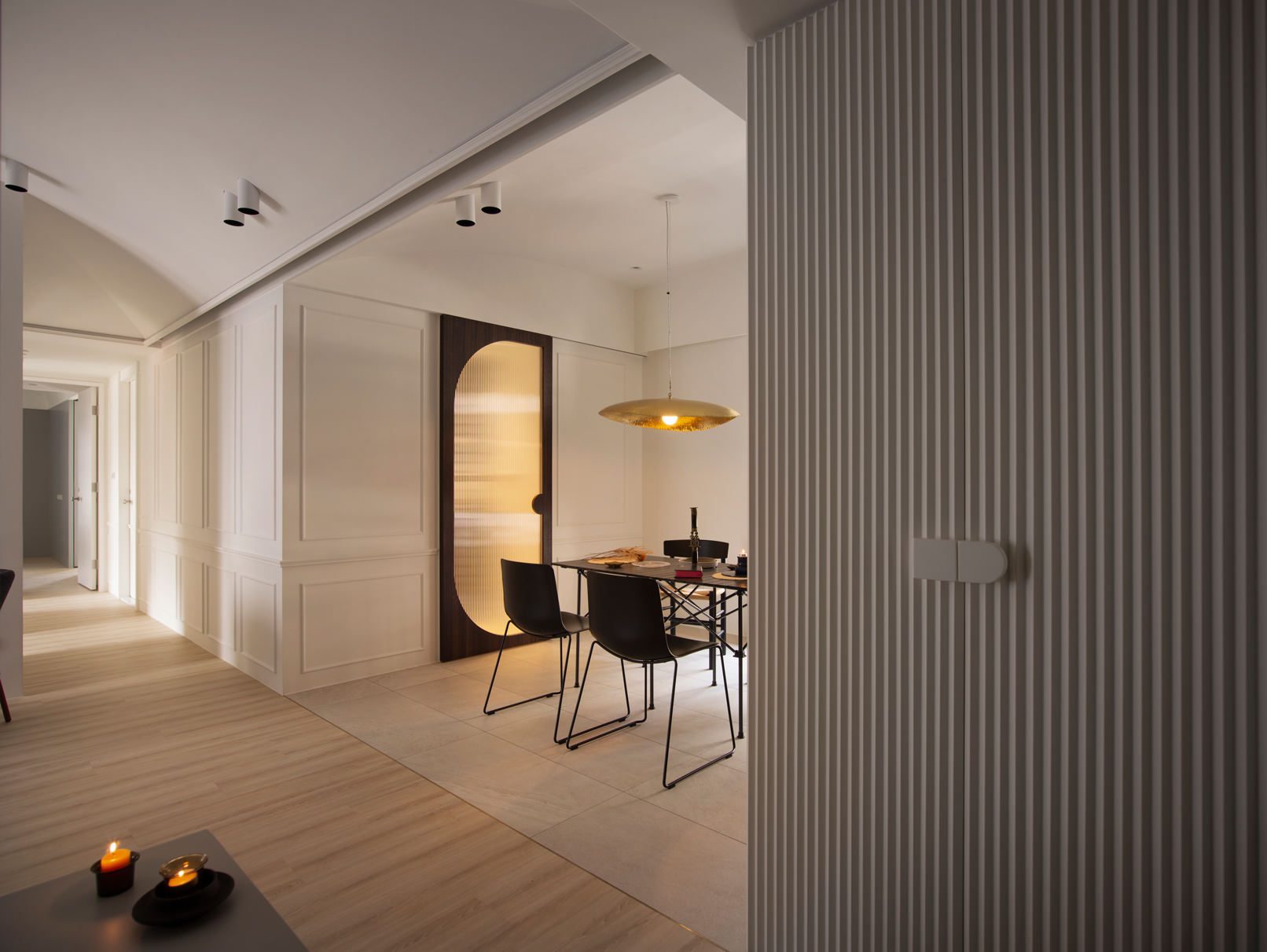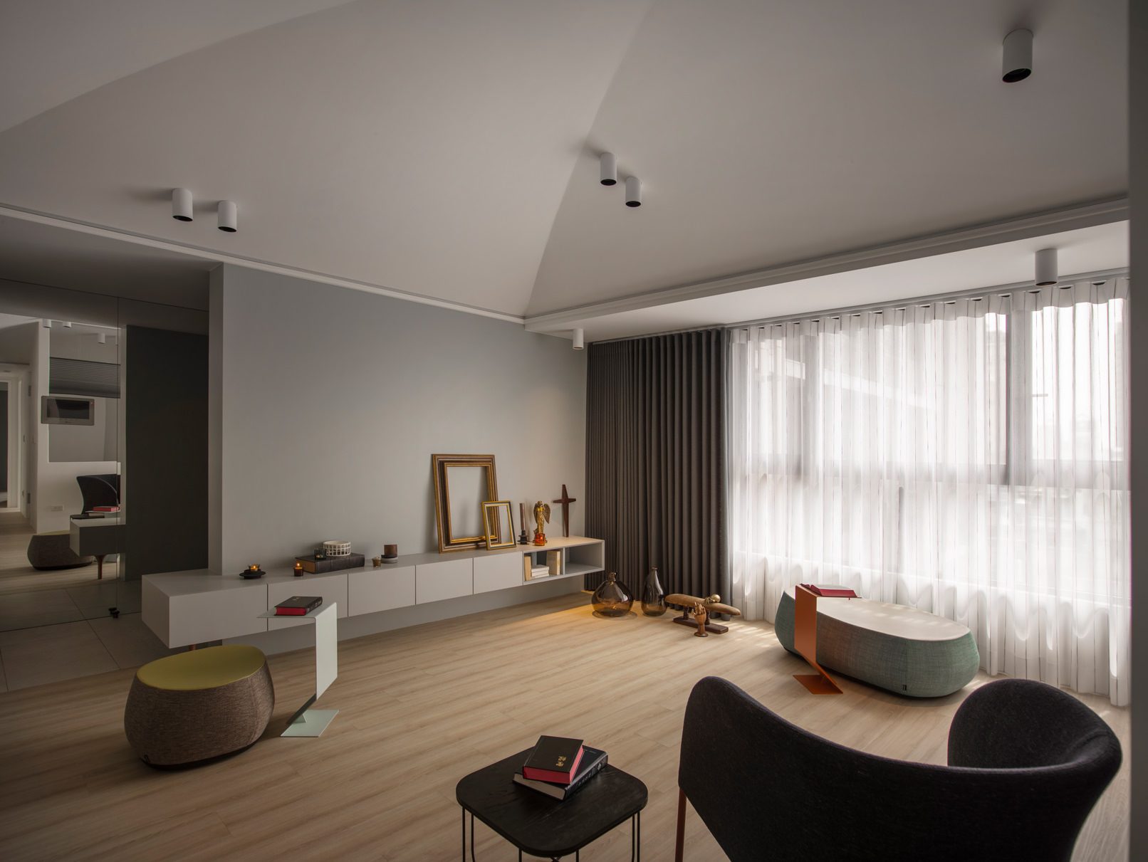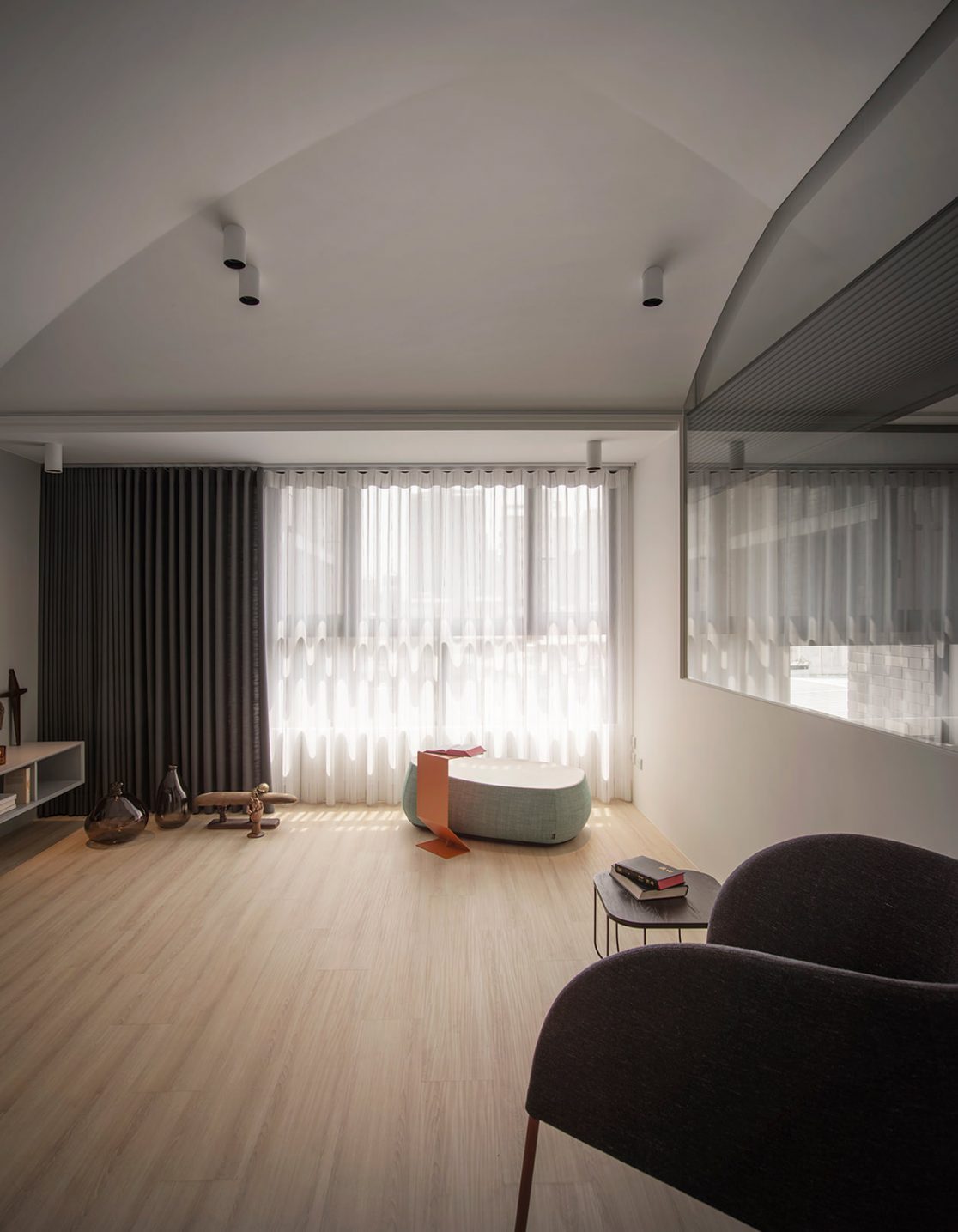 這是一個要提供給教會牧師居住的空間,整體設計概念來自教堂給人的寧靜,以及牧師給人的樸實。融合純潔精神生活的宗教教義,並重新解構哥德式建築特點,形成串起室內整體情緒的白色基底與拱頂天花設計。拱頂曲線從公領域一路延伸進到書房與臥室,如同信仰,像是一種溫柔又堅定的存在。客廳身為提供簡單聚會的場所,特意選擇稍具活潑彩度及俐落現代線條的傢俱,讓對話在自在中放鬆進行。業主樸實不虛矯的價值觀,則透過單純的材質體現呼應。信仰帶來心靈上的安定,空間給予身體實際的安穩。這裡有一個結合信仰的生活,與信仰相稱、單純富足的生活。