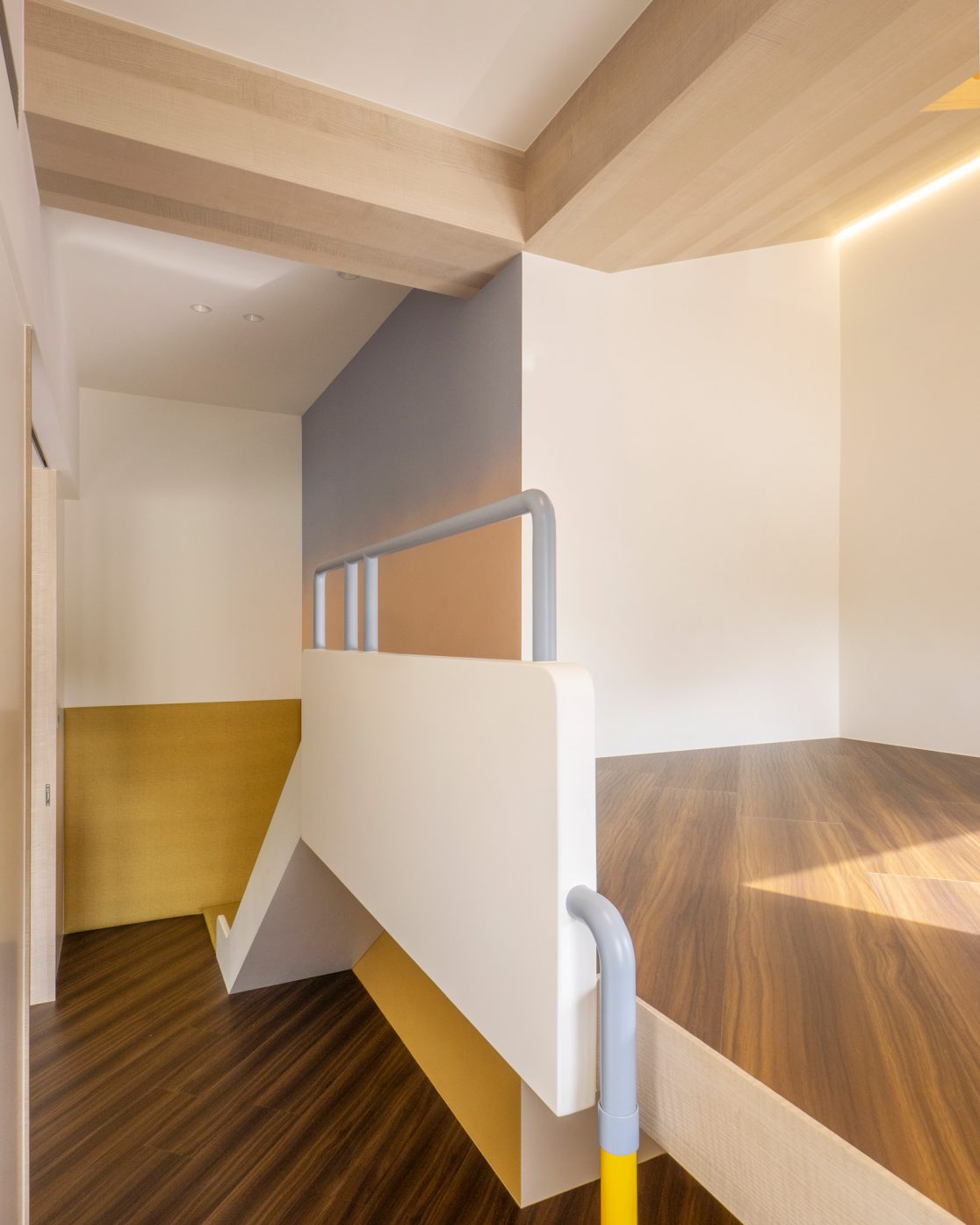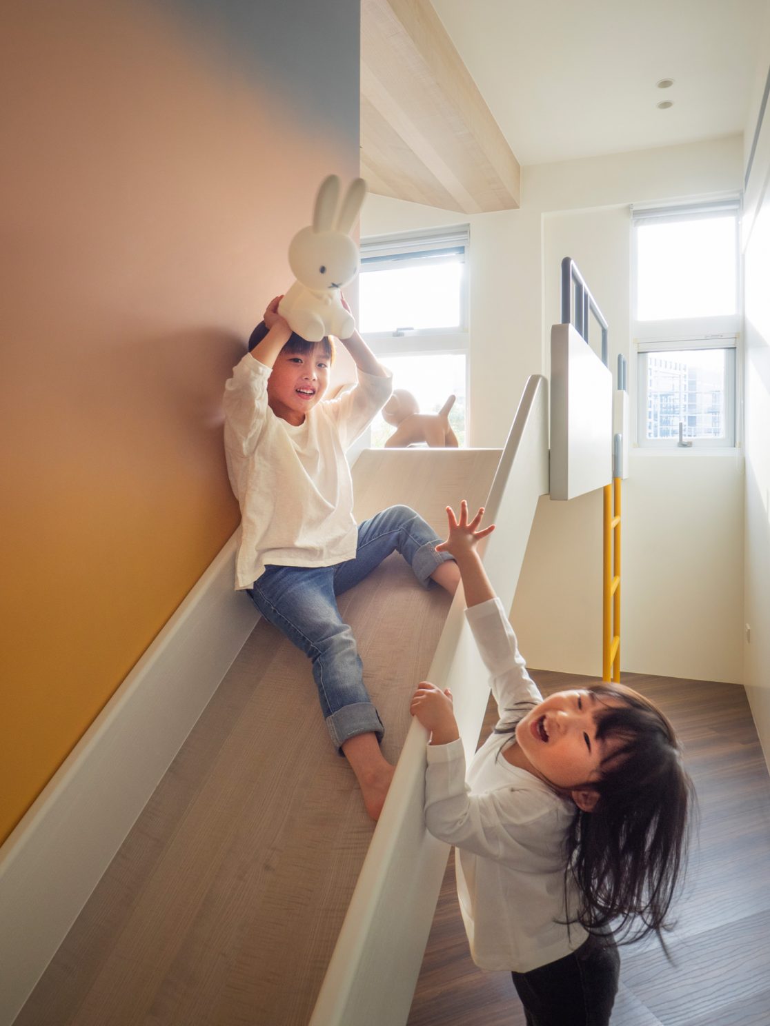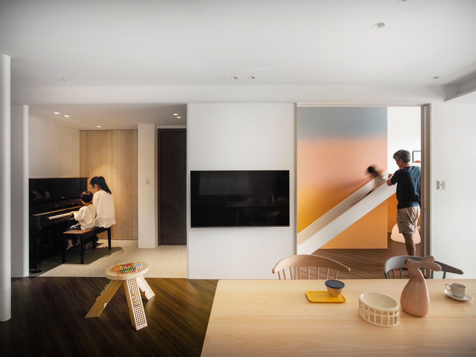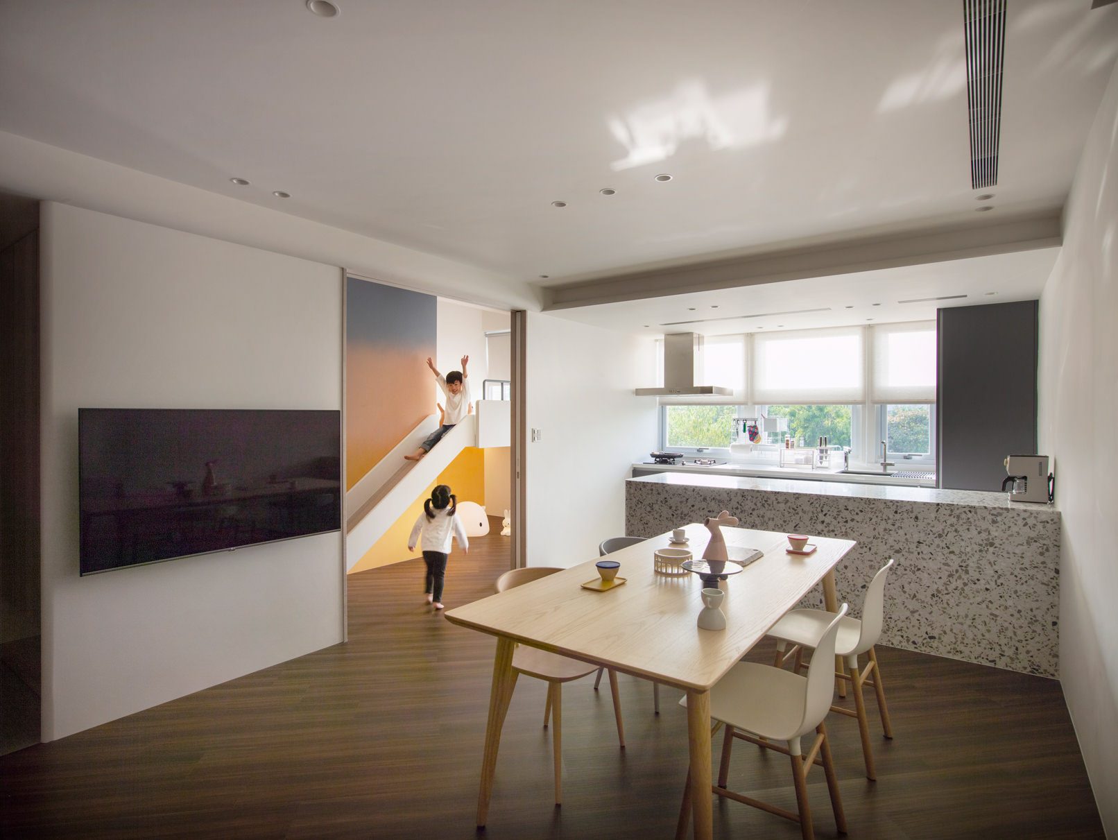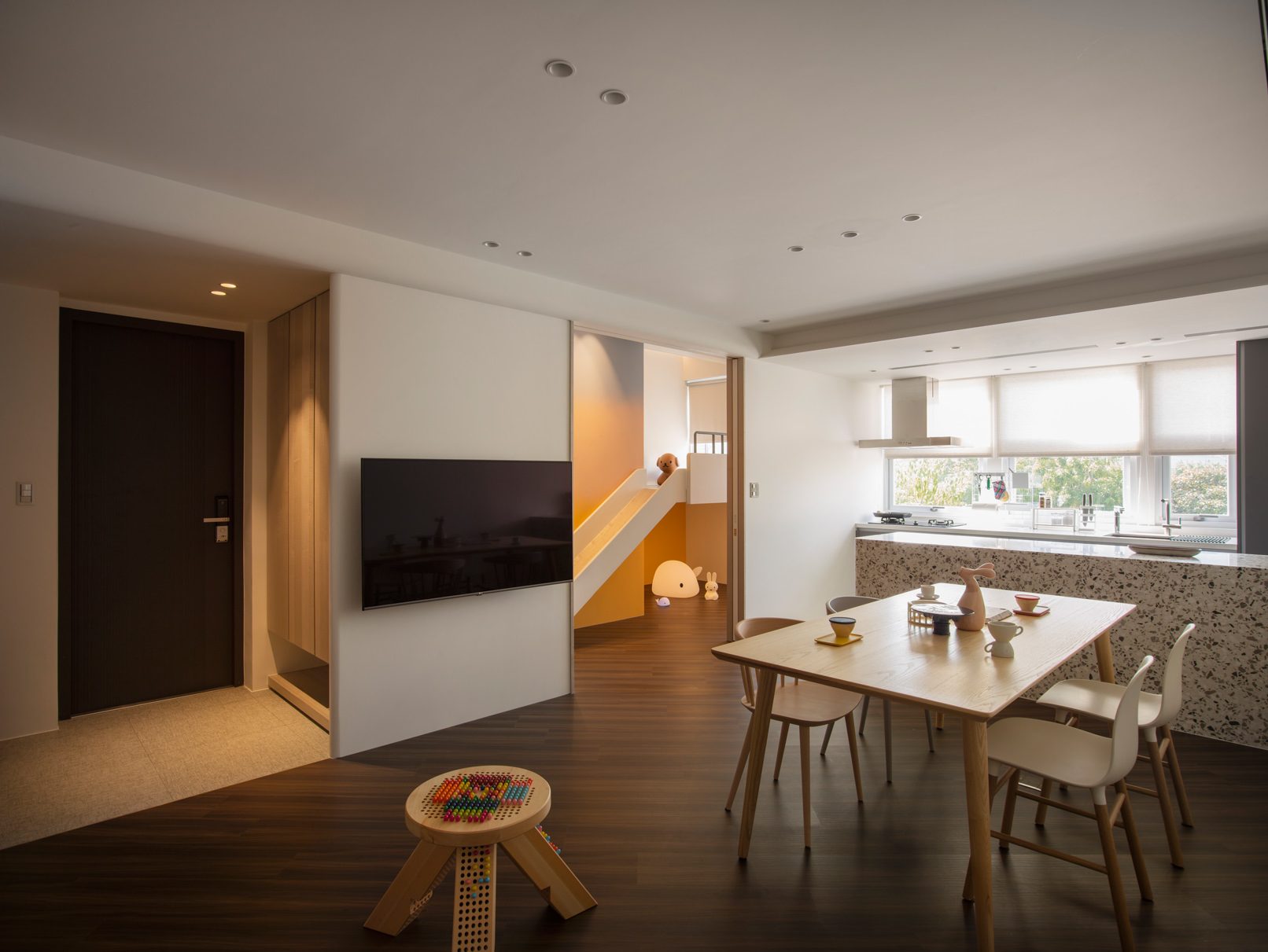 成了太太後,要既獨立也依賴;當了媽媽後,要既溫柔也剛強。有了孩子的家,既要有趣,也要實際。這個家的每一個設計考量,都在孩子與大人之間抓取平衡。整體保持在媽媽期待的乾淨設計風格,除了重整原始長型的老公寓格局,規劃恰當的生活機能,並讓公共空間仍保有方正,全屋的每一個柱體轉角都以圓角處理,形成無形的安全保護。多功能室則用來滿足孩子們好動愛玩,以及對色彩的高度感官,其中上方的斜頂設計,在修飾樑柱的同時,也巧妙拉升視覺。為玩具與書籍們預先規劃好收納方式與位置,兩個小孩房也都為未來,設定了可以彈性調整的運用方式。主婦們注重的清潔維護,則在材料搭配時,特意挑選了好保養的,例如:強效抗刮噴漆、超耐磨木地板等,讓這件事變得容易許多。有孩子的家,絕不只是多一個兒童房而已,如能同時考量並滿足大人與小孩的期待與需求,生活就能兼具品質與歡樂。