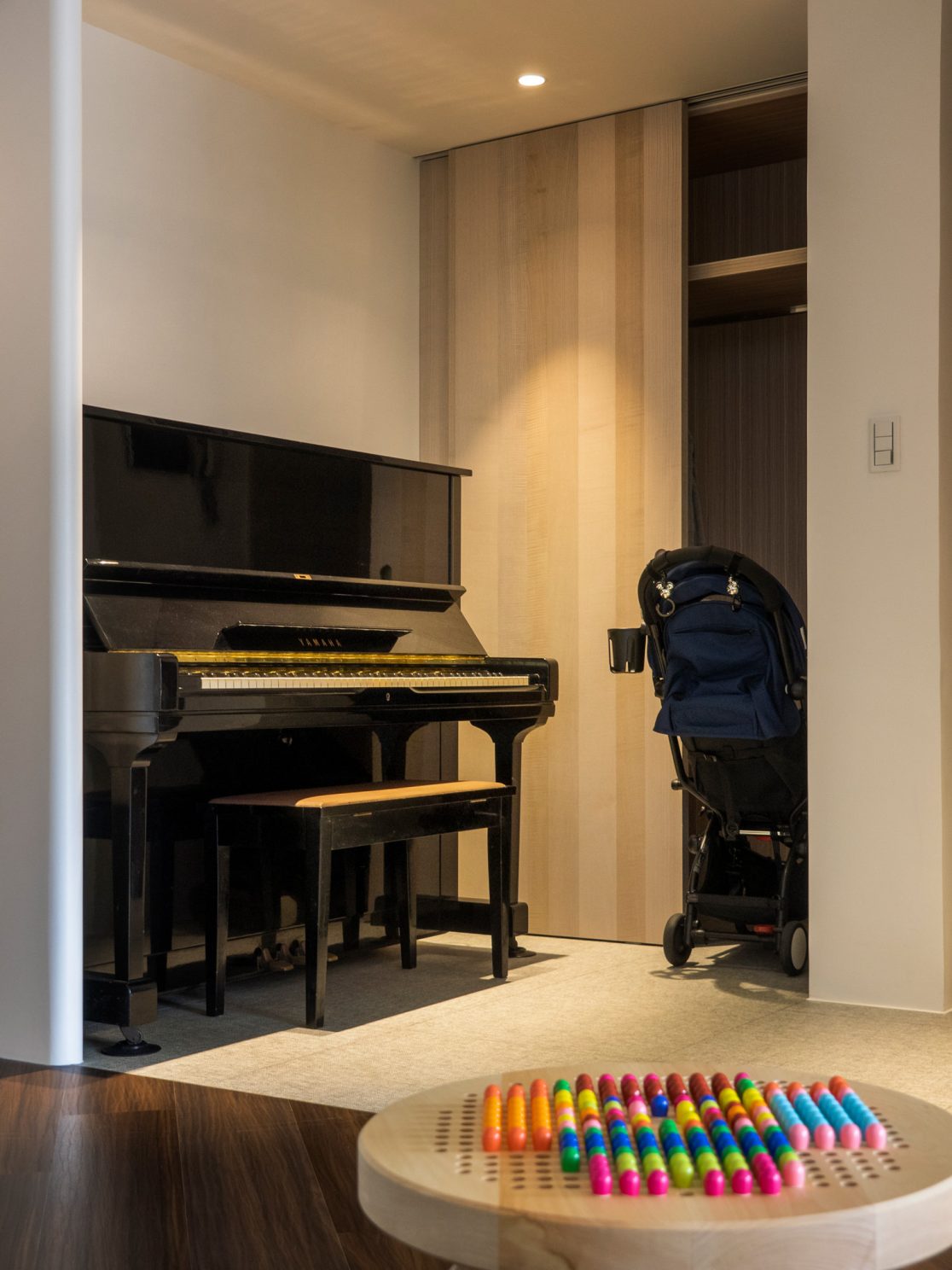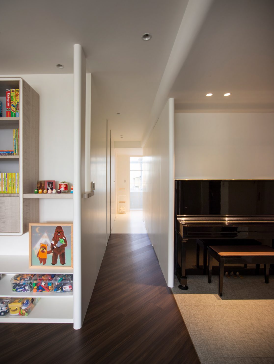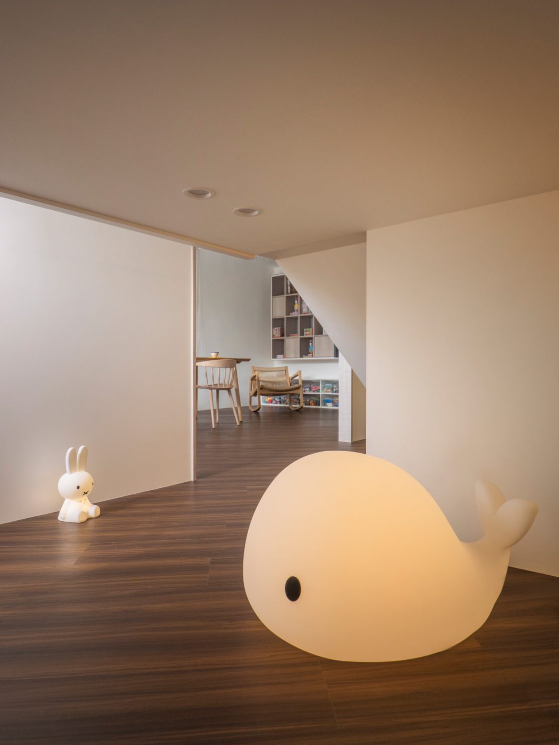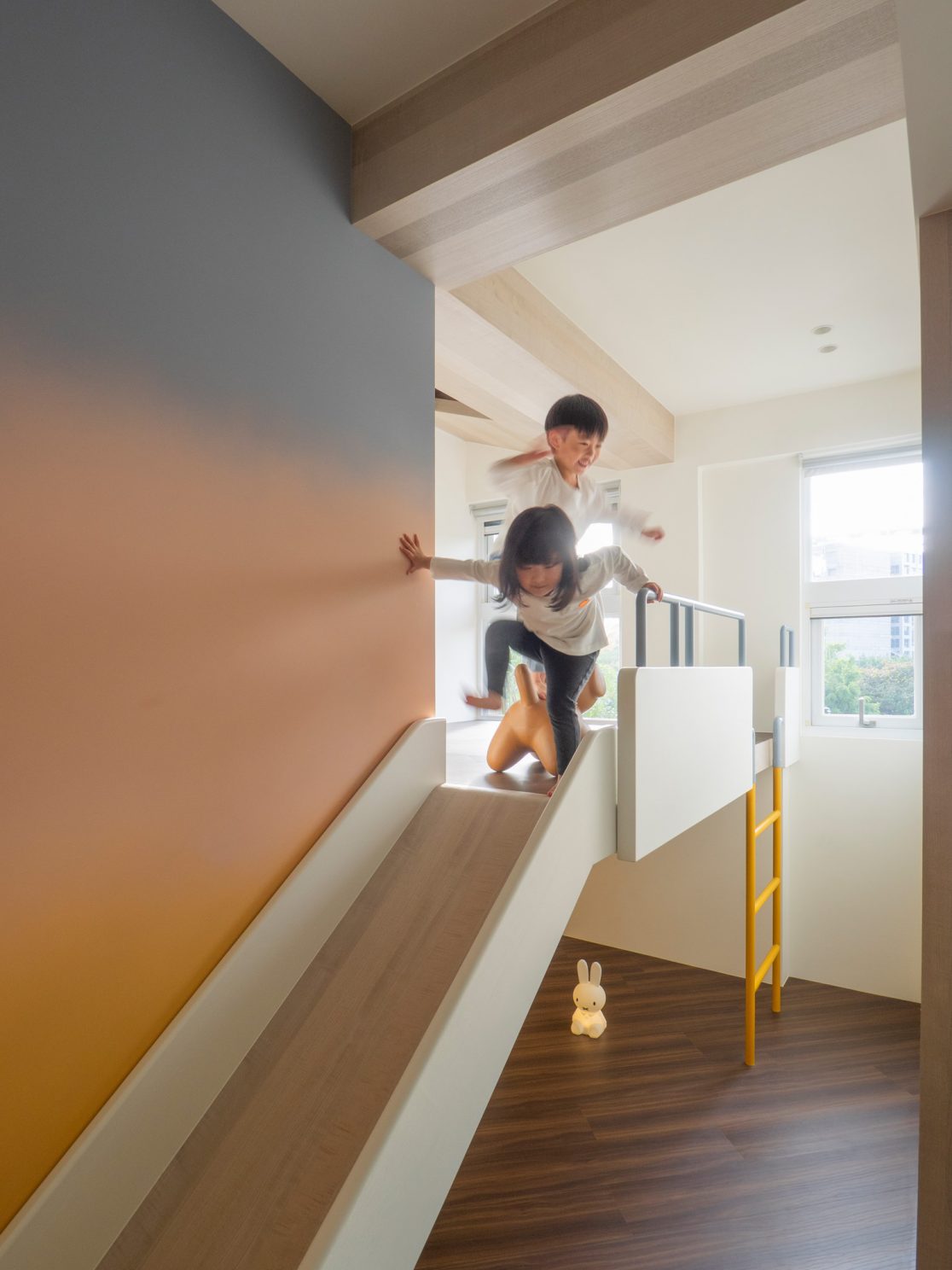 成了太太後,要既獨立也依賴;當了媽媽後,要既溫柔也剛強。有了孩子的家,既要有趣,也要實際。這個家的每一個設計考量,都在孩子與大人之間抓取平衡。整體保持在媽媽期待的乾淨設計風格,除了重整原始長型的老公寓格局,規劃恰當的生活機能,並讓公共空間仍保有方正,全屋的每一個柱體轉角都以圓角處理,形成無形的安全保護。多功能室則用來滿足孩子們好動愛玩,以及對色彩的高度感官,其中上方的斜頂設計,在修飾樑柱的同時,也巧妙拉升視覺。為玩具與書籍們預先規劃好收納方式與位置,兩個小孩房也都為未來,設定了可以彈性調整的運用方式。主婦們注重的清潔維護,則在材料搭配時,特意挑選了好保養的,例如:強效抗刮噴漆、超耐磨木地板等,讓這件事變得容易許多。有孩子的家,絕不只是多一個兒童房而已,如能同時考量並滿足大人與小孩的期待與需求,生活就能兼具品質與歡樂。