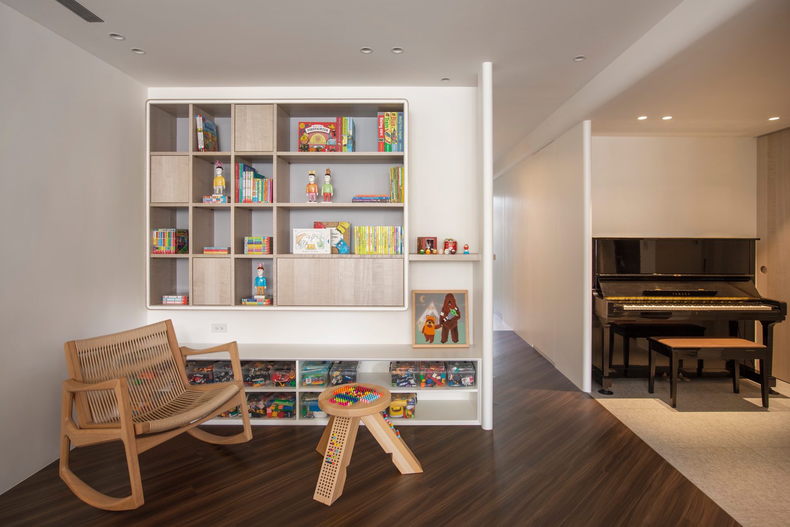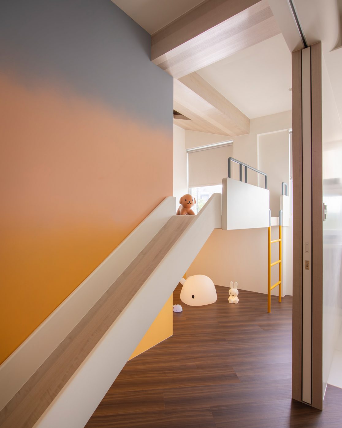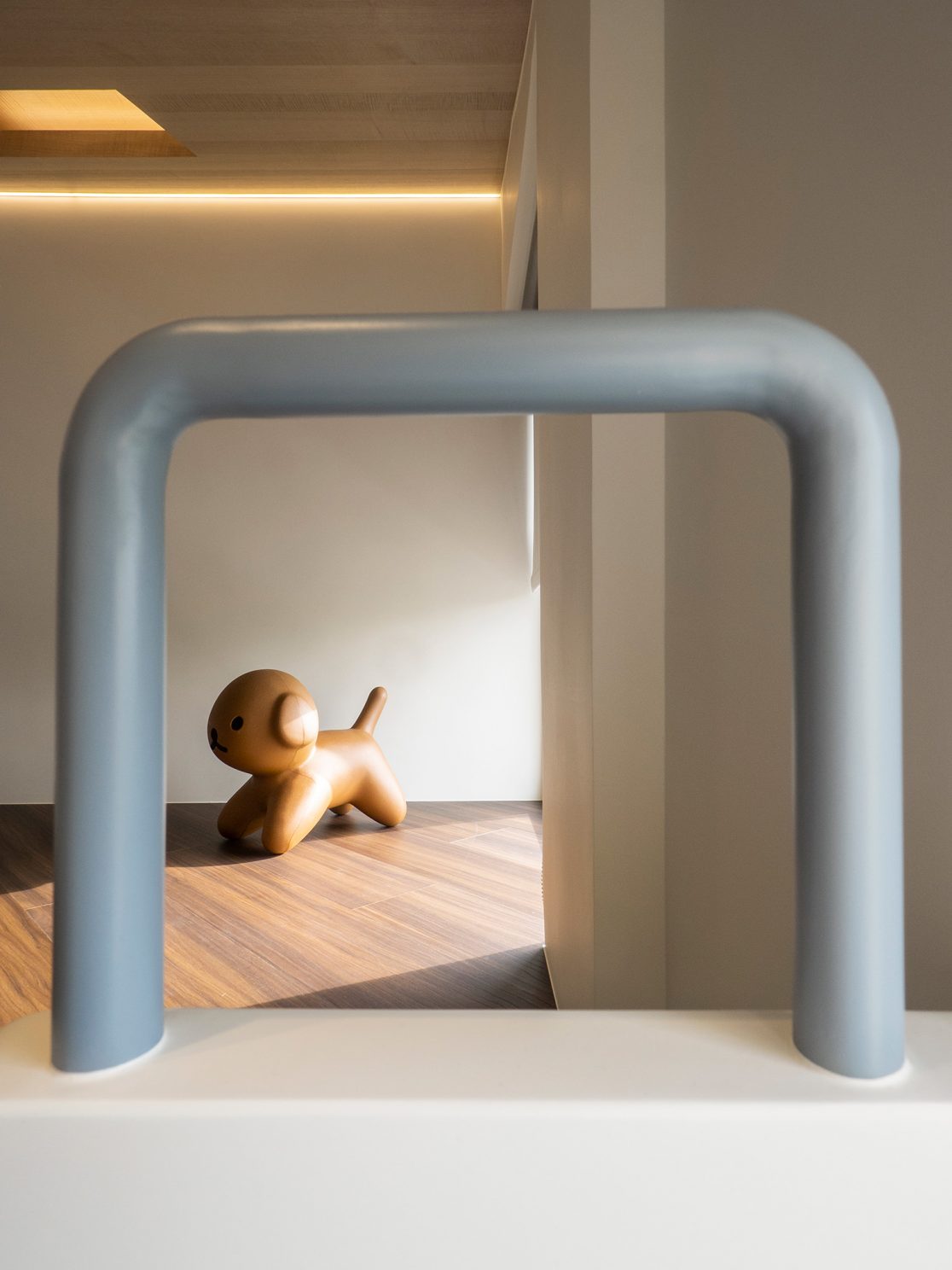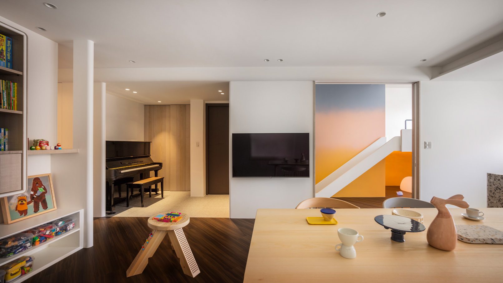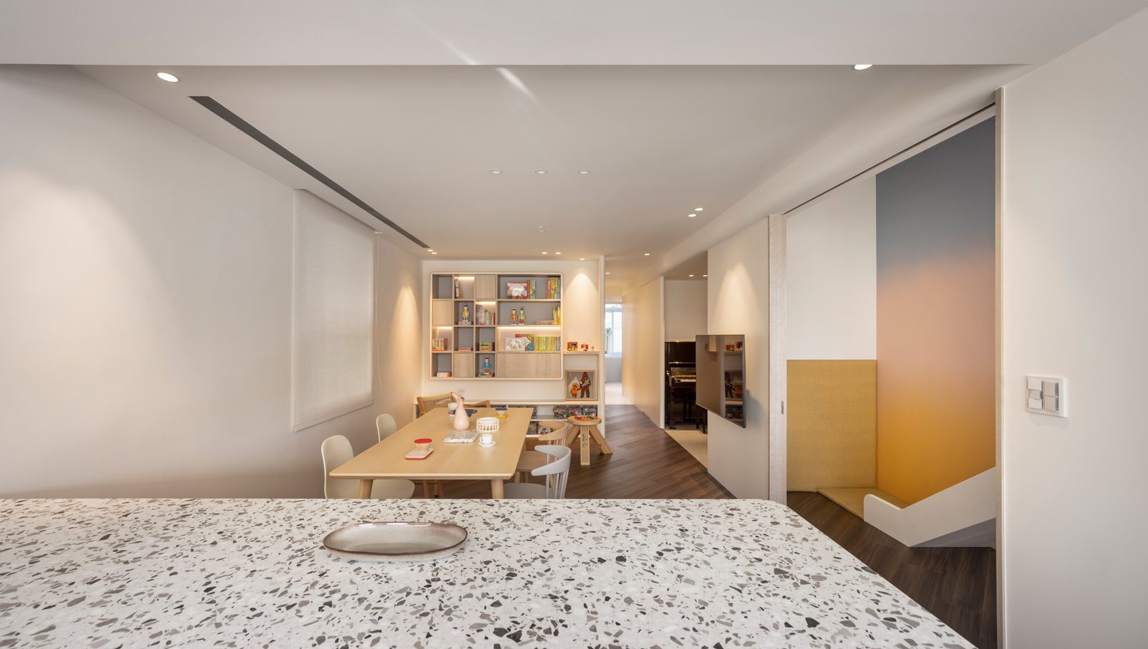 成了太太後,要既獨立也依賴;當了媽媽後,要既溫柔也剛強。有了孩子的家,既要有趣,也要實際。這個家的每一個設計考量,都在孩子與大人之間抓取平衡。整體保持在媽媽期待的乾淨設計風格,除了重整原始長型的老公寓格局,規劃恰當的生活機能,並讓公共空間仍保有方正,全屋的每一個柱體轉角都以圓角處理,形成無形的安全保護。多功能室則用來滿足孩子們好動愛玩,以及對色彩的高度感官,其中上方的斜頂設計,在修飾樑柱的同時,也巧妙拉升視覺。為玩具與書籍們預先規劃好收納方式與位置,兩個小孩房也都為未來,設定了可以彈性調整的運用方式。主婦們注重的清潔維護,則在材料搭配時,特意挑選了好保養的,例如:強效抗刮噴漆、超耐磨木地板等,讓這件事變得容易許多。有孩子的家,絕不只是多一個兒童房而已,如能同時考量並滿足大人與小孩的期待與需求,生活就能兼具品質與歡樂。