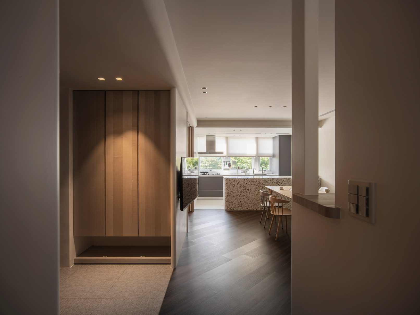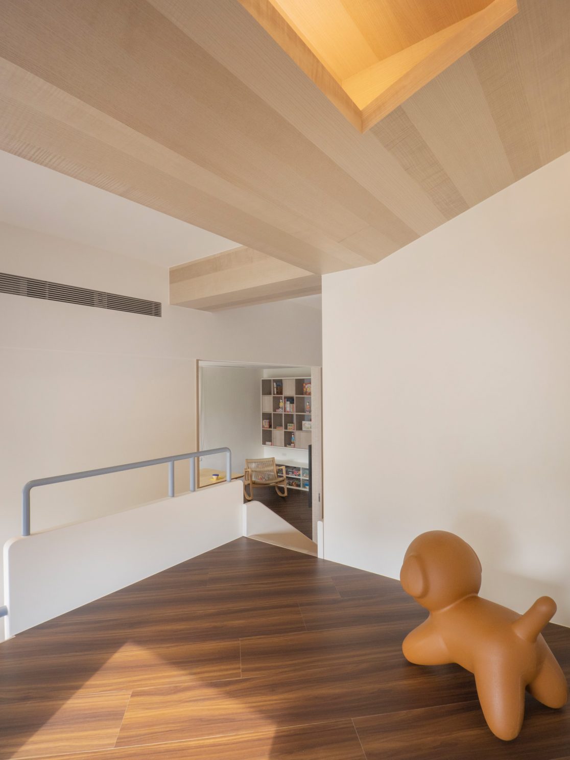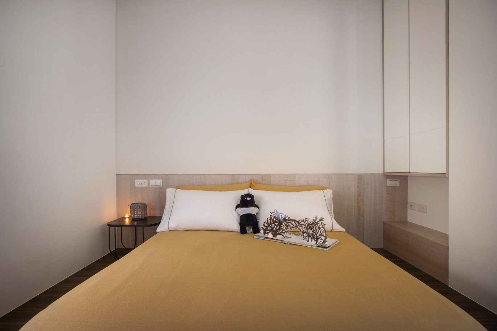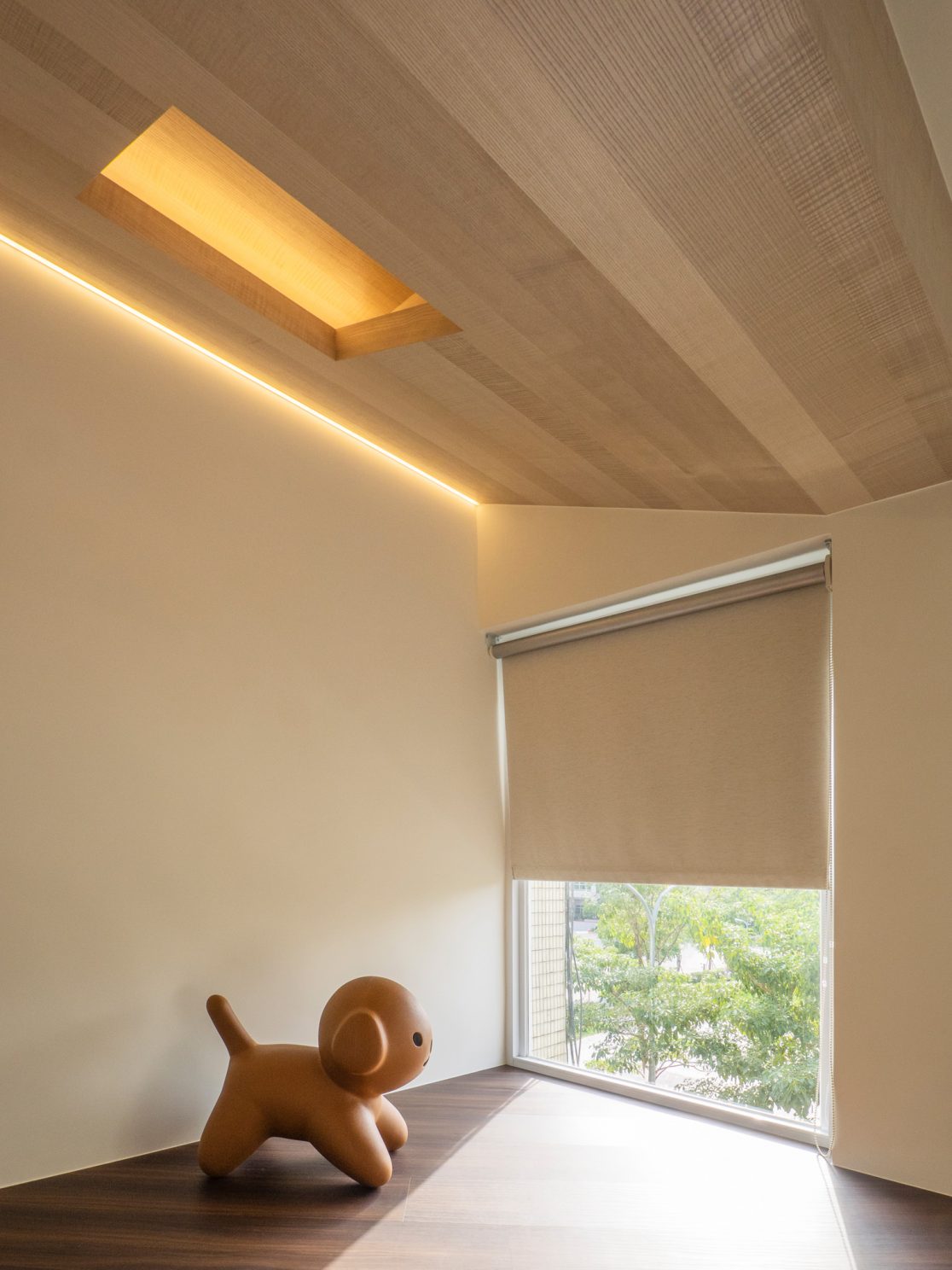 成了太太後,要既獨立也依賴;當了媽媽後,要既溫柔也剛強。有了孩子的家,既要有趣,也要實際。這個家的每一個設計考量,都在孩子與大人之間抓取平衡。整體保持在媽媽期待的乾淨設計風格,除了重整原始長型的老公寓格局,規劃恰當的生活機能,並讓公共空間仍保有方正,全屋的每一個柱體轉角都以圓角處理,形成無形的安全保護。多功能室則用來滿足孩子們好動愛玩,以及對色彩的高度感官,其中上方的斜頂設計,在修飾樑柱的同時,也巧妙拉升視覺。為玩具與書籍們預先規劃好收納方式與位置,兩個小孩房也都為未來,設定了可以彈性調整的運用方式。主婦們注重的清潔維護,則在材料搭配時,特意挑選了好保養的,例如:強效抗刮噴漆、超耐磨木地板等,讓這件事變得容易許多。有孩子的家,絕不只是多一個兒童房而已,如能同時考量並滿足大人與小孩的期待與需求,生活就能兼具品質與歡樂。