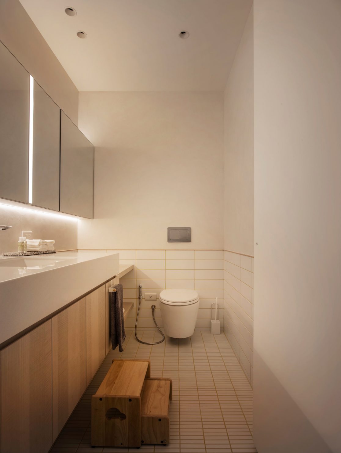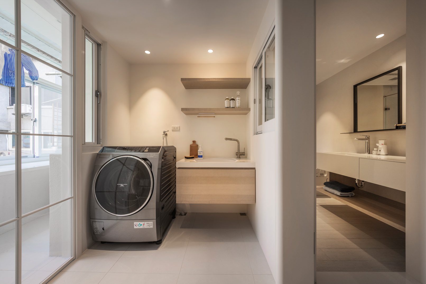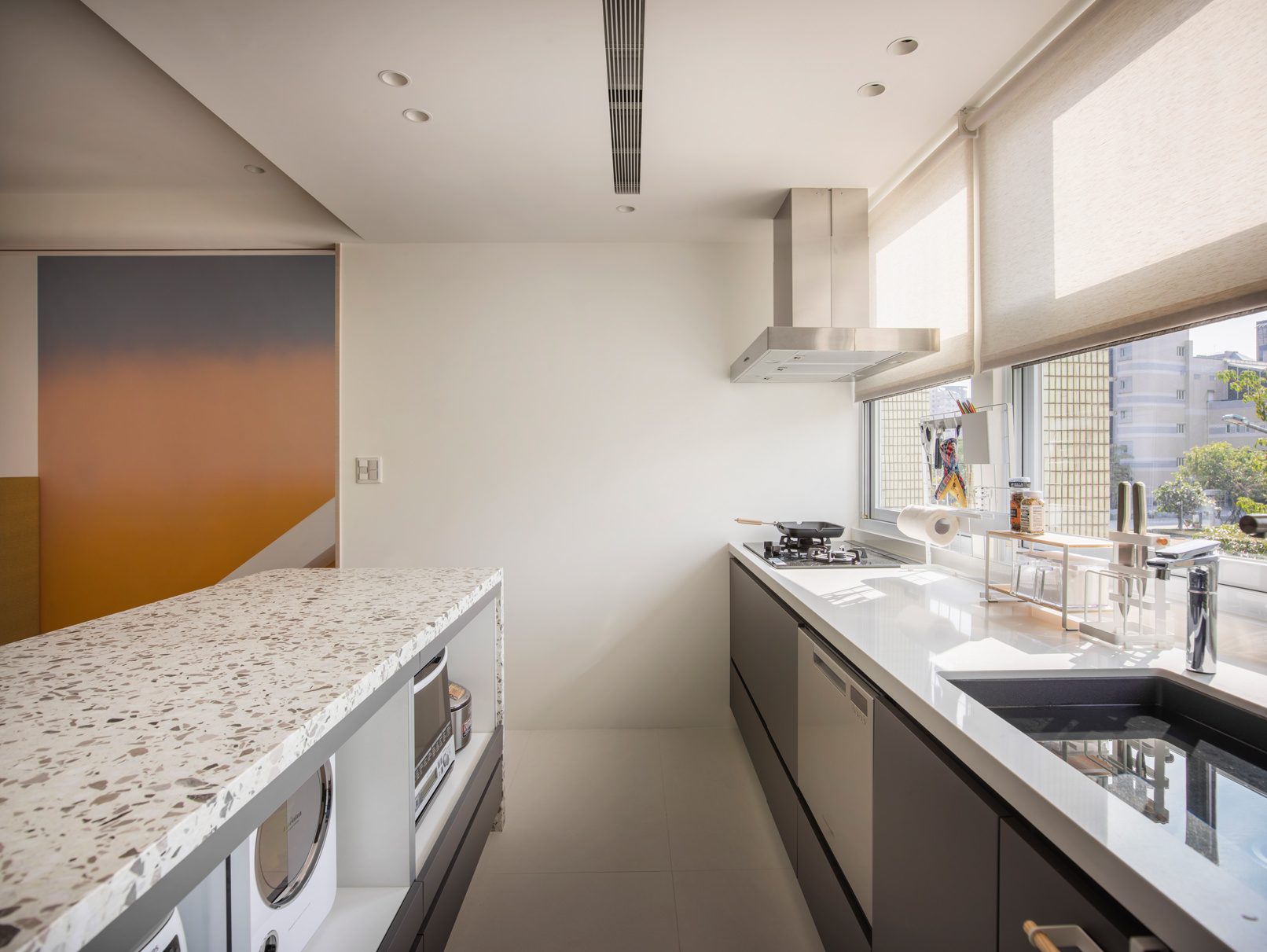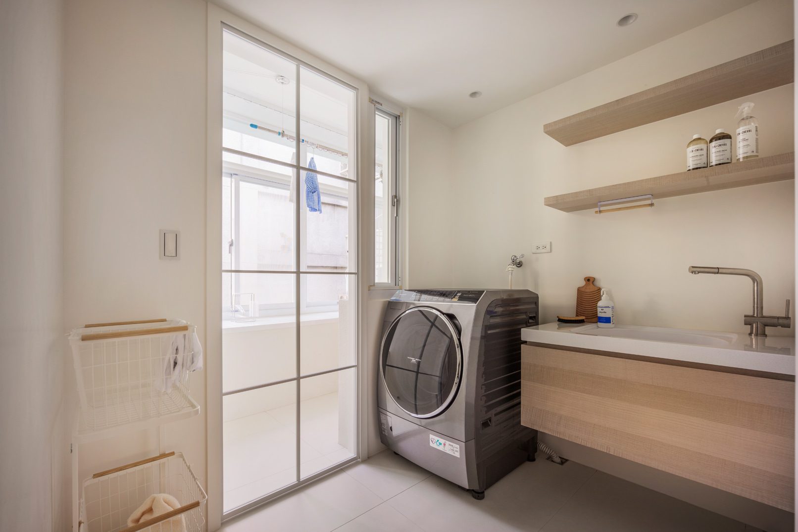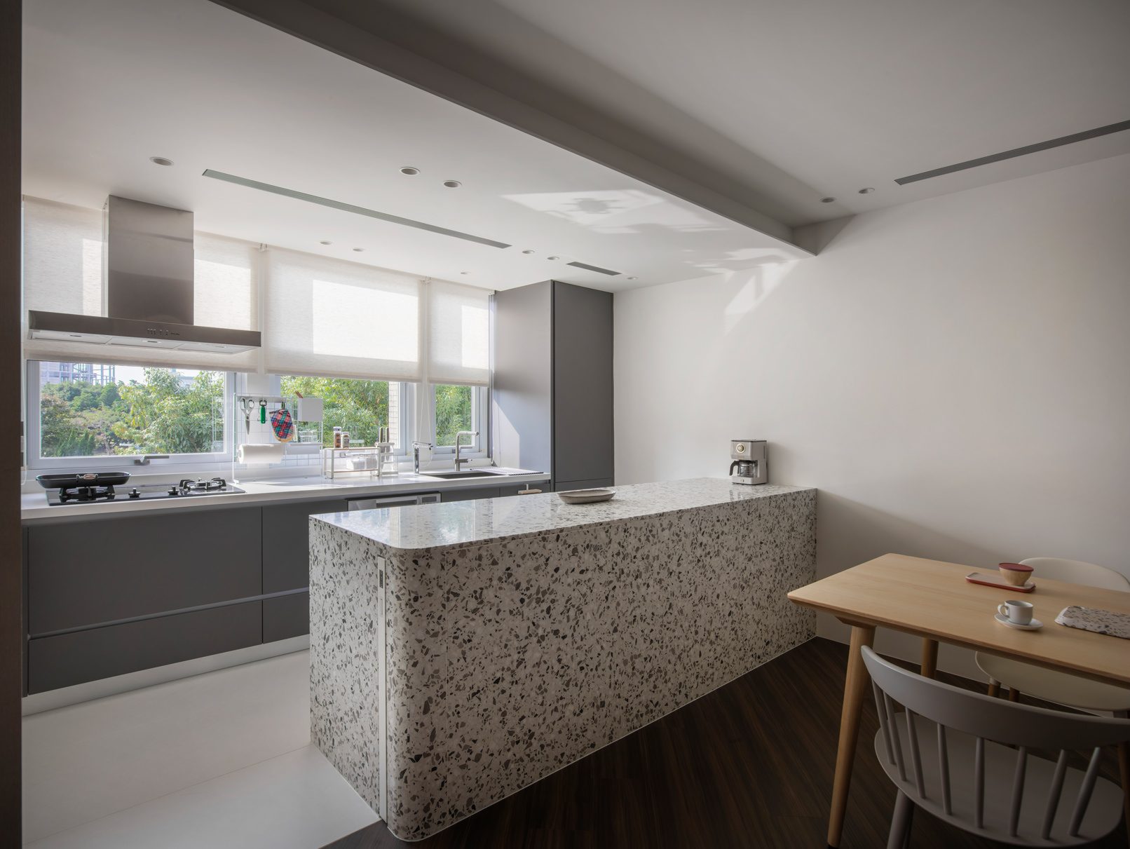 成了太太後,要既獨立也依賴;當了媽媽後,要既溫柔也剛強。有了孩子的家,既要有趣,也要實際。這個家的每一個設計考量,都在孩子與大人之間抓取平衡。整體保持在媽媽期待的乾淨設計風格,除了重整原始長型的老公寓格局,規劃恰當的生活機能,並讓公共空間仍保有方正,全屋的每一個柱體轉角都以圓角處理,形成無形的安全保護。多功能室則用來滿足孩子們好動愛玩,以及對色彩的高度感官,其中上方的斜頂設計,在修飾樑柱的同時,也巧妙拉升視覺。為玩具與書籍們預先規劃好收納方式與位置,兩個小孩房也都為未來,設定了可以彈性調整的運用方式。主婦們注重的清潔維護,則在材料搭配時,特意挑選了好保養的,例如:強效抗刮噴漆、超耐磨木地板等,讓這件事變得容易許多。有孩子的家,絕不只是多一個兒童房而已,如能同時考量並滿足大人與小孩的期待與需求,生活就能兼具品質與歡樂。