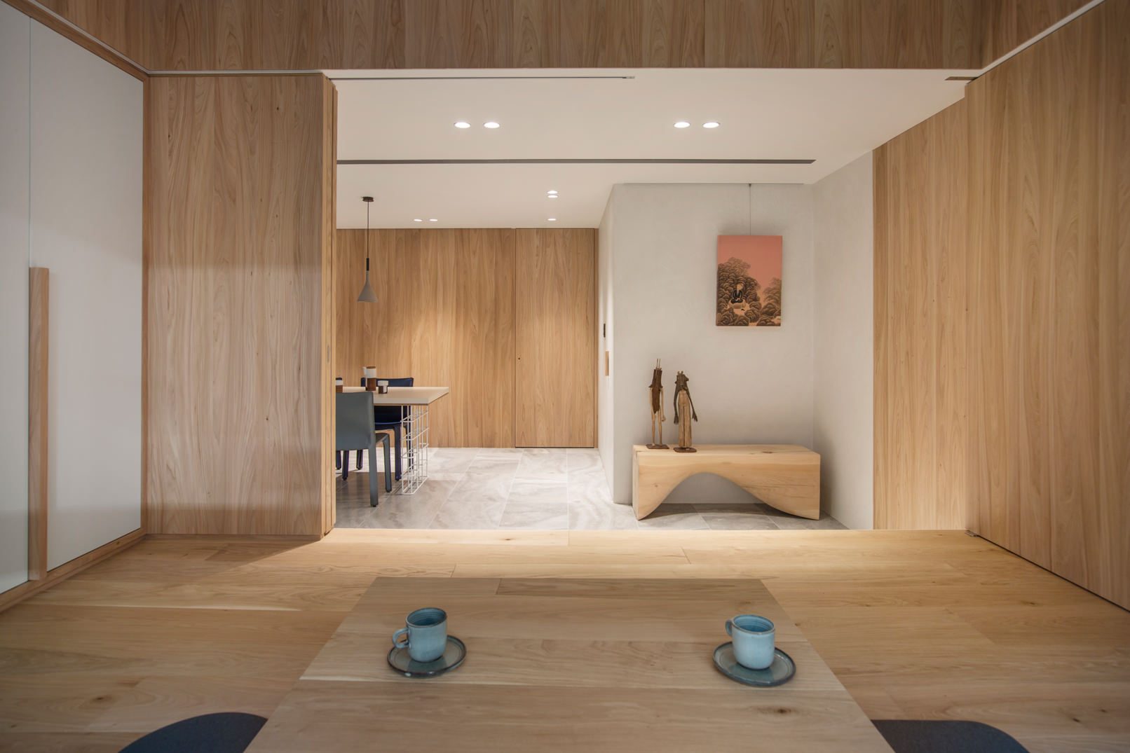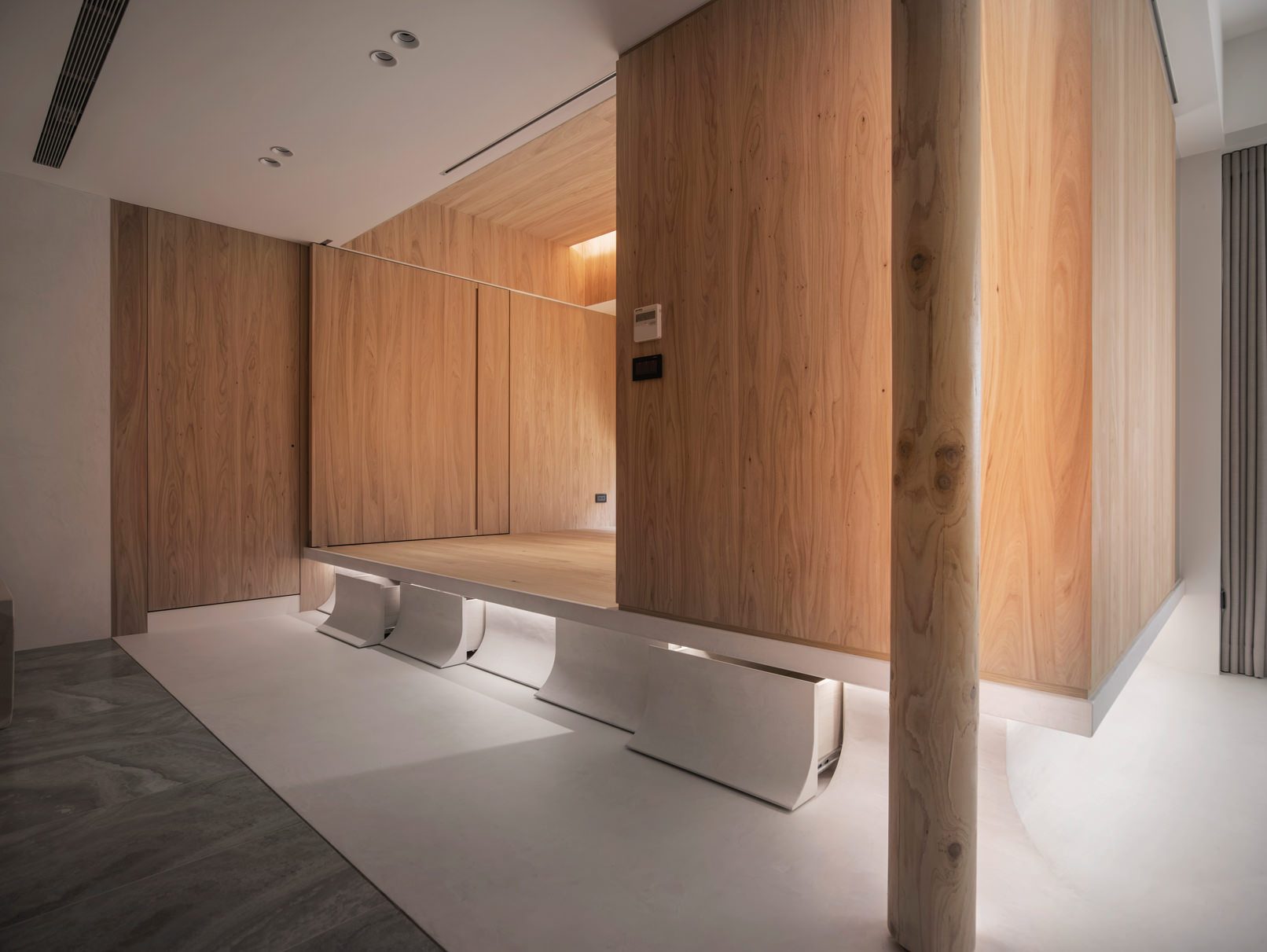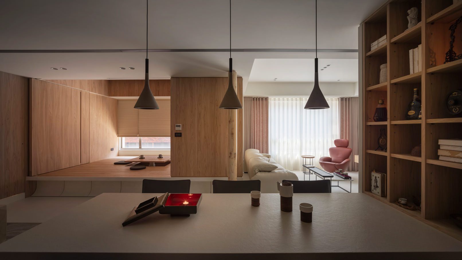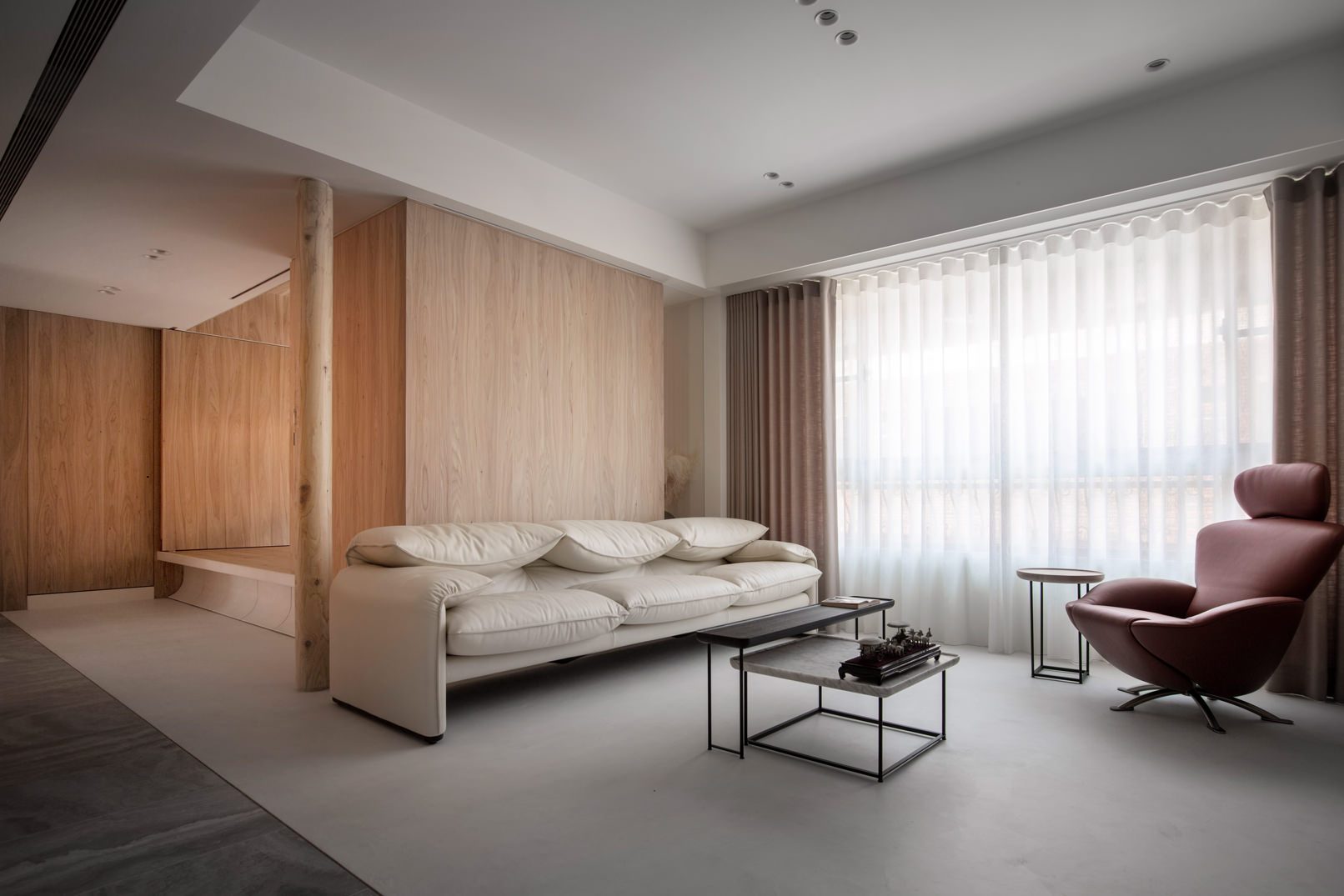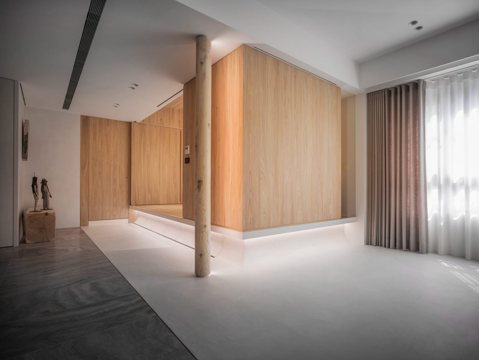 越來越多記憶掉了,很多事情妳也都不再會了。但不管失去多少,妳總還是記得笑。看妳笑著,我也就能不感覺到傷感。看妳笑著,我也就一起笑了。帶著老伴回到熟悉的區域,買下一個也有年紀的房子,這將是他們的最後一個家,要繼續相依相伴的地方。ㄧ個像是公園裡的木墩亭子,是這個空間中富足生活的起點:好客的男主人泡上一壺好茶,與老友談天說地,50年來的故事歷久彌新,女主人隨側在旁,靜靜聆聽微笑,一如既往。亭外的福衫實木柱,象徵整個家的頂天支柱,頂著整個房子還有一家人。側邊隱晦崁入燈條,見光不見燈的,與木材透出的淡淡香氣一起,彷彿一家之主的那股無形力量。窗外綠意搖曳,偶有鳥叫蟲鳴,也有人聲車響。光影隨著時間入內,輕柔地踩踏幾個漫步,過往繁華在安穩的現世看來,一切都是如此從容淡然。材質皆保留原始紋理,全室乾淨自然、內斂素雅。時光未央,歲月靜好。清淺的日子,在平淡中日漸變暖。我希望讓妳記得的,都是最溫暖的美好。