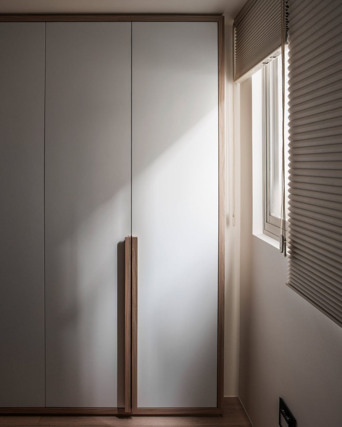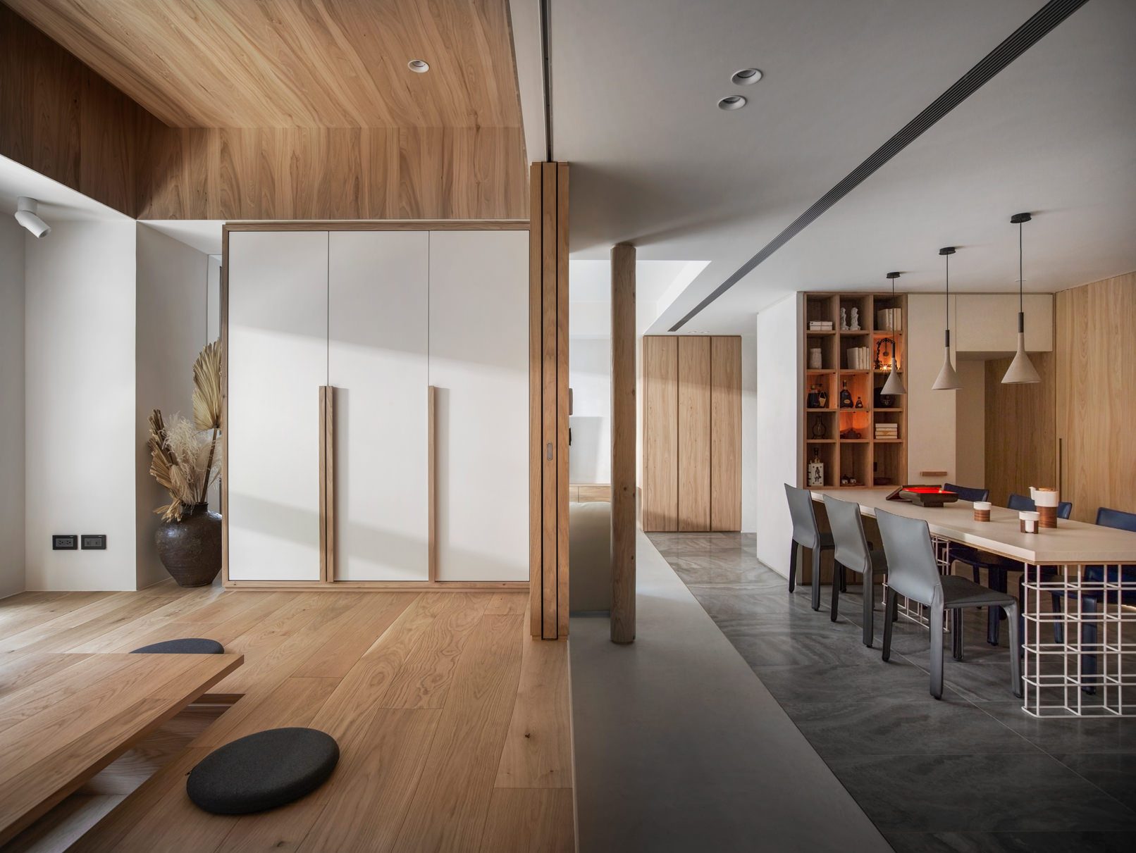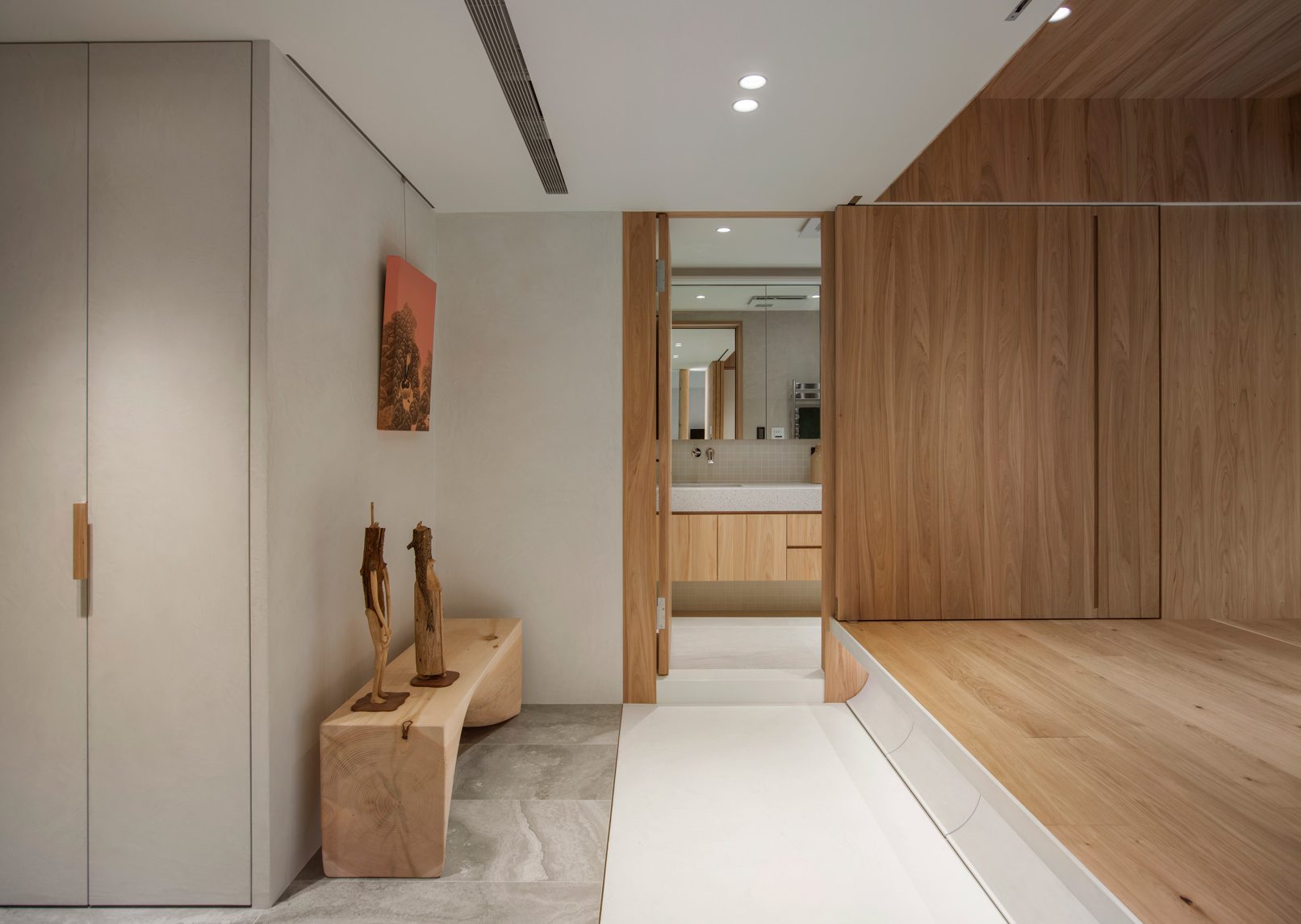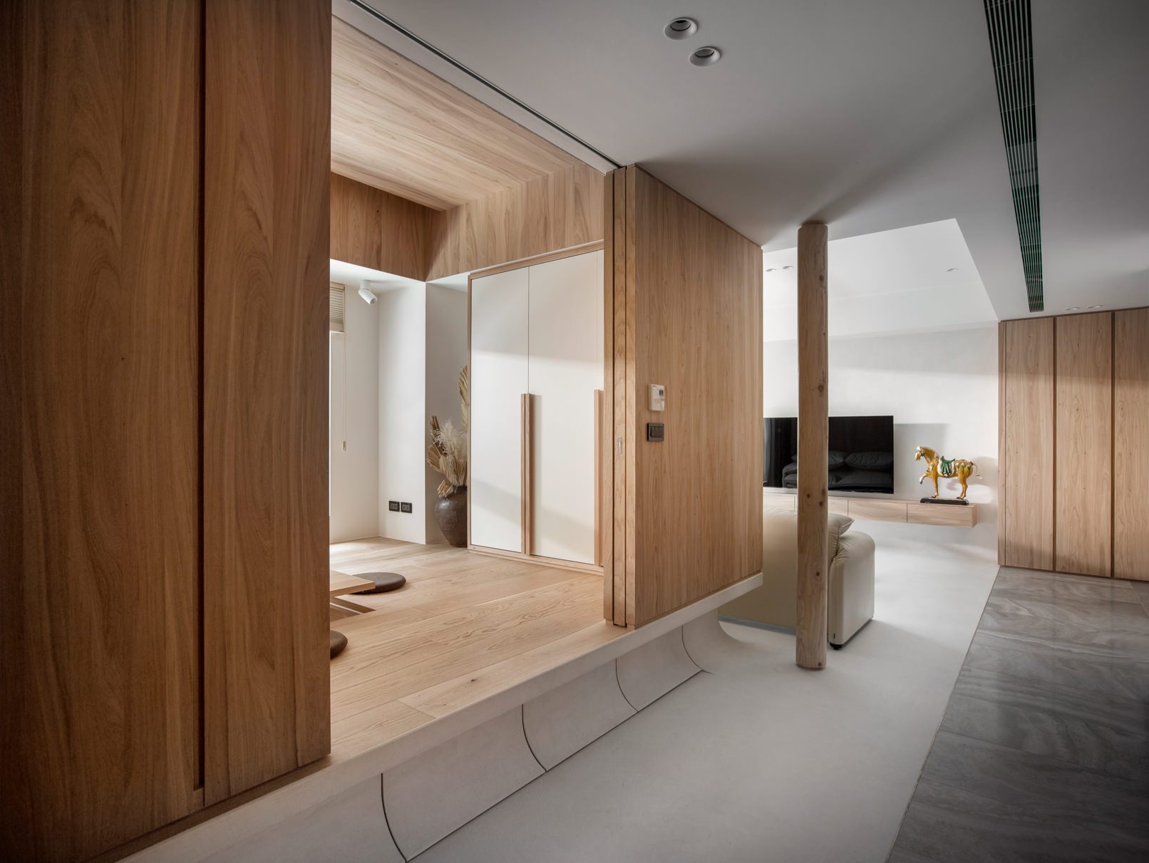越來越多記憶掉了,很多事情妳也都不再會了。但不管失去多少,妳總還是記得笑。看妳笑著,我也就能不感覺到傷感。看妳笑著,我也就一起笑了。帶著老伴回到熟悉的區域,買下一個也有年紀的房子,這將是他們的最後一個家,要繼續相依相伴的地方。ㄧ個像是公園裡的木墩亭子,是這個空間中富足生活的起點:好客的男主人泡上一壺好茶,與老友談天說地,50年來的故事歷久彌新,女主人隨側在旁,靜靜聆聽微笑,一如既往。亭外的福衫實木柱,象徵整個家的頂天支柱,頂著整個房子還有一家人。側邊隱晦崁入燈條,見光不見燈的,與木材透出的淡淡香氣一起,彷彿一家之主的那股無形力量。窗外綠意搖曳,偶有鳥叫蟲鳴,也有人聲車響。光影隨著時間入內,輕柔地踩踏幾個漫步,過往繁華在安穩的現世看來,一切都是如此從容淡然。材質皆保留原始紋理,全室乾淨自然、內斂素雅。時光未央,歲月靜好。清淺的日子,在平淡中日漸變暖。我希望讓妳記得的,都是最溫暖的美好。