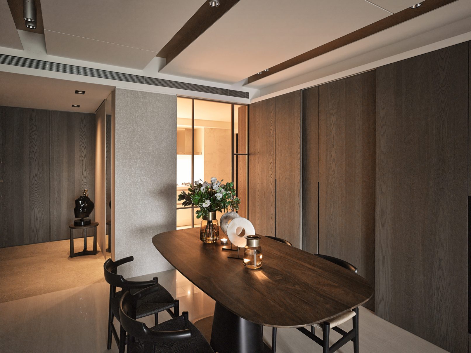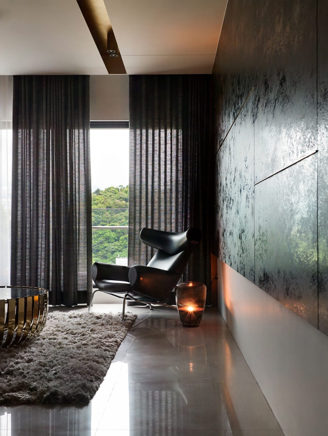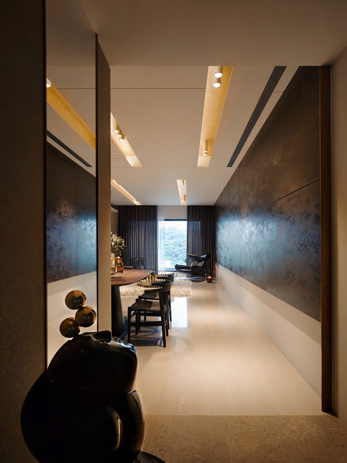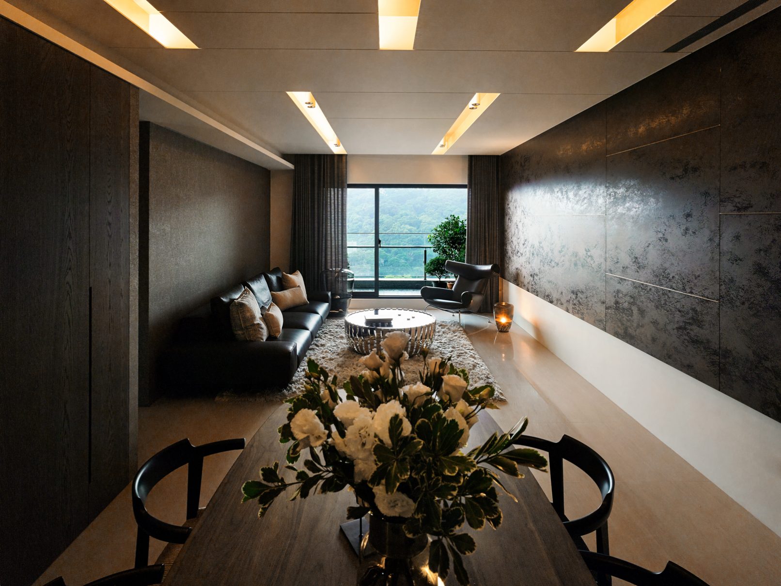 理性是規律的。感性是跳躍的。在這個宛若回歸山居的生活,室外綠意引入至現代居所,室內滲透著屋主理性思考的痕跡;面對山景與大面積的反射地板, 型塑融合自然的空間氛圍; 順著拋光面地磚反射於家具的光影,幻化成水影;鐵鏽色的薄磚在立面,彷若自然山岩伴隨著窗外綠意及天板間隙灑落的天光,創造了回歸山林時,家與環境的自然連結。主卧室融合木質的鐵件收納櫃,更為空間帶來整個亮點,手刮地板與眾不同的質感,與牆上織品相呼應。整體細緻而理性的現代氛圍,不單散發著低調奢華的氣氛,更徹底滿足了屋主對家的詮釋。