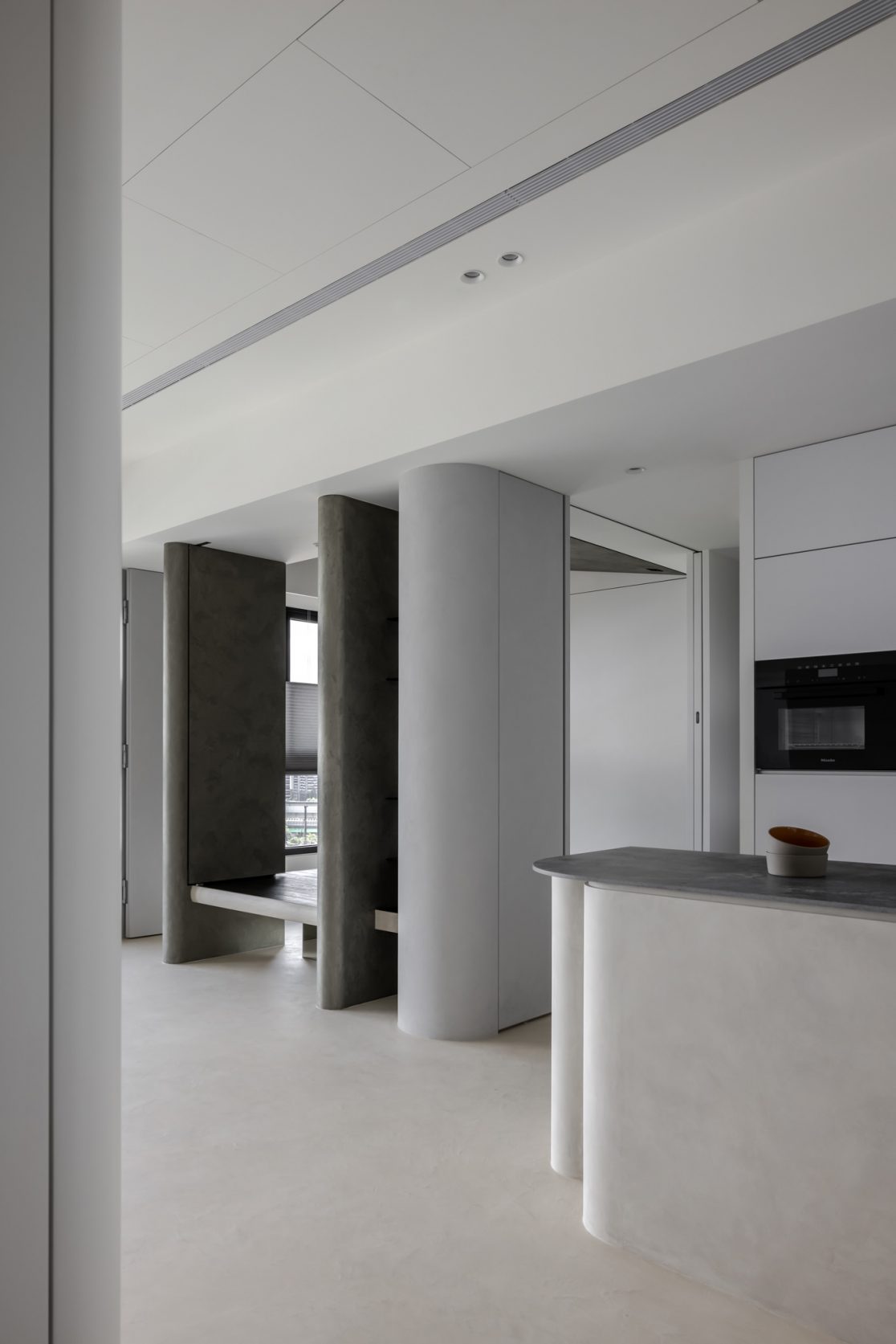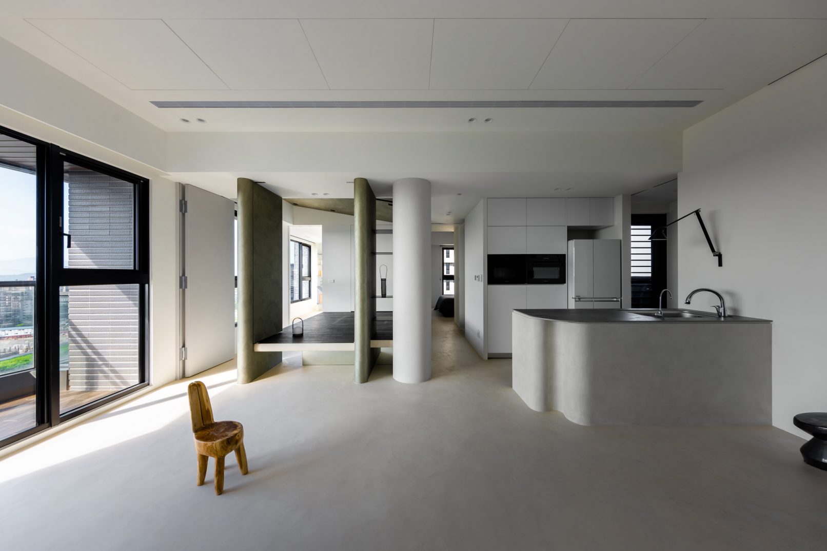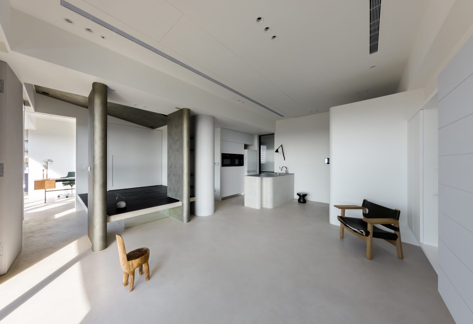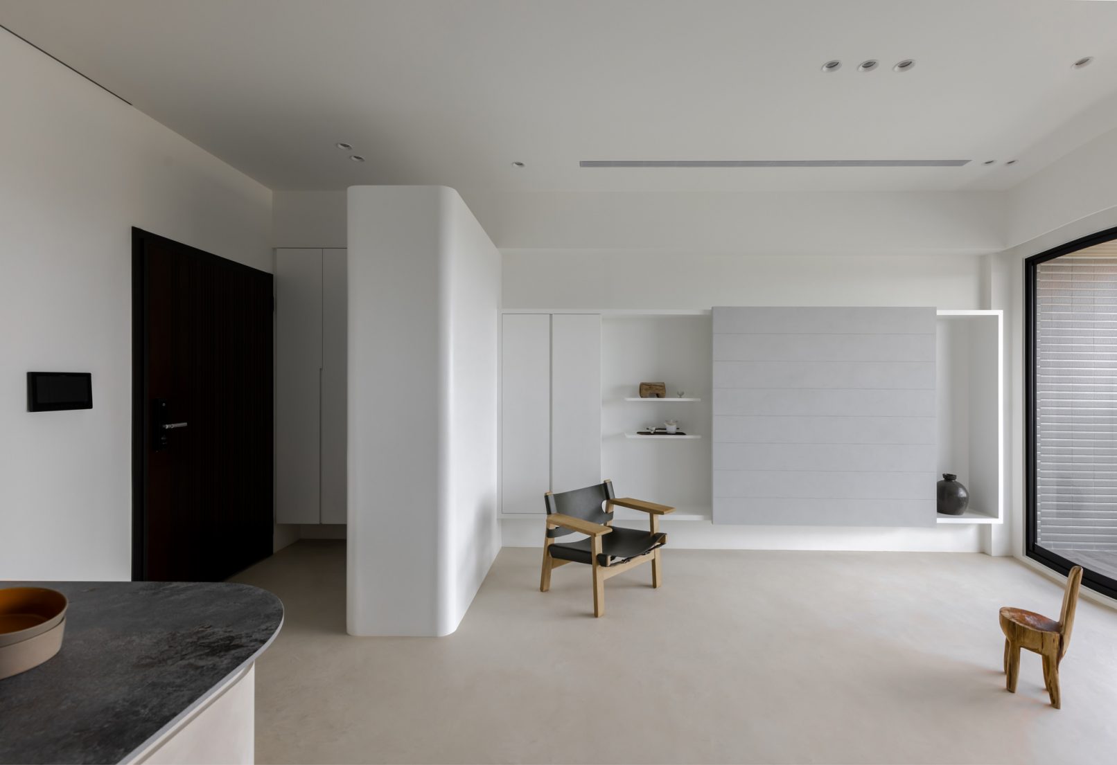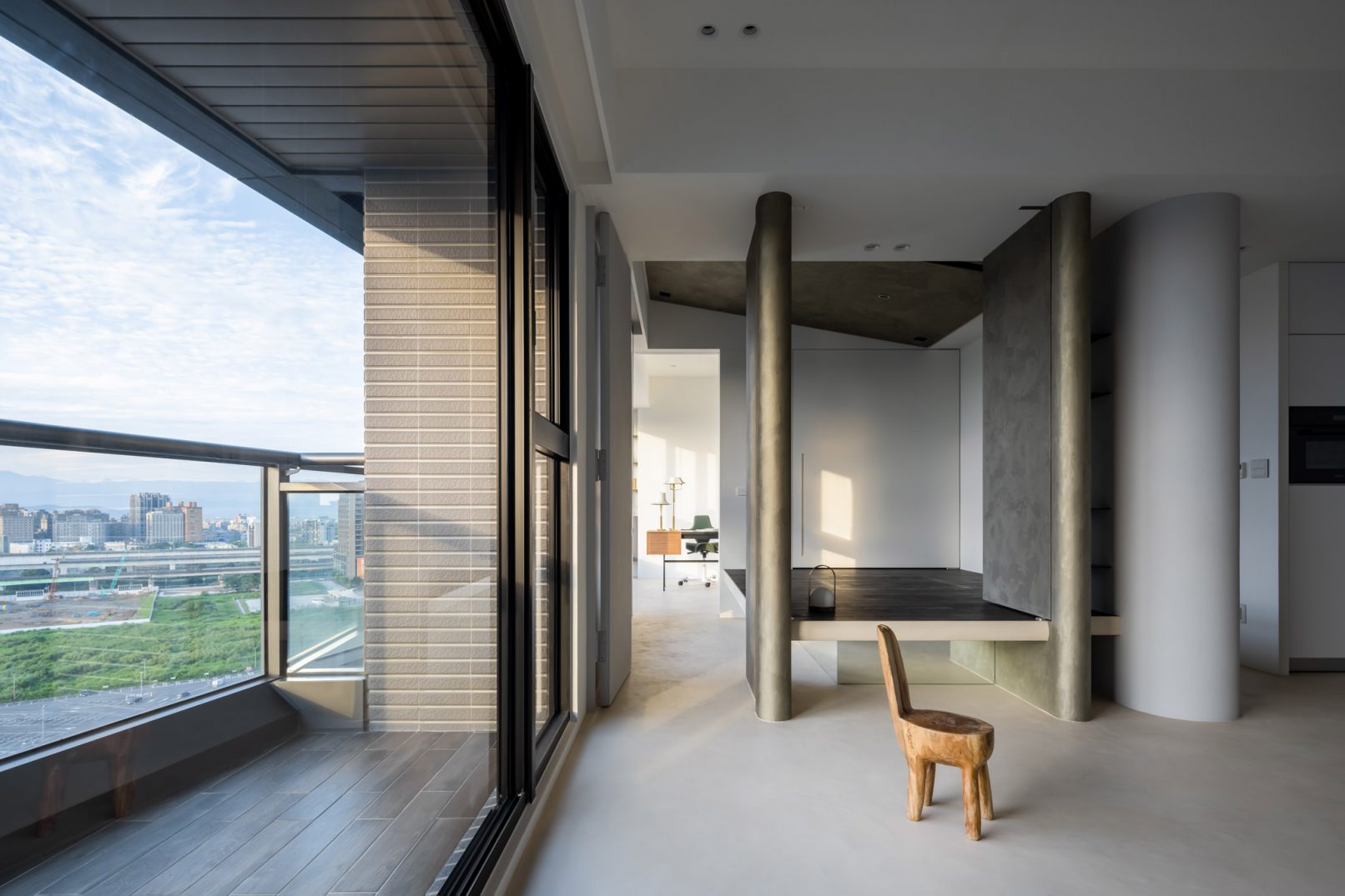 在更接近天空的 Penthouse 裡,住著一個長時間在家辦公的專案管理師,還有她每日 on schedule 的規律生活。選擇以毛胚交屋,提供自己與設計團隊更多規劃彈性。空間配置以獨立且彈性的生活畫面進行重塑,在三面開放的多功能架高區及雙入口更衣室的串連下,建立具極大自由度、能靈活開放或封閉的回字型動線。不僅滿足一人 24 小時活動其中,能輕鬆劃分工作與生活,更提供親友來訪時,圍塑獨立個室的自由調配度。回應屋主追求 Less is more 的理想藍圖,以少量活動家具配置、隱化整合收納機能與家電等,維持空間視覺的簡潔俐落。以「沙漠中的綠洲」為引題概念,呼應一段人生旅行記憶,並延伸整體自然感的線條設計;結合具肌理及觸感的多種塗料、特殊漆等材質,表達天地一壁、純粹的空間意象;多功能架高小亭亦彷若綠洲般的精神主景,提供家的中心歸屬與安定。Less is more,我們缺少的不是物質,而是自在、沒有束縛的生活。收穫真正的自由,一個實現所有喜歡的家。