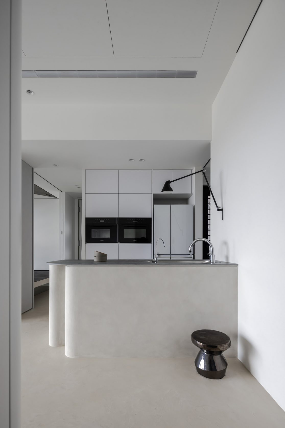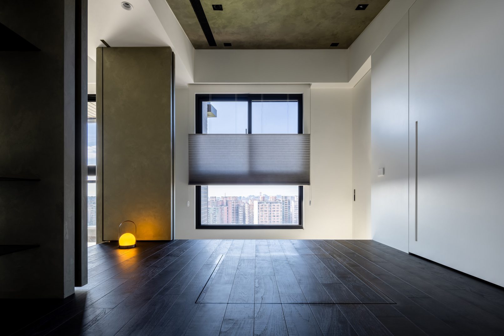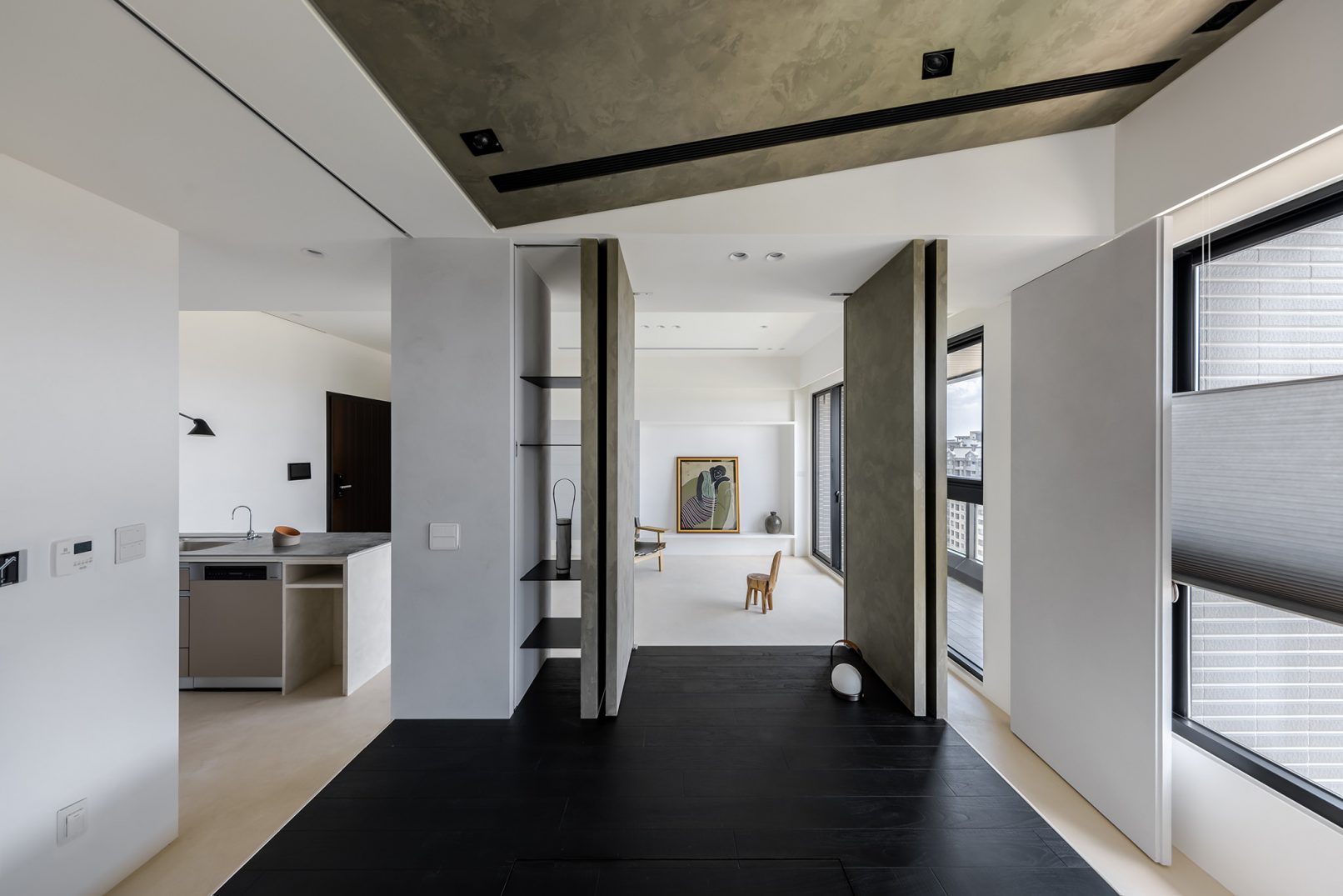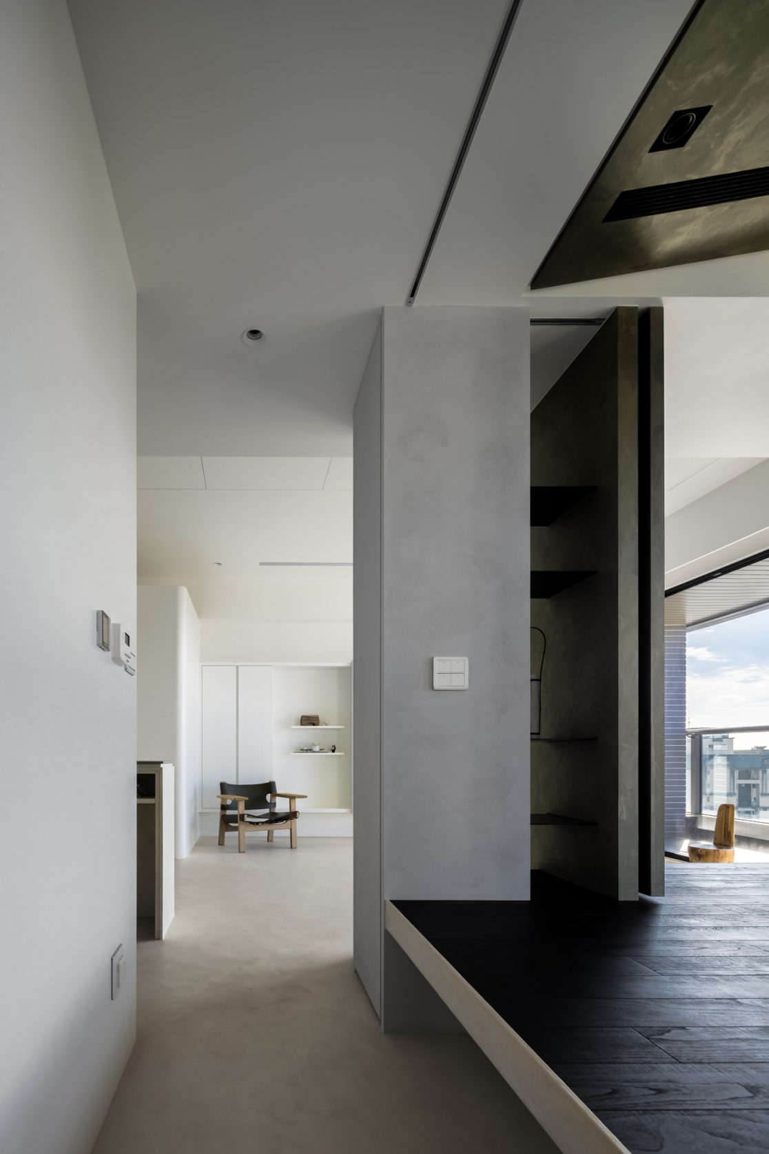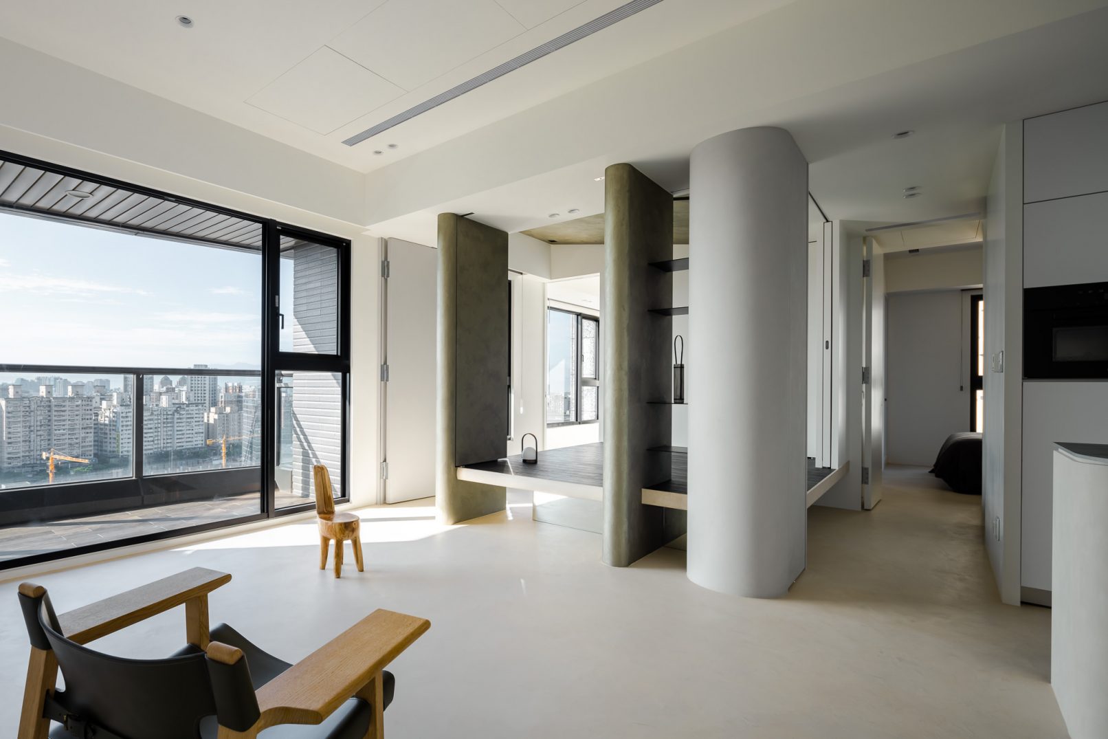 在更接近天空的 Penthouse 裡,住著一個長時間在家辦公的專案管理師,還有她每日 on schedule 的規律生活。選擇以毛胚交屋,提供自己與設計團隊更多規劃彈性。空間配置以獨立且彈性的生活畫面進行重塑,在三面開放的多功能架高區及雙入口更衣室的串連下,建立具極大自由度、能靈活開放或封閉的回字型動線。不僅滿足一人 24 小時活動其中,能輕鬆劃分工作與生活,更提供親友來訪時,圍塑獨立個室的自由調配度。回應屋主追求 Less is more 的理想藍圖,以少量活動家具配置、隱化整合收納機能與家電等,維持空間視覺的簡潔俐落。以「沙漠中的綠洲」為引題概念,呼應一段人生旅行記憶,並延伸整體自然感的線條設計;結合具肌理及觸感的多種塗料、特殊漆等材質,表達天地一壁、純粹的空間意象;多功能架高小亭亦彷若綠洲般的精神主景,提供家的中心歸屬與安定。Less is more,我們缺少的不是物質,而是自在、沒有束縛的生活。收穫真正的自由,一個實現所有喜歡的家。