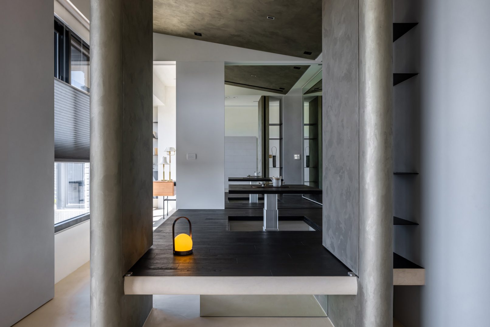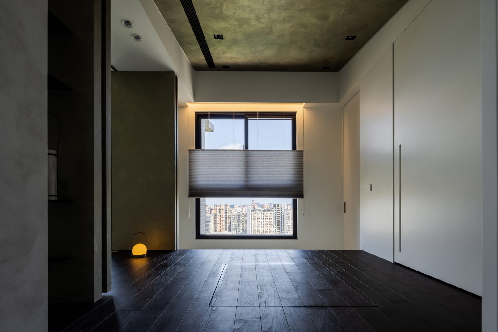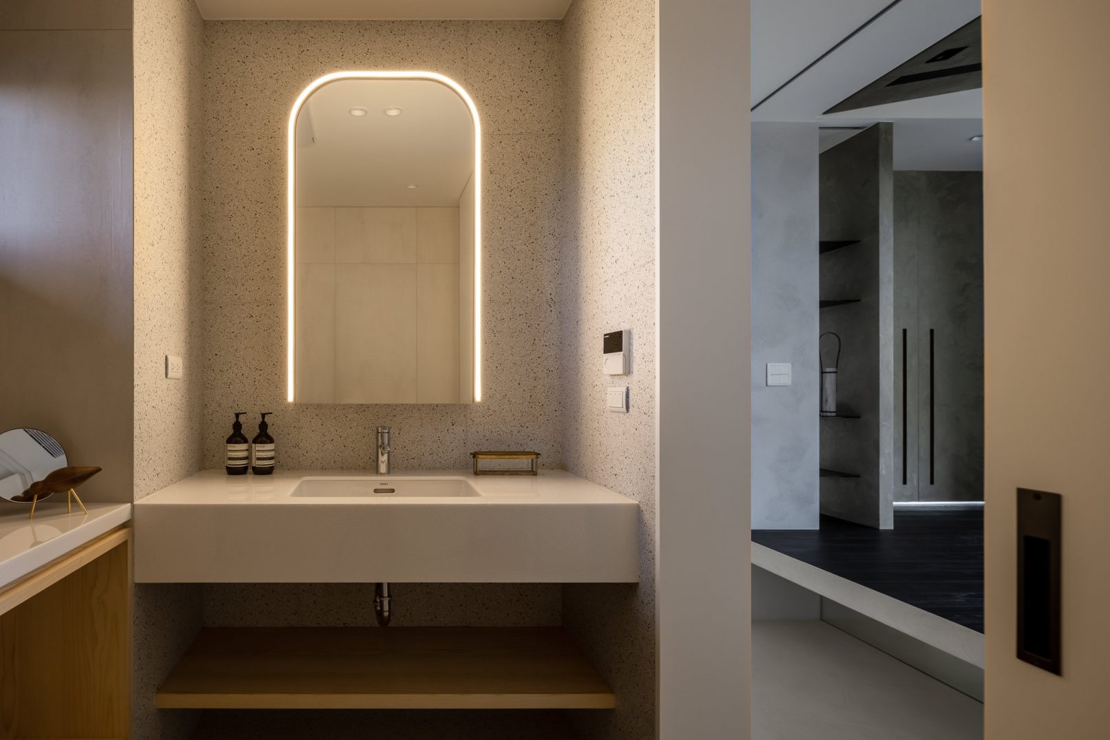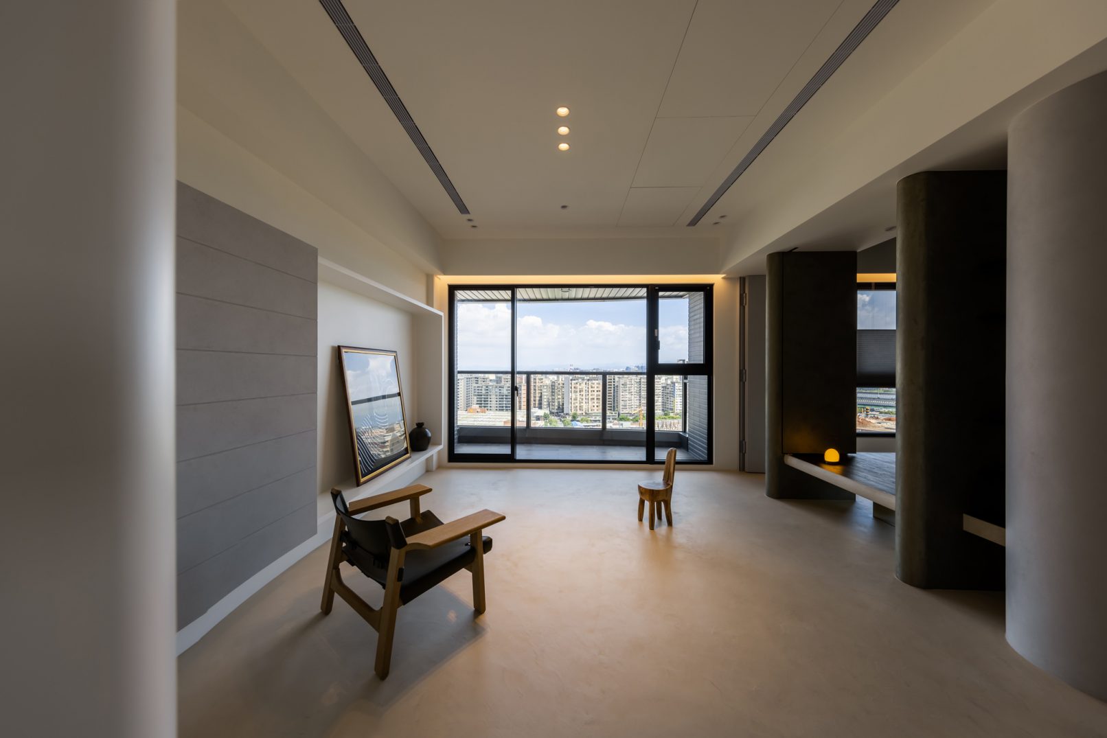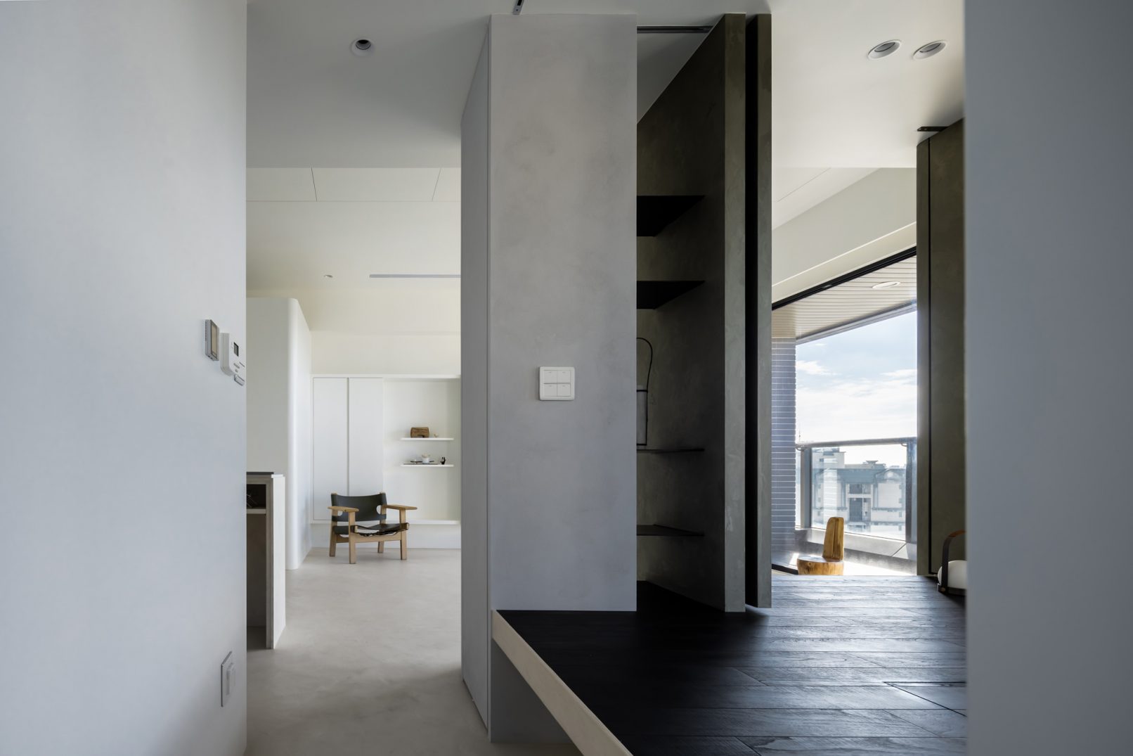 在更接近天空的 Penthouse 裡,住著一個長時間在家辦公的專案管理師,還有她每日 on schedule 的規律生活。選擇以毛胚交屋,提供自己與設計團隊更多規劃彈性。空間配置以獨立且彈性的生活畫面進行重塑,在三面開放的多功能架高區及雙入口更衣室的串連下,建立具極大自由度、能靈活開放或封閉的回字型動線。不僅滿足一人 24 小時活動其中,能輕鬆劃分工作與生活,更提供親友來訪時,圍塑獨立個室的自由調配度。回應屋主追求 Less is more 的理想藍圖,以少量活動家具配置、隱化整合收納機能與家電等,維持空間視覺的簡潔俐落。以「沙漠中的綠洲」為引題概念,呼應一段人生旅行記憶,並延伸整體自然感的線條設計;結合具肌理及觸感的多種塗料、特殊漆等材質,表達天地一壁、純粹的空間意象;多功能架高小亭亦彷若綠洲般的精神主景,提供家的中心歸屬與安定。Less is more,我們缺少的不是物質,而是自在、沒有束縛的生活。收穫真正的自由,一個實現所有喜歡的家。