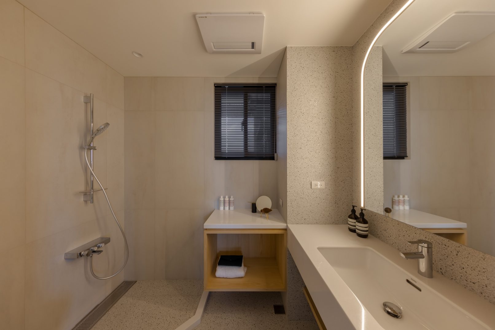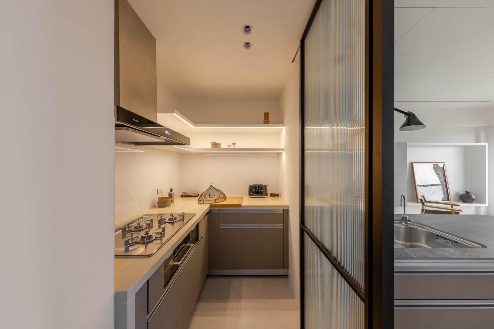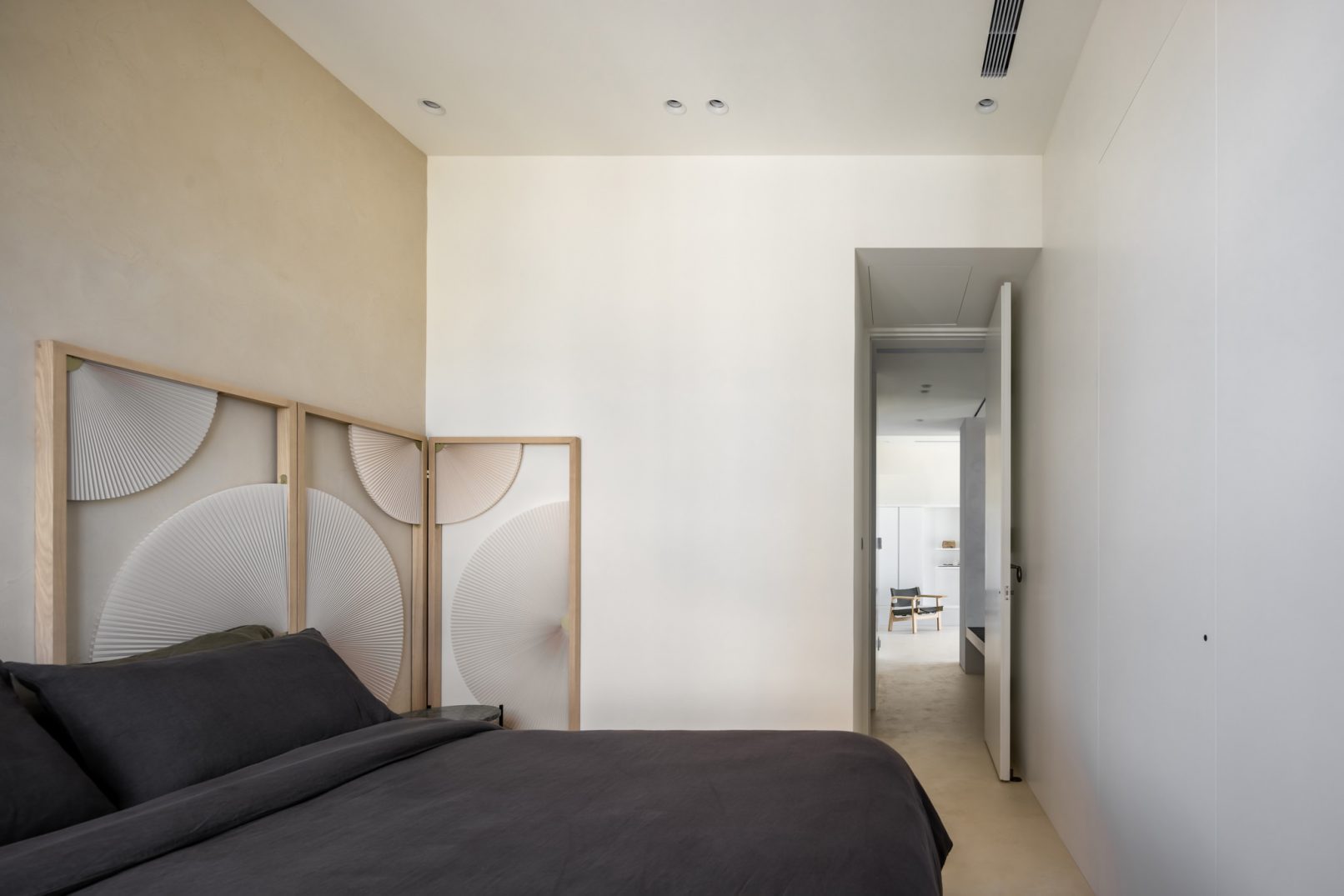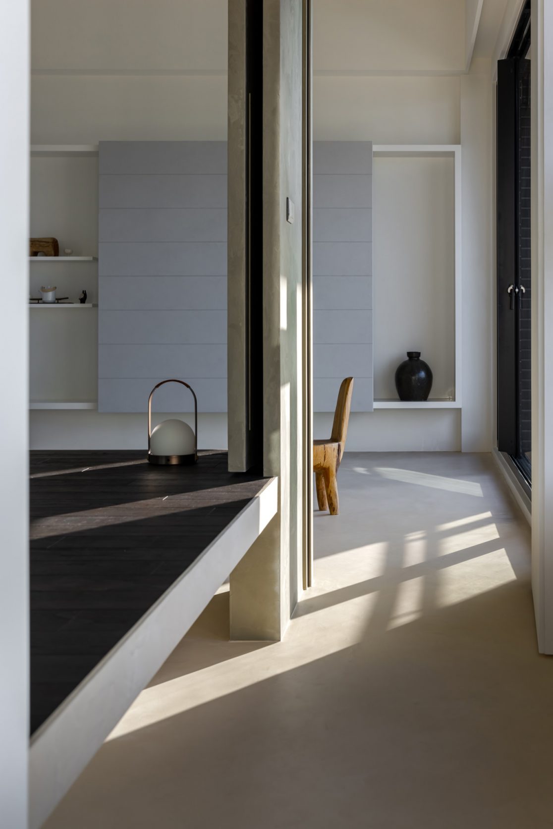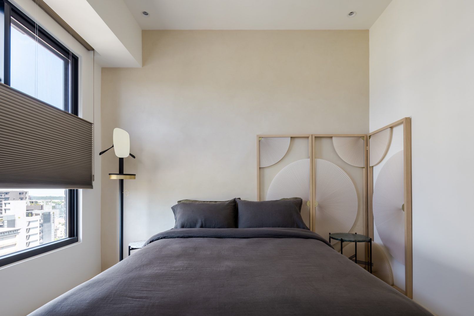 在更接近天空的 Penthouse 裡,住著一個長時間在家辦公的專案管理師,還有她每日 on schedule 的規律生活。選擇以毛胚交屋,提供自己與設計團隊更多規劃彈性。空間配置以獨立且彈性的生活畫面進行重塑,在三面開放的多功能架高區及雙入口更衣室的串連下,建立具極大自由度、能靈活開放或封閉的回字型動線。不僅滿足一人 24 小時活動其中,能輕鬆劃分工作與生活,更提供親友來訪時,圍塑獨立個室的自由調配度。回應屋主追求 Less is more 的理想藍圖,以少量活動家具配置、隱化整合收納機能與家電等,維持空間視覺的簡潔俐落。以「沙漠中的綠洲」為引題概念,呼應一段人生旅行記憶,並延伸整體自然感的線條設計;結合具肌理及觸感的多種塗料、特殊漆等材質,表達天地一壁、純粹的空間意象;多功能架高小亭亦彷若綠洲般的精神主景,提供家的中心歸屬與安定。Less is more,我們缺少的不是物質,而是自在、沒有束縛的生活。收穫真正的自由,一個實現所有喜歡的家。