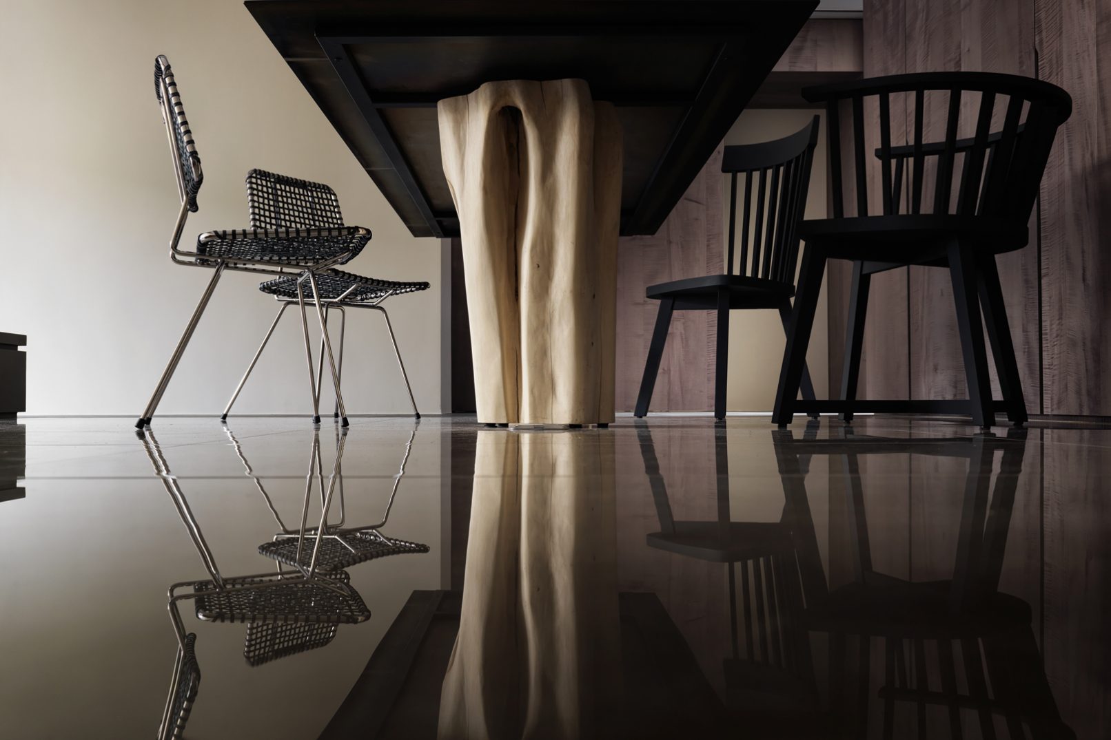 Renovation as an idea is not only modify older portion of the house with new stuff, but also improves upon previous design choices as well. For this minimal, beige color based property, The FUGE design team installs an interior screen of stone tiles for both some added privacy and separation between the main door and the living room, all the while maintain visual access to other parts of the room. That tile screen is set along and underneath the cross beam in the ceiling, and work visually with the greyscale paint in the house. The interior sees a texture mix of wood and stone, together with the choice of organic furniture installation to give off an elegant vibe, while still maintain a sense of comfort. This is our version of properly reimagining an older property, a much needed upgrade on form and function.