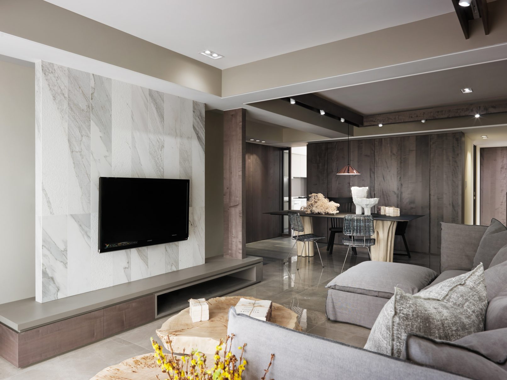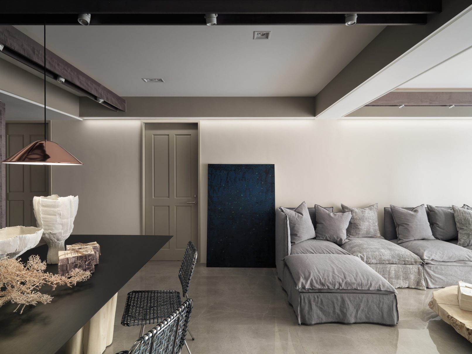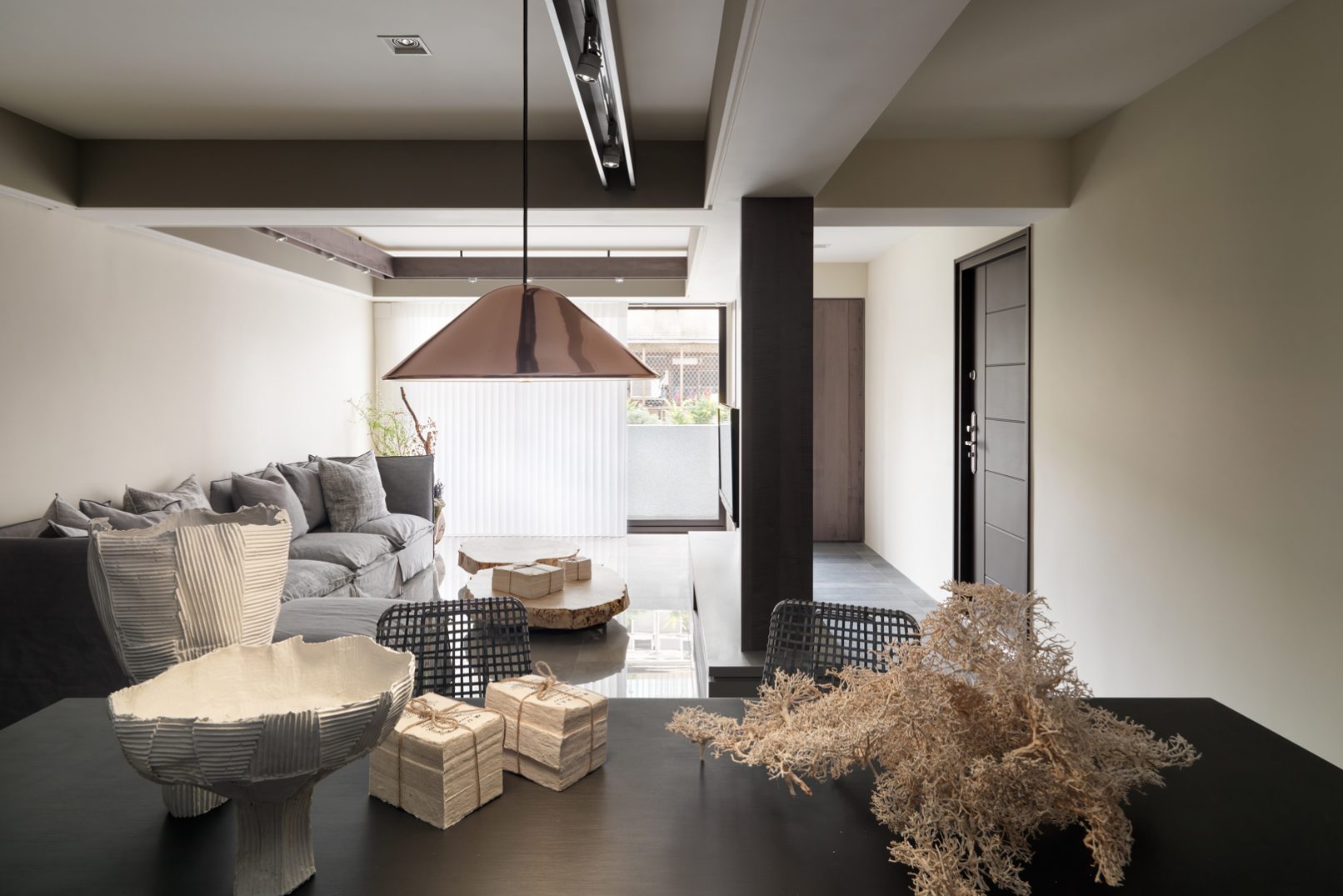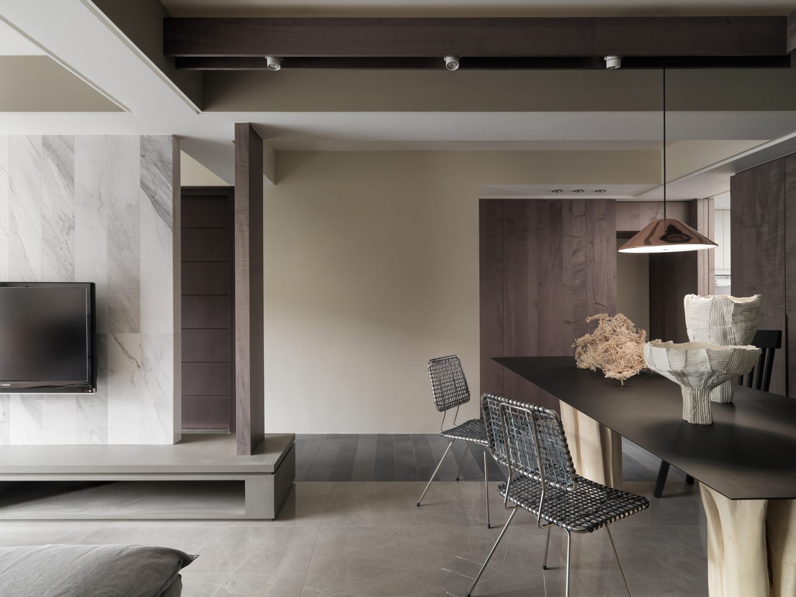 老屋翻新的設計,往往不只是希望讓舊空間煥然一新, 往往也在固有格局的缺撼上,提供 解決方案。在這個以大地色系簡約自然風塑造的新家裡,馥閣團隊巧妙地以一道石紋瓷磚的屏風,讓本來大門正沖客廳的缺點,化成美麗的隱私區隔,卻又能輕輕地穿透,窺見室內角落; 沿著老屋天花的十字樑而建的屏風,與灰階油漆凸顯的線條色調,平衡地化解了原本的巨大壓迫感。整體空間優雅且別具質感的木、石材質湊拼變化,配上風格一致的自然感家具,無不為這老屋帶來舒適且平衡的高雅氣息。