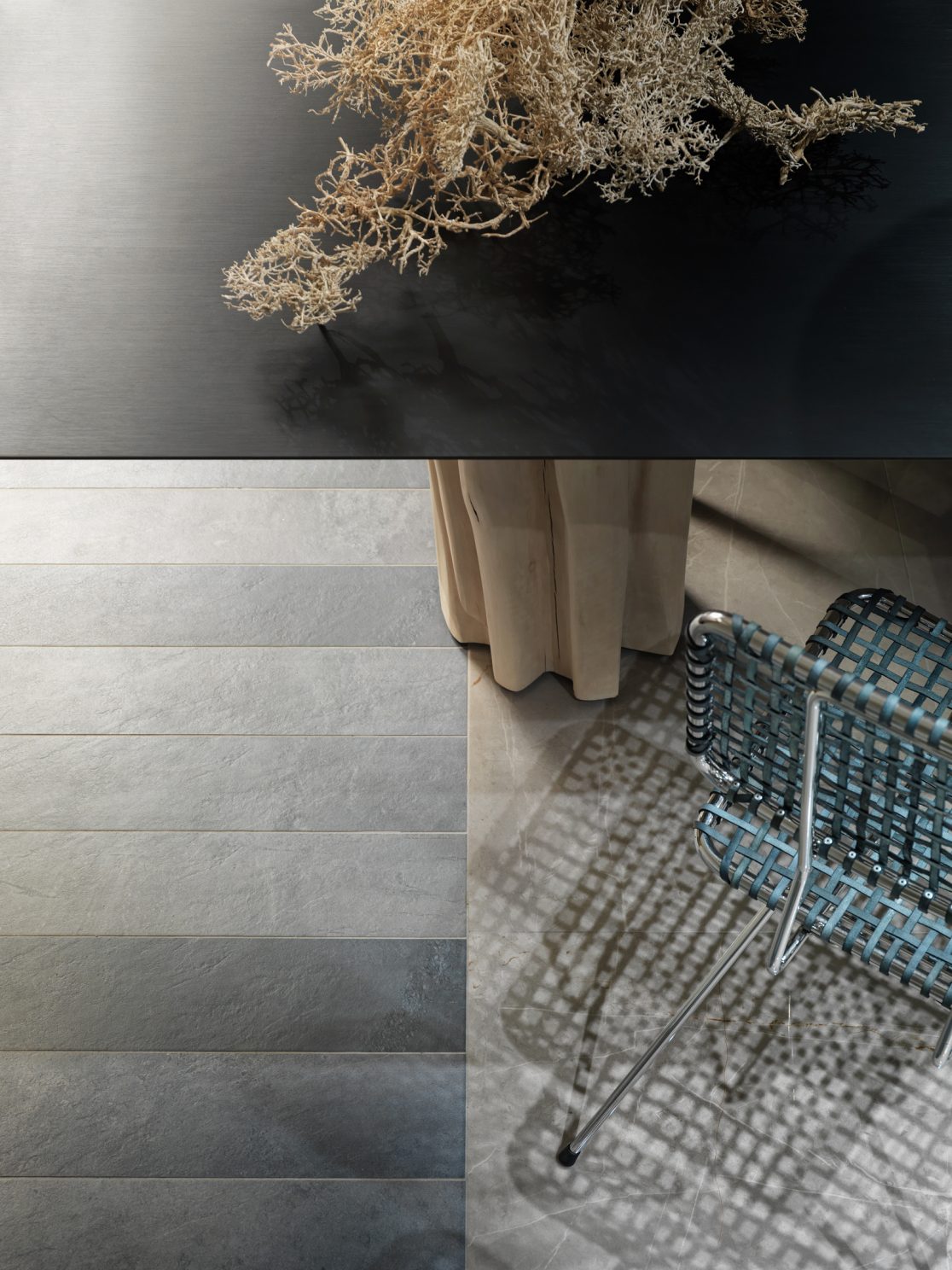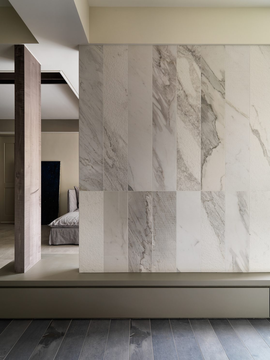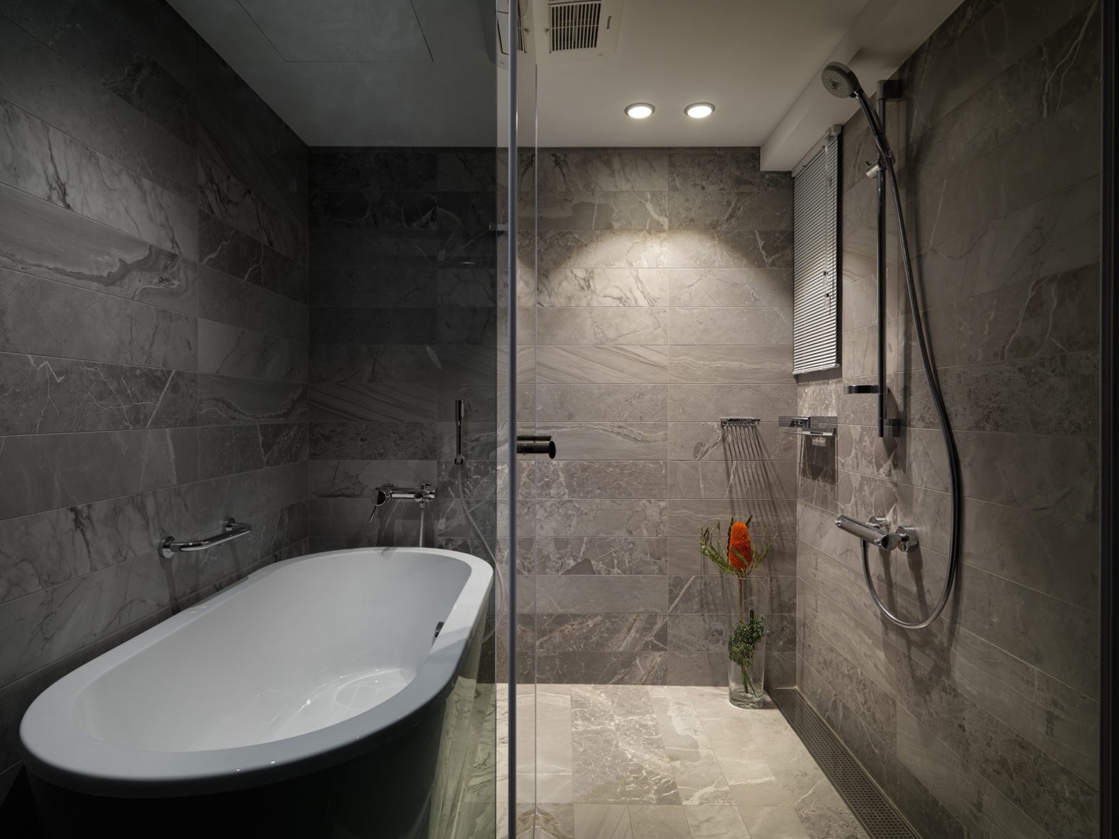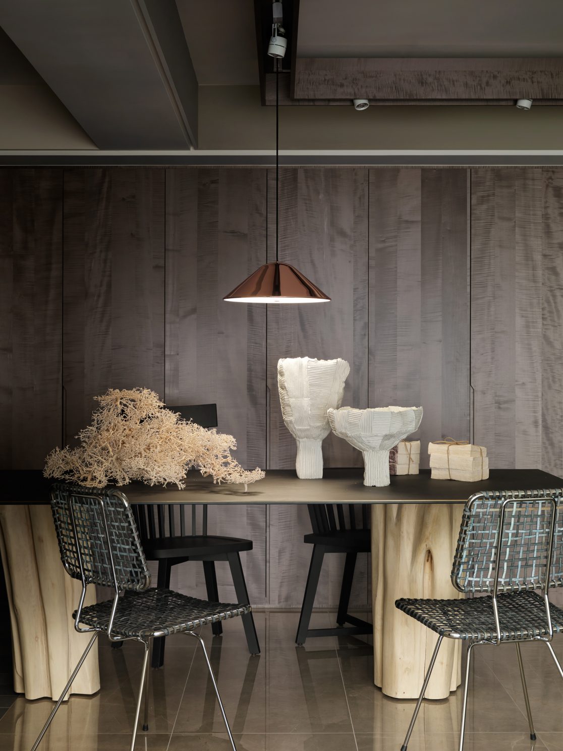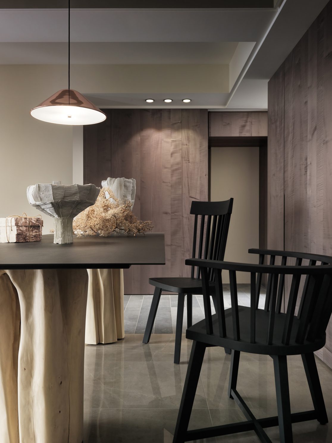 老屋翻新的設計,往往不只是希望讓舊空間煥然一新, 往往也在固有格局的缺撼上,提供 解決方案。在這個以大地色系簡約自然風塑造的新家裡,馥閣團隊巧妙地以一道石紋瓷磚的屏風,讓本來大門正沖客廳的缺點,化成美麗的隱私區隔,卻又能輕輕地穿透,窺見室內角落; 沿著老屋天花的十字樑而建的屏風,與灰階油漆凸顯的線條色調,平衡地化解了原本的巨大壓迫感。整體空間優雅且別具質感的木、石材質湊拼變化,配上風格一致的自然感家具,無不為這老屋帶來舒適且平衡的高雅氣息。
