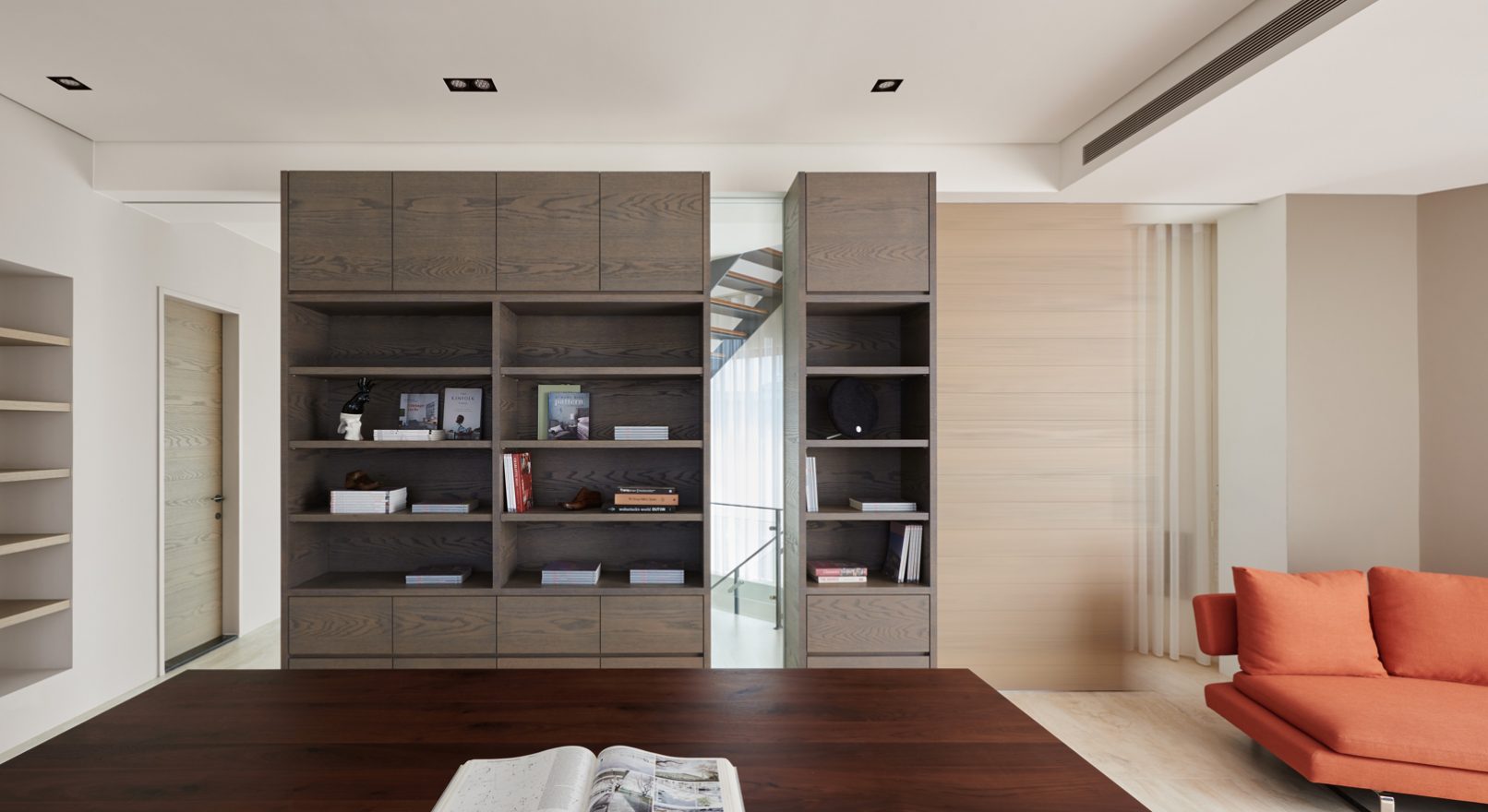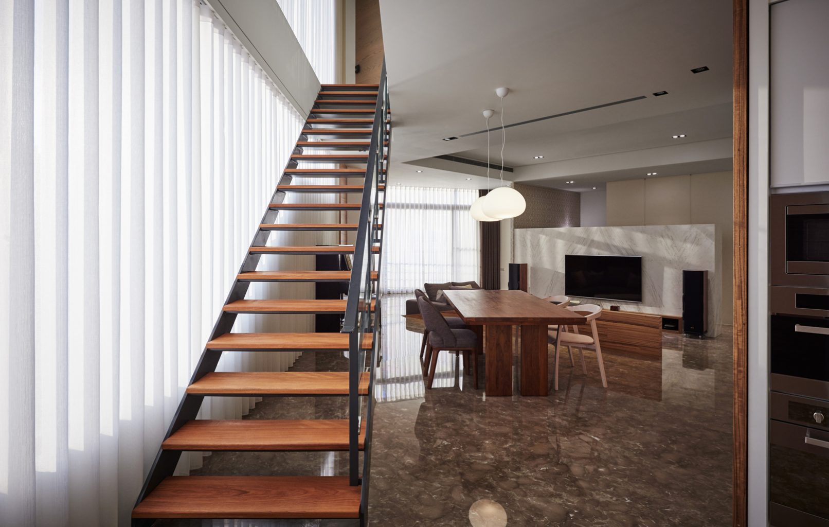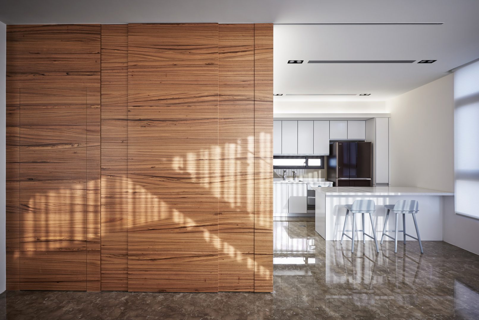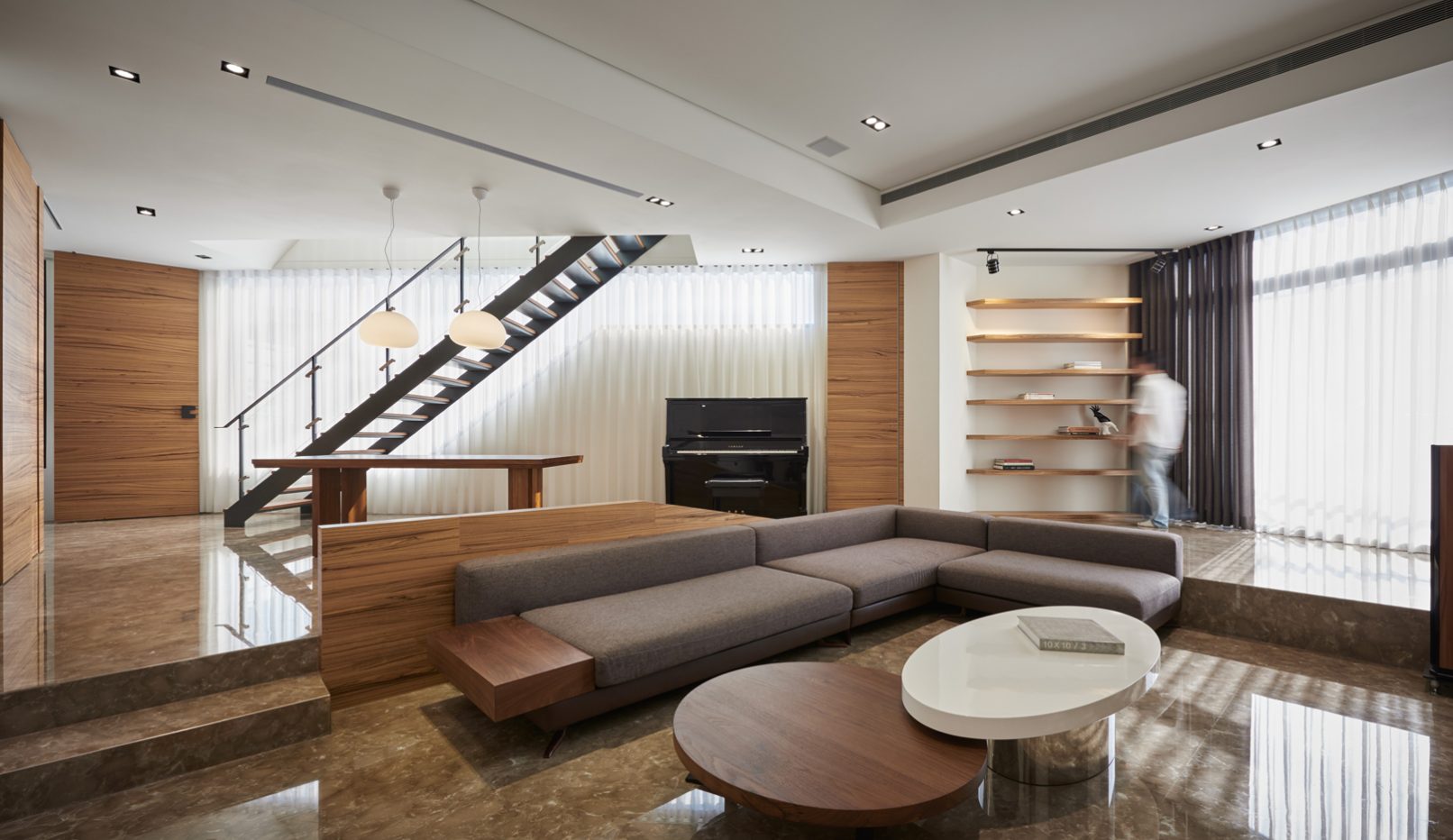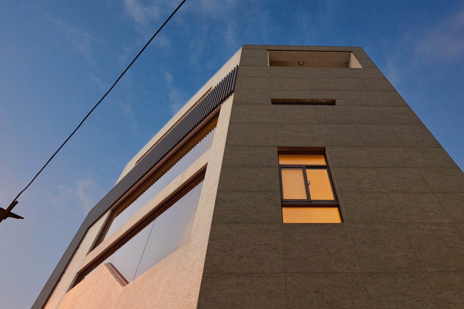 在水泥叢林與鐵皮屋林立的都市裡,我們努力創造截然不同的風景,這幢由內而外發想展開的光影建築,是凝聚家人關係的溫暖開始。獨特的三角基地,連繫著整個家族的生活,房子裡刻意面向大街的樓梯,不同尺度的開口,讓居住者輕易地與在街角開店及工作的家人互動看顧,家人之間有了聯繫對話的視窗,也讓自然光影微妙地灑進屋內,日昇、日落,遠山近景隨時光流逝在窗外忽隱忽現;房子的靈魂、一家人聚集的角落-客廳,宛若山坳般,被架高的閱讀區與餐桌圍繞下,讓多層寬廣的建築有了更舒適的中心,更添上一份溫馨的凝聚力。