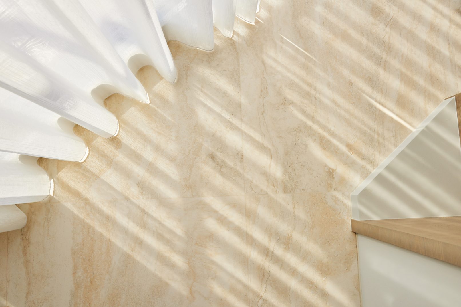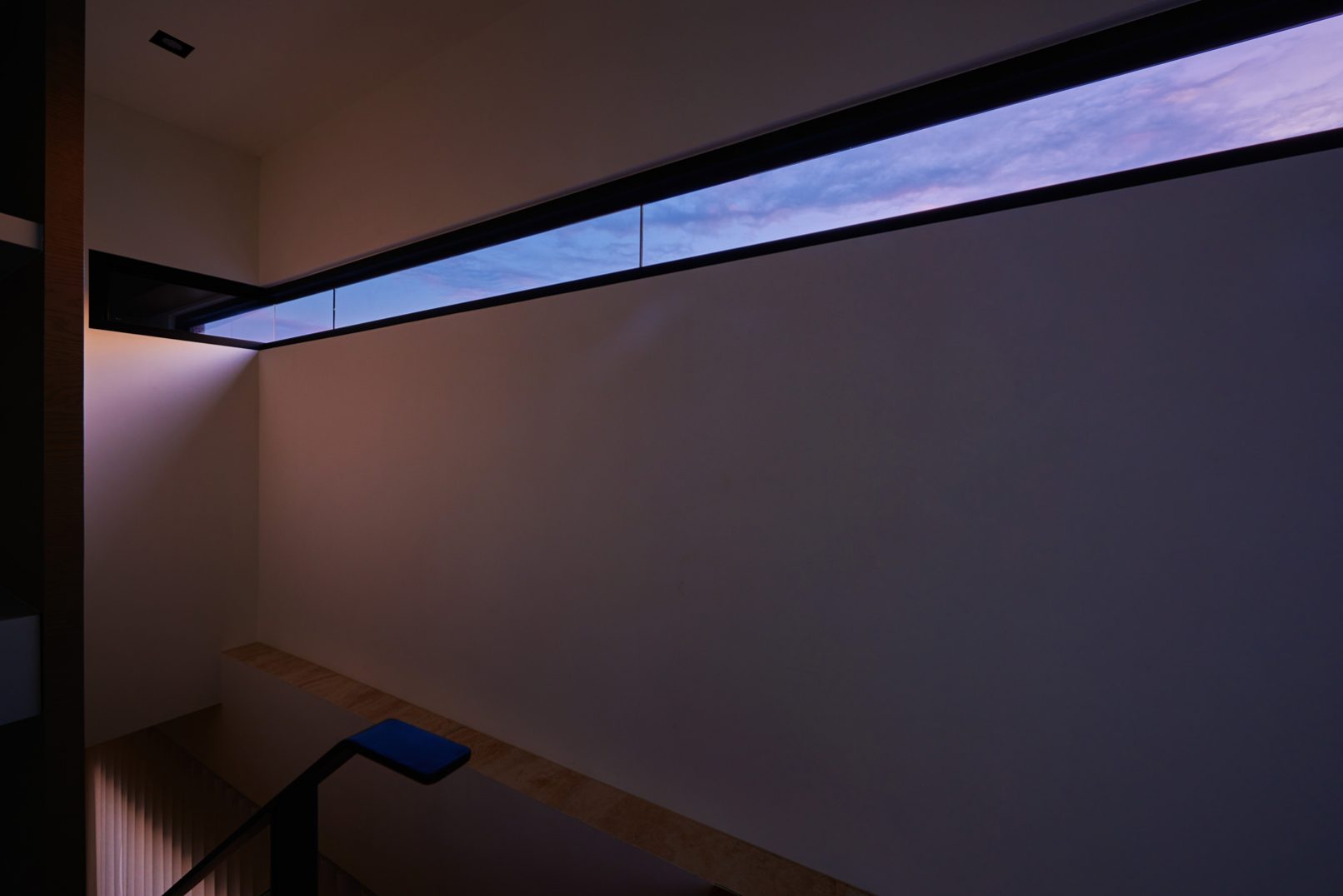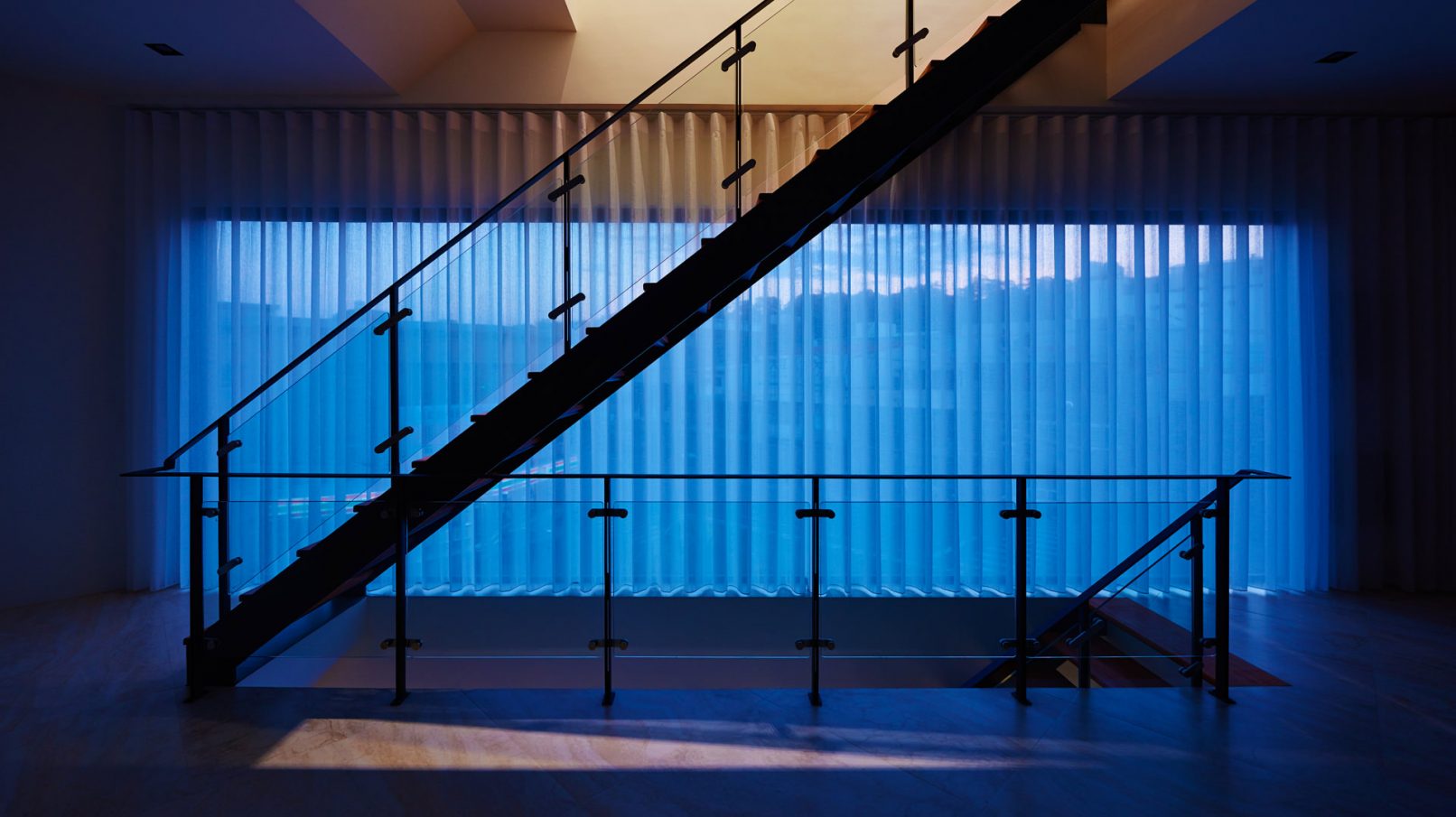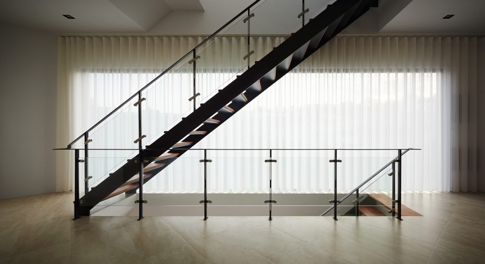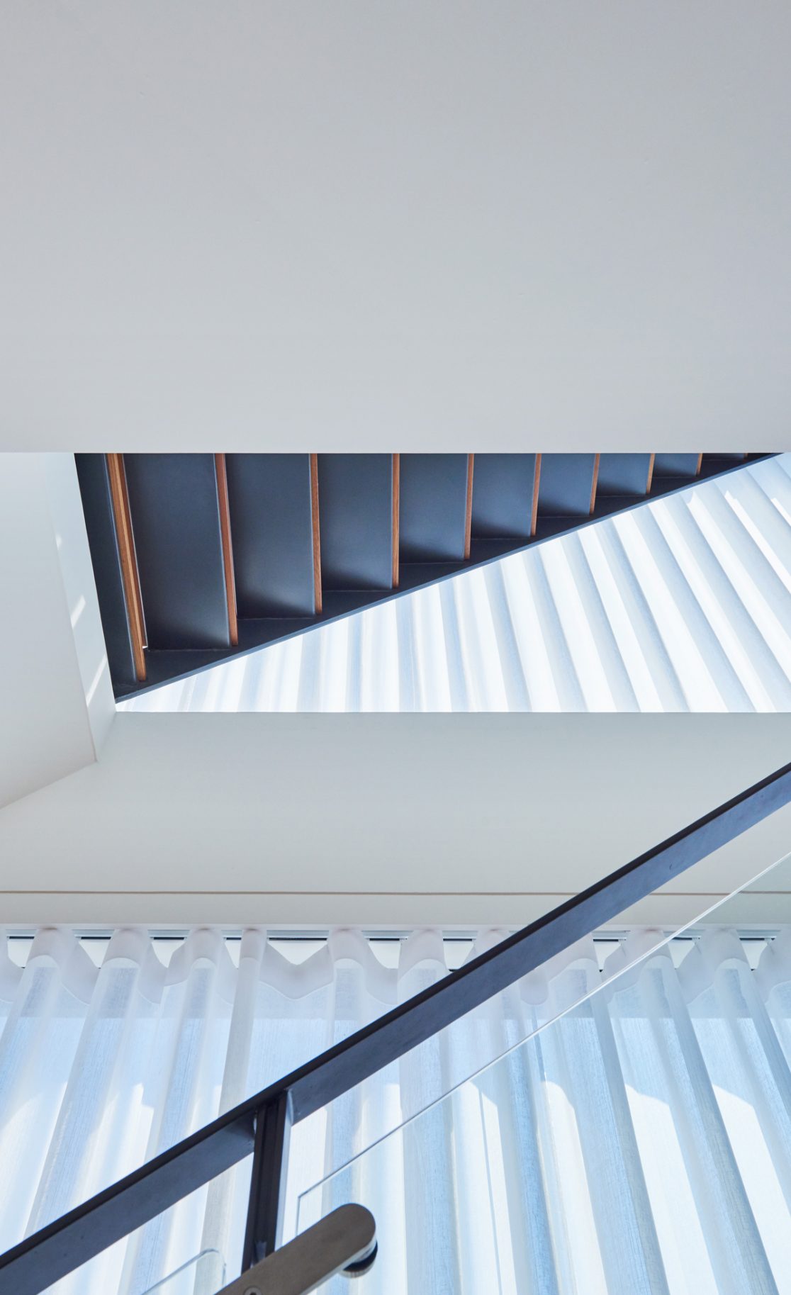 在水泥叢林與鐵皮屋林立的都市裡,我們努力創造截然不同的風景,這幢由內而外發想展開的光影建築,是凝聚家人關係的溫暖開始。獨特的三角基地,連繫著整個家族的生活,房子裡刻意面向大街的樓梯,不同尺度的開口,讓居住者輕易地與在街角開店及工作的家人互動看顧,家人之間有了聯繫對話的視窗,也讓自然光影微妙地灑進屋內,日昇、日落,遠山近景隨時光流逝在窗外忽隱忽現;房子的靈魂、一家人聚集的角落-客廳,宛若山坳般,被架高的閱讀區與餐桌圍繞下,讓多層寬廣的建築有了更舒適的中心,更添上一份溫馨的凝聚力。