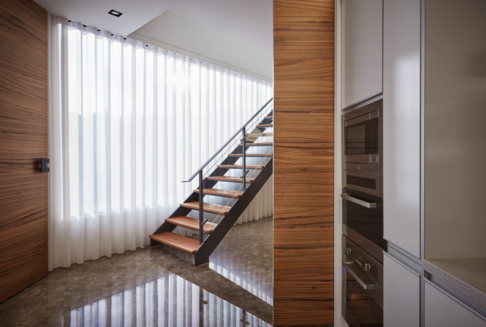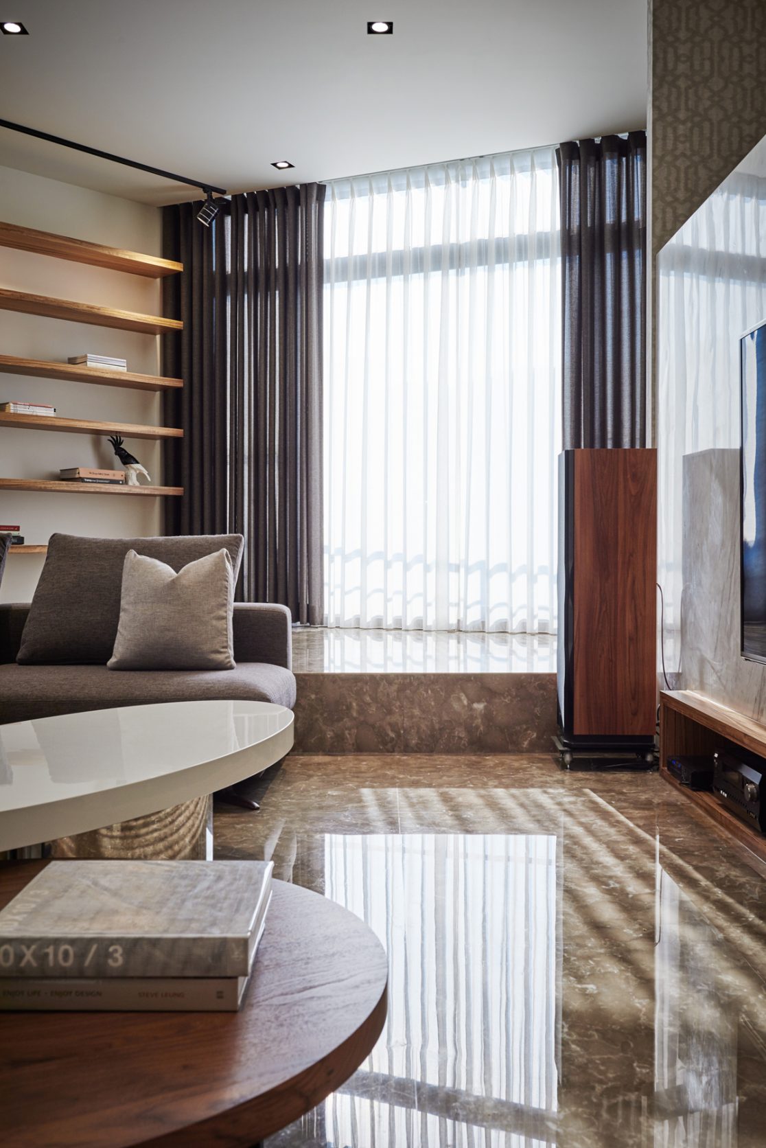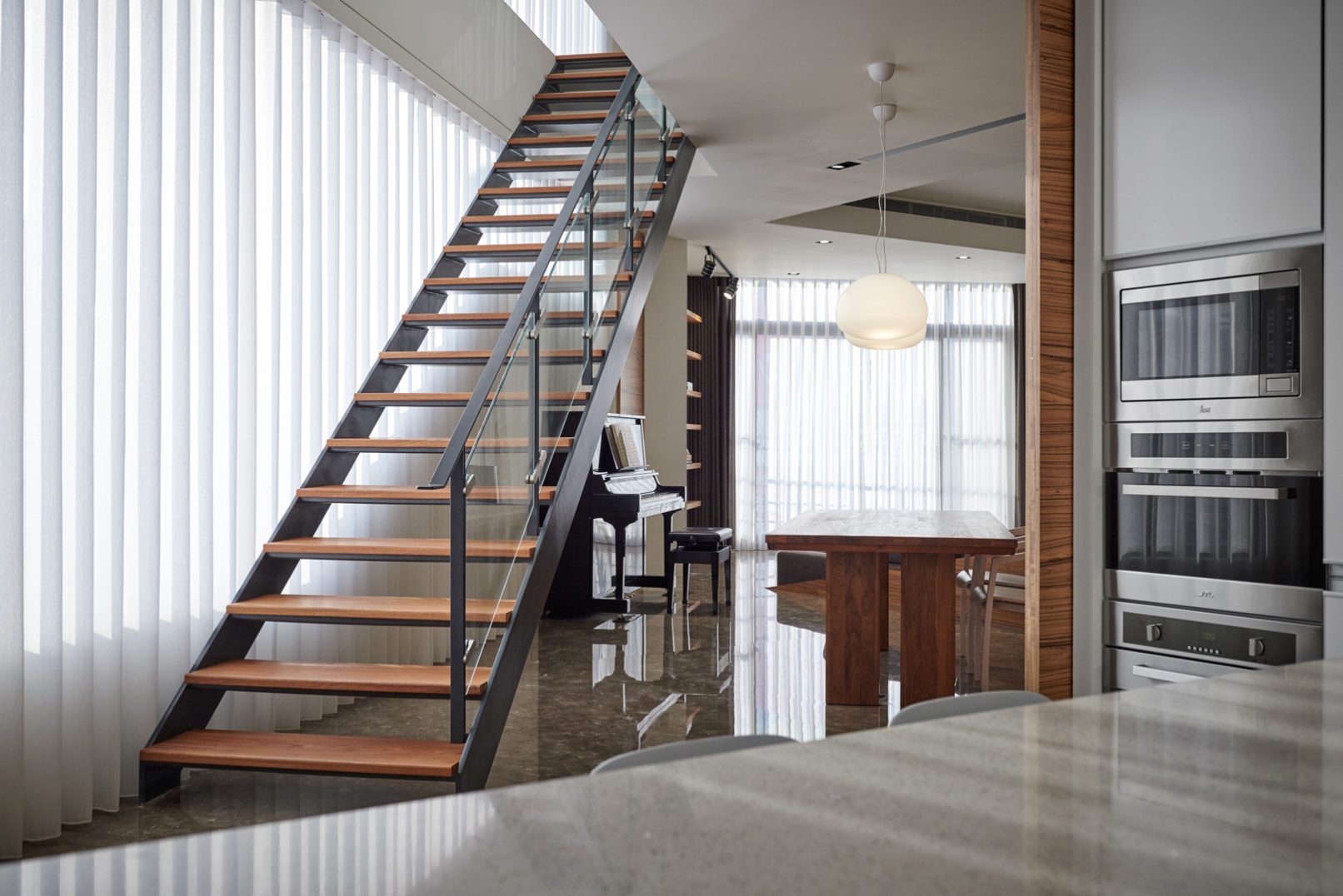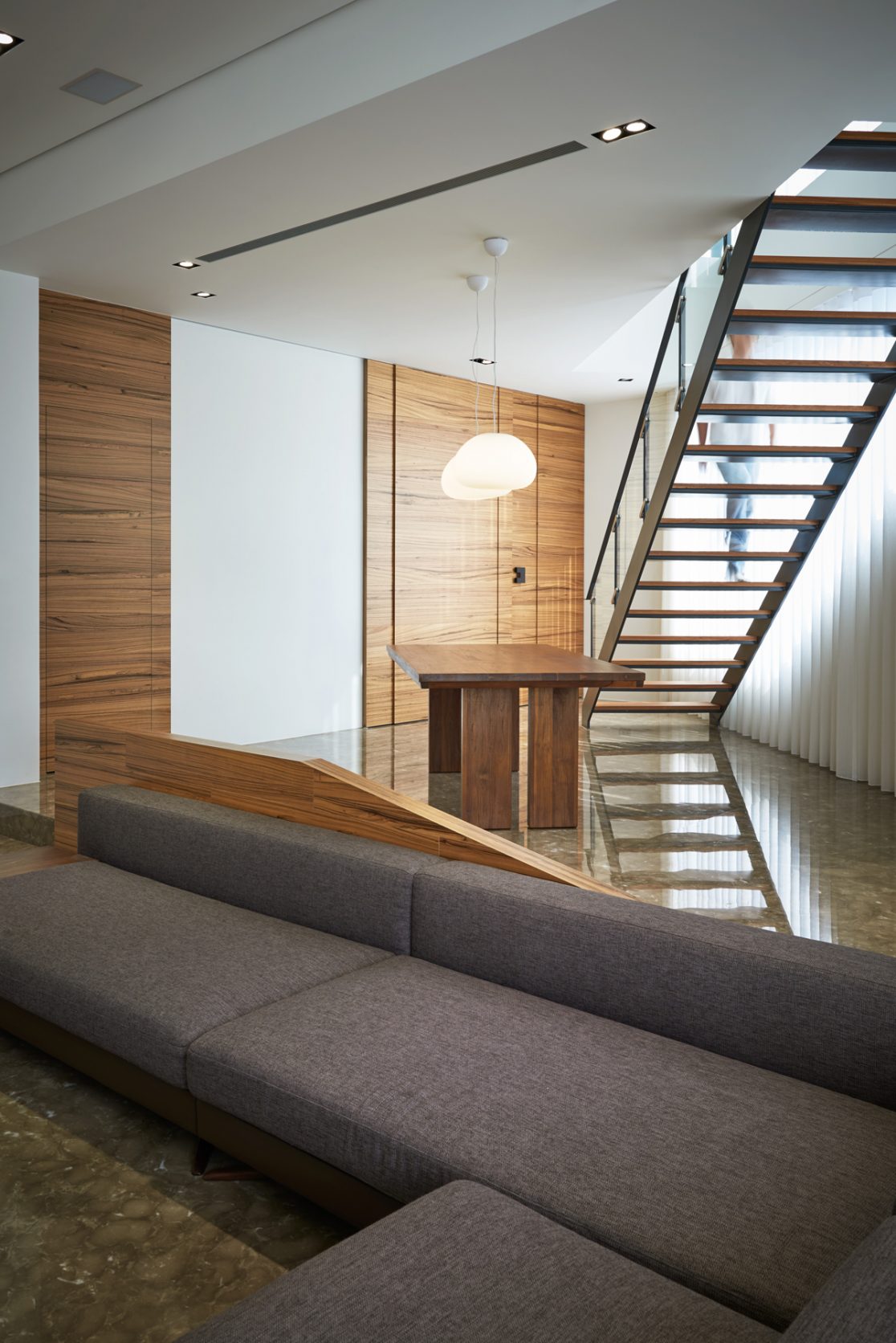 City dweller lives right within a jungle of concrete and iron hides, designed to trap us in. To deal with such difficult reality, we owe it to ourselves to create our own scene. An angular outlook of the house provides openings to different parts of the street, which give ways to a variety of lighting potential. The elevated reading area and dining table together form a comfort zone, like a wheel that propels family dynamic. The heart and soul of the family often starts in the living room, and this house makes sure it sticks to that very important principle.