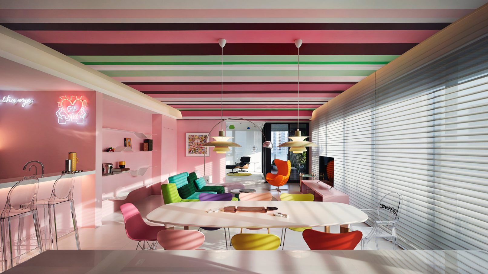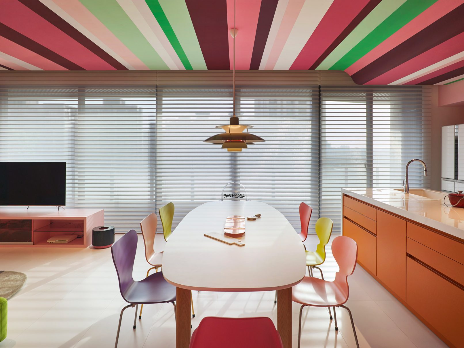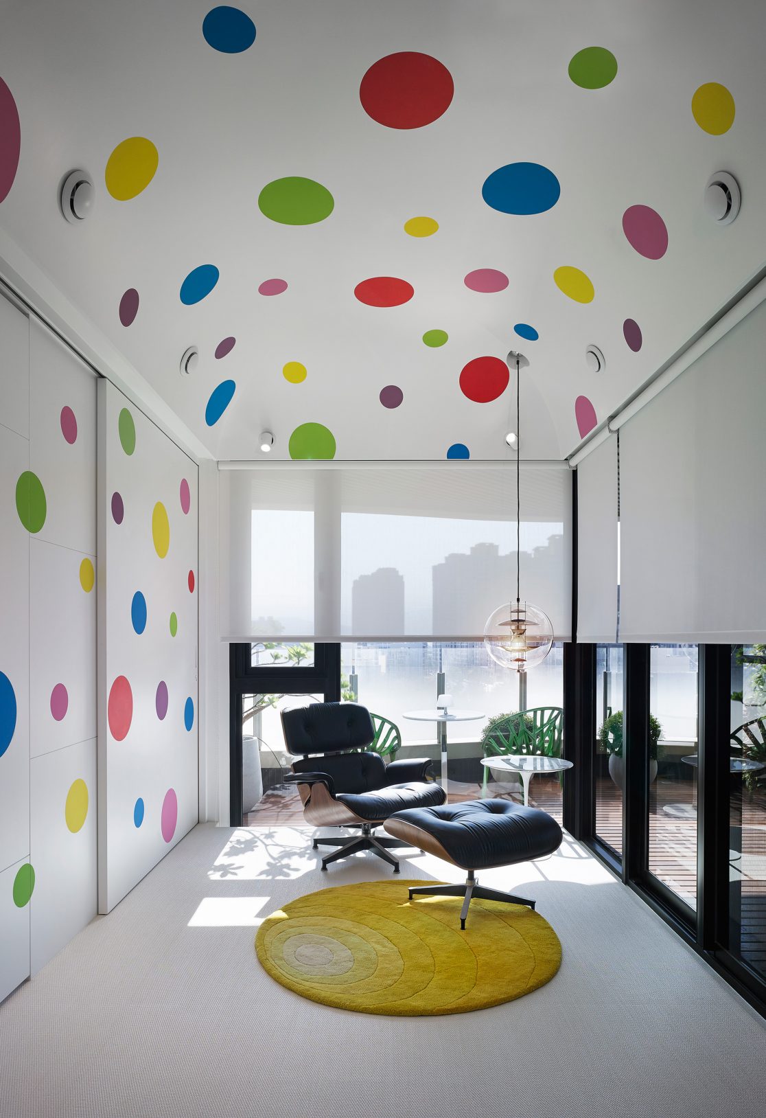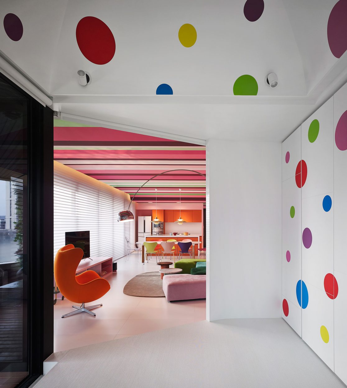 Everything started at the moment when the owner made his very first purchase of classic designer chair, a Egg Chair that inevitably jump starts his furniture collection as well as a deep fascination of prominent modern artists. We at FU-GE attempt to translate that very taste and desire and weave them into the design of this property. The interior’s rectangular circulation is set up to literally bridge different portions of the house and seamlessly present the transition of style and artistic influence. We use a wide palette of colors while finding a neat visual balance to properly present the owner’s vision. For instance, the striped design on the ceiling is an obvious homage to Paul Smith, completed by the hands of artist François Fléché. The house is colorful and exuberant, and it is peppered with modern art inspired design cues. We also break away from traditional interior design and incorporate signature elements from some of the most prominent modern artists.