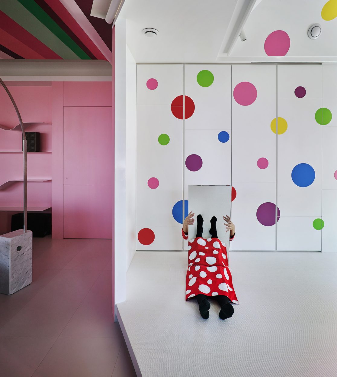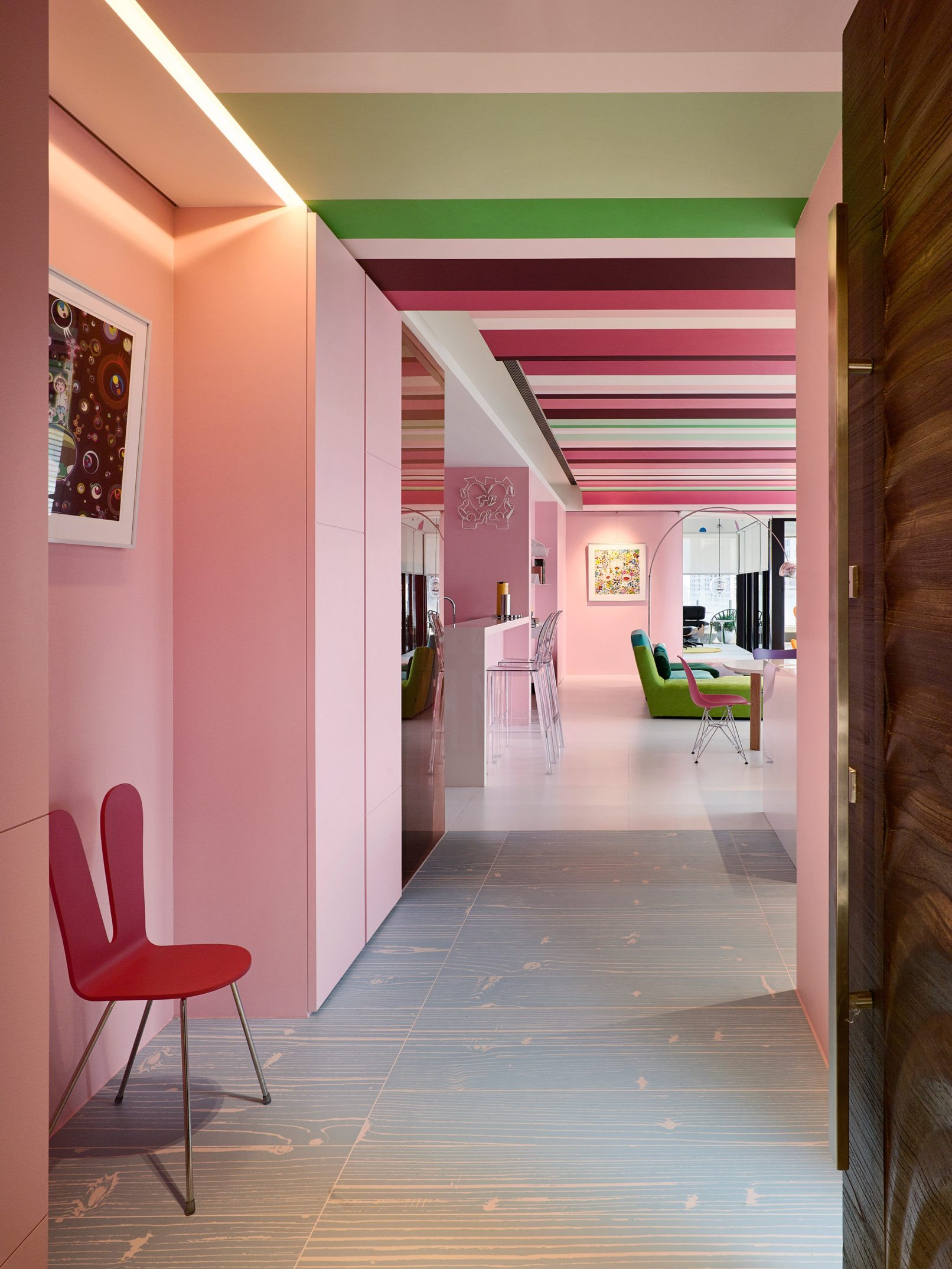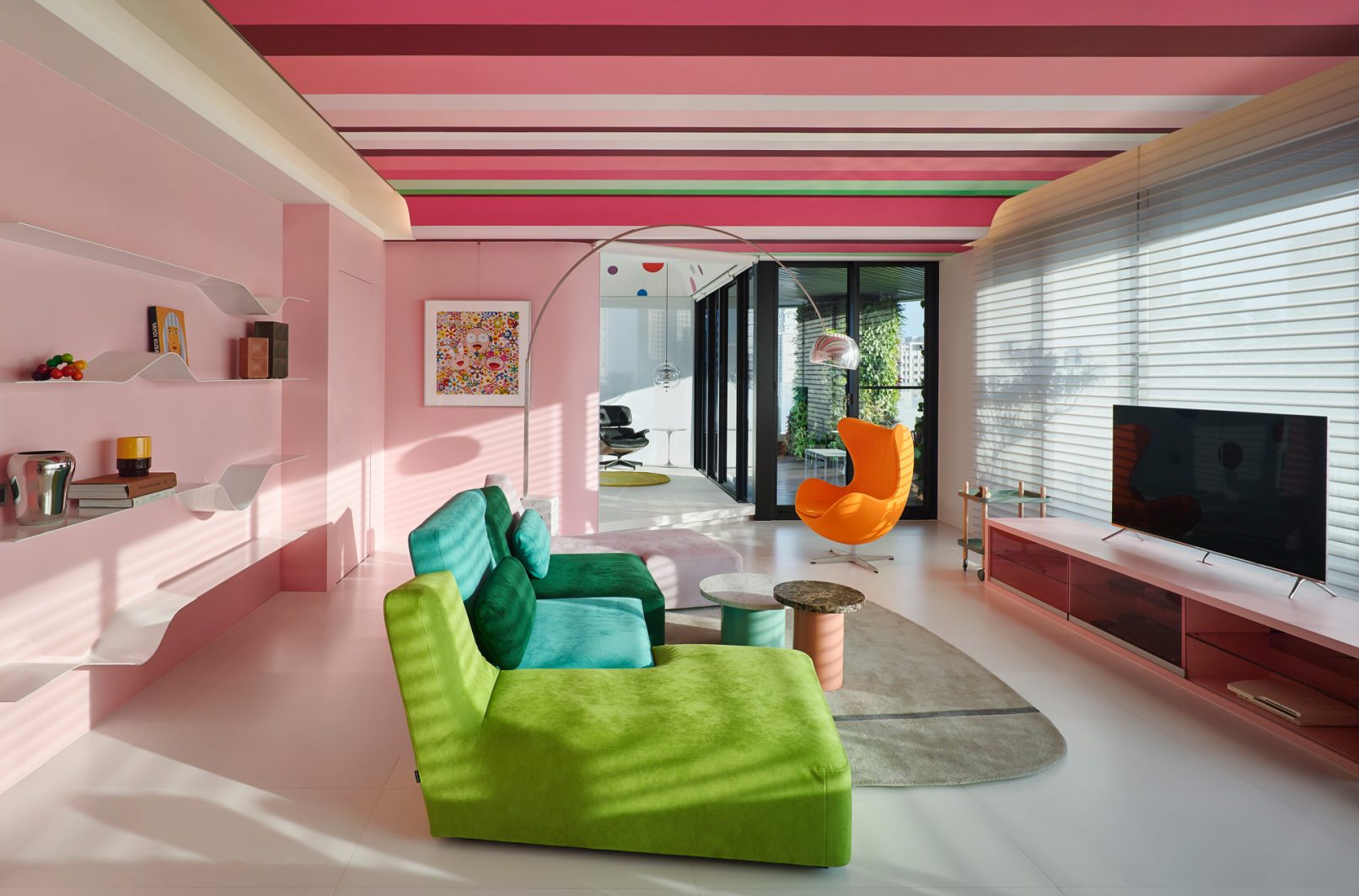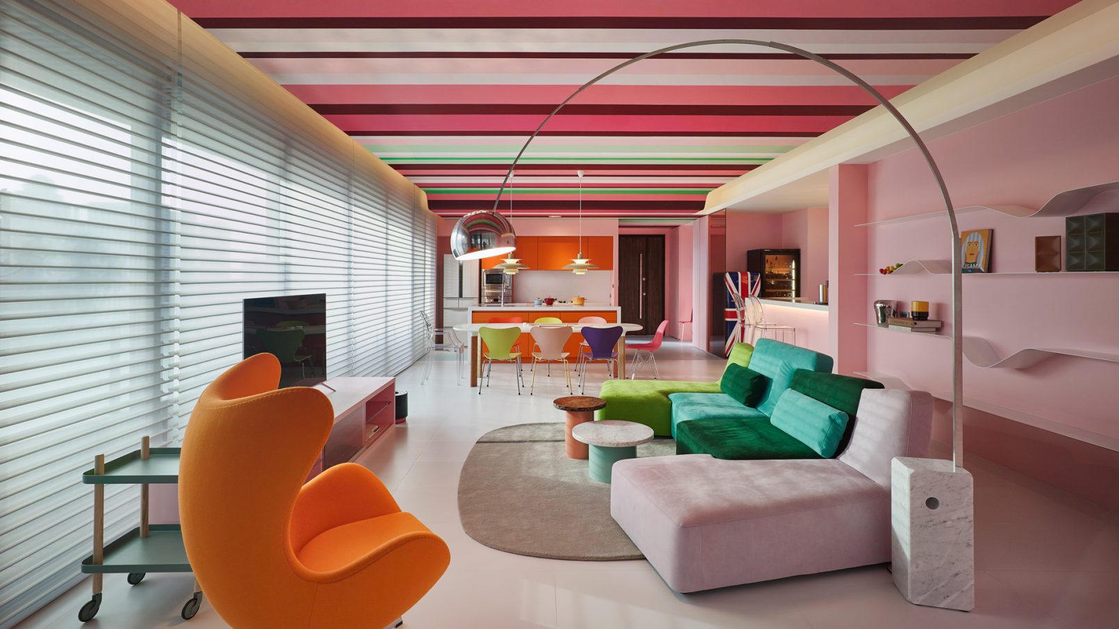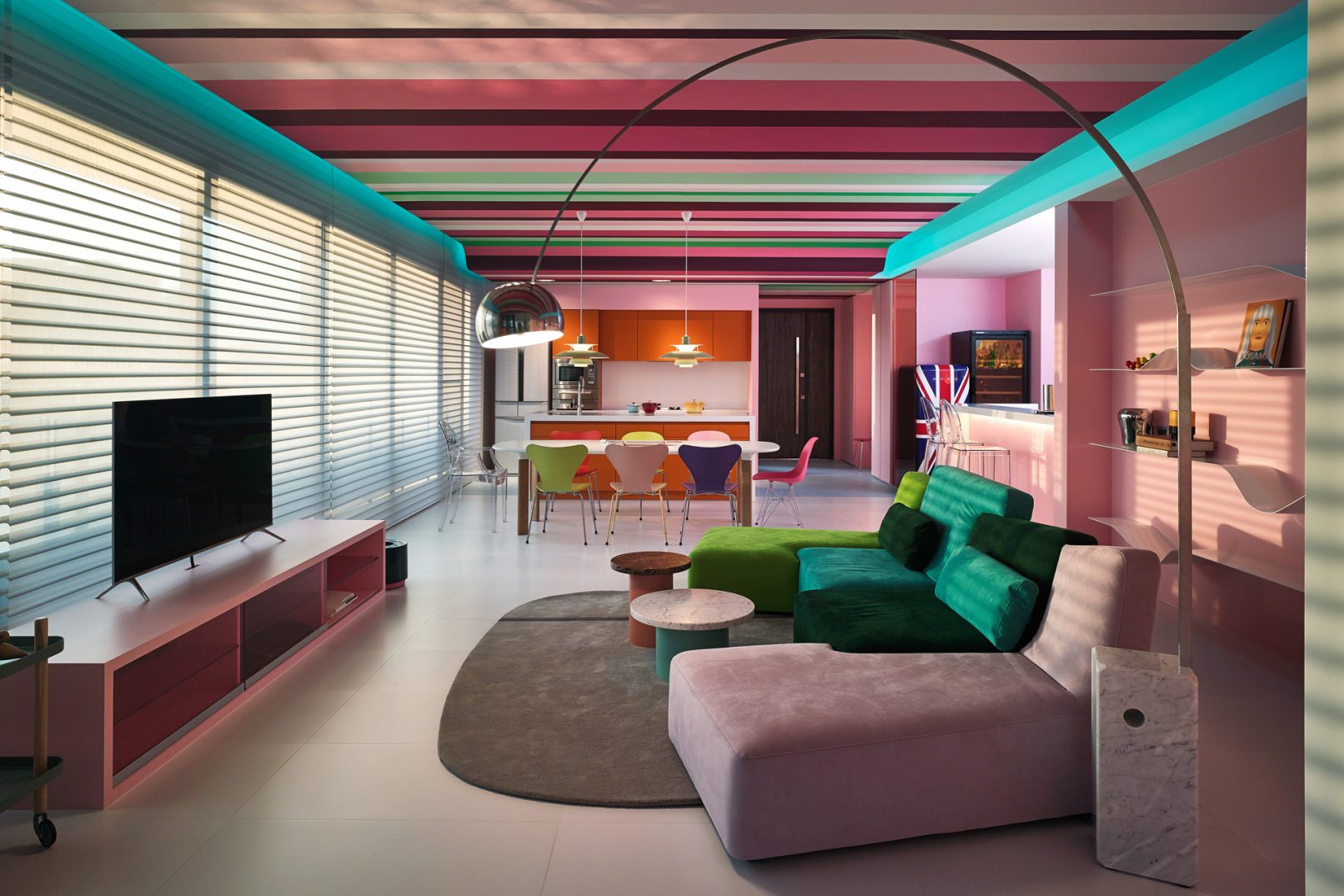 Everything started at the moment when the owner made his very first purchase of classic designer chair, a Egg Chair that inevitably jump starts his furniture collection as well as a deep fascination of prominent modern artists. We at FU-GE attempt to translate that very taste and desire and weave them into the design of this property. The interior’s rectangular circulation is set up to literally bridge different portions of the house and seamlessly present the transition of style and artistic influence. We use a wide palette of colors while finding a neat visual balance to properly present the owner’s vision. For instance, the striped design on the ceiling is an obvious homage to Paul Smith, completed by the hands of artist François Fléché. The house is colorful and exuberant, and it is peppered with modern art inspired design cues. We also break away from traditional interior design and incorporate signature elements from some of the most prominent modern artists.