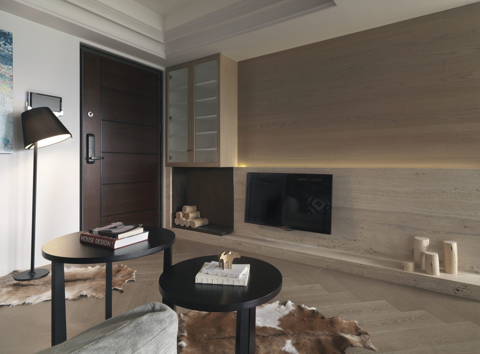 主要建材|義大利米蘭洞石、實木貼皮、平光烤漆、線板、鍛造鐵件、灰玻、洞石、玻璃、壁紙