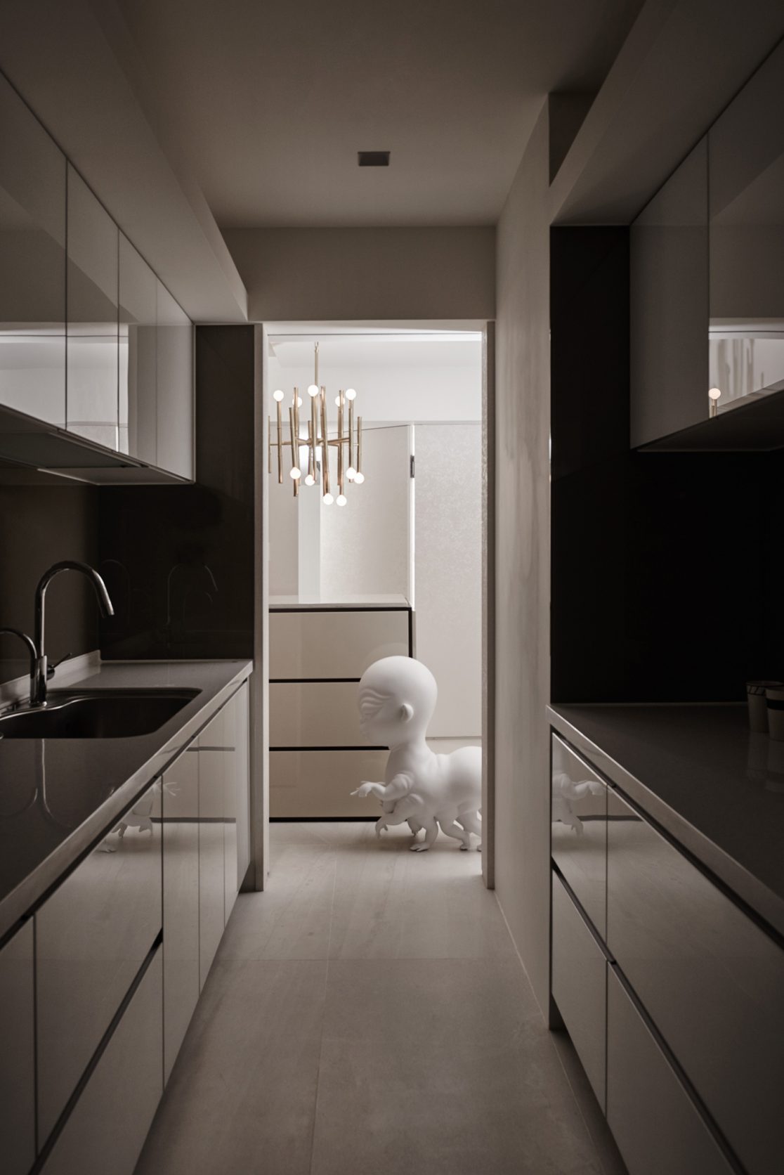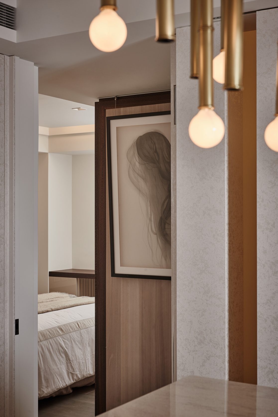 藝術可以是生活的一部分,藝術品當然也能是住在這個家裡的一份子!透過黃銅、鍍鈦與切割後的義大利超白洞,將古典與現代混搭結合,除了在空間上設計規劃,還將藝術品擬人化的放置,讓它們就像是生活在這裡的一家人,自然且幽默地帶領著你走訪每個角落。藝術品:徐顥芸「他又說起第二個故事」2013 水墨、陳宗勳「亂‧根」2012 玻璃纖維強化塑膠、黃柏仁「不爽」2005 銅雕。