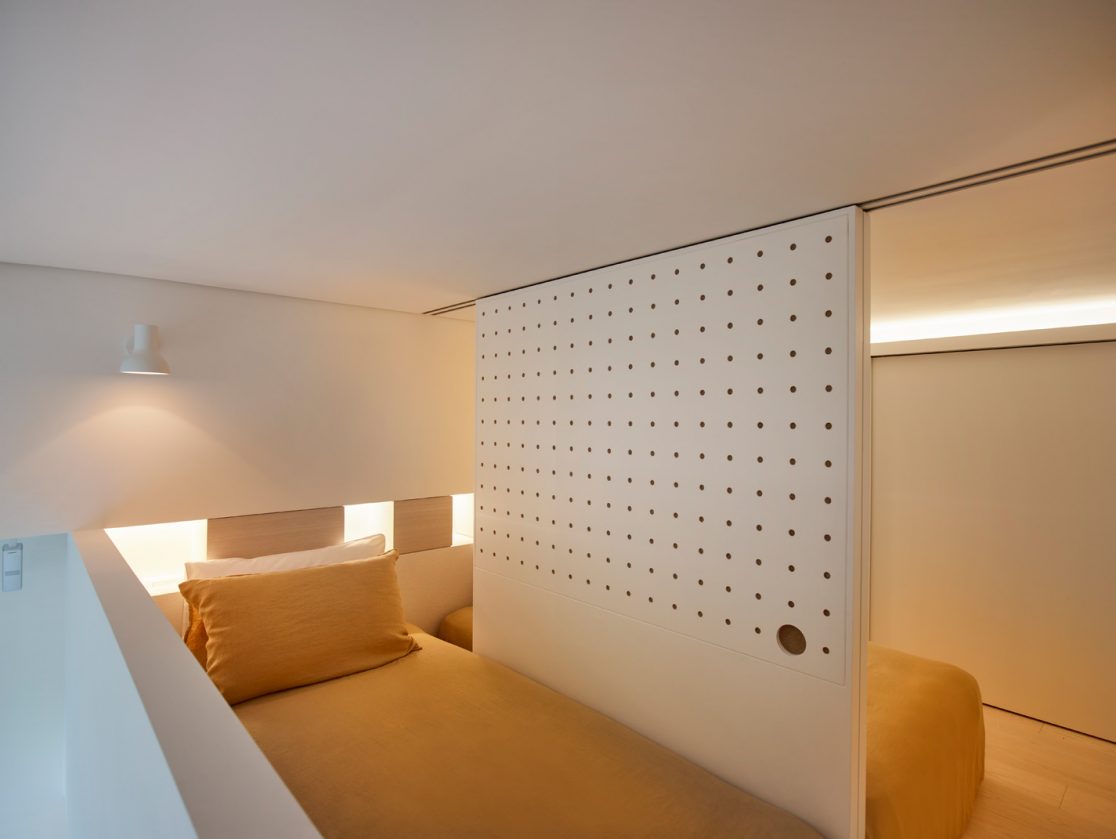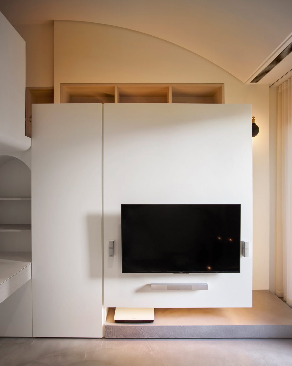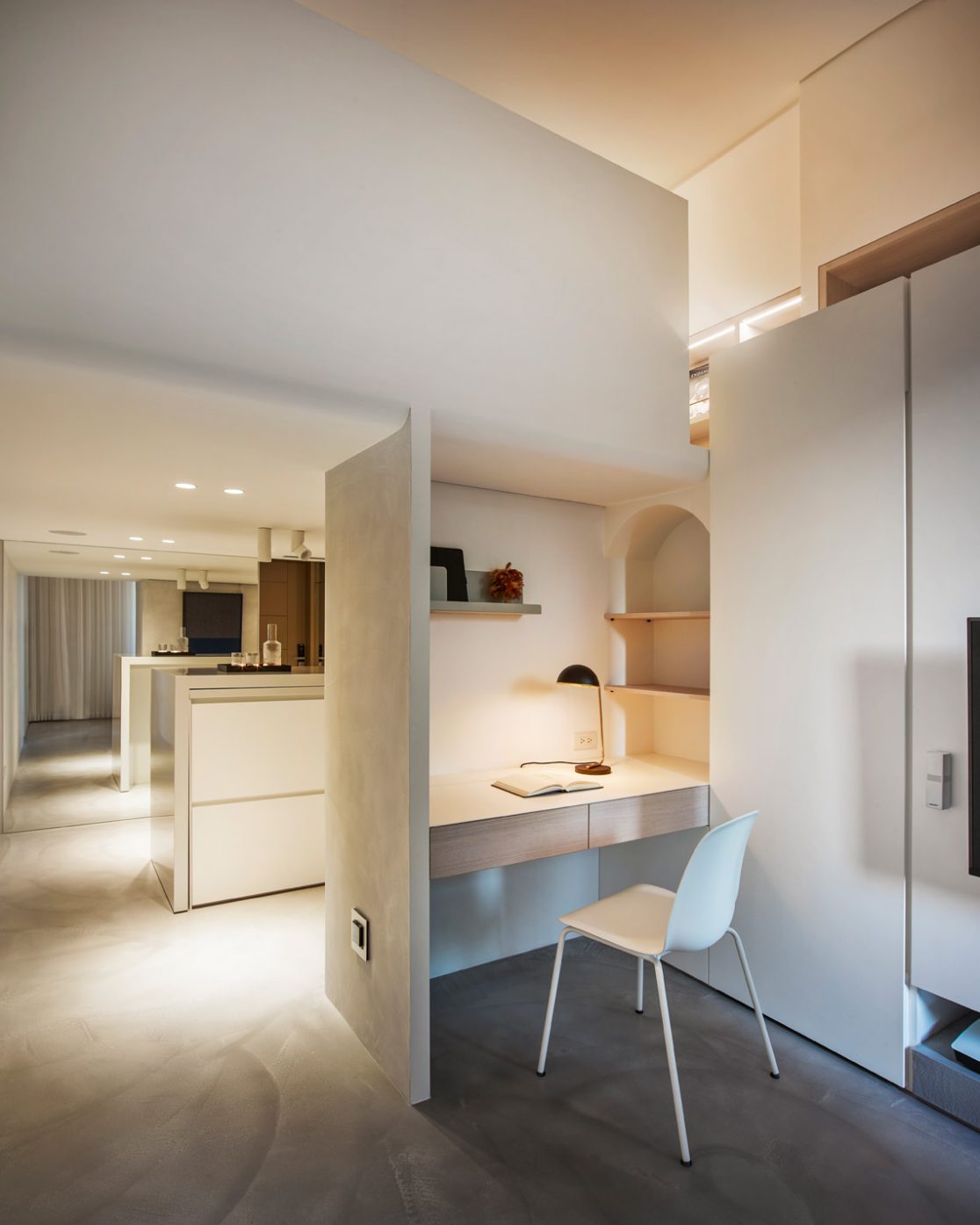 Taking a turn and you will discover so much more! Breaking up the once long and narrow floor plan in order to create better traffic flow and proper space management. The living room and the patio are now done in a way to better promote coziness as well. And a full kitchen is now possible too. A curved ceiling structure is now in place to free up additional room for particularly storage purpose and in terms enhance spacial flexibility at the same time. To make the most of the 30 m² for the owner of two sisters while maintain a sense of individuality and privacy both in function and design, some structural maneuver are in place. Kitchen island can double as a standing work table with an desk stationed by the living room, and a multipurpose partition is built as part of the bedroom. These are just some of the design decisions that really maximize every bit of the space available. Staying consistent with the clean, minimal outlook, Pandomo paint finds its way to the wall and the floor. This is a small home located in the heart of the city, a stripped down design is the chilled yet stylistic resolution to the otherwise crowed and noisy world outside.