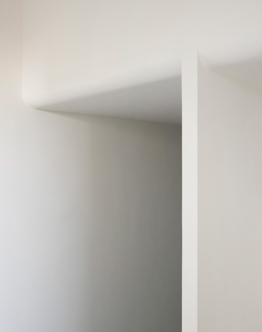 轉個彎,看見更美的風景!刻意隔斷原始狹長的空間,創造更靈活的使用機能與生活動線。不但因此有了完整的廚房,並將客廳與庭院塑造成另一個私密區域。立面的大弧度中,則是所有設備的隱身之處,透過弧度的劃分,為裡外兩側都爭取到錙銖必較的分毫空間。而因應屋主兩姐妹不同的性格、喜好與生活步調,無論是上層臥房之間可活用的隔板、廚房裡中島兼立式工作桌、客廳旁的坐式書桌,都是讓兩人在九坪之中,還能擁有各自隱私與生活習慣的設計細節。磐多魔從地坪運用到牆面,搭配淨白的主色調,整體純潔寧靜,讓座落於繁華都會區的小家,有著自己的豁達與平和。