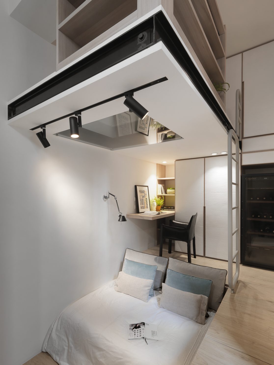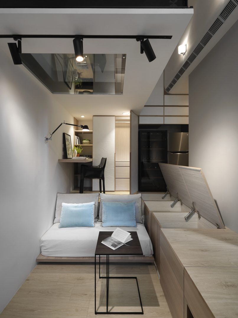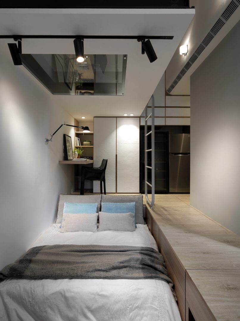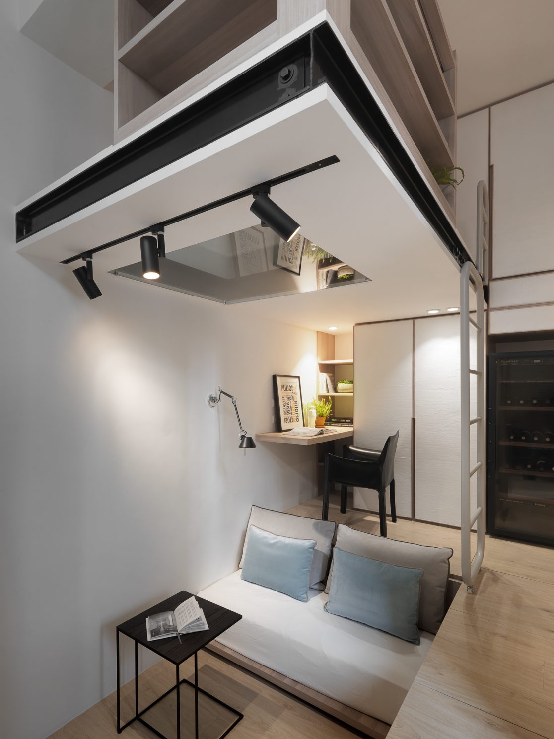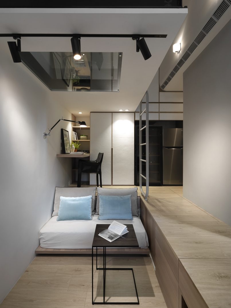 8.5坪的都會小宅,盛載現代家庭的生活需求,也藏著對生活的夢想。因為原本空間基本動線的高低起伏,設計上為了符合媽媽與小孩,以及偶然來拜訪的長輩需求,從廚房到起居間到後陽台,巧妙地以收納空間換成順暢的動線;晚上的雙人床鋪,起床後能瞬間變化為沙發,為空間帶來變化與彈性,也為居住者量身打造出能享受音樂、品嚐美酒,放鬆小憩的客廳;閣樓則是小朋友專有的獨立小角落,強化玻璃夾層設計讓媽媽與孩子各有空間卻又保持互動。每一個設計細節,都來自對人與生活的觀察,從需求著手,再小的夢想也能實現。