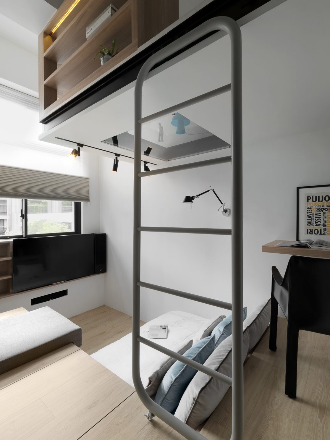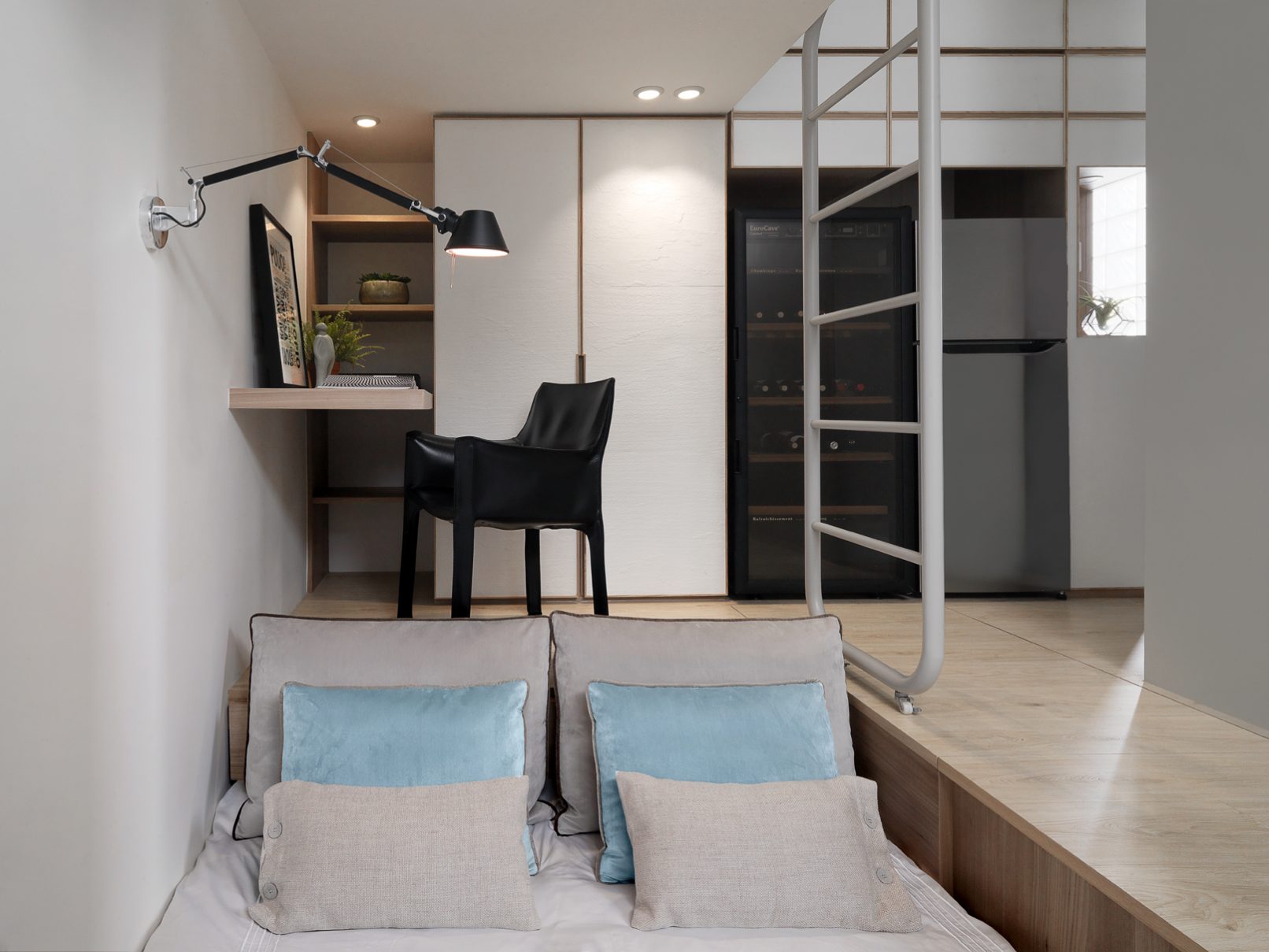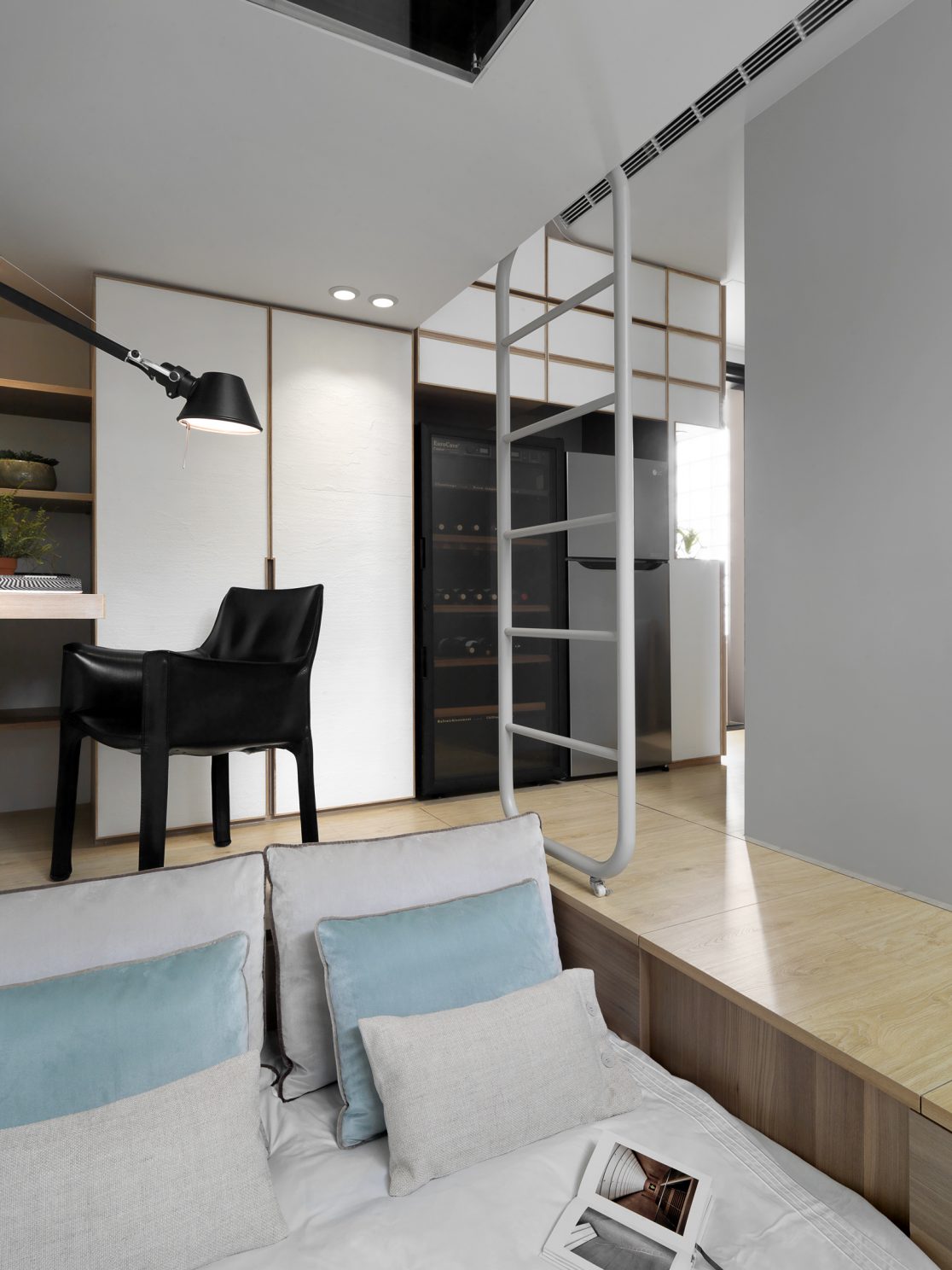 8.5坪的都會小宅,盛載現代家庭的生活需求,也藏著對生活的夢想。因為原本空間基本動線的高低起伏,設計上為了符合媽媽與小孩,以及偶然來拜訪的長輩需求,從廚房到起居間到後陽台,巧妙地以收納空間換成順暢的動線;晚上的雙人床鋪,起床後能瞬間變化為沙發,為空間帶來變化與彈性,也為居住者量身打造出能享受音樂、品嚐美酒,放鬆小憩的客廳;閣樓則是小朋友專有的獨立小角落,強化玻璃夾層設計讓媽媽與孩子各有空間卻又保持互動。每一個設計細節,都來自對人與生活的觀察,從需求著手,再小的夢想也能實現。