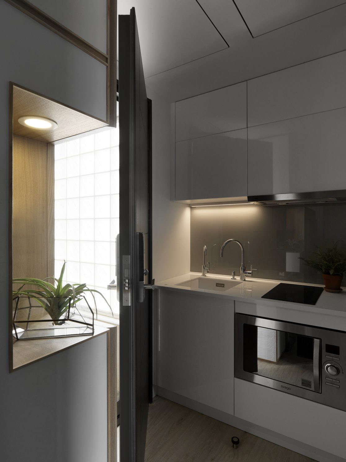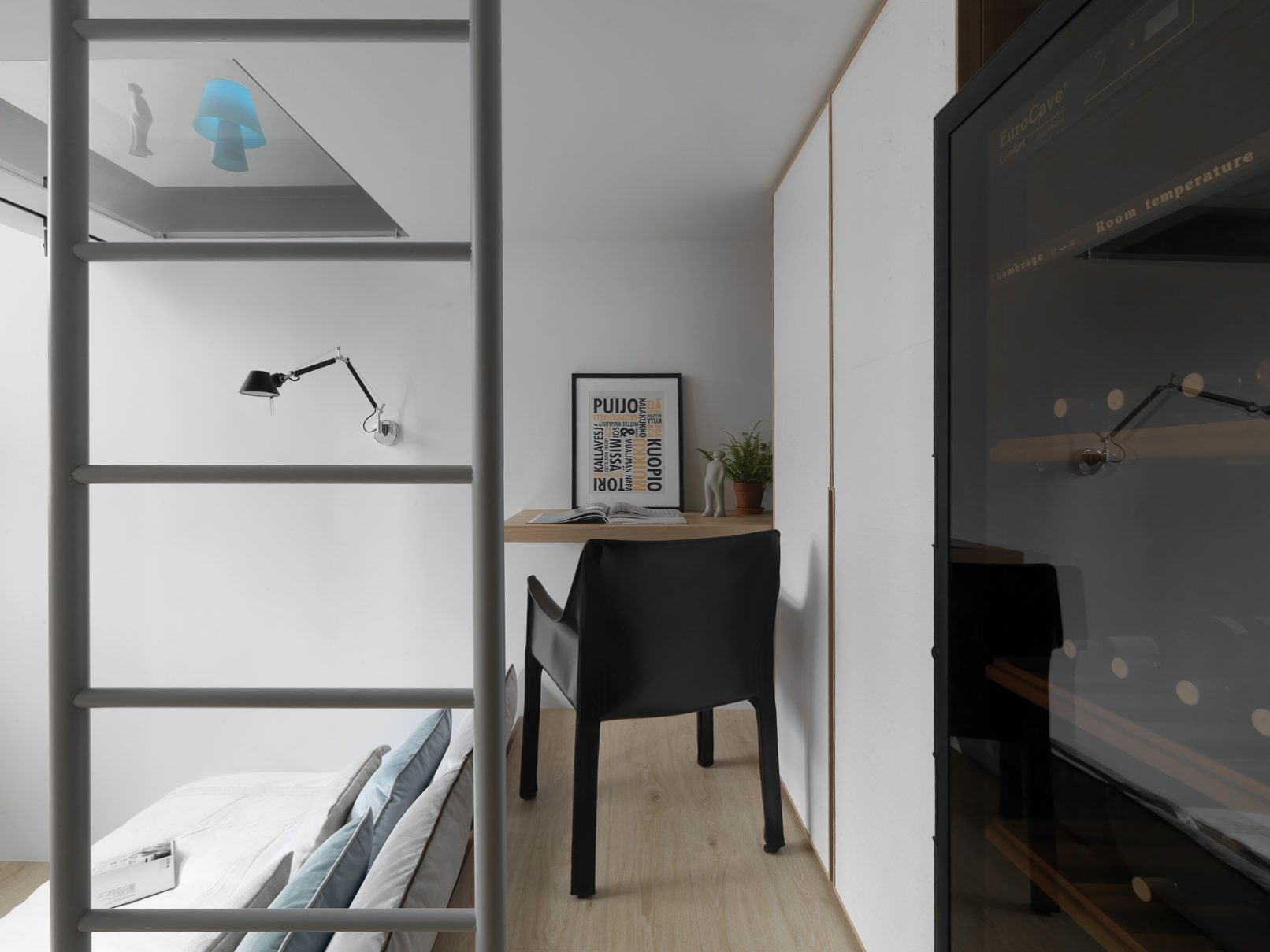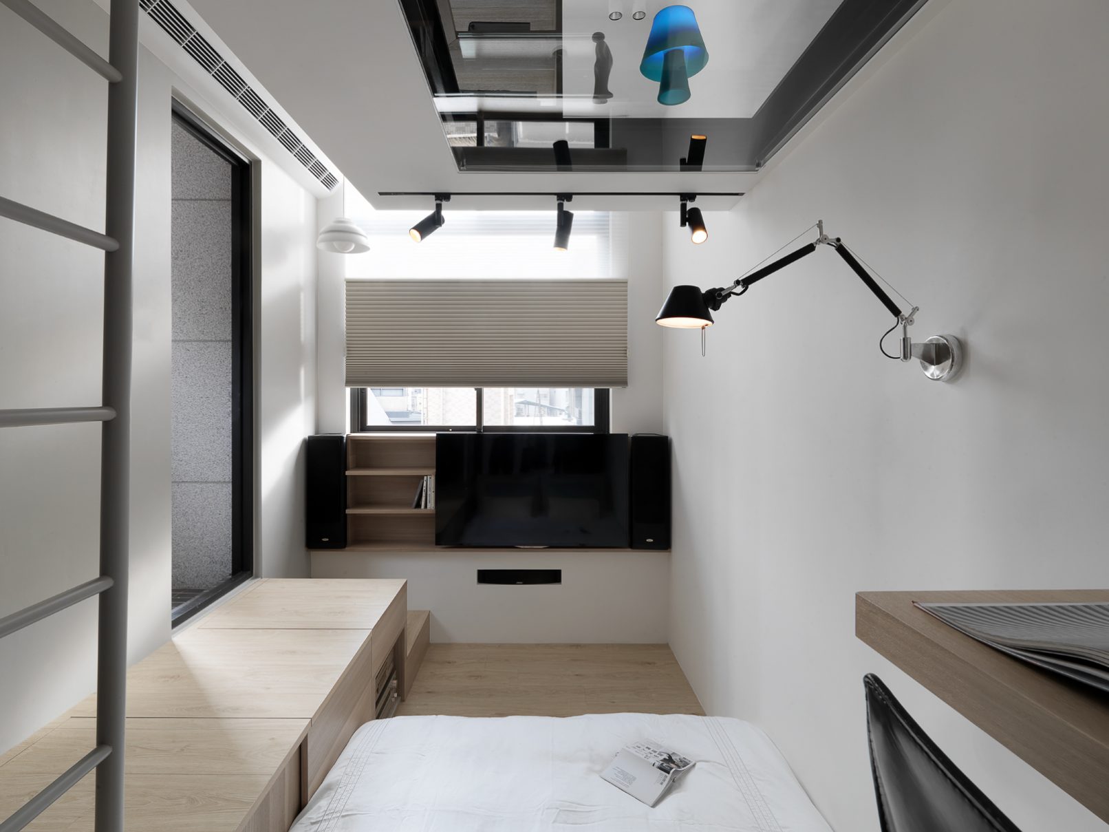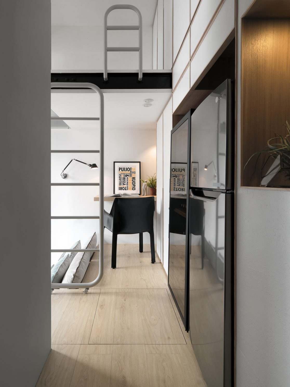 8.5坪的都會小宅,盛載現代家庭的生活需求,也藏著對生活的夢想。因為原本空間基本動線的高低起伏,設計上為了符合媽媽與小孩,以及偶然來拜訪的長輩需求,從廚房到起居間到後陽台,巧妙地以收納空間換成順暢的動線;晚上的雙人床鋪,起床後能瞬間變化為沙發,為空間帶來變化與彈性,也為居住者量身打造出能享受音樂、品嚐美酒,放鬆小憩的客廳;閣樓則是小朋友專有的獨立小角落,強化玻璃夾層設計讓媽媽與孩子各有空間卻又保持互動。每一個設計細節,都來自對人與生活的觀察,從需求著手,再小的夢想也能實現。